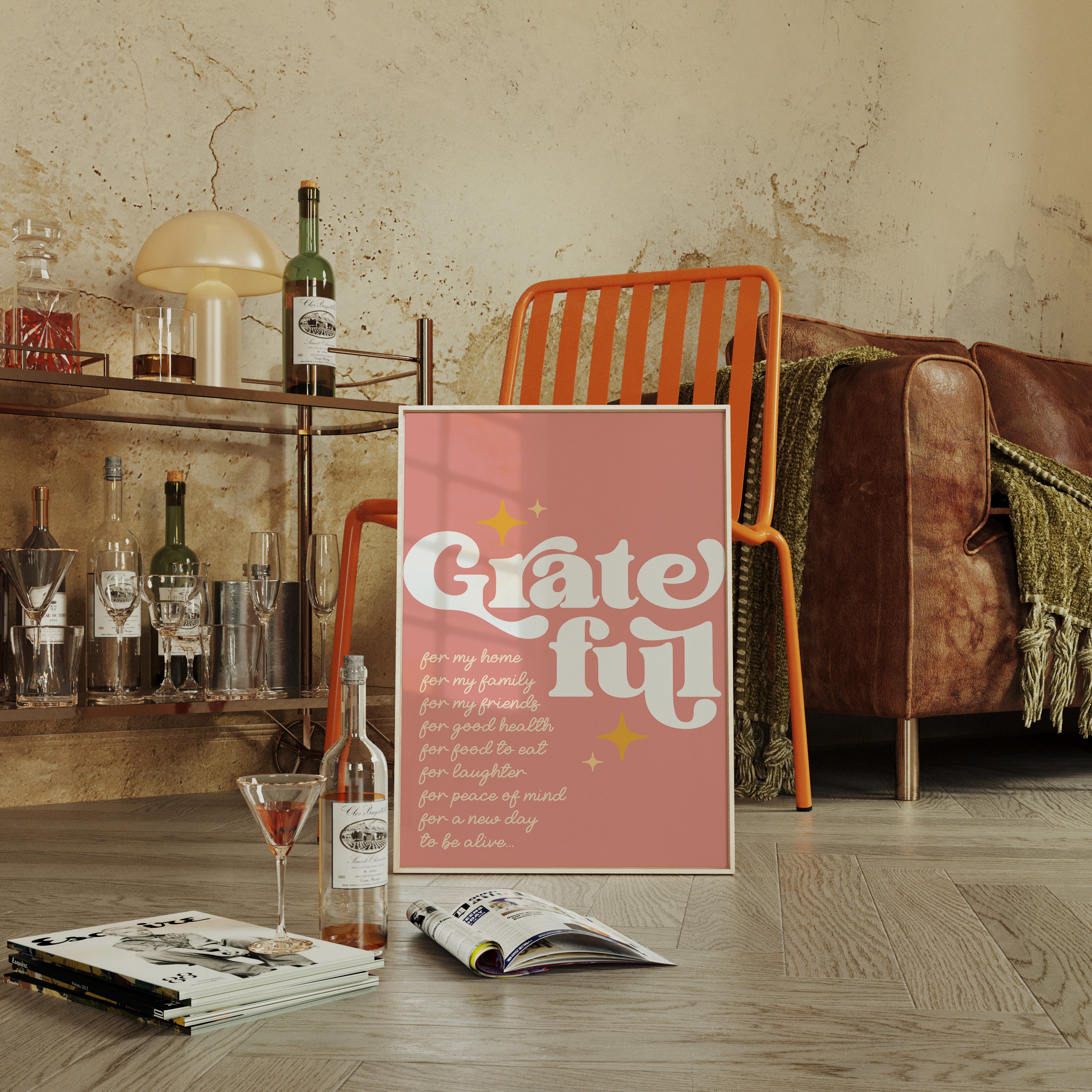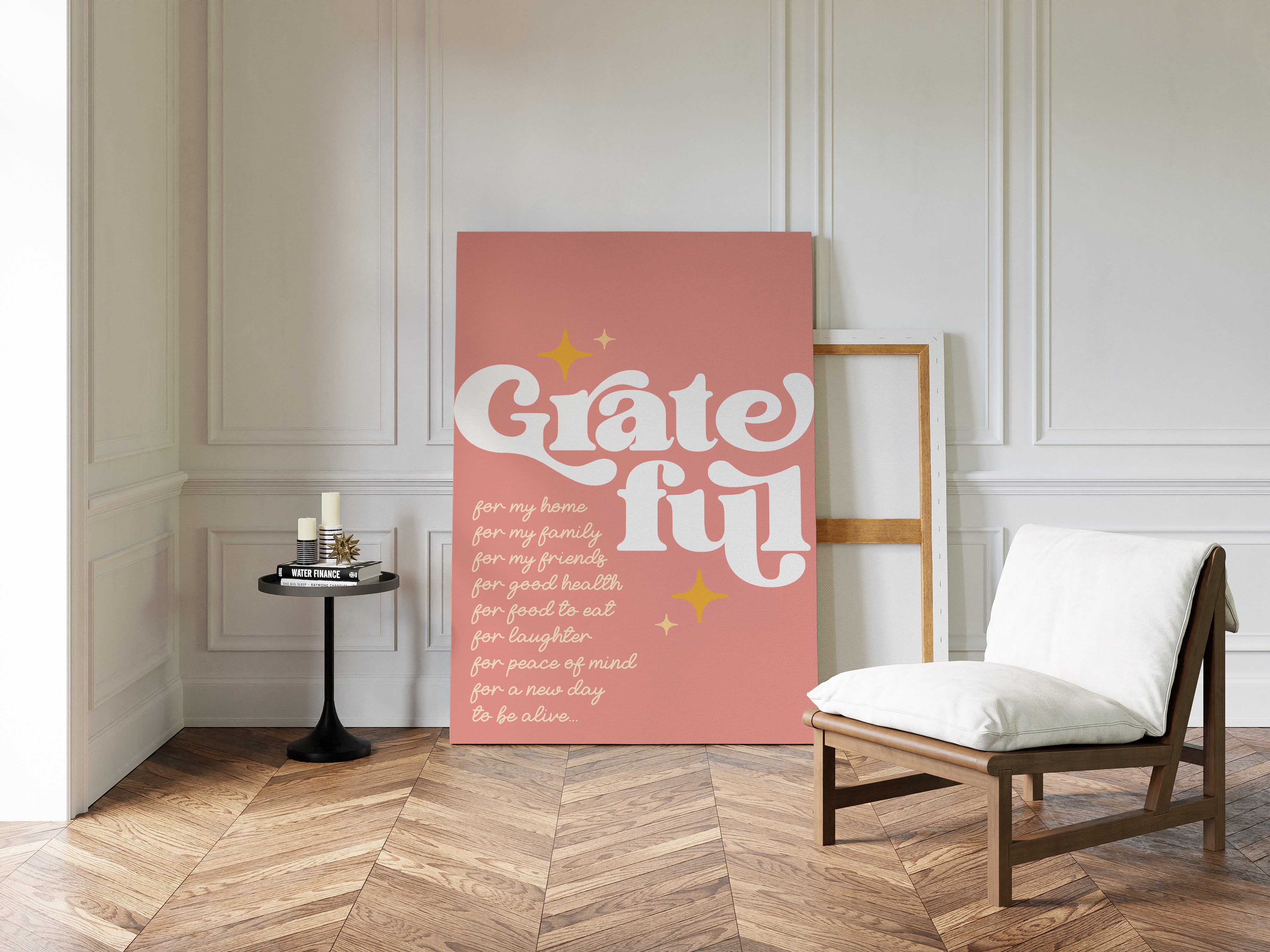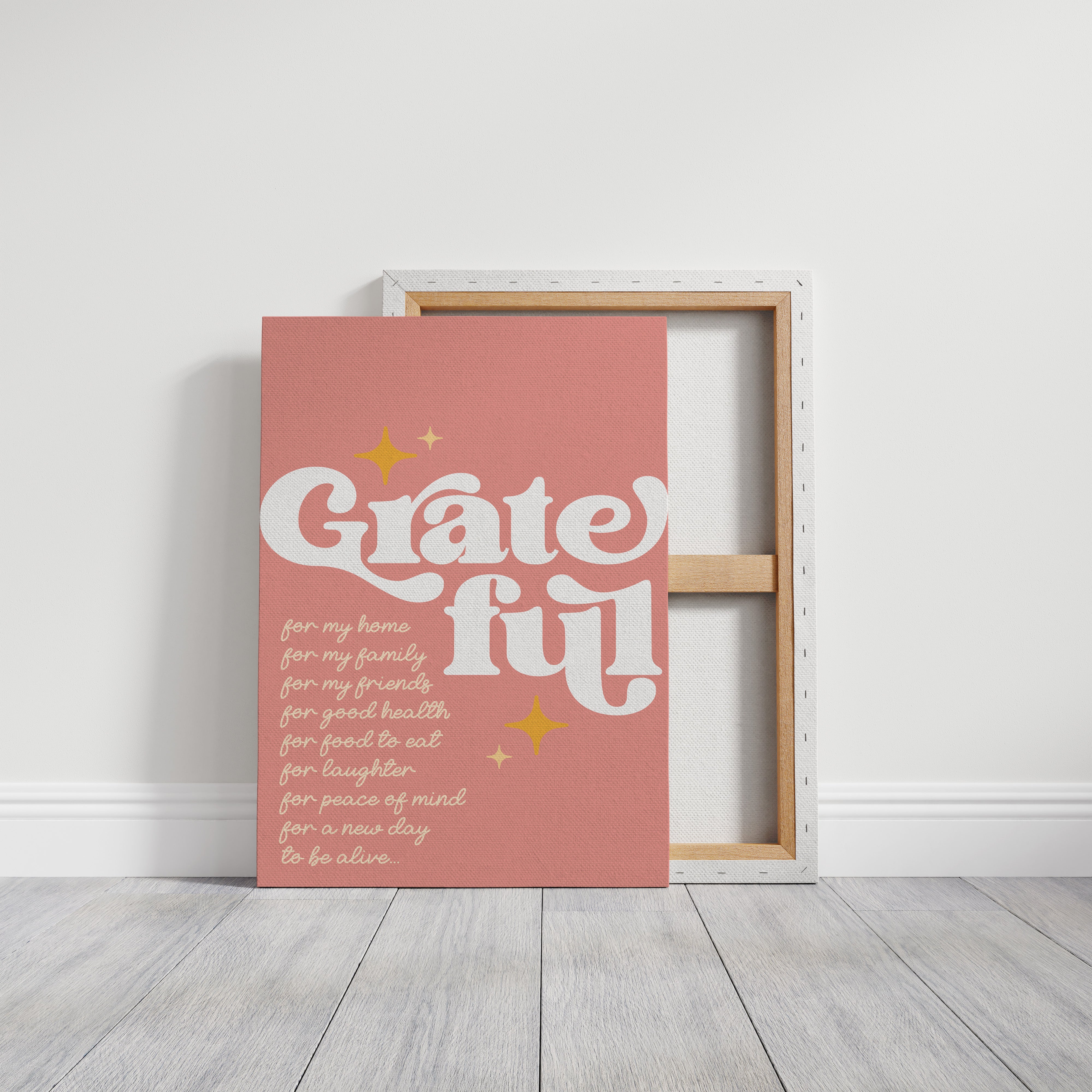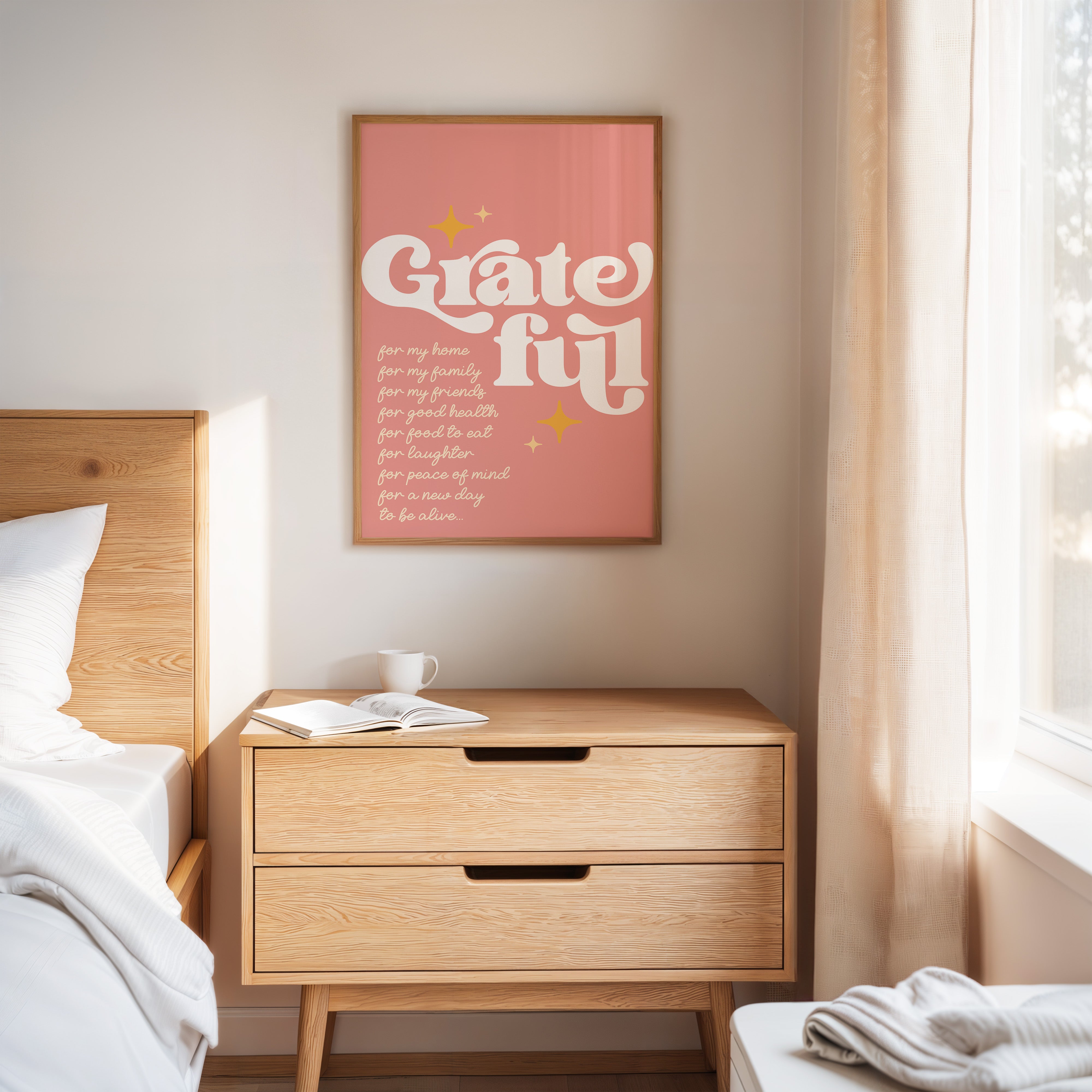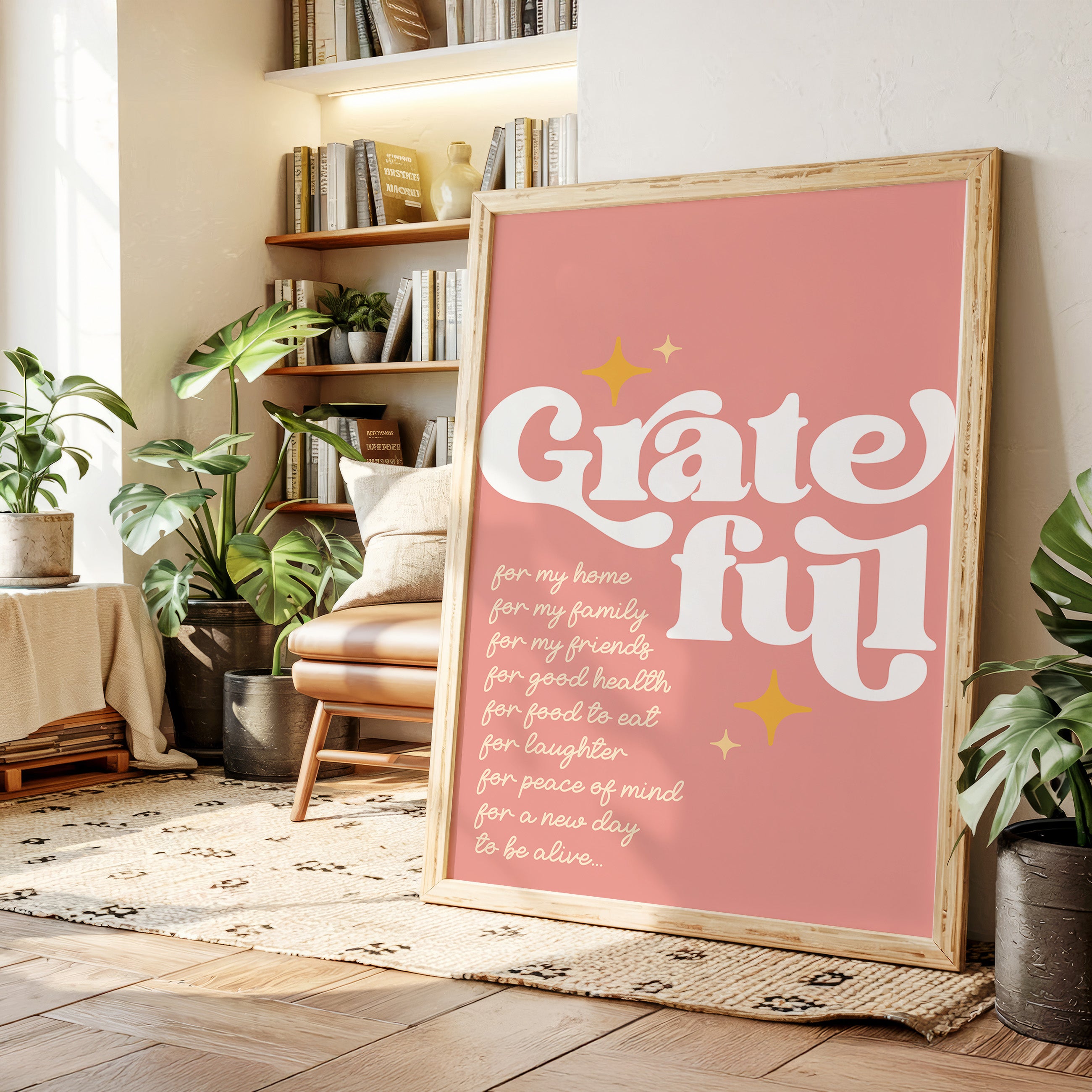 Gentle words float against a warm coral backdrop, each line a tender reminder of life's simple treasures. This contemporary typography piece speaks to the heart of gratitude with its modern yet intimate design. The bold 'Grateful' anchors the composition while handwritten affirmations cascade below like a meditation, creating a visual rhythm of thankfulness. Stars twinkle with golden optimism, adding a touch of whimsy to this mindful manifesto. Perfect for creating a positive focal point in a breakfast nook, meditation space, or anywhere you begin your day. Let this piece serve as your daily reminder to pause and appreciate life's precious gifts.