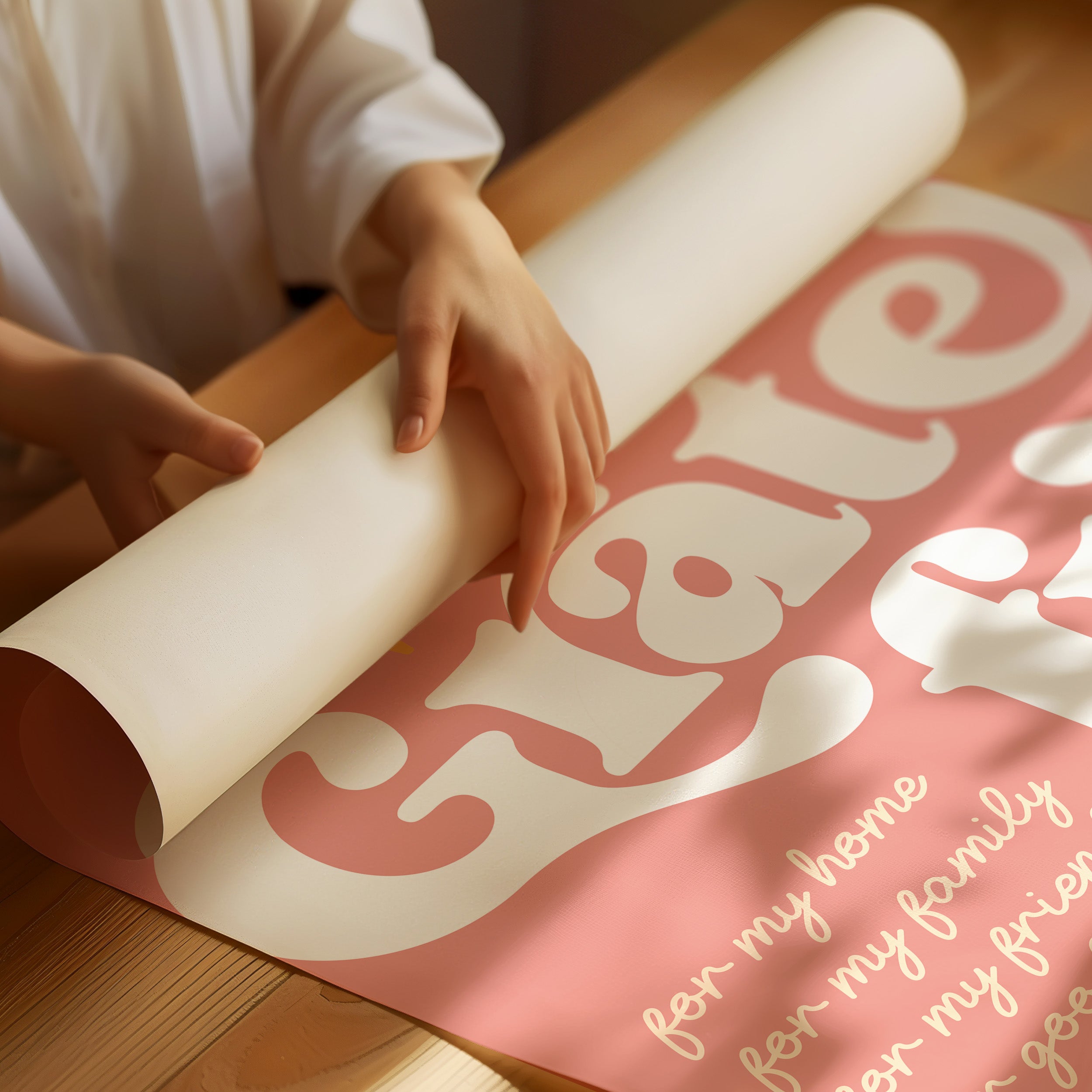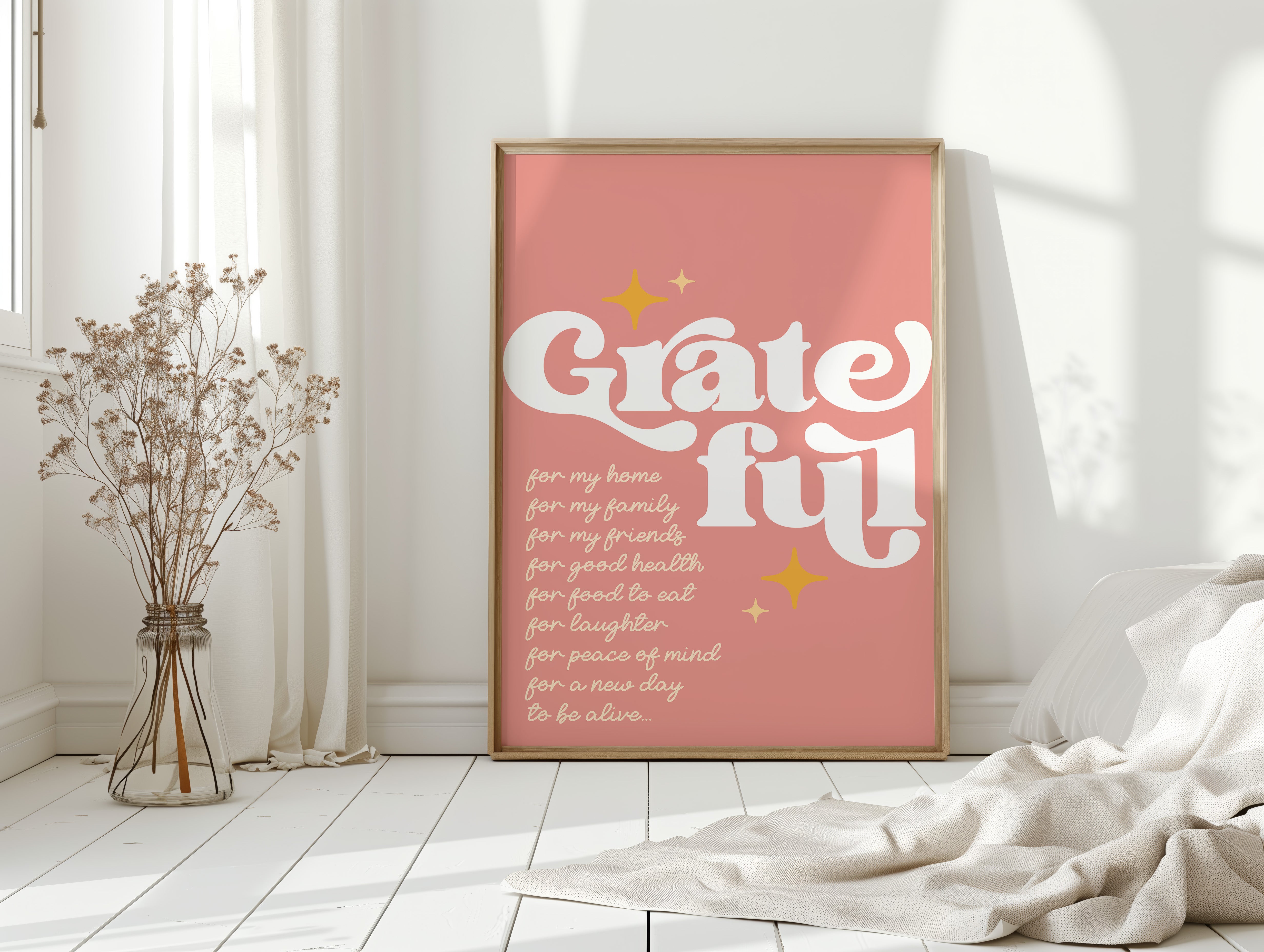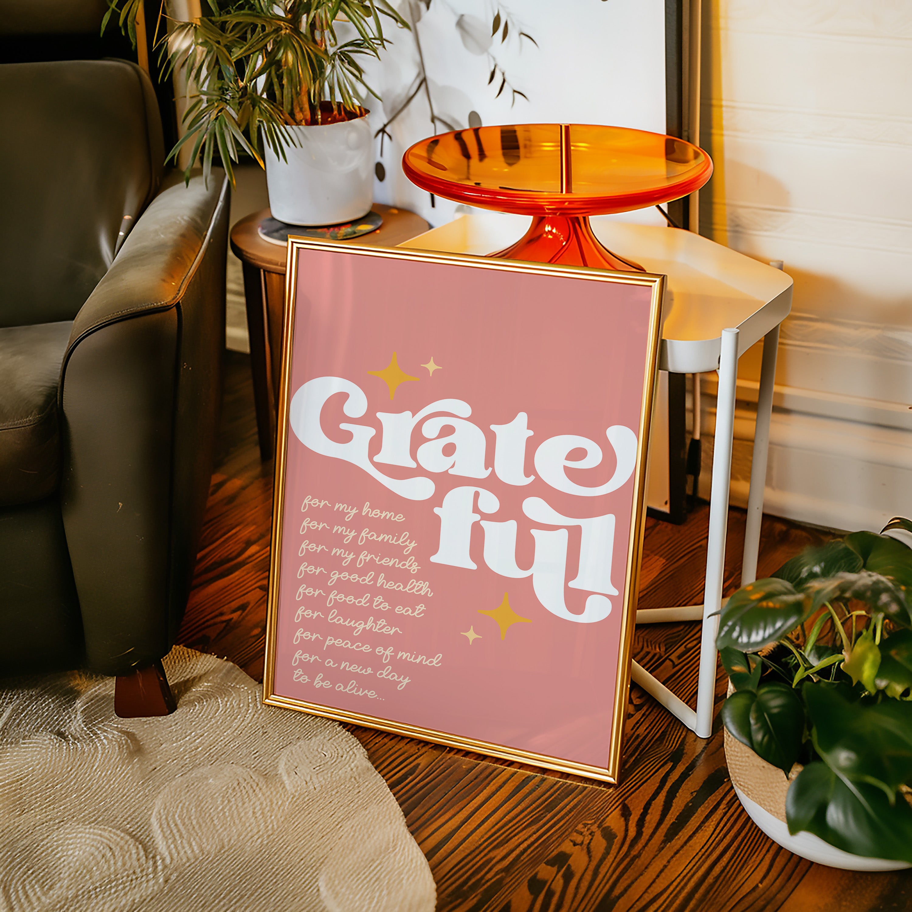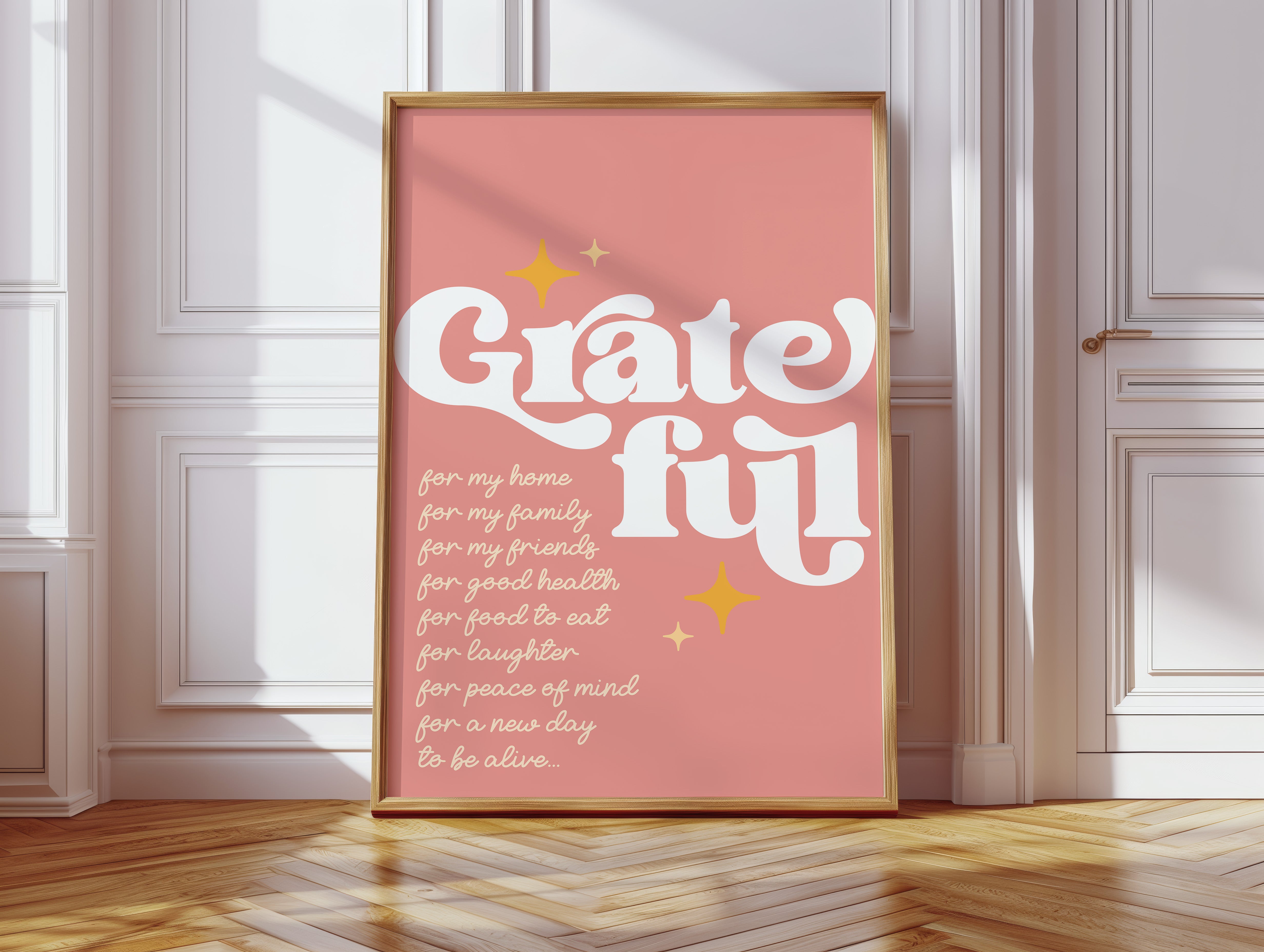 Gentle words float against a warm coral backdrop, each line a tender reminder of life's simple treasures. This contemporary typography piece speaks to the heart of gratitude with its modern yet intimate design. The bold 'Grateful' anchors the composition while handwritten affirmations cascade below like a meditation, creating a visual rhythm of thankfulness. Stars twinkle with golden optimism, adding a touch of whimsy to this mindful manifesto. Perfect for creating a positive focal point in a breakfast nook, meditation space, or anywhere you begin your day. Let this piece serve as your daily reminder to pause and appreciate life's precious gifts.