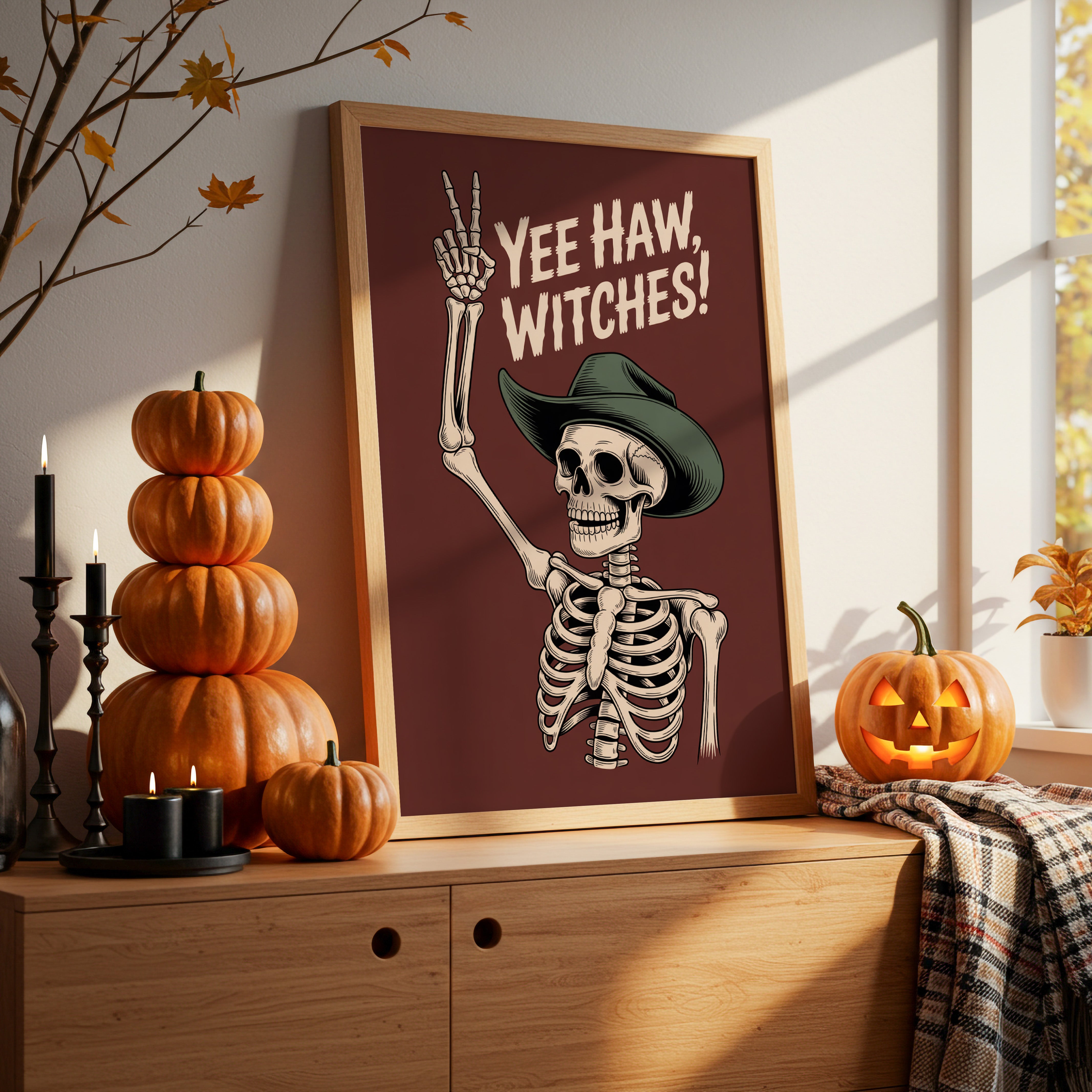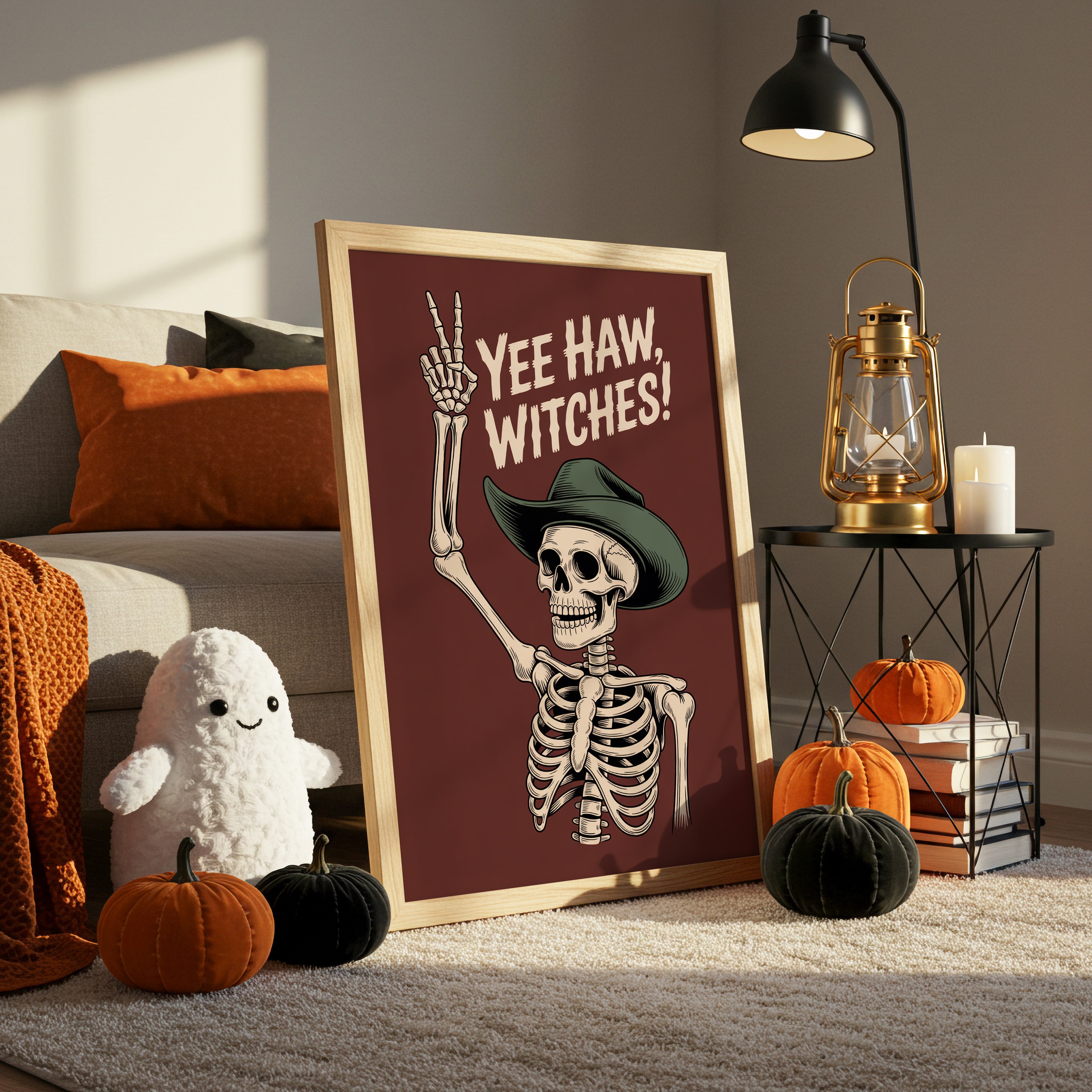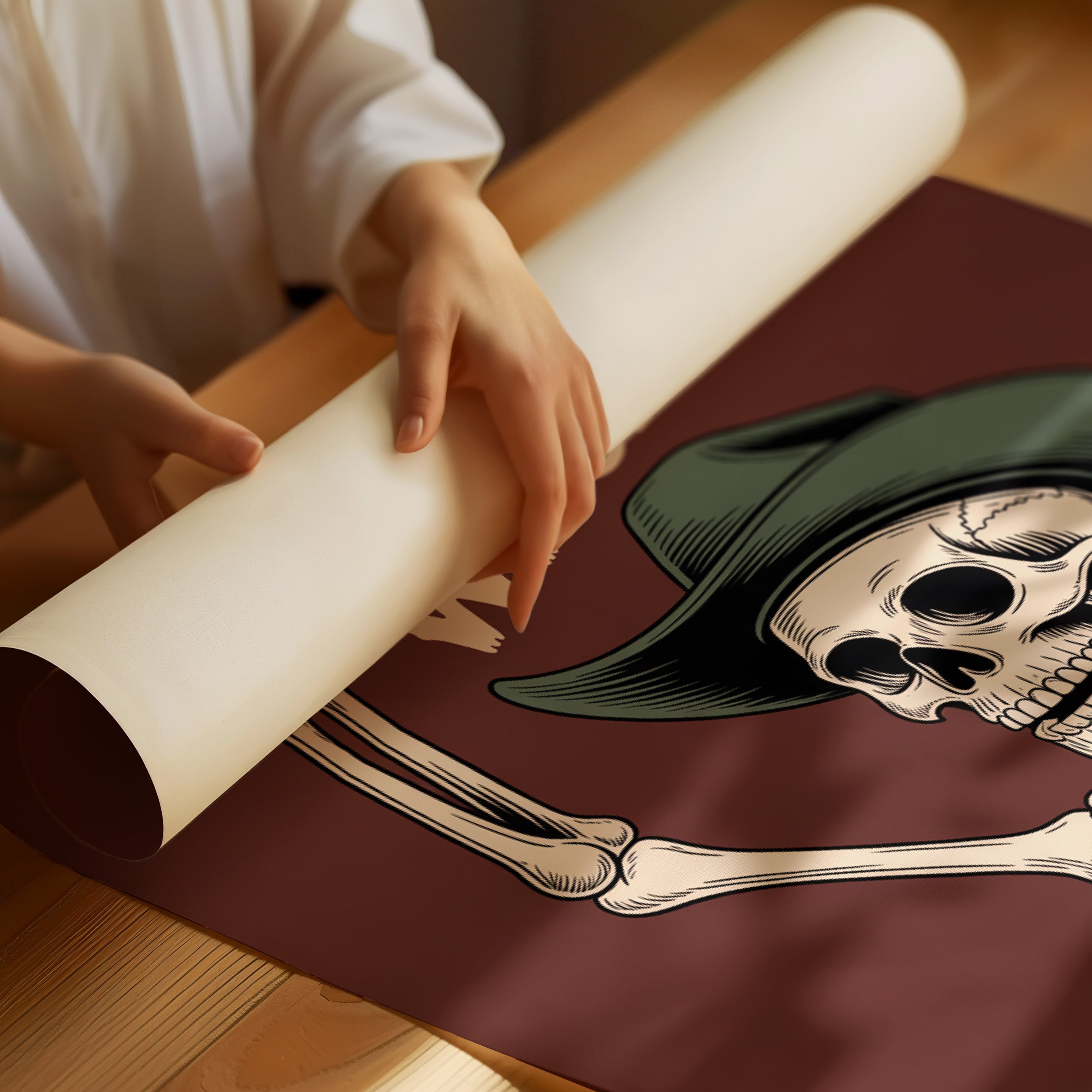 A mischievous rebellion lurks in the grinning skeleton, tipping his hat to the unconventional. The rich russet background frames the cream-colored bones with striking contrast, while the forest green cowboy hat adds a playful twist to the macabre figure flashing a peace sign. This witty fusion of Western swagger and Halloween spirit creates an irreverent celebration of counterculture. Perfect for adding edgy character to a home office, game room, or any space that welcomes conversation-starting art with personality.