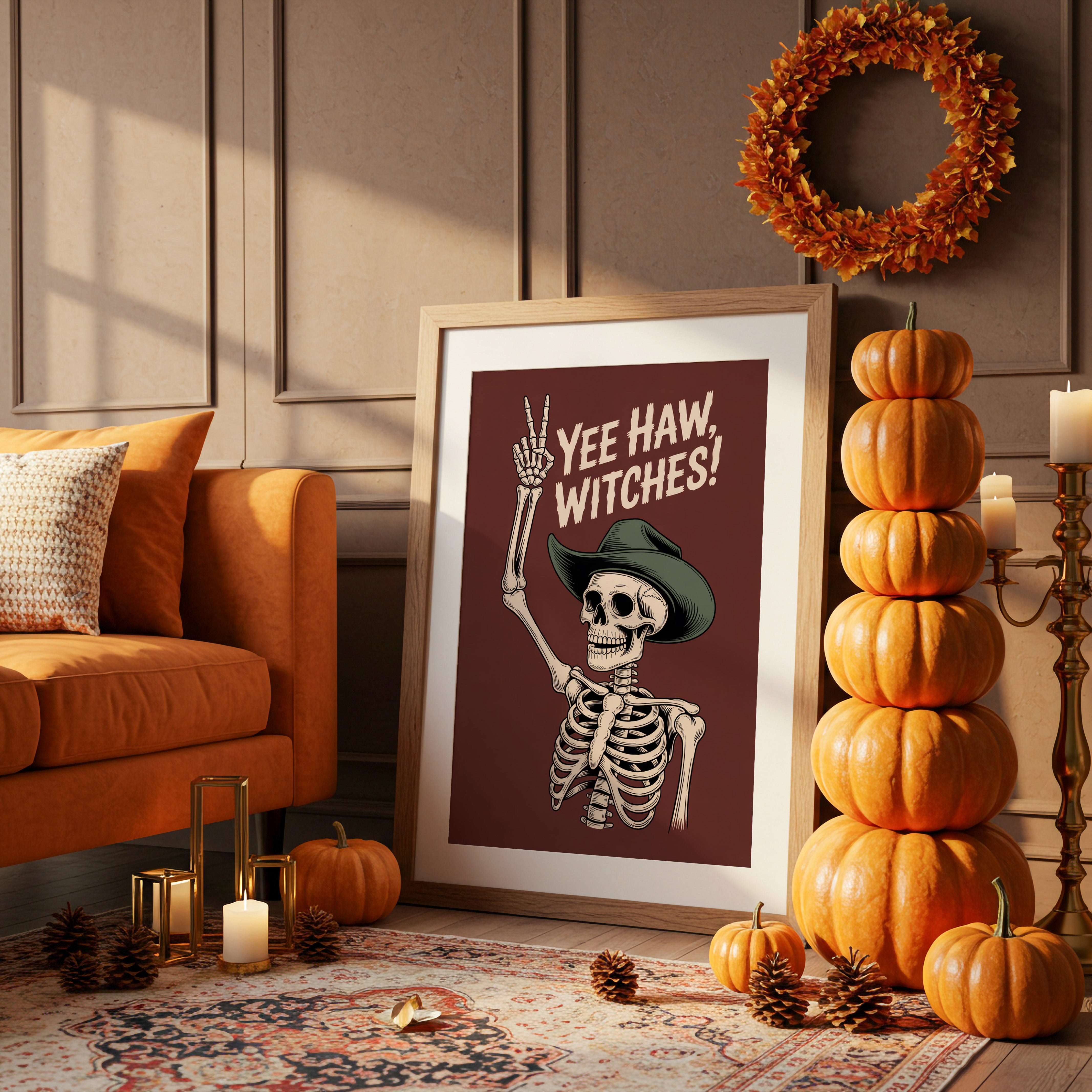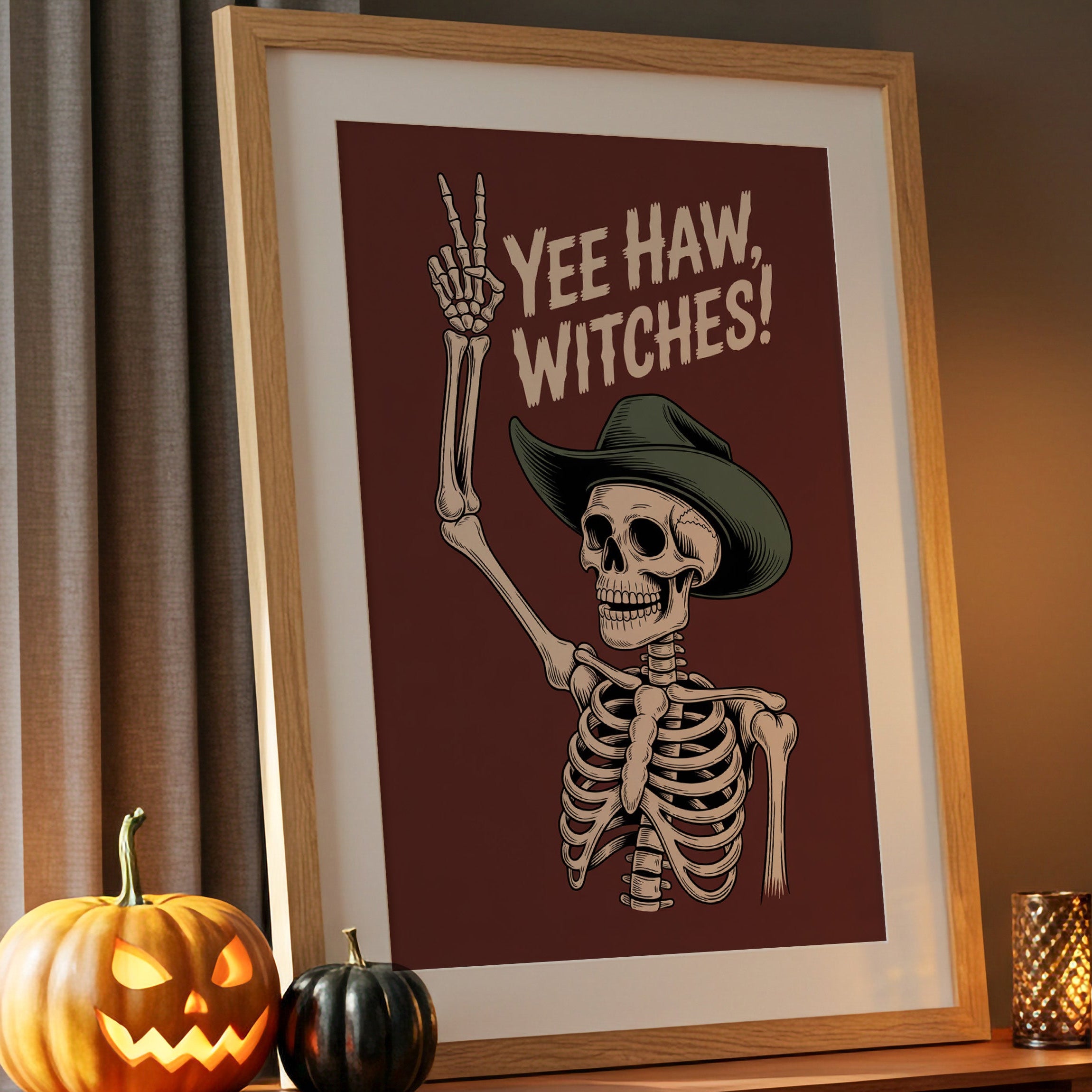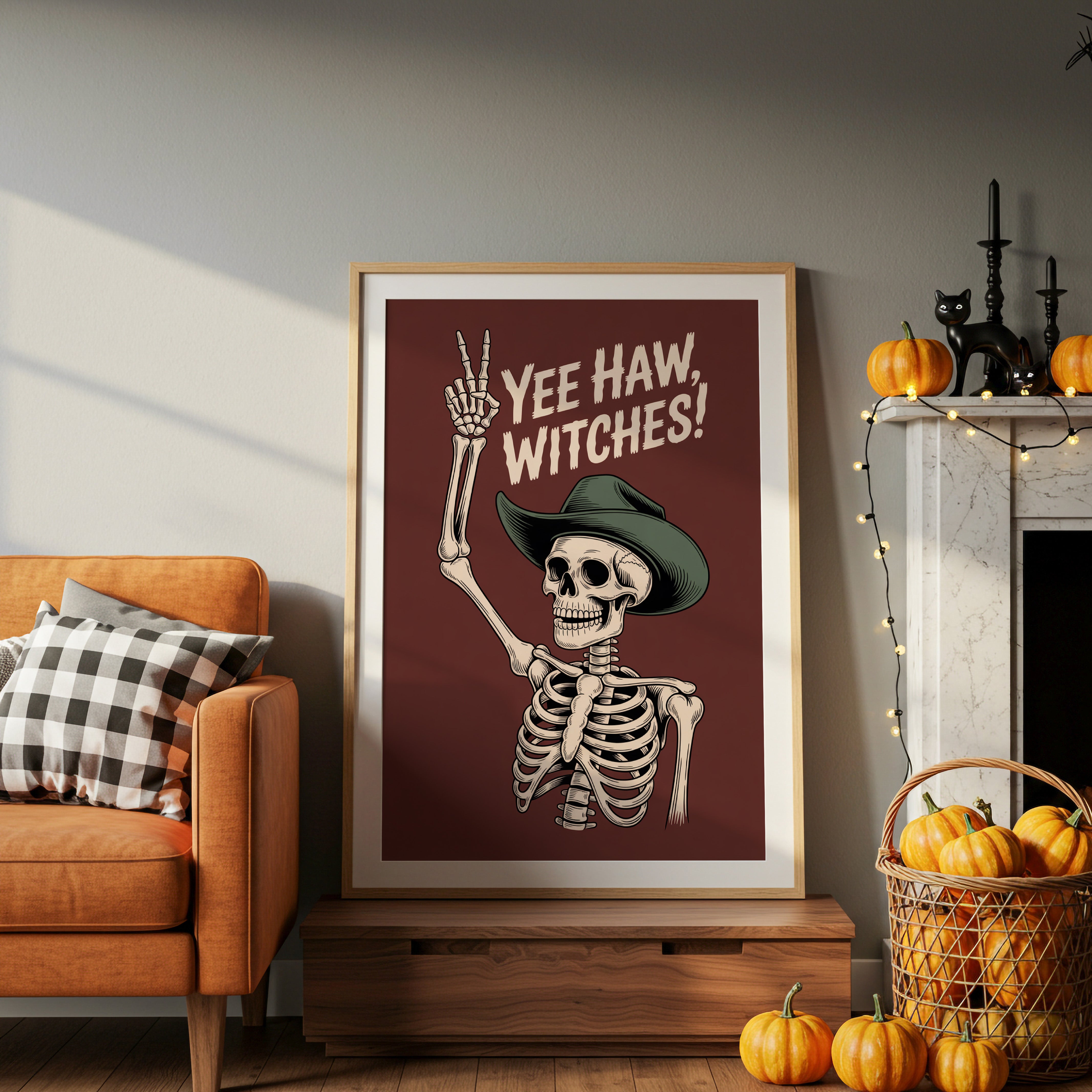 A mischievous rebellion lurks in the grinning skeleton, tipping his hat to the unconventional. The rich russet background frames the cream-colored bones with striking contrast, while the forest green cowboy hat adds a playful twist to the macabre figure flashing a peace sign. This witty fusion of Western swagger and Halloween spirit creates an irreverent celebration of counterculture. Perfect for adding edgy character to a home office, game room, or any space that welcomes conversation-starting art with personality.
