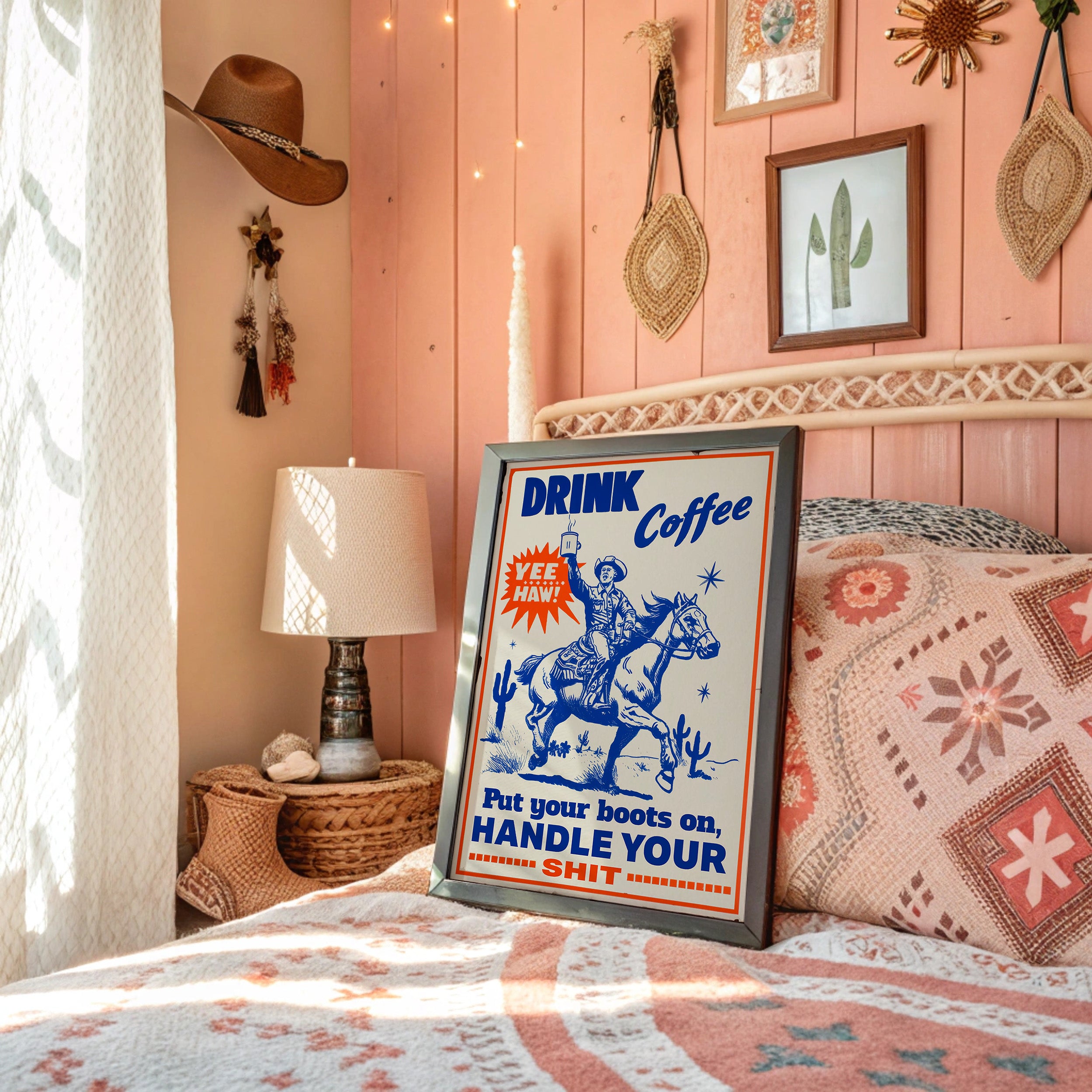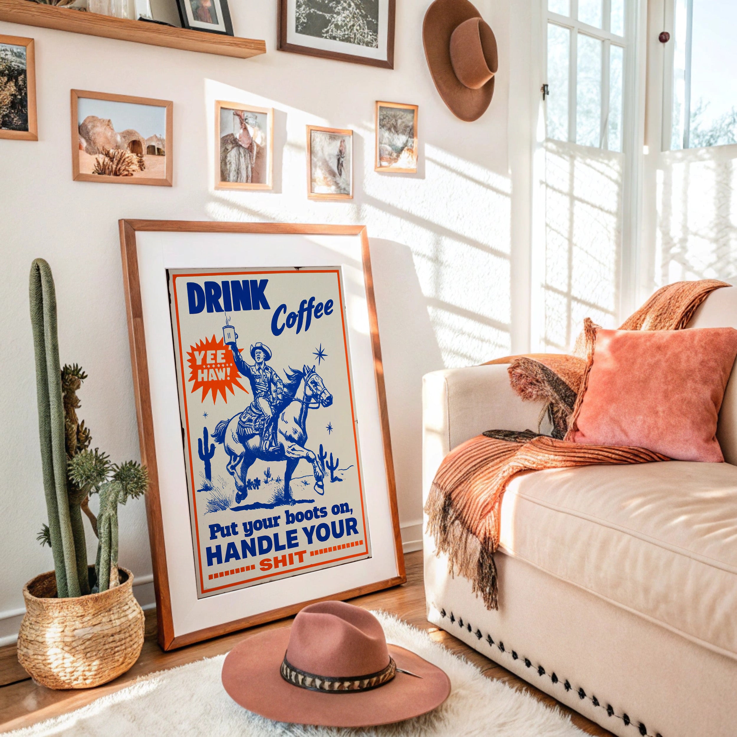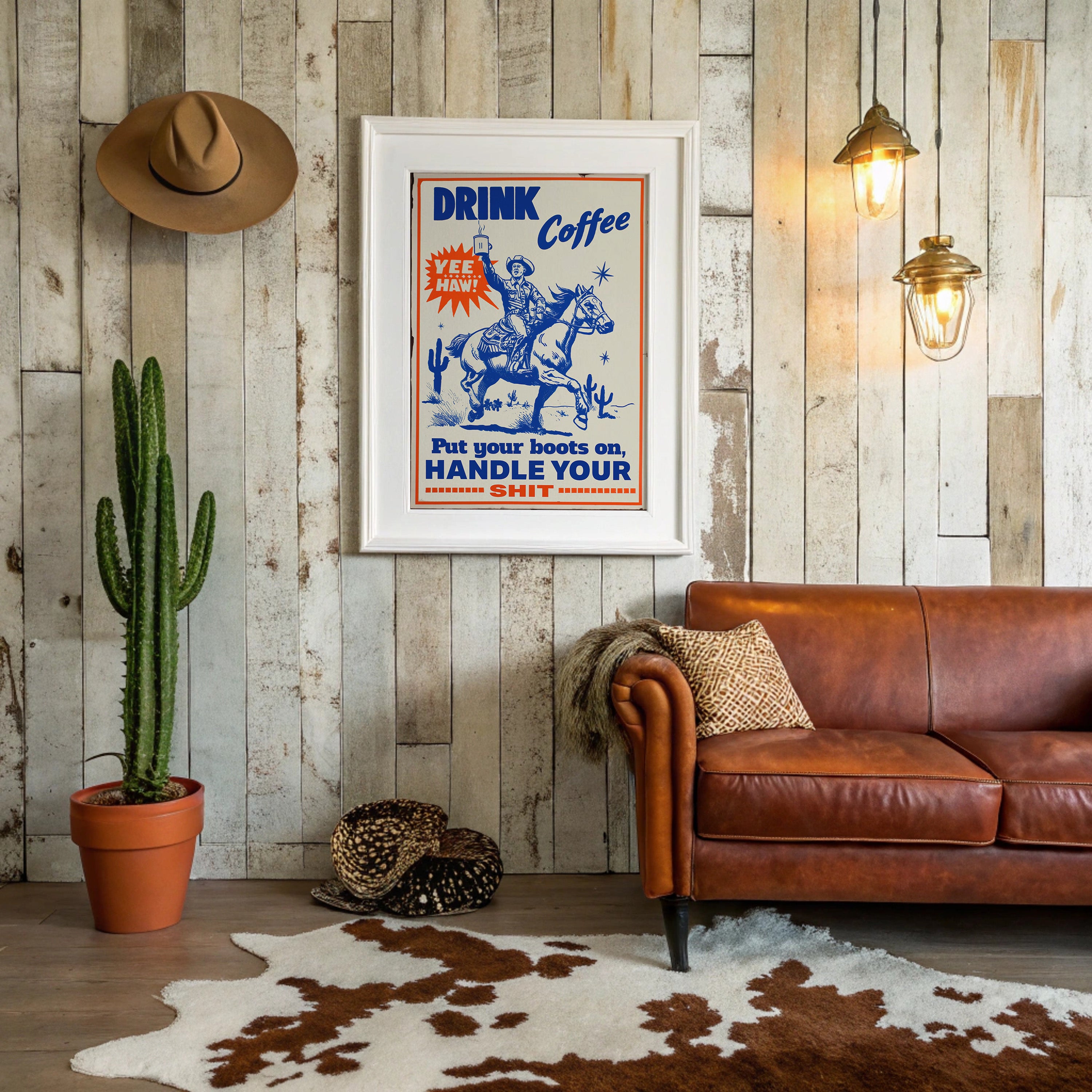 A playful vintage-inspired scene captures the spirit of the American West, where coffee meets cowboy attitude. The retro-style poster in bold blue and red commands attention against weathered wooden walls, while a tall saguaro cactus stands sentinel nearby. Rich leather furniture, cowhide rugs, and warm Edison lighting create a perfectly balanced modern ranch aesthetic. This spirited piece brings character to home offices, coffee bars, or any space needing a dash of Western charm.