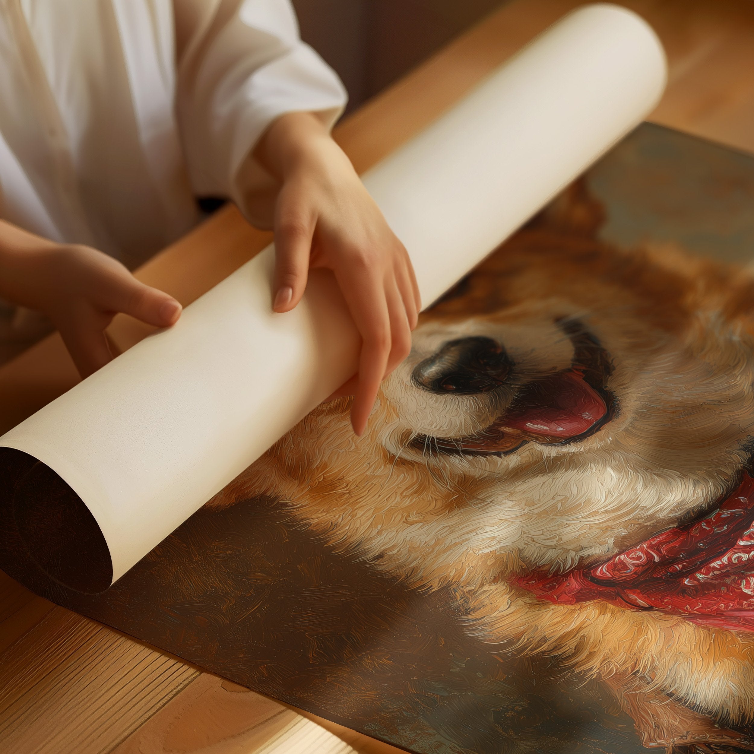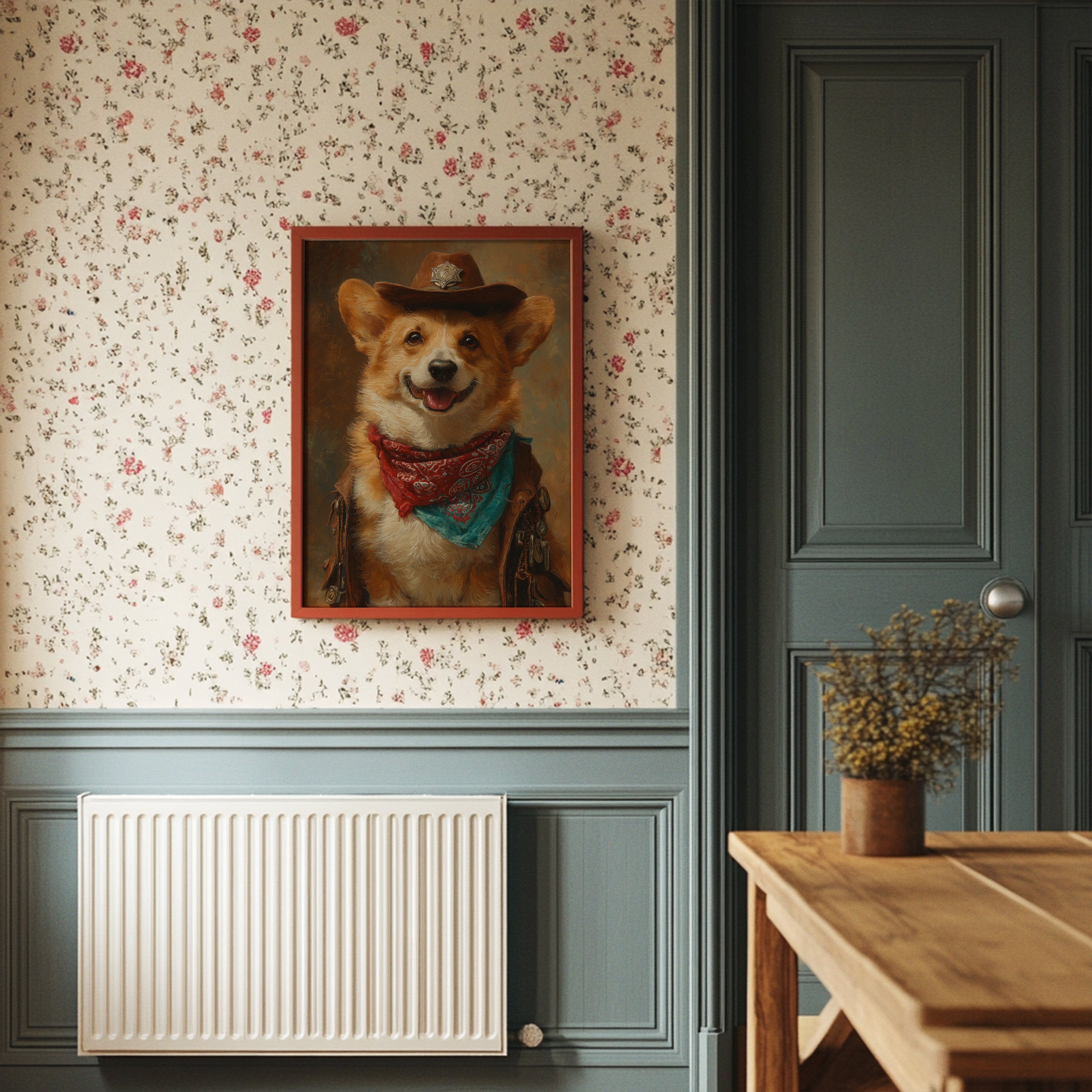 A charming portrait captures the playful spirit of a smiling corgi dressed in western attire, complete with sheriff's hat and bandana. Warm amber tones highlight the dog's expressive face and joyful demeanor, creating an instant mood-lifter with its blend of humor and nostalgic charm. The portrait's vintage aesthetic brings personality and whimsy to the space, adding a touch of character without sacrificing style. This statement piece creates an inviting focal point in a rustic living room, home office, or any space needing a conversation starter with heart.