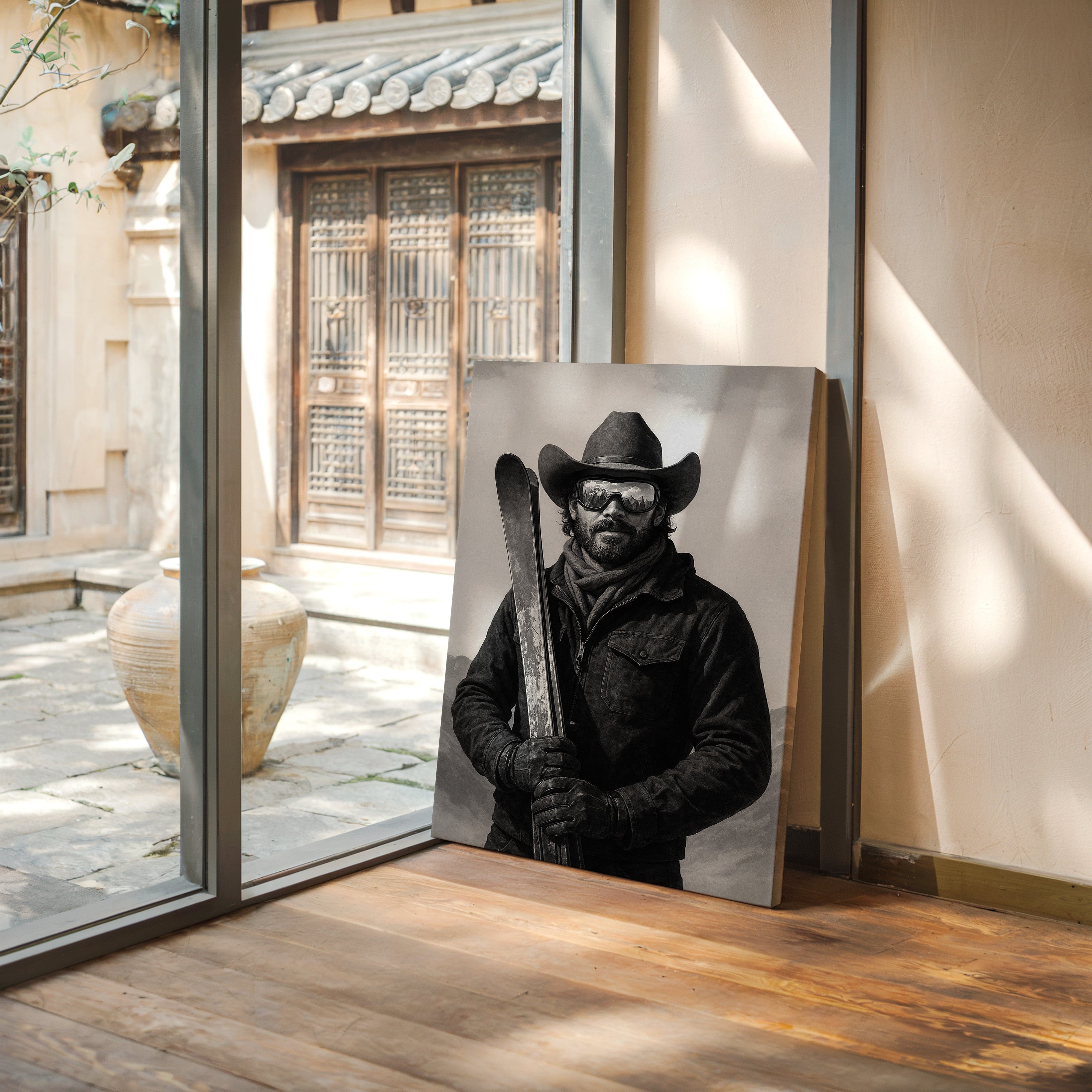 Cowboy Skier is a striking black-and-white portrait that blends two rugged frontiers — the untamed West and the alpine wilds. A bearded cowboy in aviator goggles grips his skis with confidence, reflecting snow-capped peaks in his lenses. With leather gloves, a denim jacket, and a weathered hat, he’s ready for the backcountry. This artwork is perfect for lovers of mountain adventures, modern Americana, and bold masculine decor.