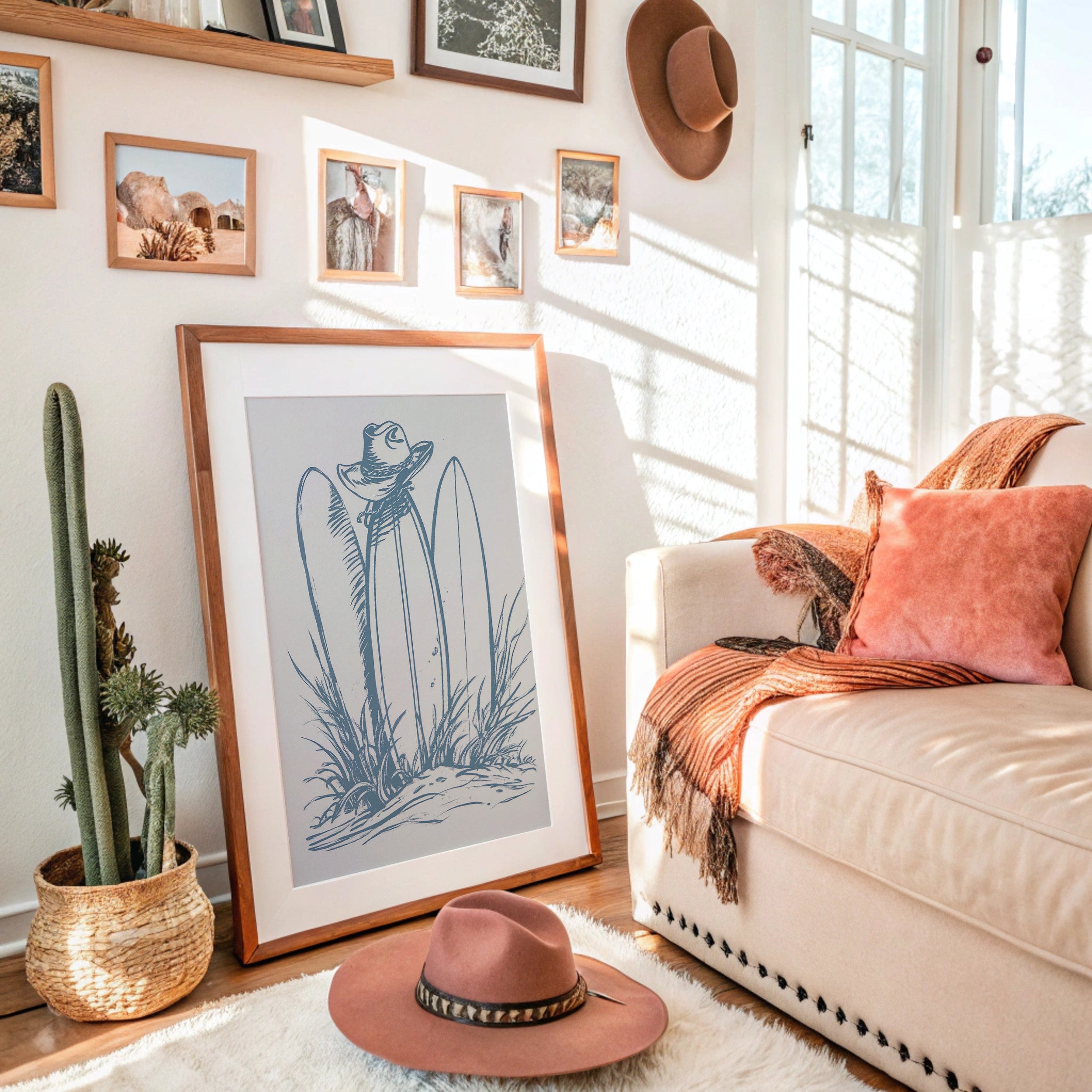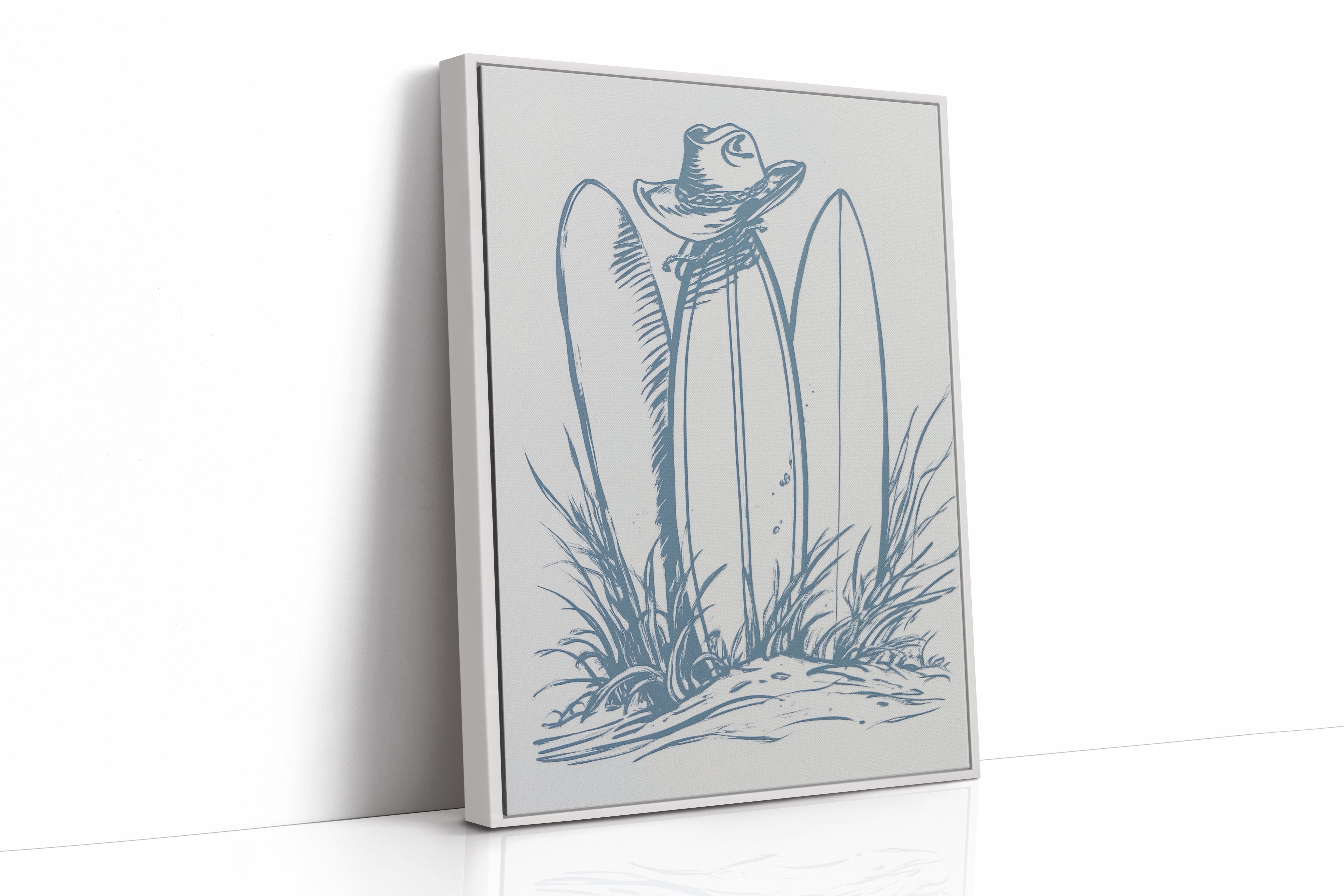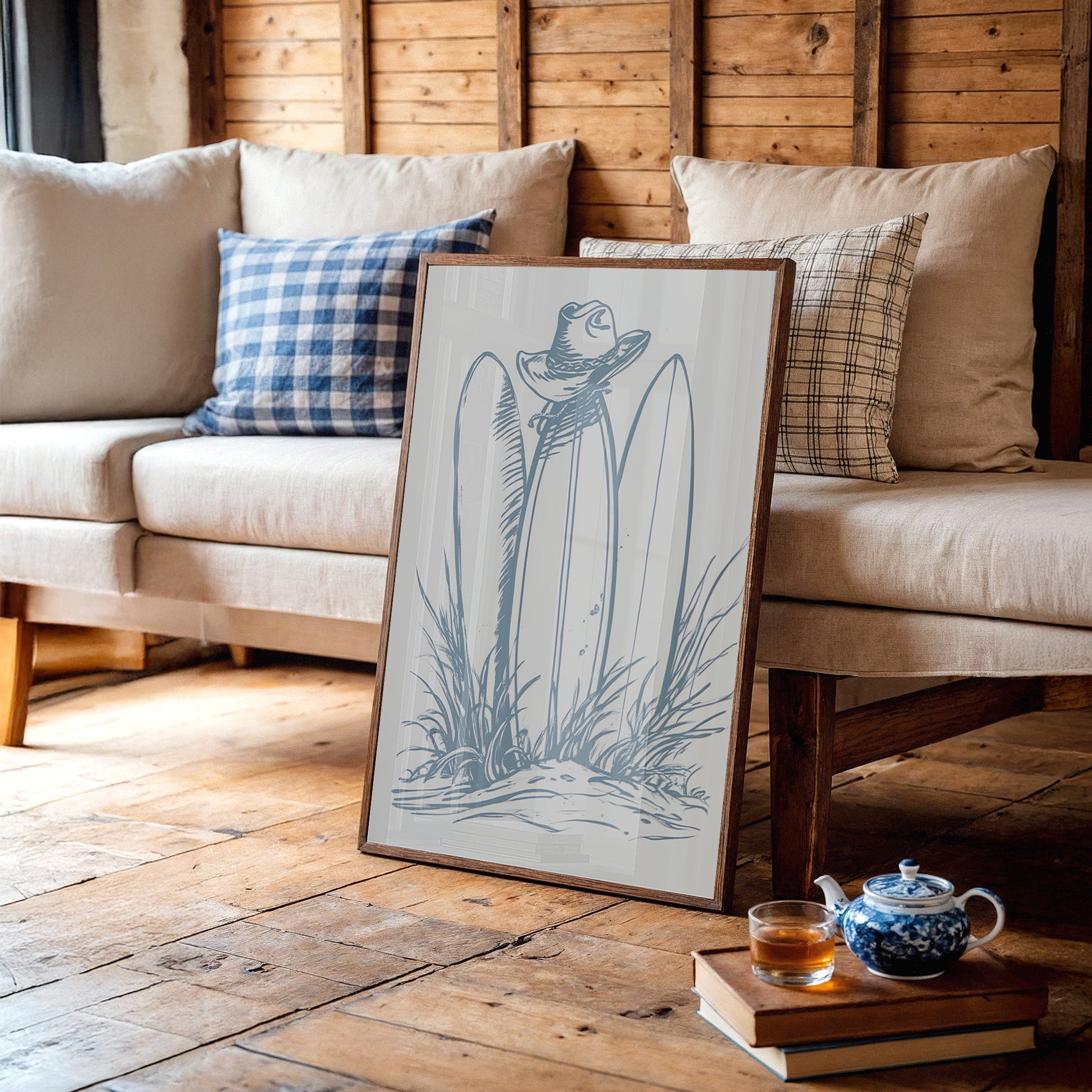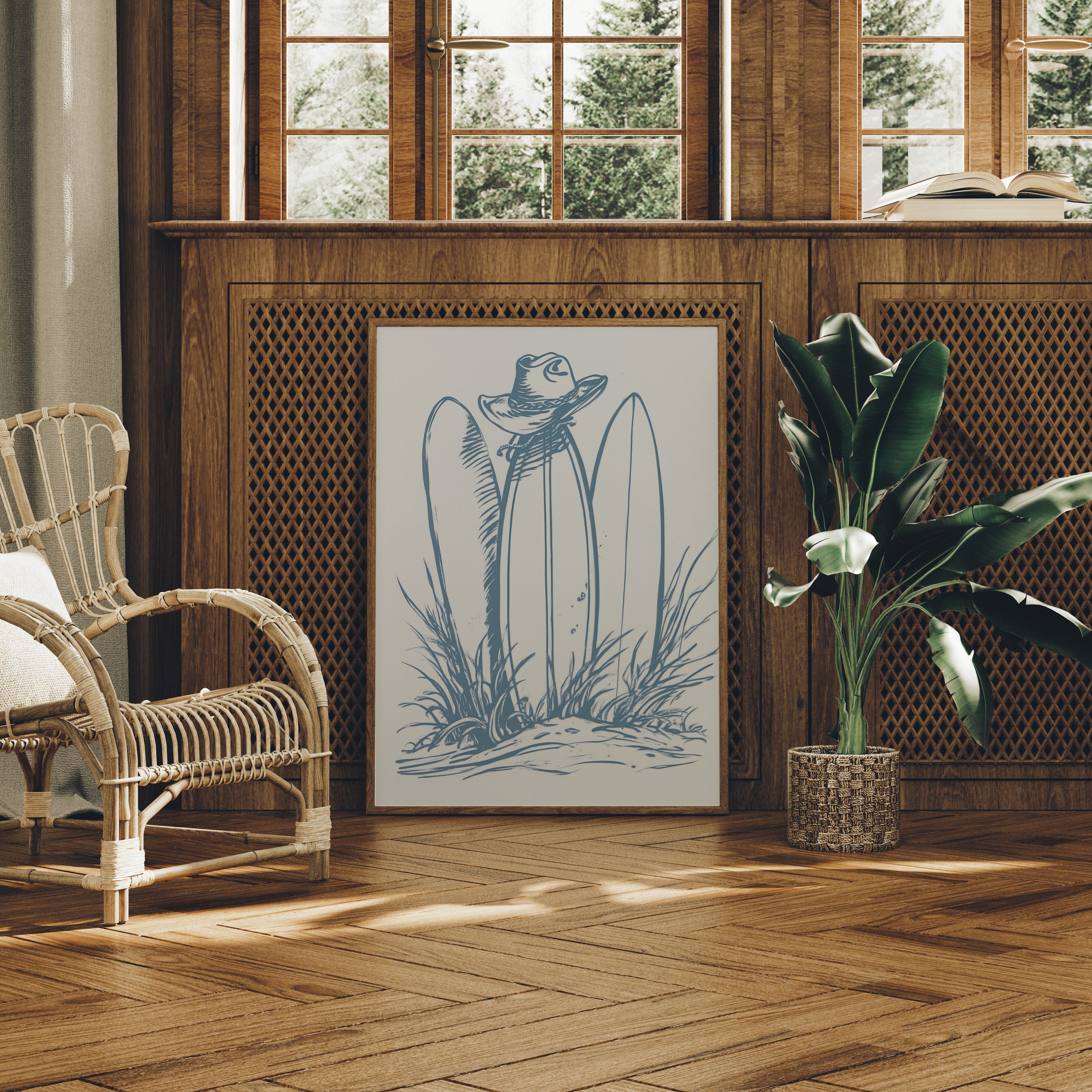 A playful fusion of Western charm and coastal cool emerges in gentle blue strokes, where surfboards stand sentinel adorned with a classic cowboy hat. This piece from our Contemporary collection blends iconic symbols in an unexpected duet. The composition speaks to the free spirit of both surf culture and frontier adventure, with wispy beach grass swaying at the boards' feet like tumbleweeds on a sandy shore. Perfect for bringing a touch of whimsical sophistication to a beach house living room or adding character to a modern home office. Each viewing reveals new details in this cultural crossover that celebrates the adventurous spirit.