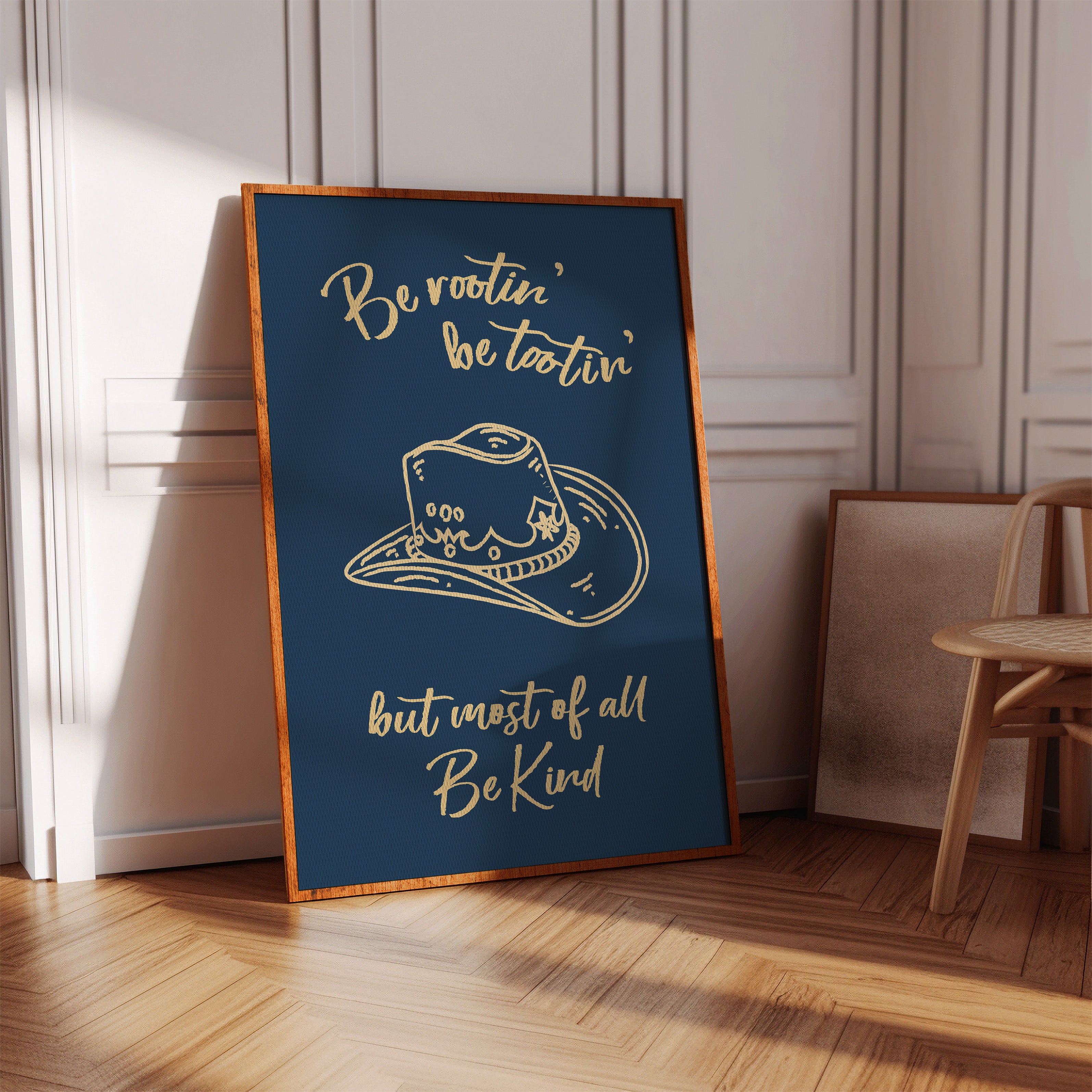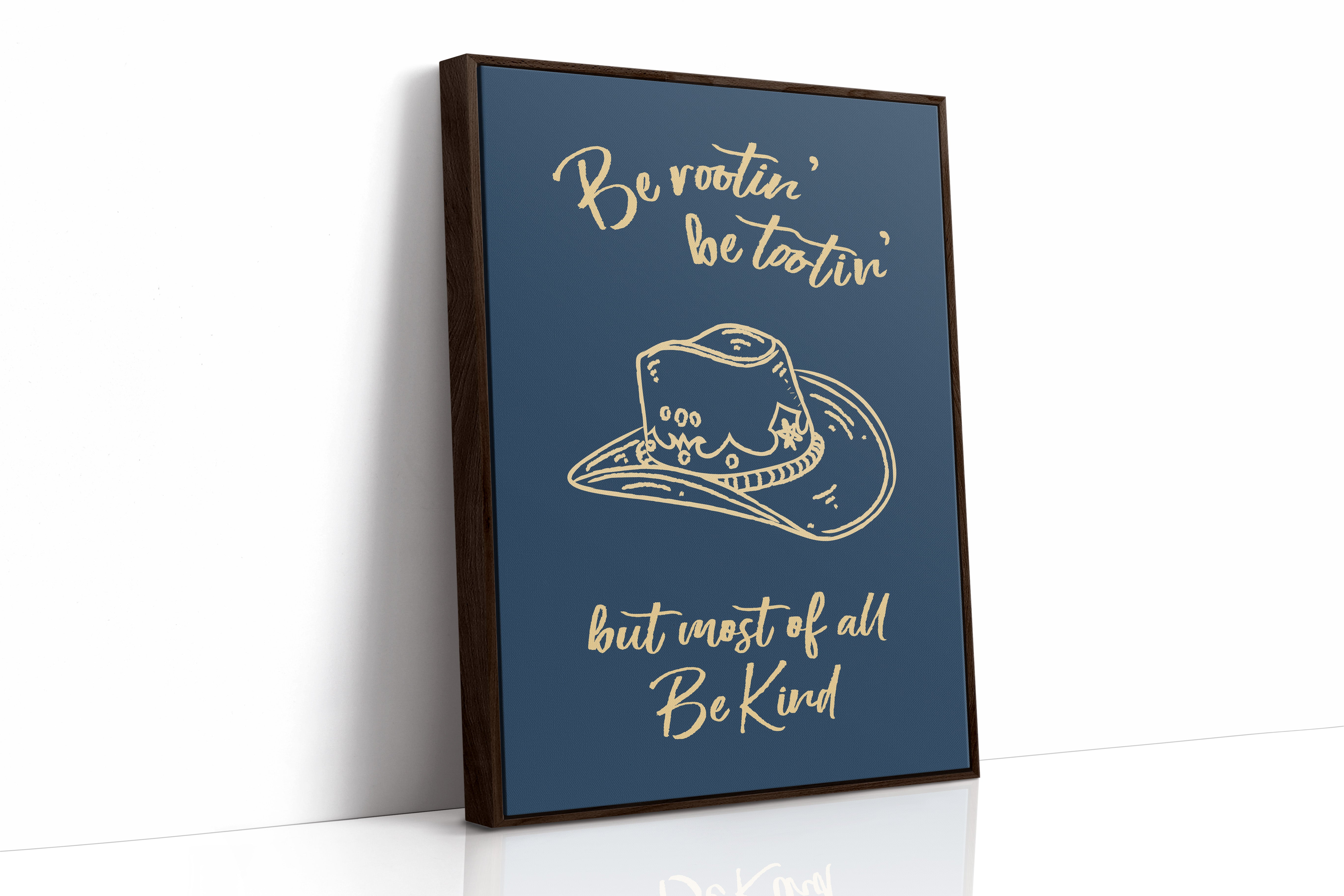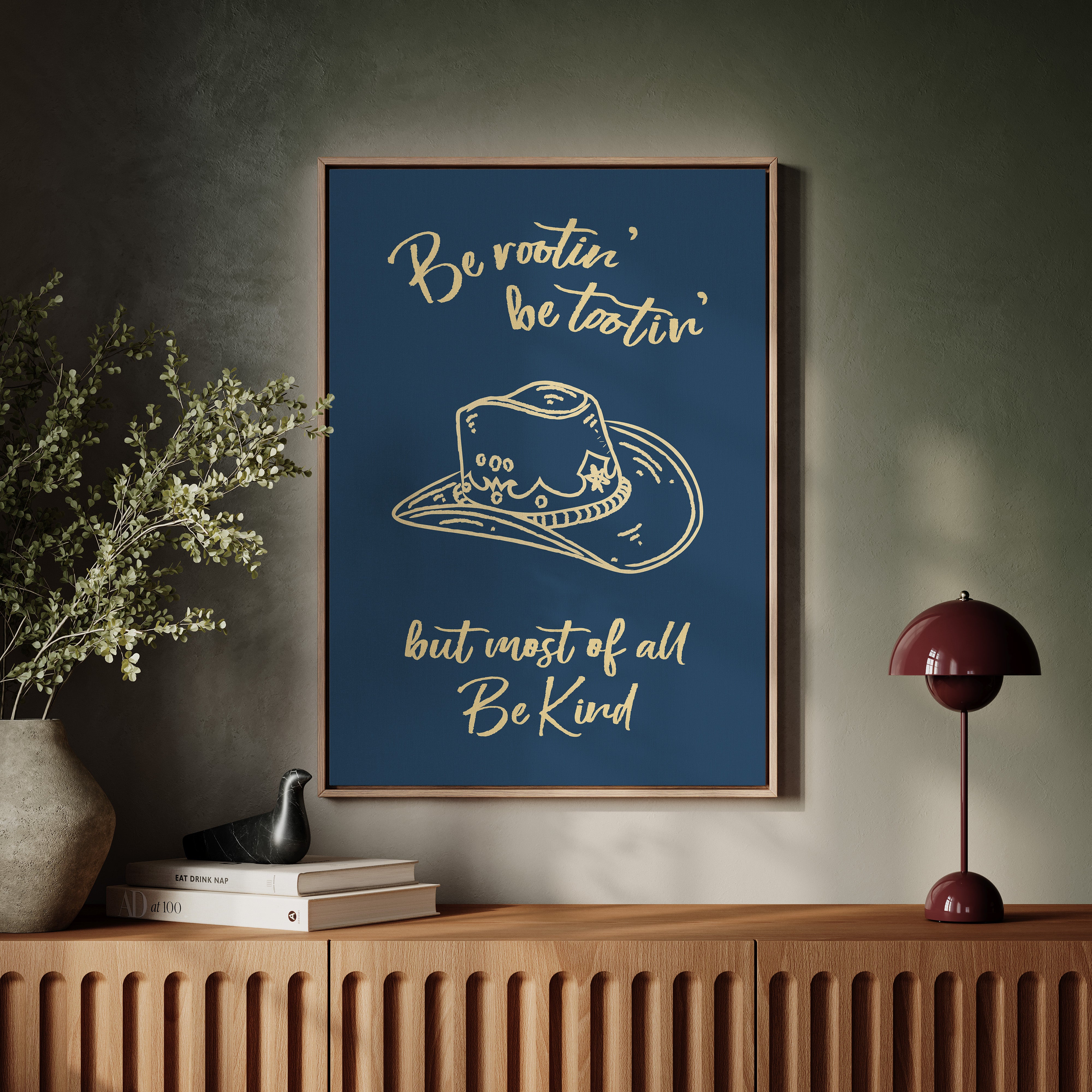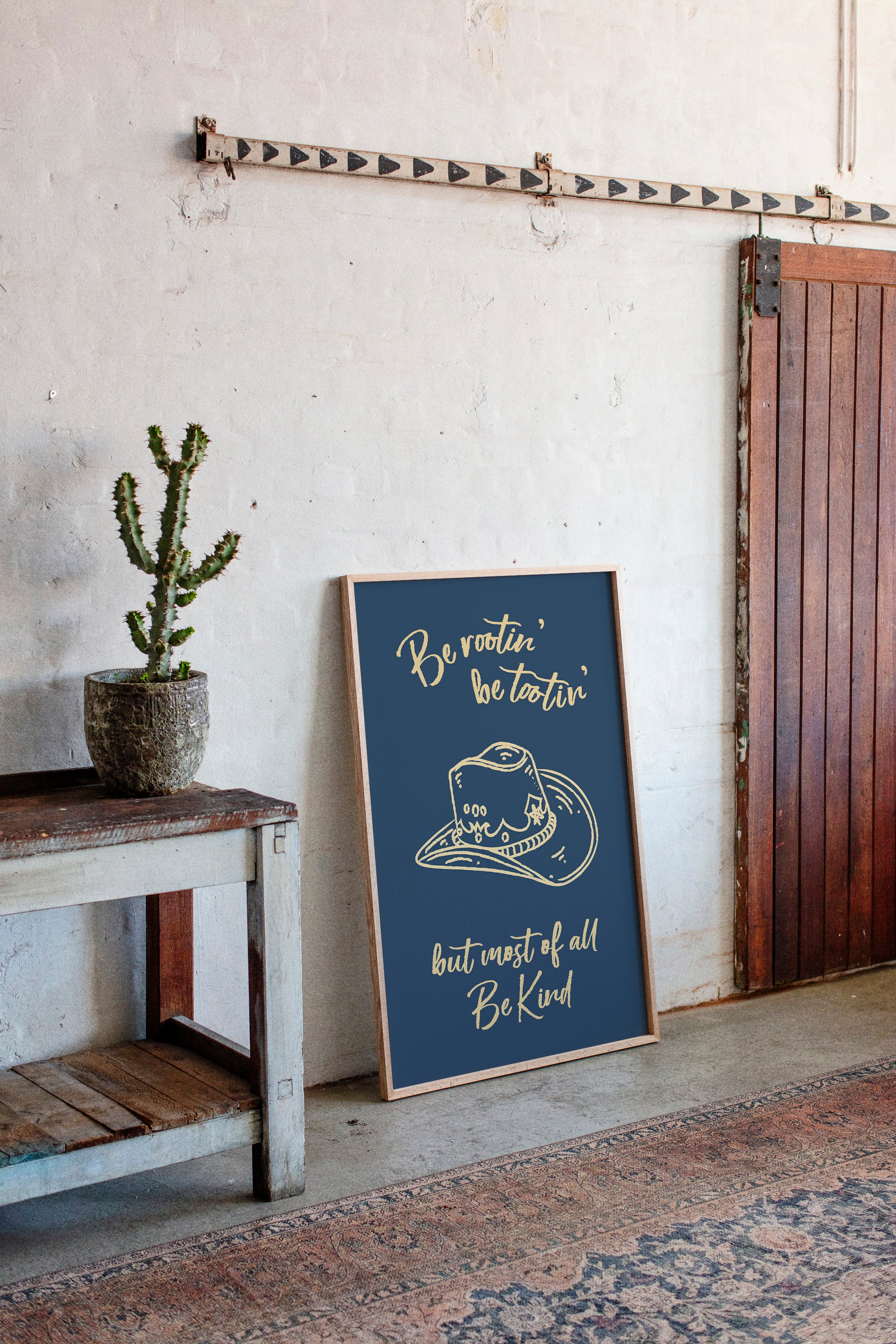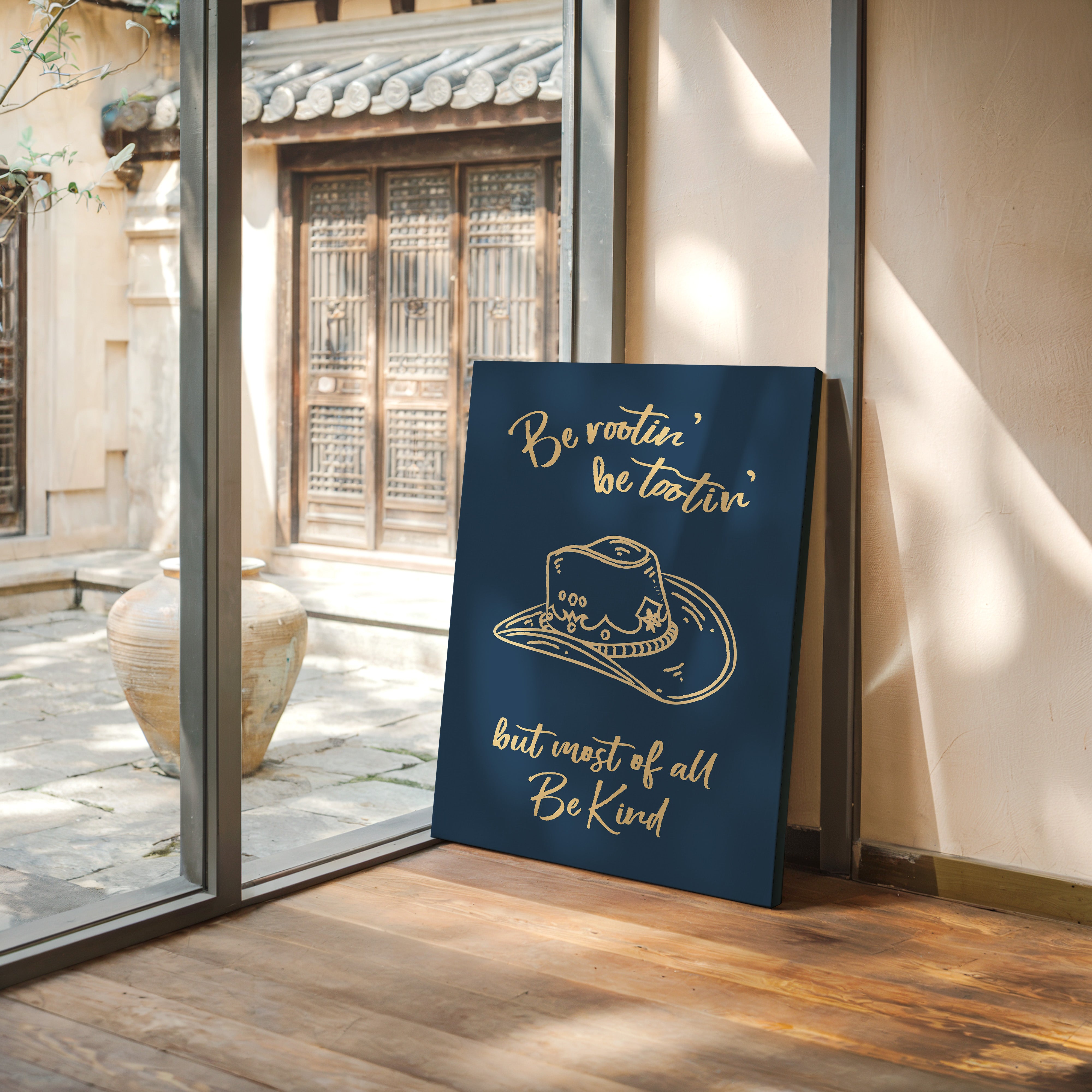 Against a deep navy backdrop, golden wisdom shimmers with timeless charm. This piece from our Contemporary collection marries Western authenticity with modern minimalist design. The hand-drawn cowboy hat and flowing script create a harmonious dance between rugged adventure and gentle reminder, while the message speaks to both strength and compassion. Perfect for adding character to a home office or creating an inspiring focal point in an entryway. The simple yet powerful composition invites moments of reflection while adding a touch of warmth to any space.