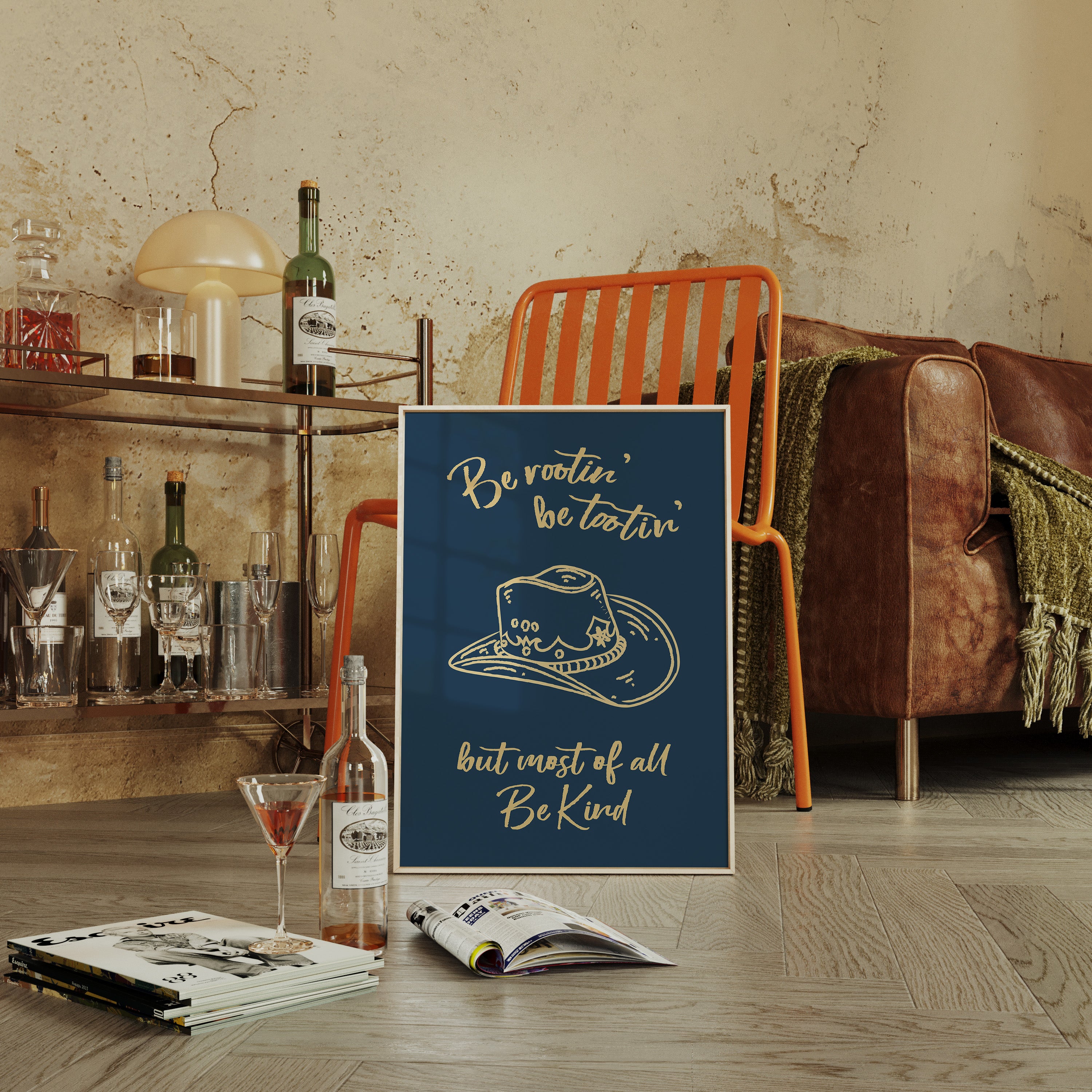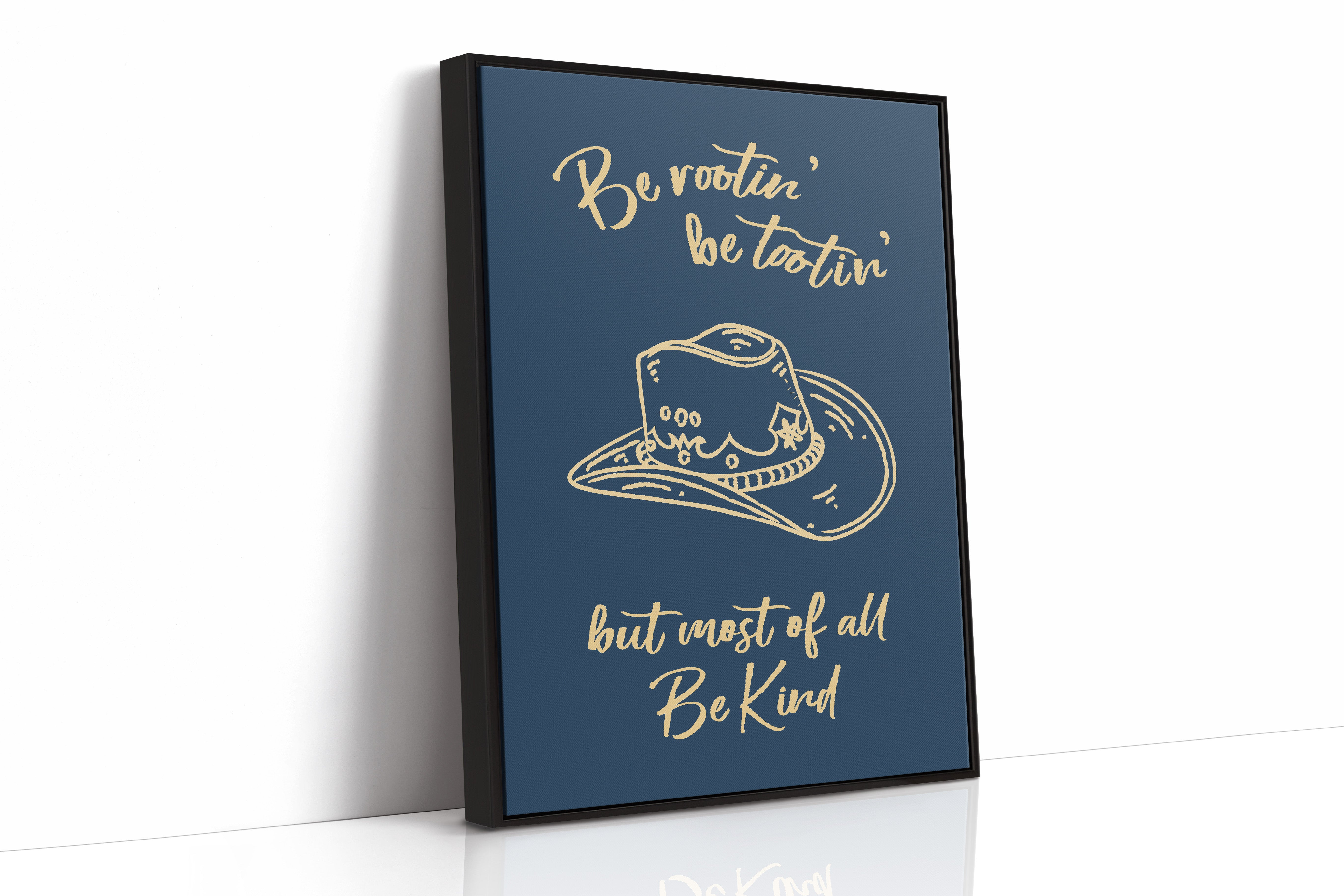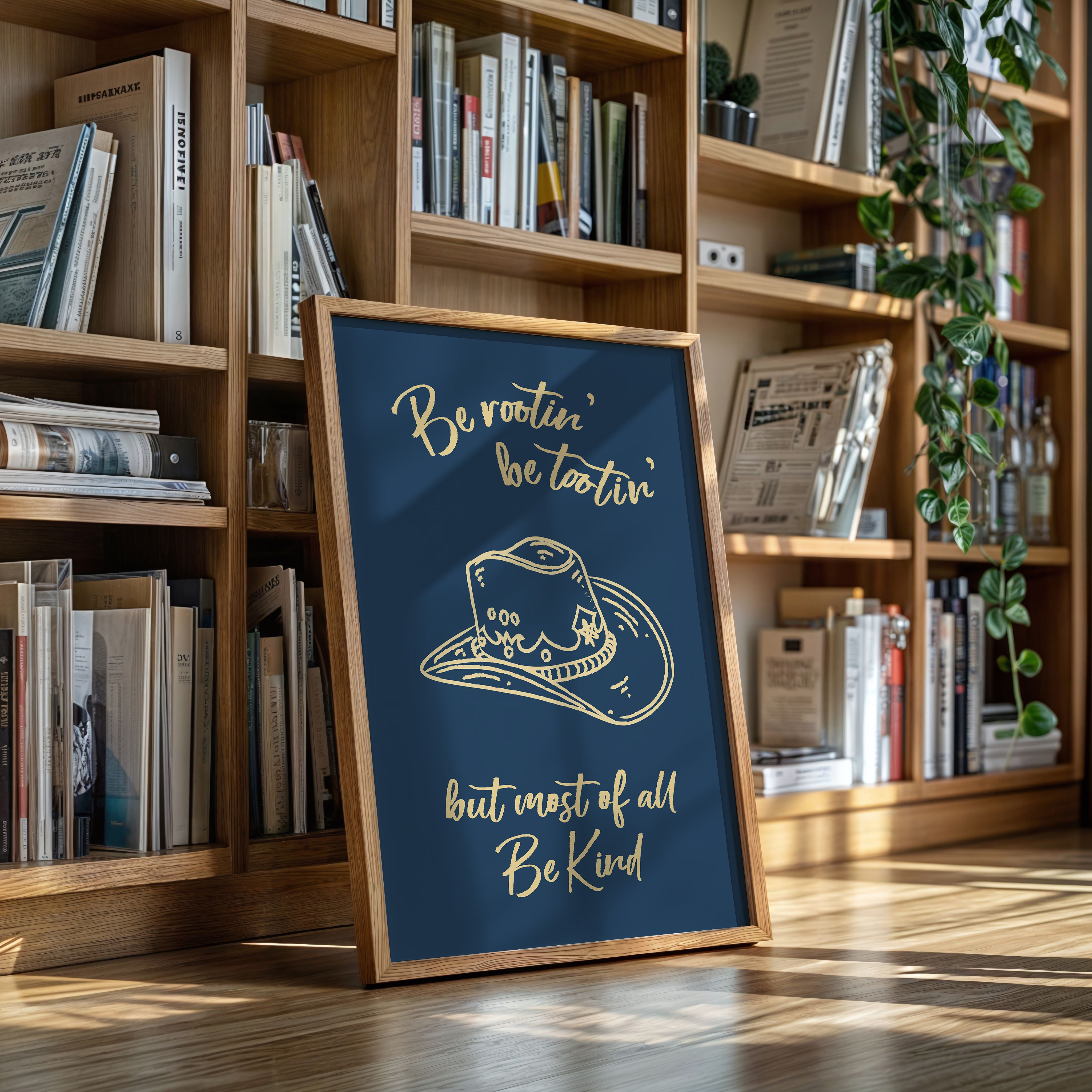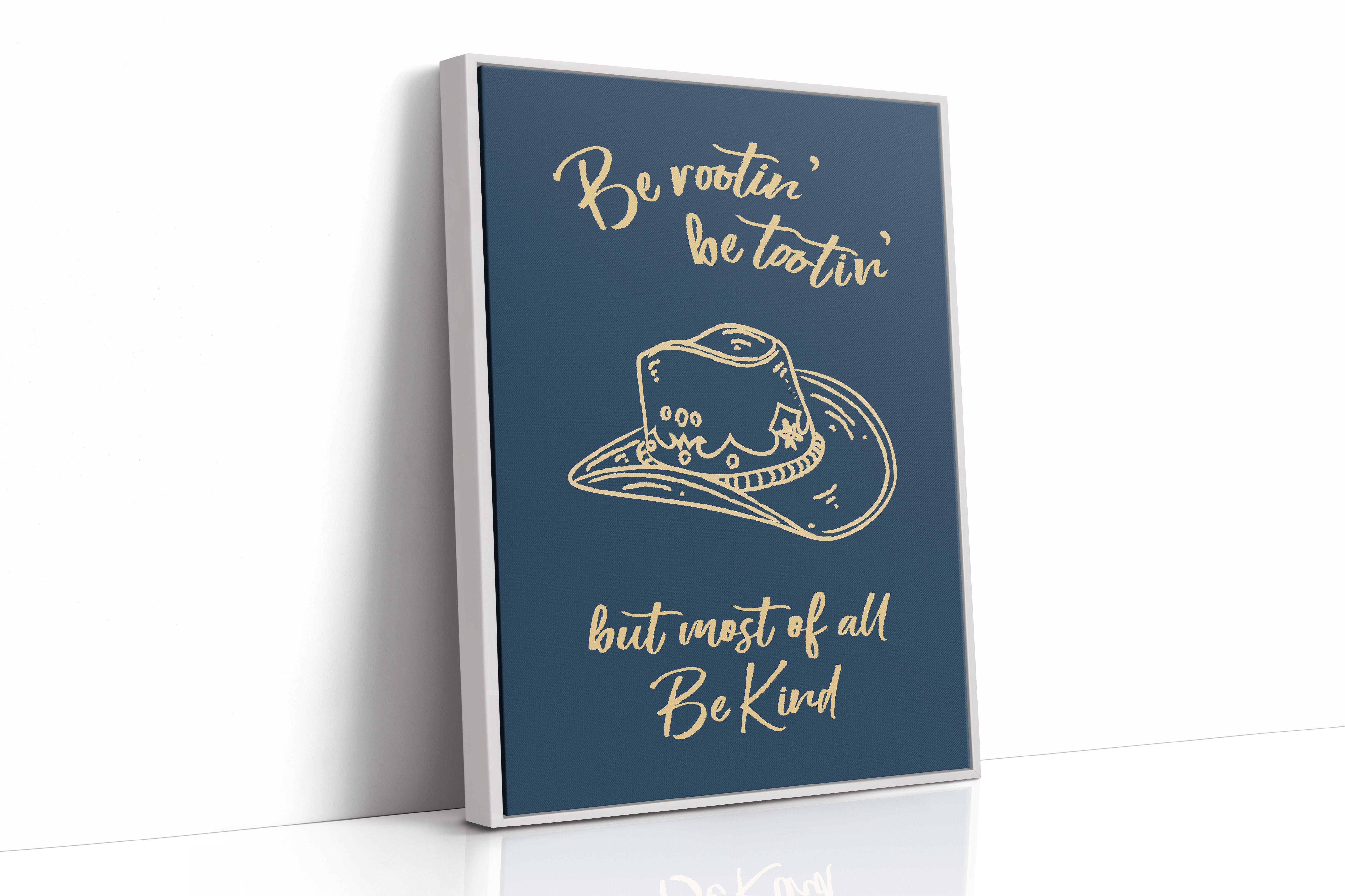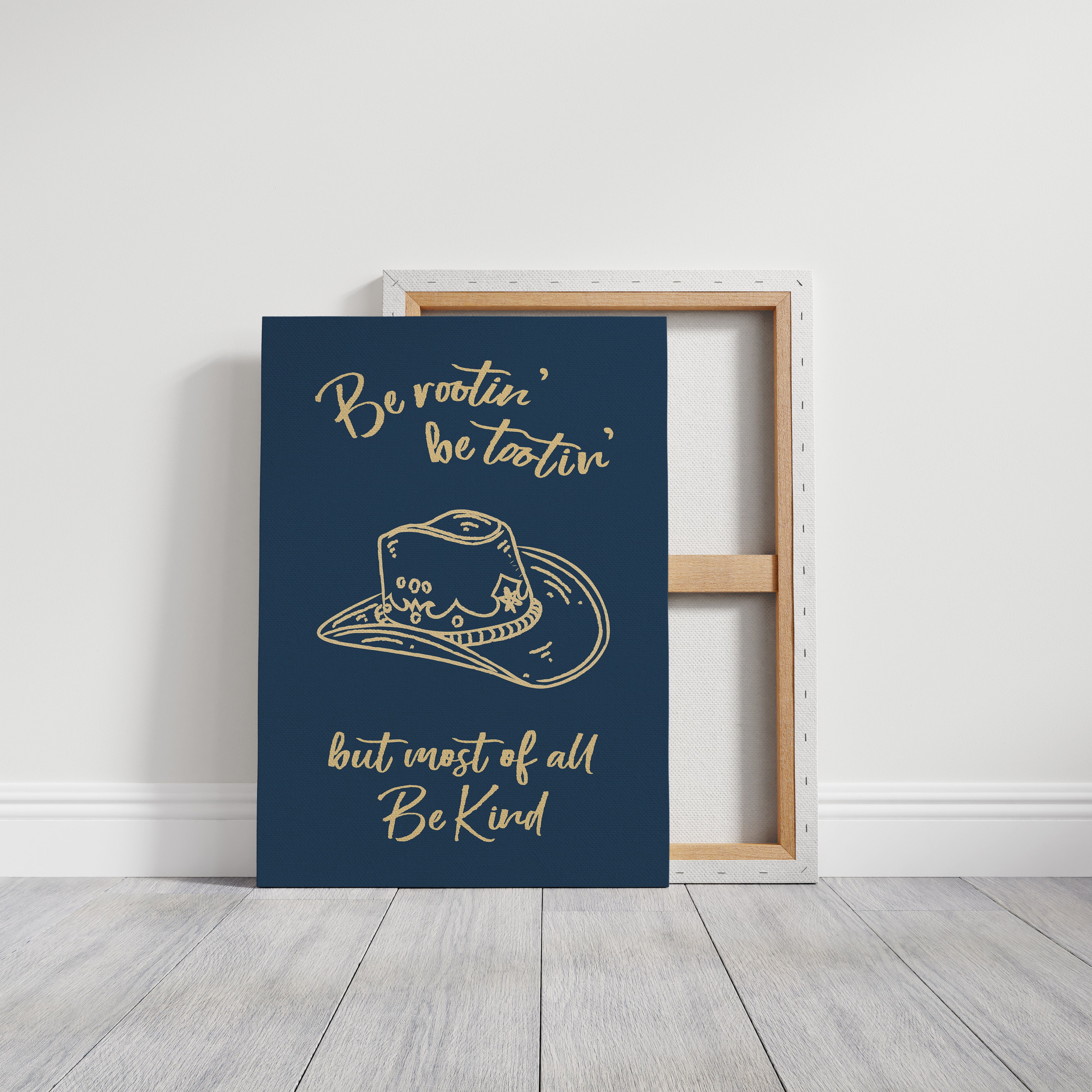 Against a deep navy backdrop, golden wisdom shimmers with timeless charm. This piece from our Contemporary collection marries Western authenticity with modern minimalist design. The hand-drawn cowboy hat and flowing script create a harmonious dance between rugged adventure and gentle reminder, while the message speaks to both strength and compassion. Perfect for adding character to a home office or creating an inspiring focal point in an entryway. The simple yet powerful composition invites moments of reflection while adding a touch of warmth to any space.