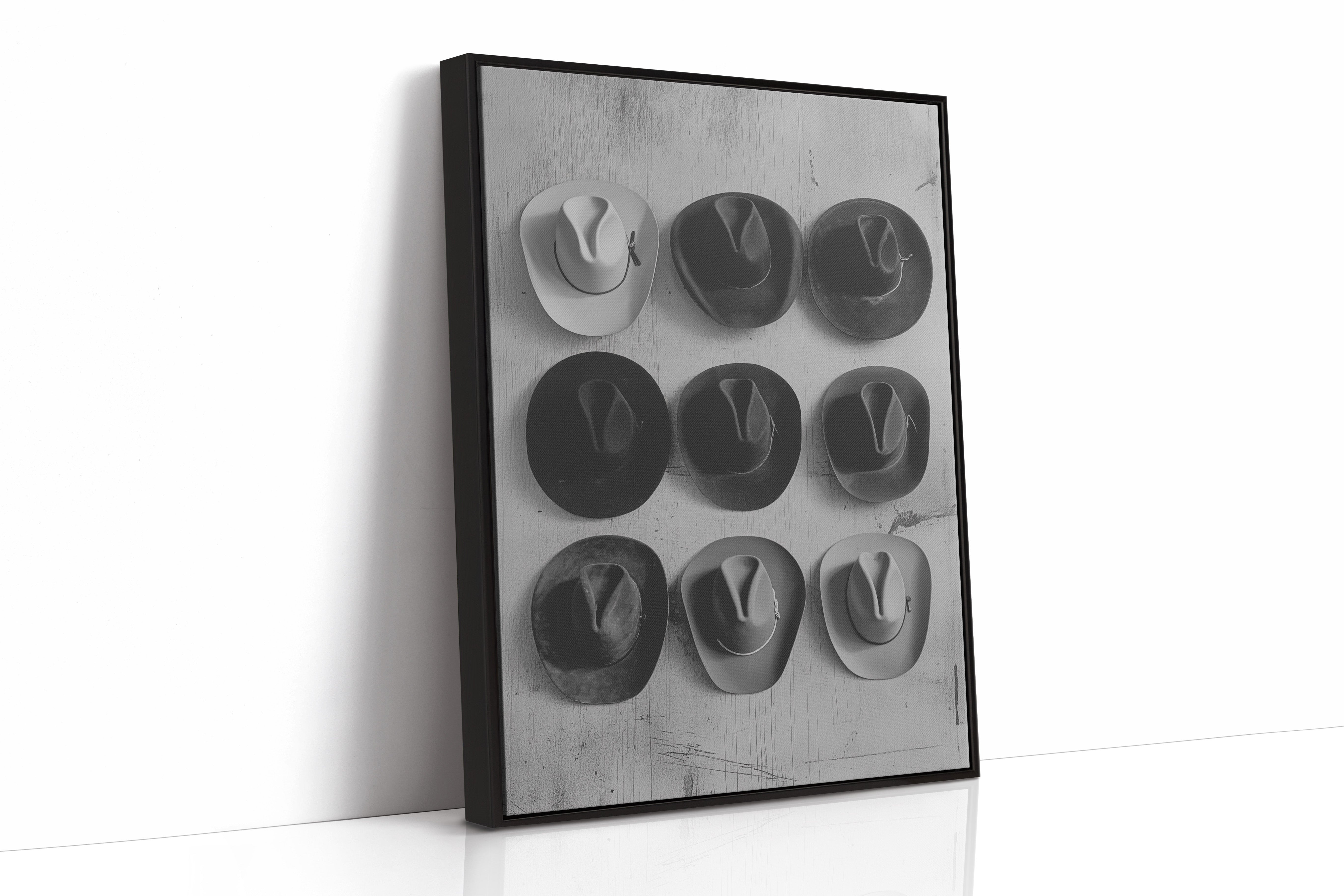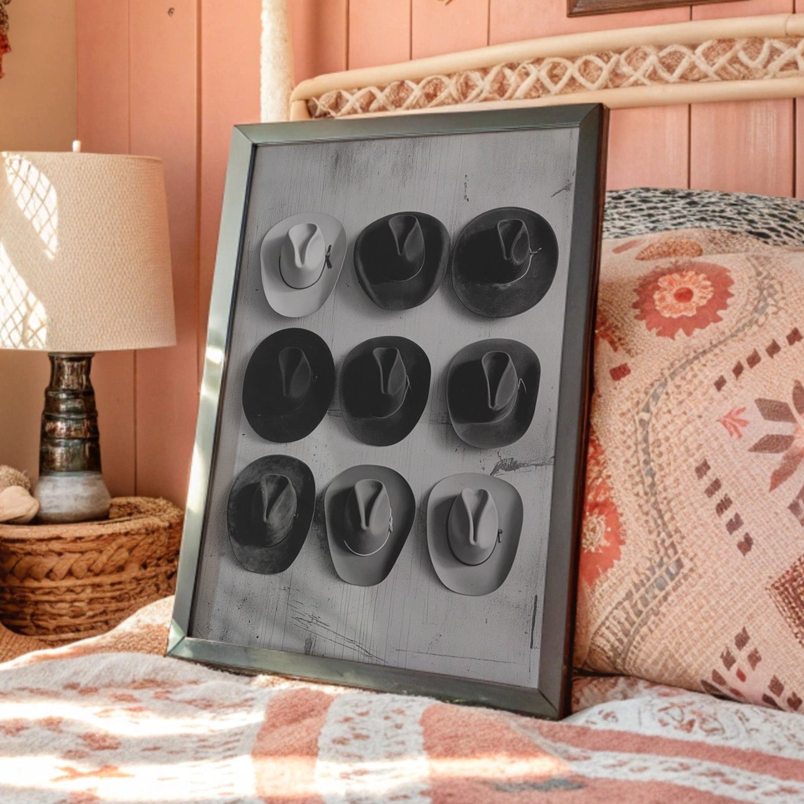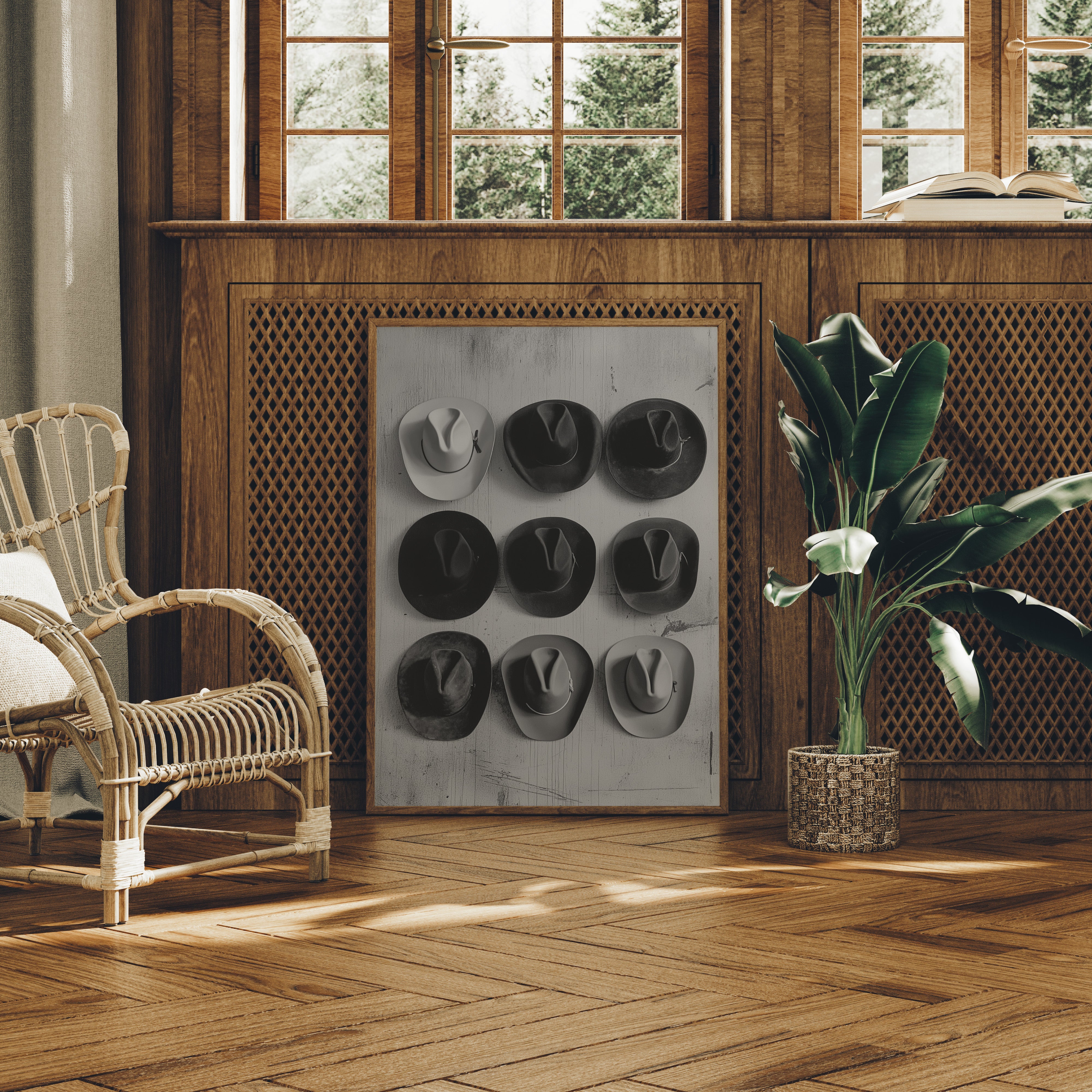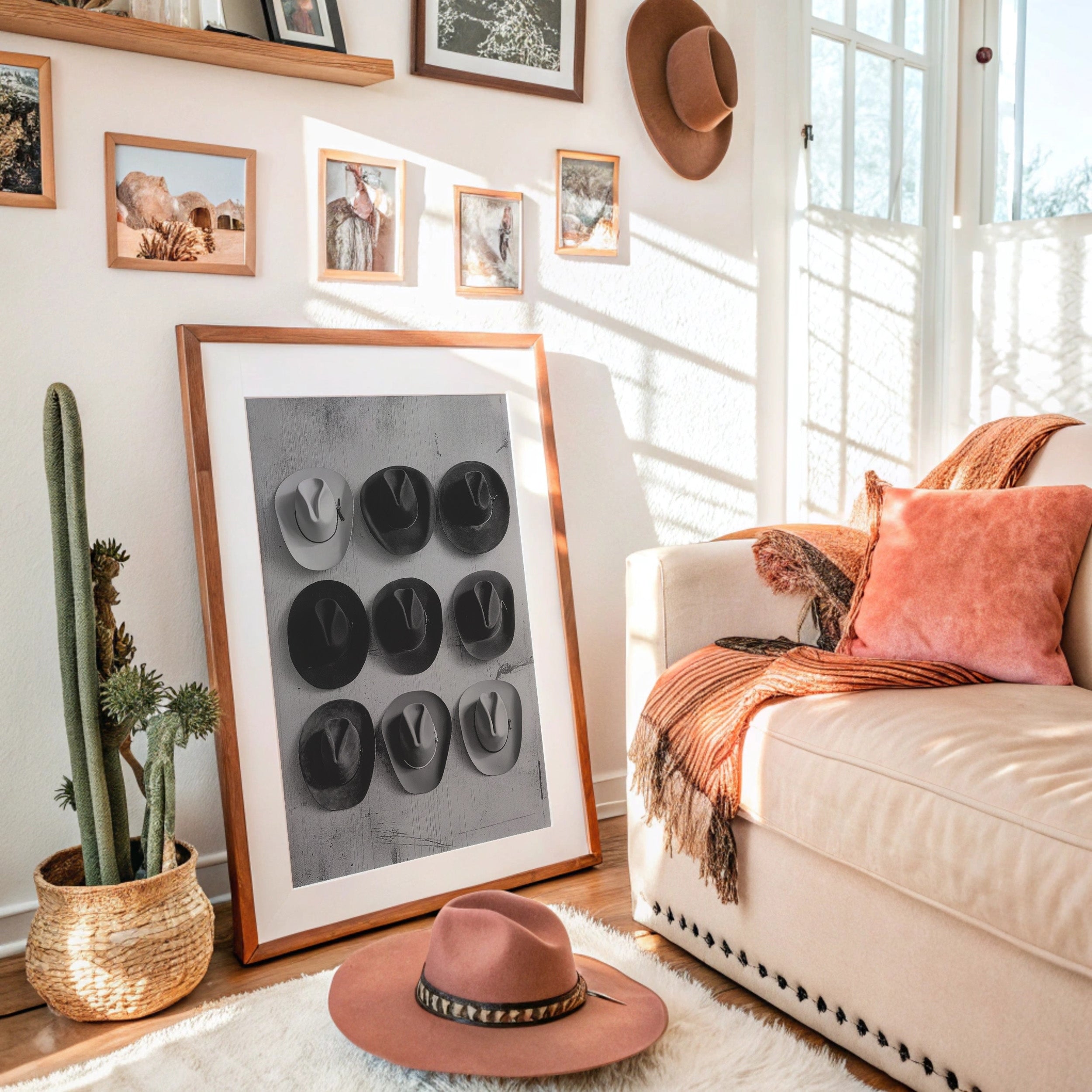 A weathered wooden backdrop sets the stage for a modern western sanctuary. Black and white cowboy hats line up in perfect formation within a crisp white frame, telling stories of dusty trails and wild frontiers. The rich leather sofa, tall cactus sentinel, and glowing lantern lights create a harmonious blend of rustic charm and contemporary comfort. This striking scene would elevate a modern ranch house, adding character to a living room or study where western heritage meets sophisticated design.