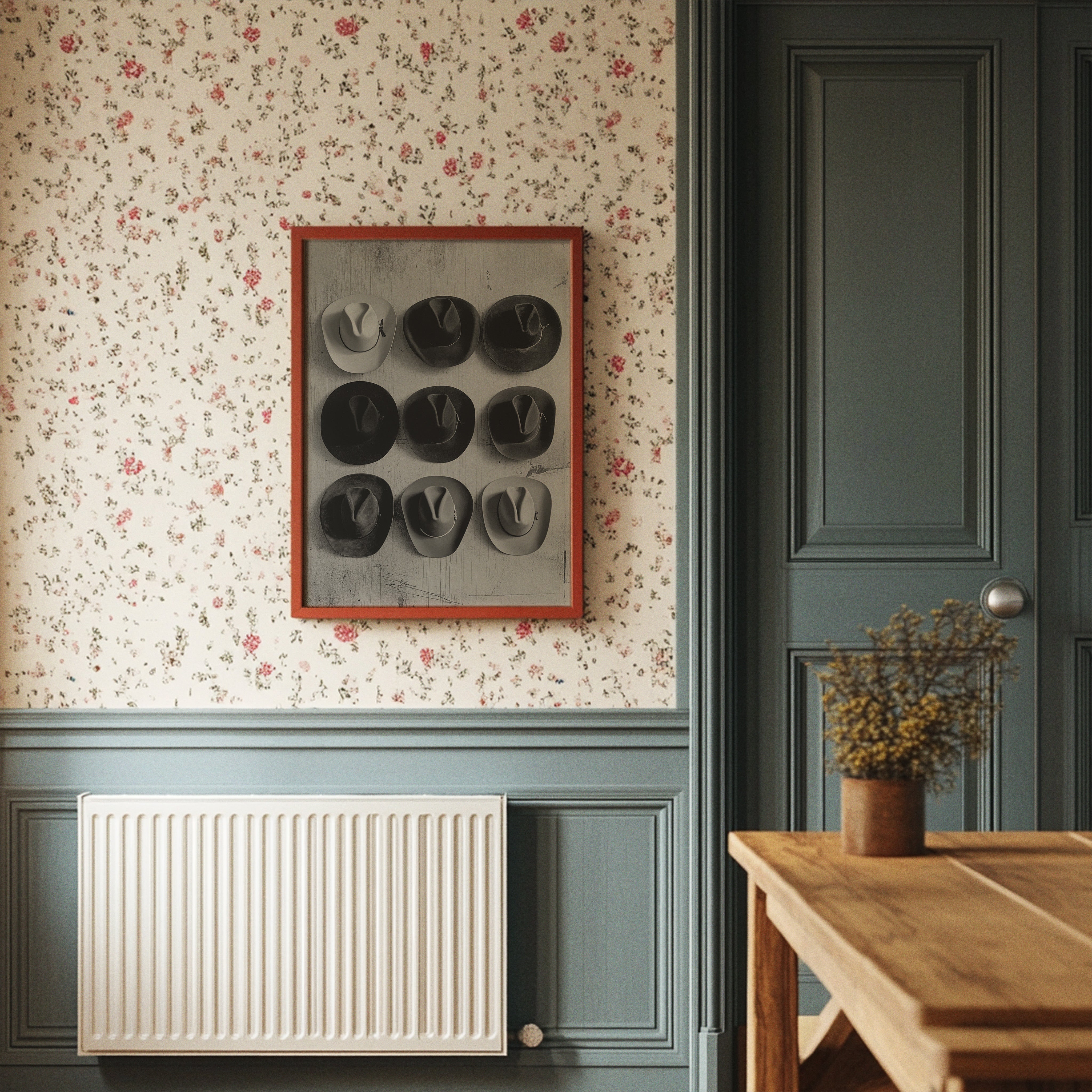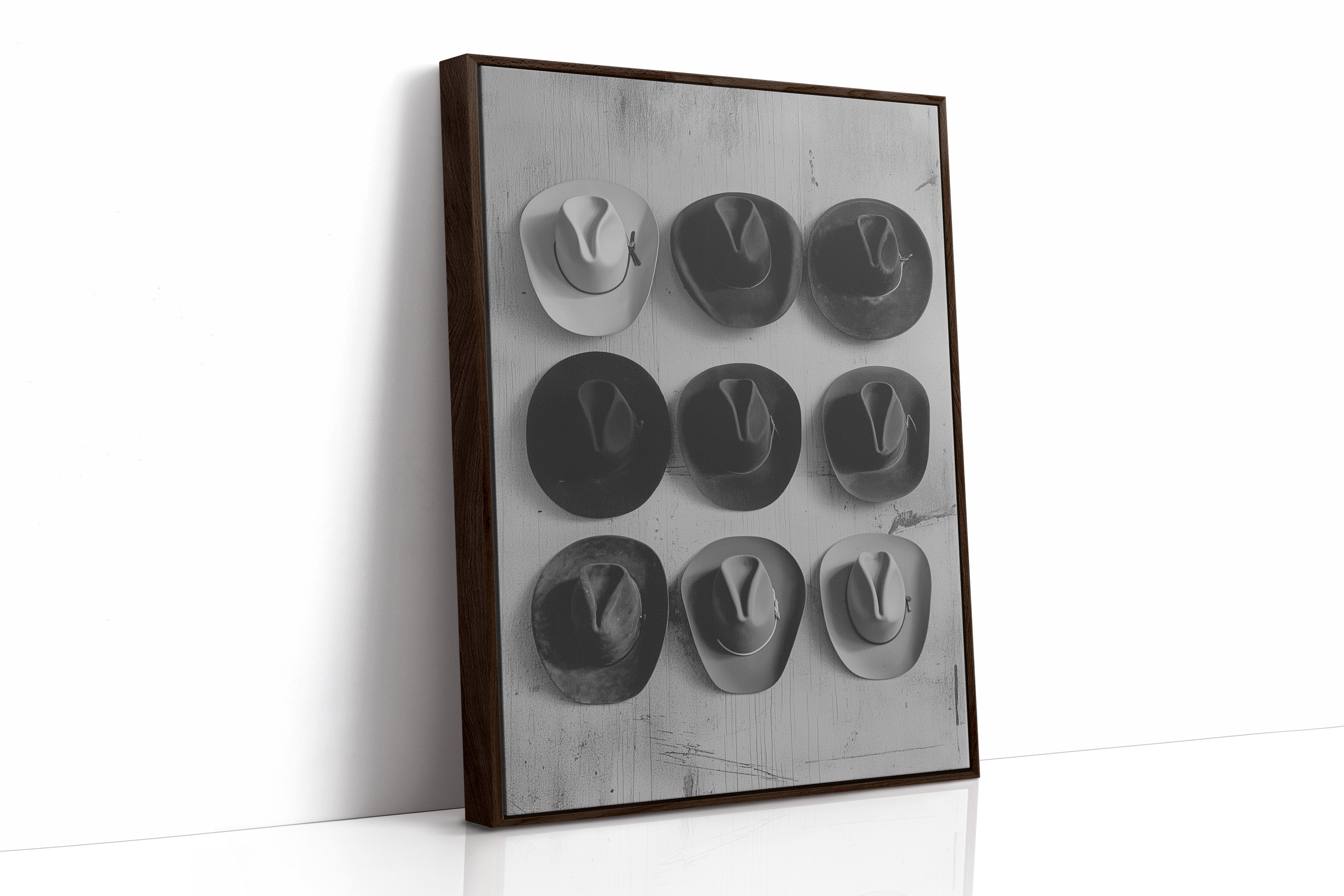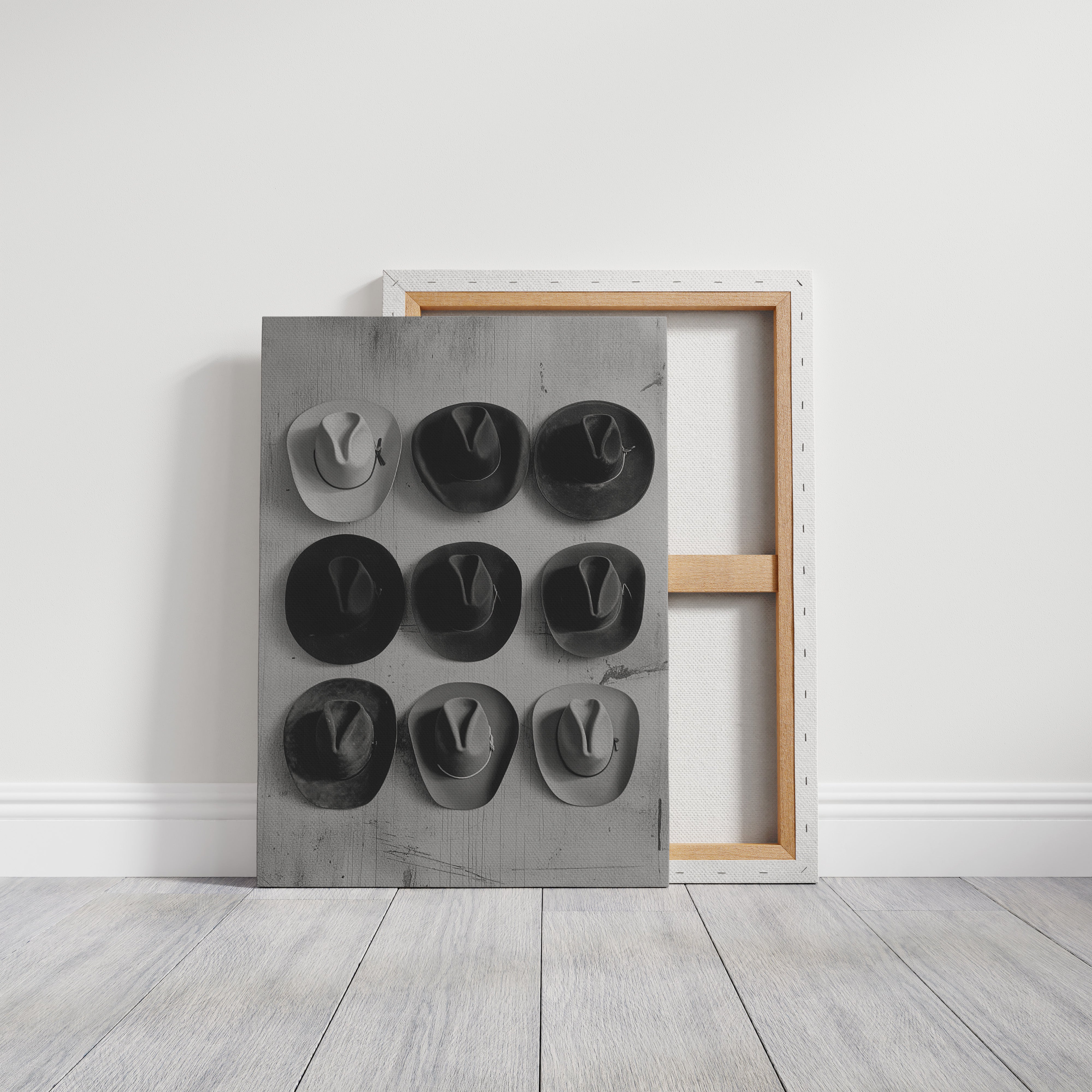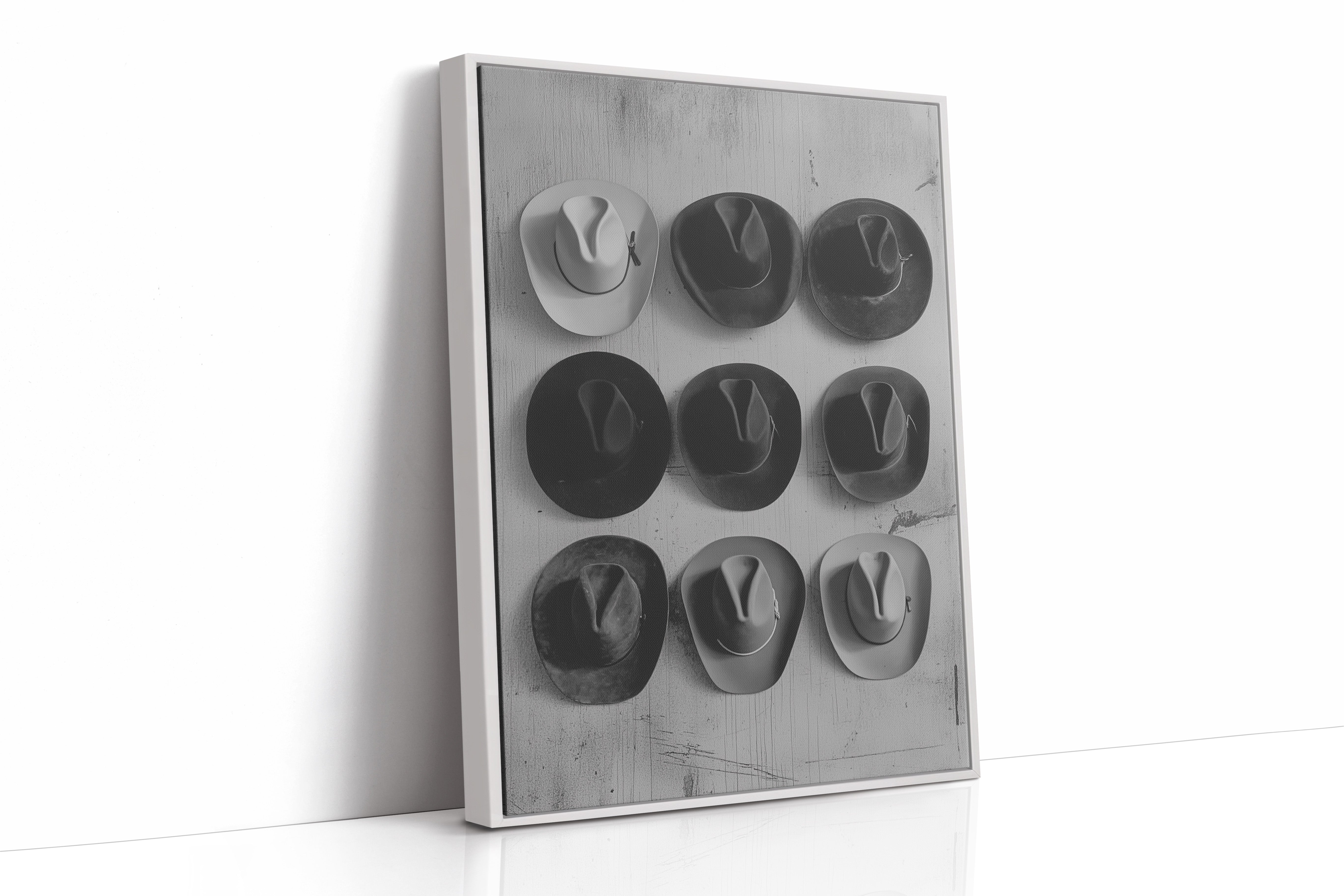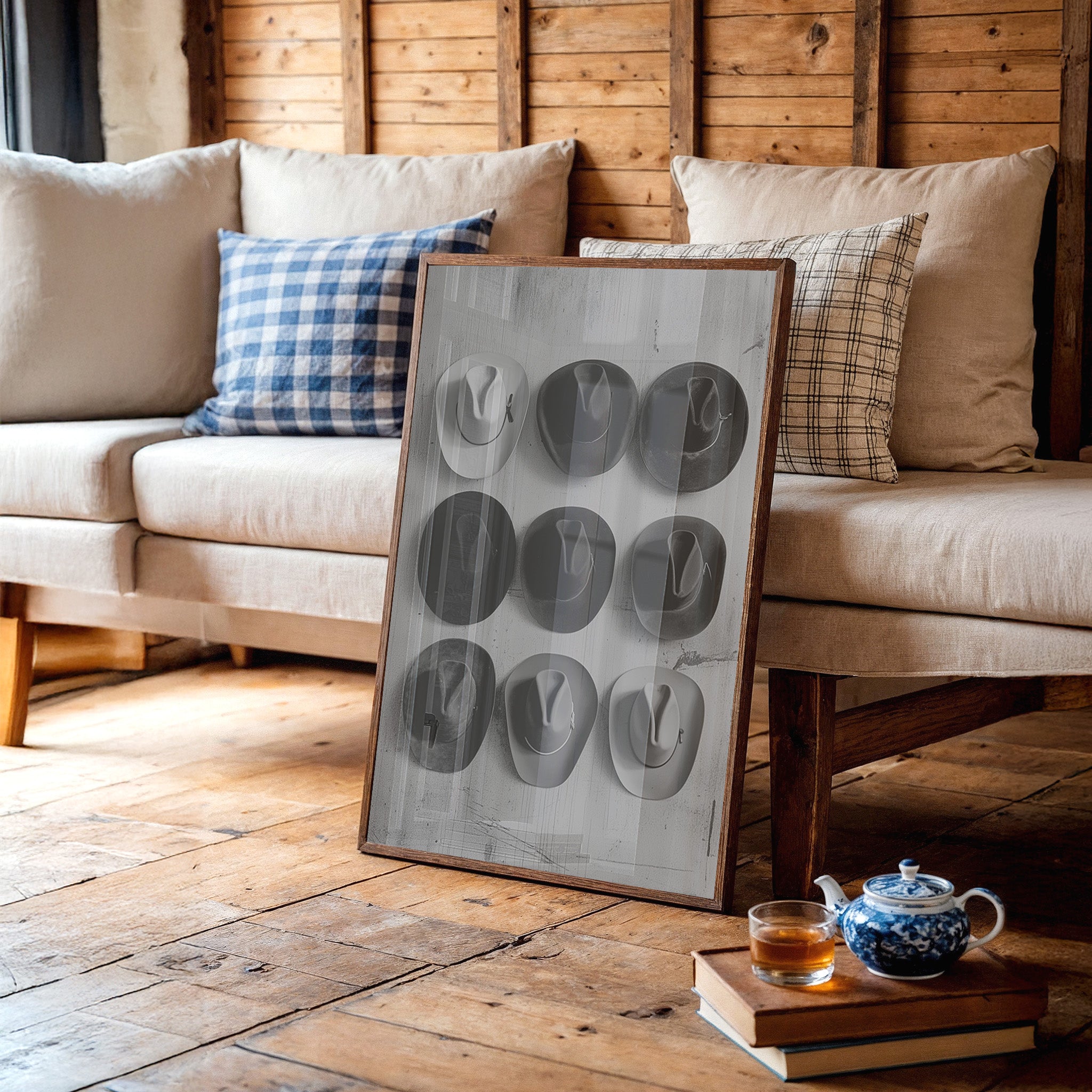 A weathered wooden backdrop sets the stage for a modern western sanctuary. Black and white cowboy hats line up in perfect formation within a crisp white frame, telling stories of dusty trails and wild frontiers. The rich leather sofa, tall cactus sentinel, and glowing lantern lights create a harmonious blend of rustic charm and contemporary comfort. This striking scene would elevate a modern ranch house, adding character to a living room or study where western heritage meets sophisticated design.