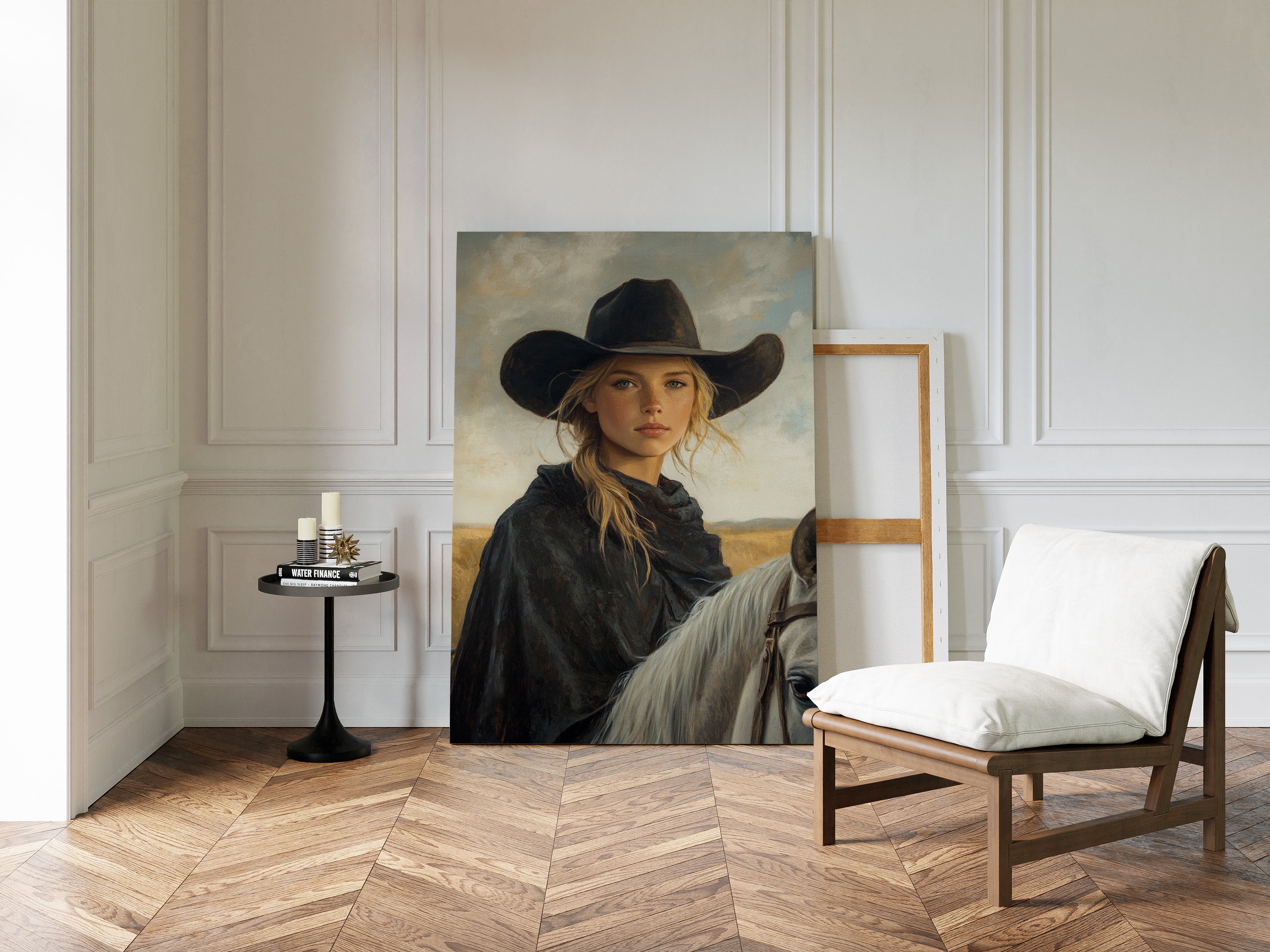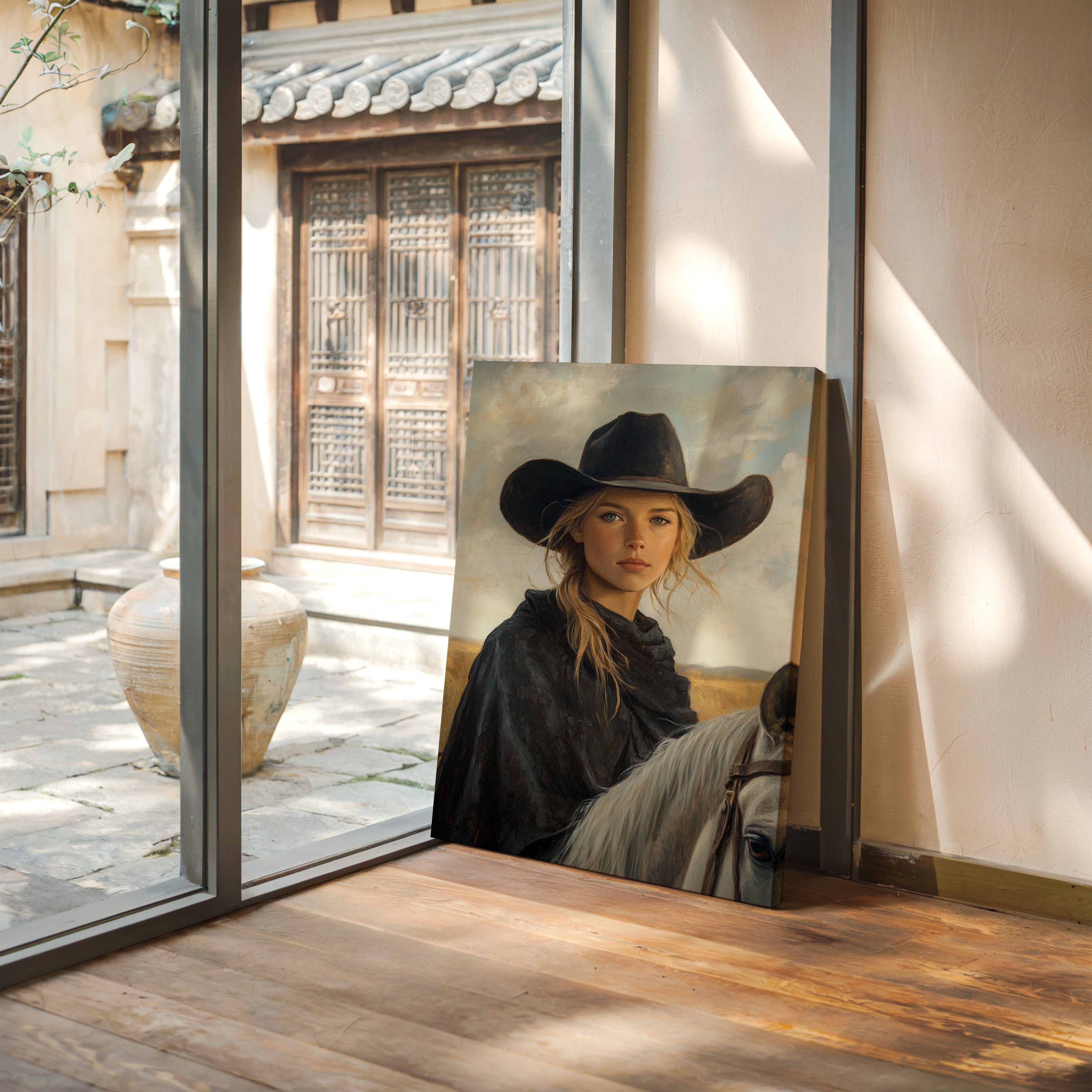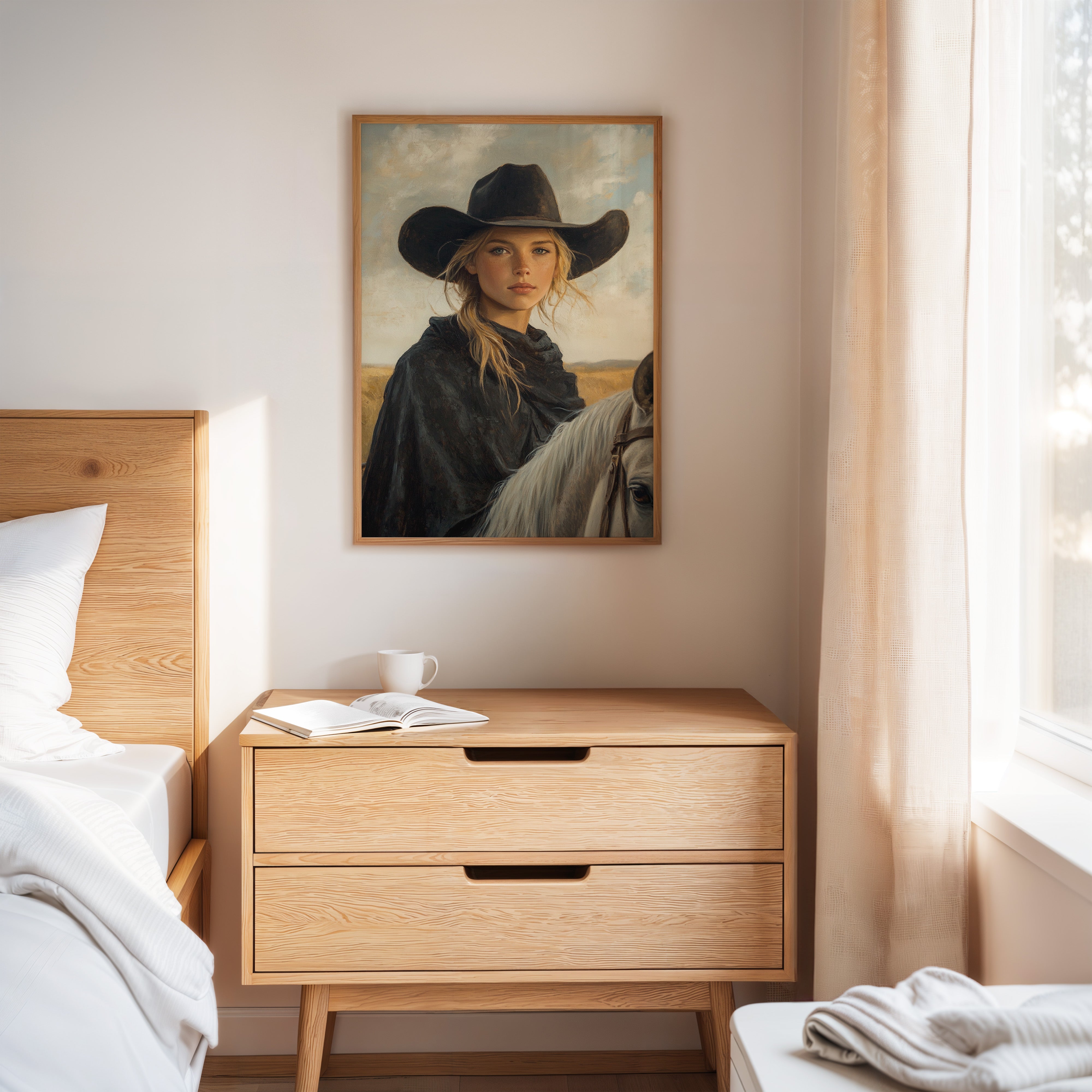 Strong, serene, and unshaken—this western portrait captures a rider beneath big skies, her steely gaze as striking as the stallion beside her. Timeless and tender, like the open plains.