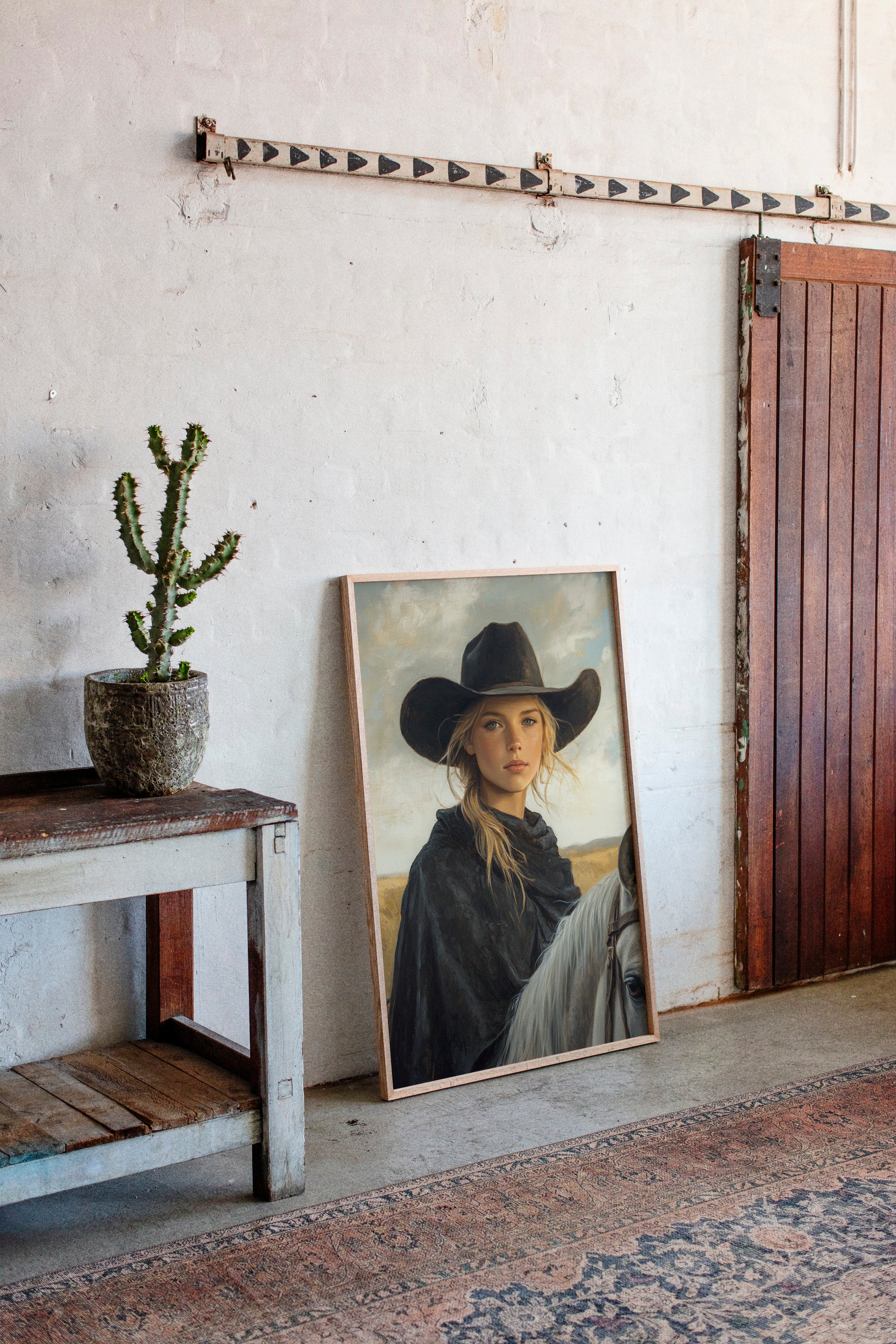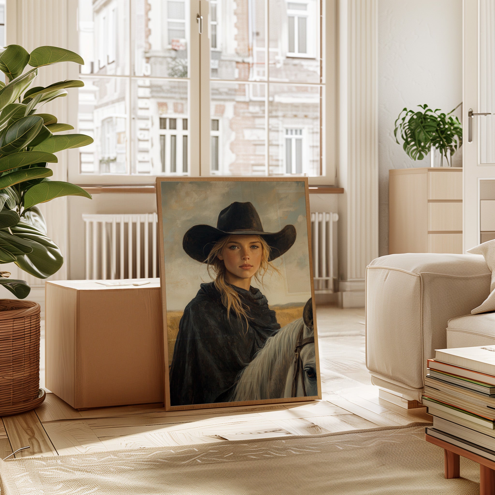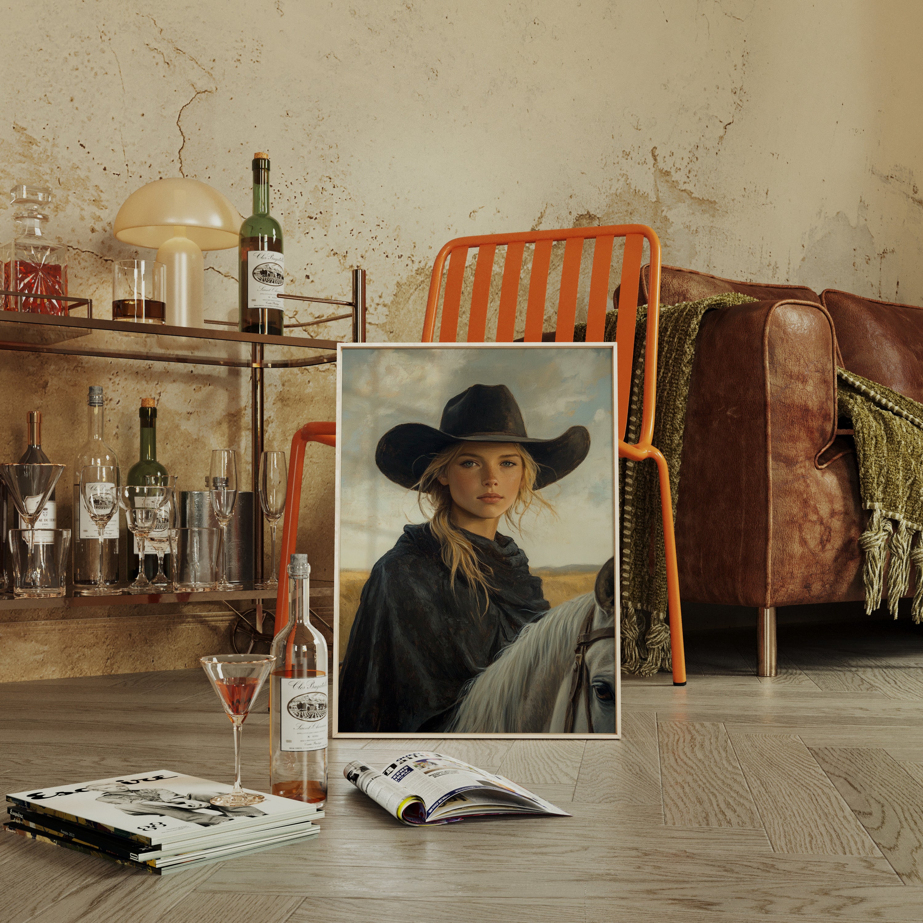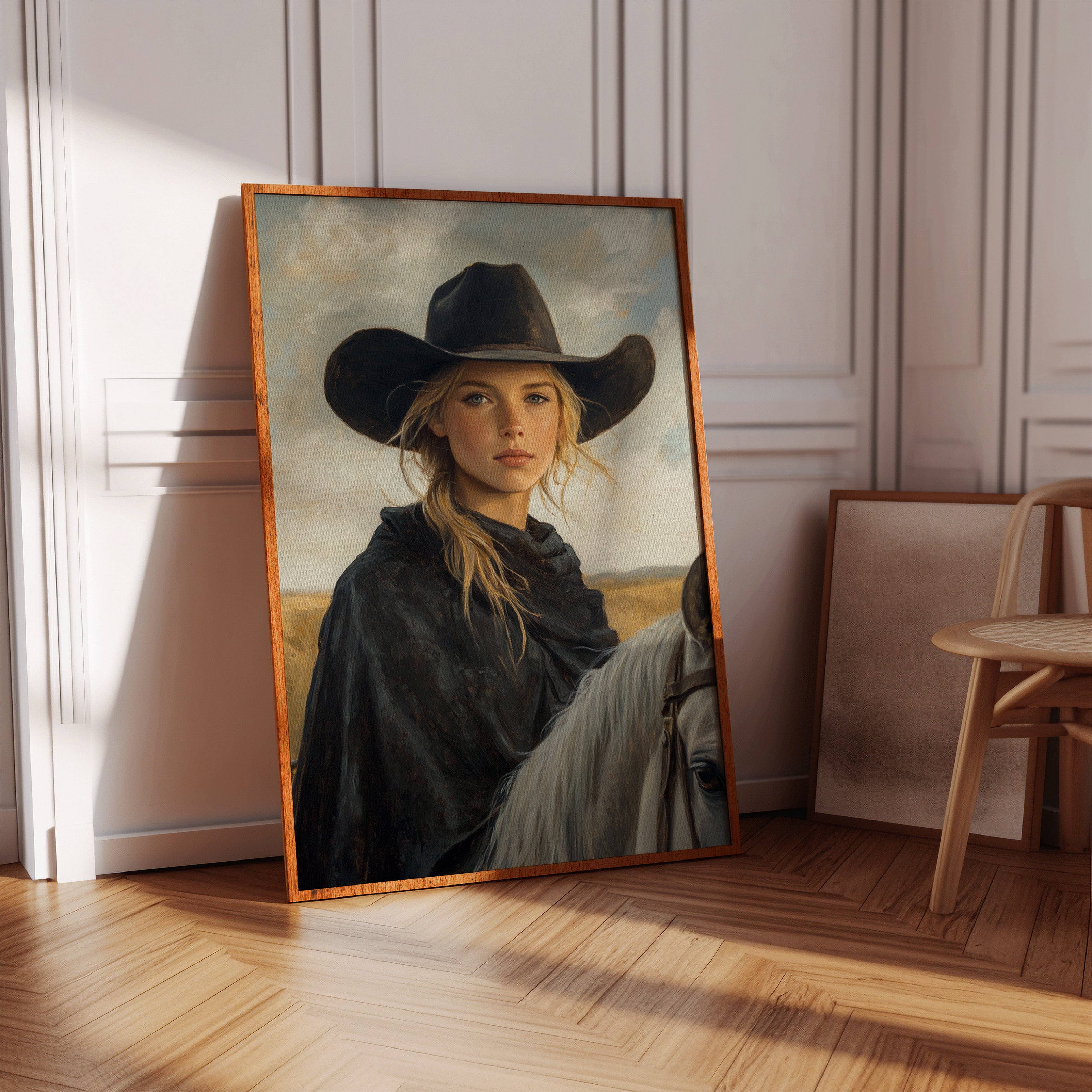 Strong, serene, and unshaken—this western portrait captures a rider beneath big skies, her steely gaze as striking as the stallion beside her. Timeless and tender, like the open plains.