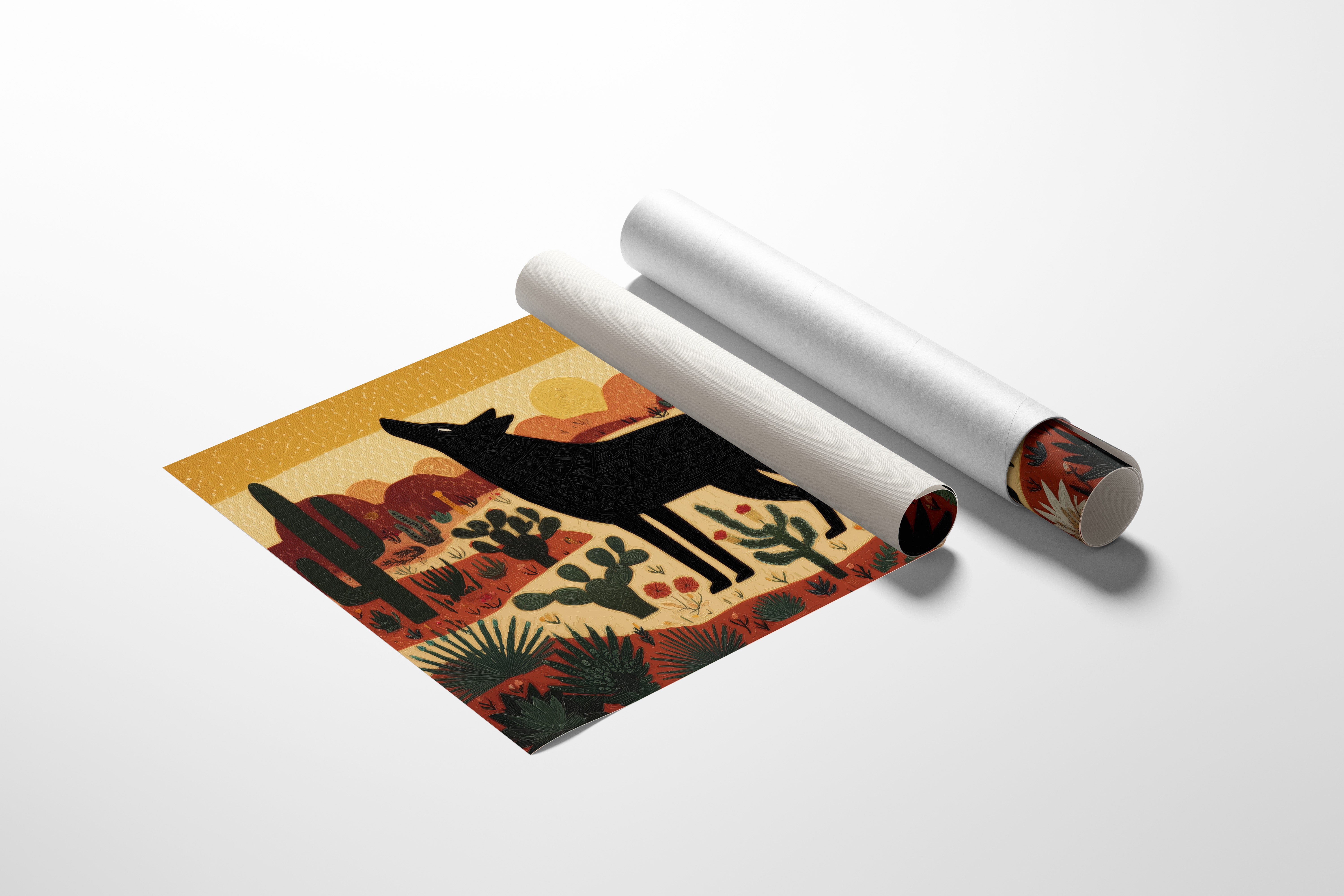A lone coyote's silhouette stands proud against a blazing desert sunset, its head lifted in an eternal song to the sky. Rich terracotta mesas and golden horizons frame this desert sentinel, while saguaros and prickly pear cacti dot the landscape in a textured tapestry of desert life. Red wildflowers punctuate the sandy earth, creating a harmonious dance between the stark black figure and the warm, earthy palette of the Southwestern landscape. This striking piece brings bold contemporary Southwest style to modern interiors, making a dramatic statement in living rooms or offices where its storytelling power can be fully appreciated.