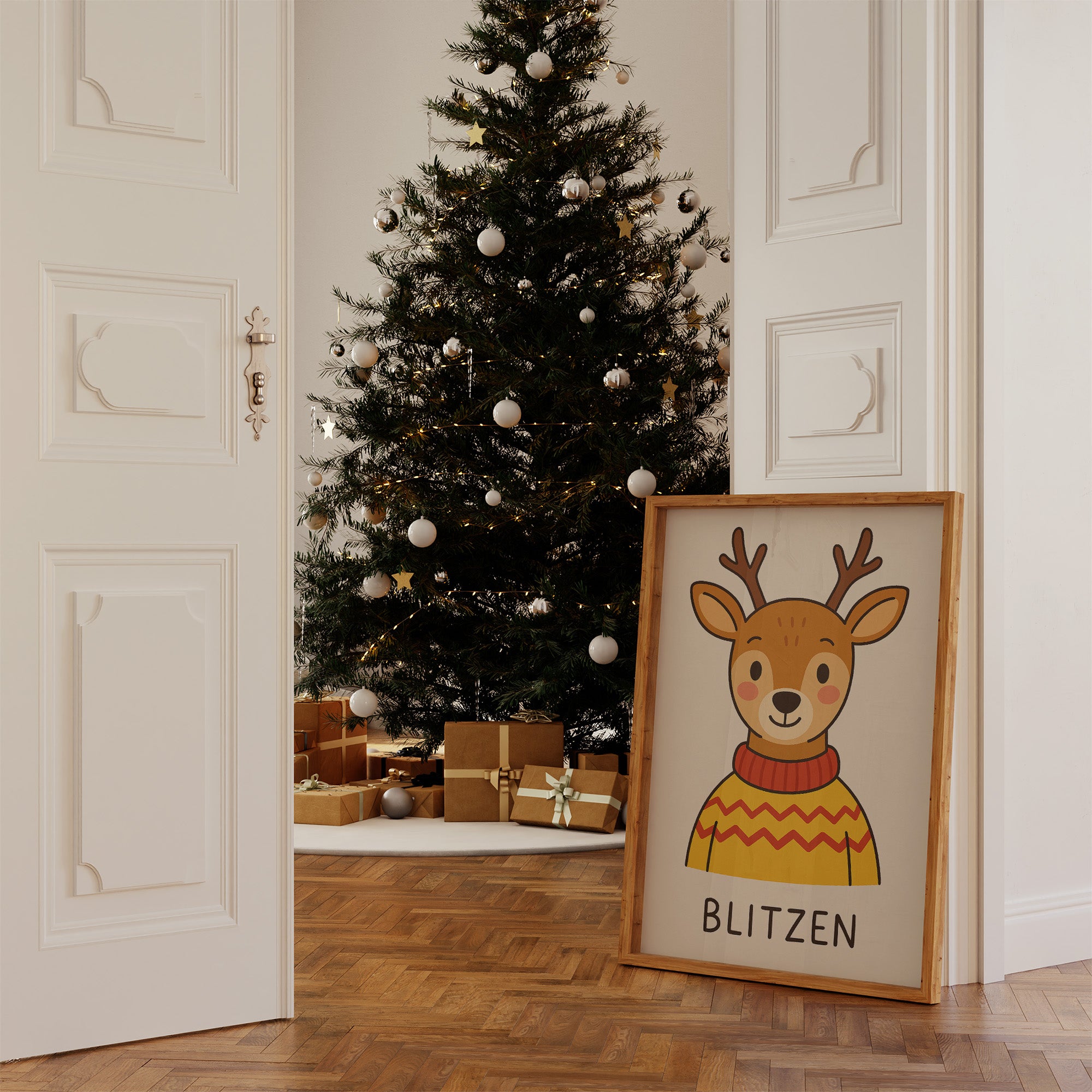 A smiling deer with rosy cheeks peeks out from a cheerful yellow sweater, radiating warmth against the soft cream background. The character's playful expression and bright red collar create a feeling of nostalgic comfort, while the zigzag pattern adds a touch of festive charm to this whimsical illustration. This delightful companion would bring a touch of woodland cheer to a child's bedroom or playroom wall.