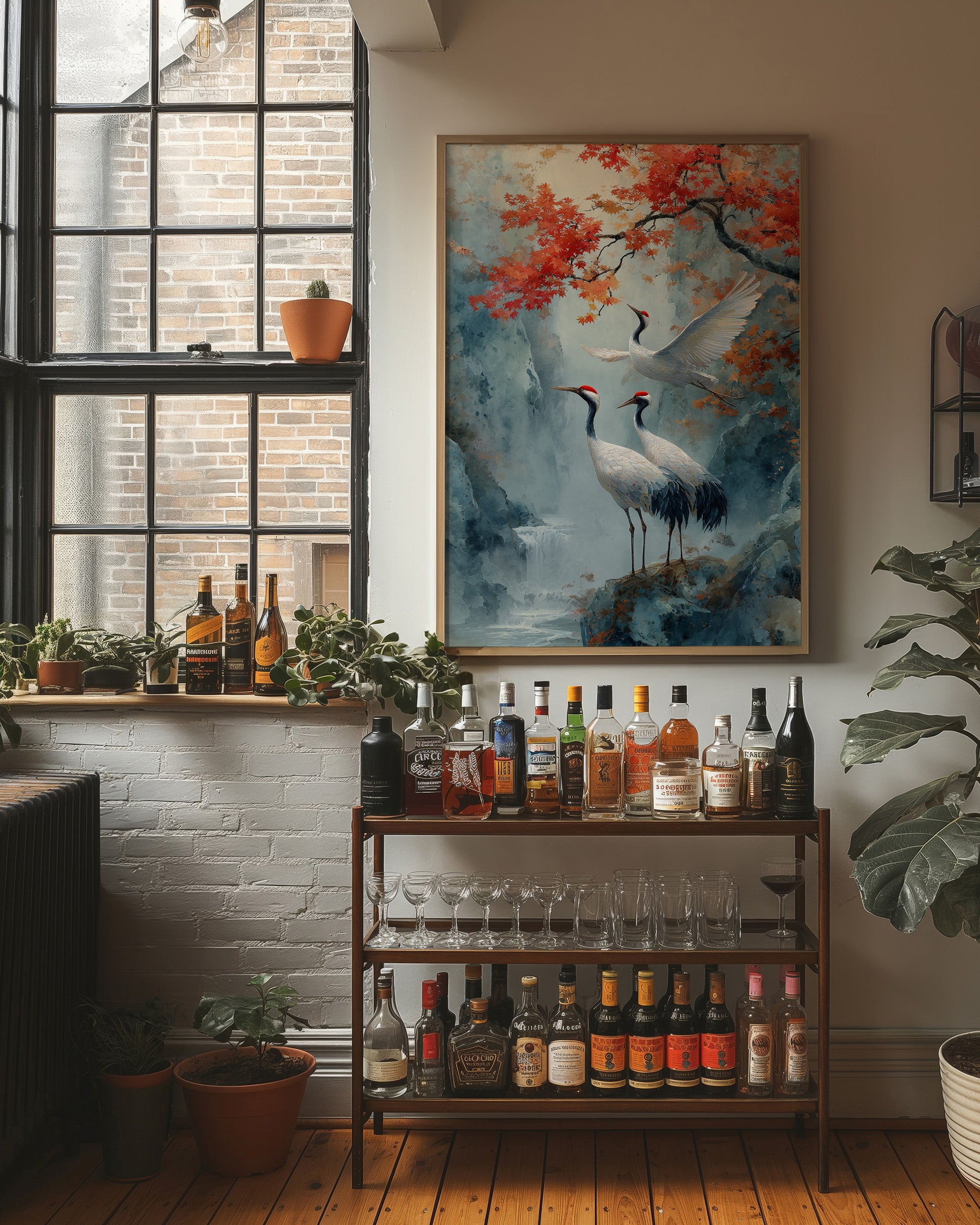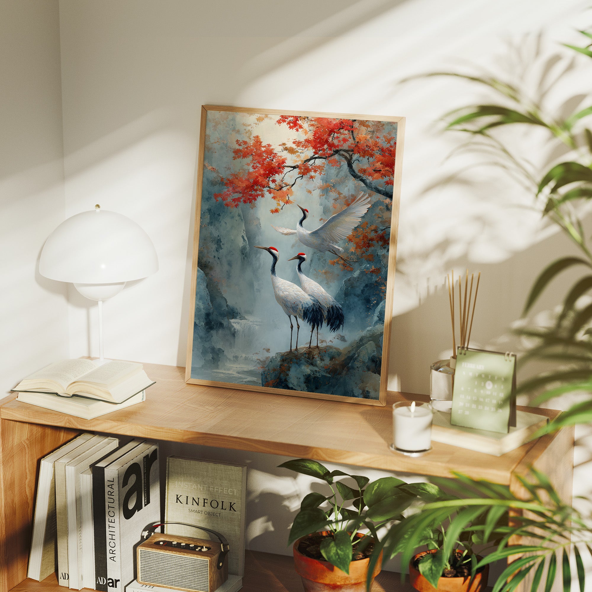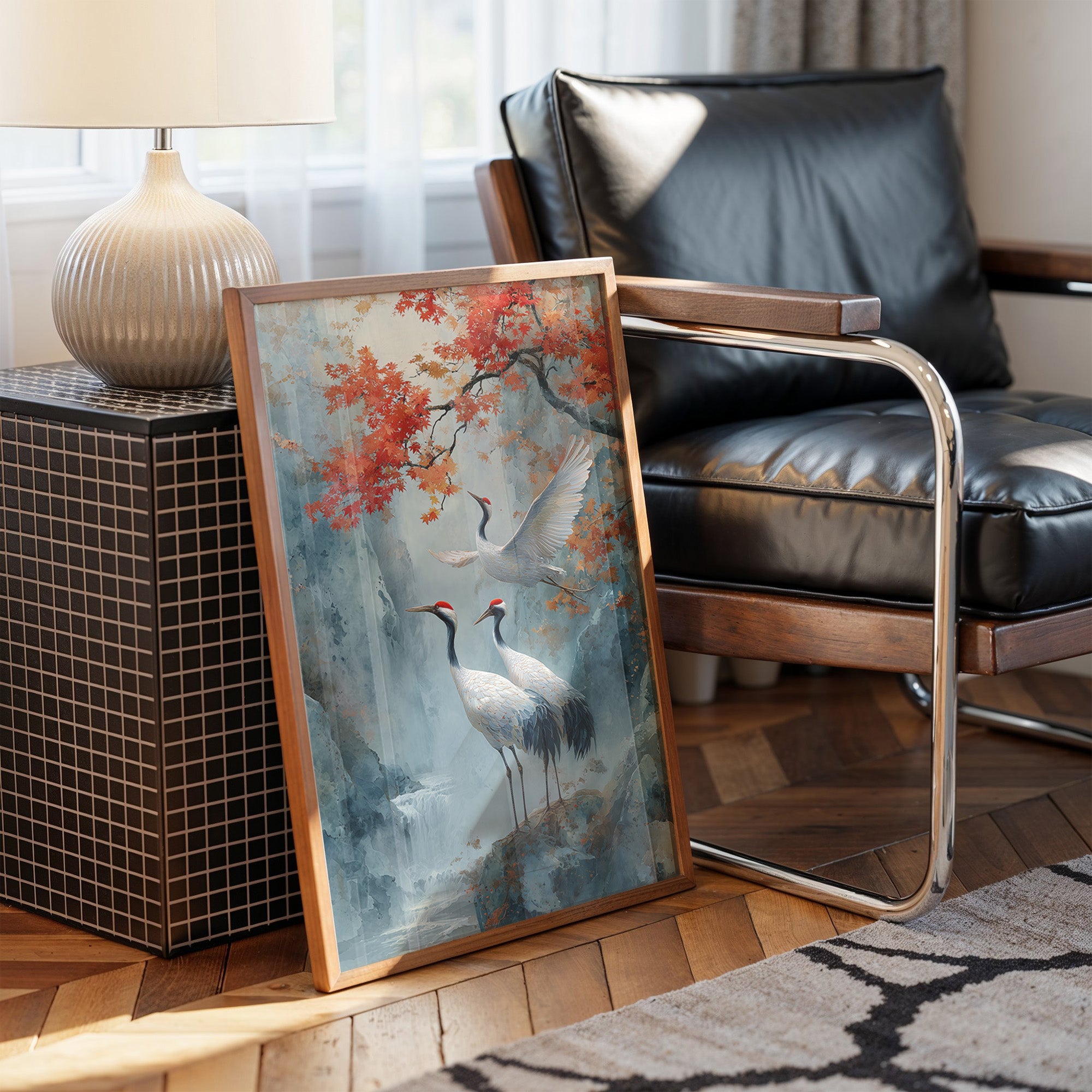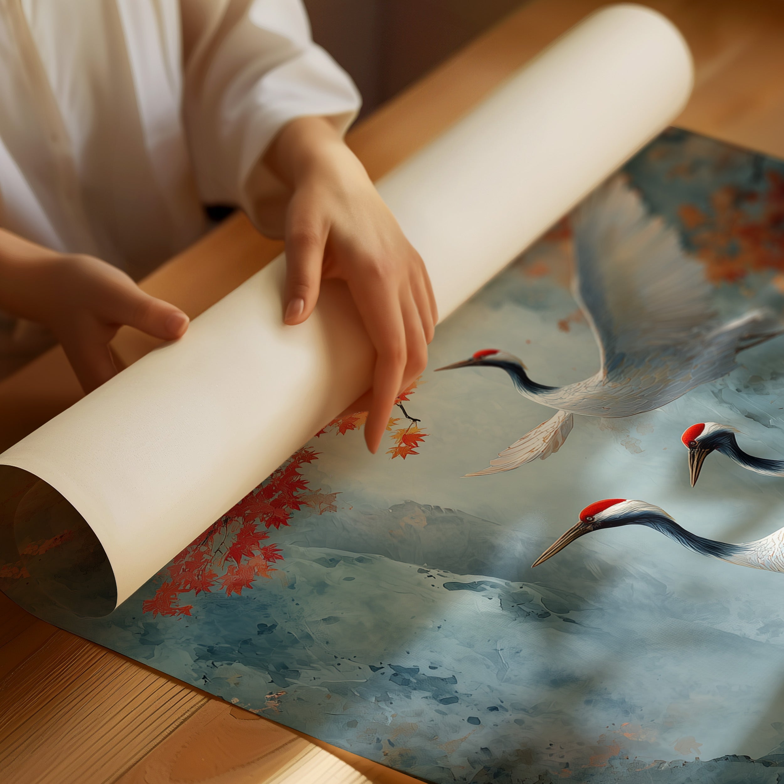Mist swirls around three elegant cranes as they gather beneath vibrant autumn maple branches. The interplay of coral-red leaves against the moody blue-grey atmosphere creates a dreamlike scene straight from an Asian folktale. Delicate brushstrokes capture the birds' graceful poses and the gentle flutter of feathers, while the mysterious background suggests a sacred moment at dawn. This serene piece brings tranquility to reading nooks, meditation spaces, or anywhere you seek a moment of peaceful contemplation.
