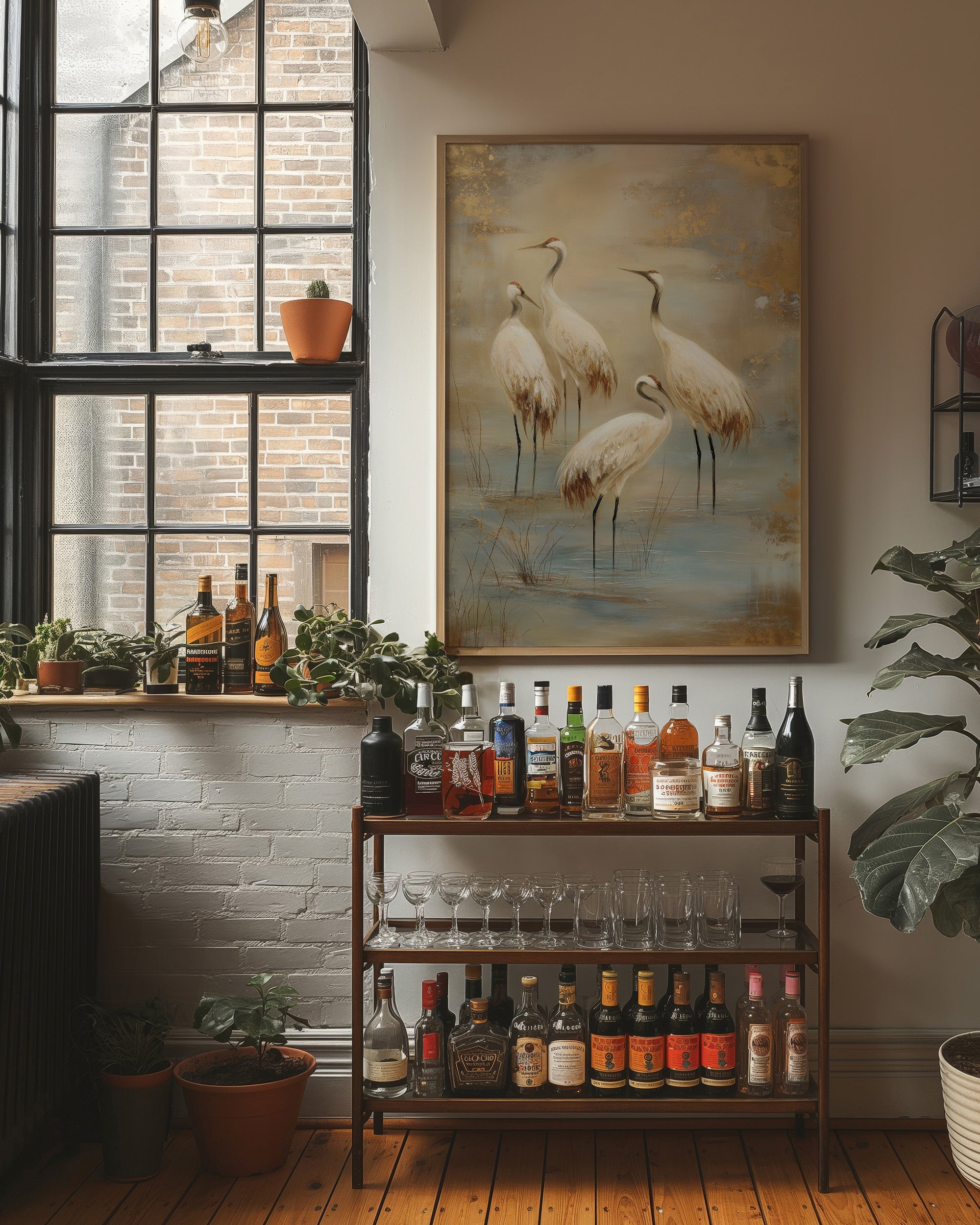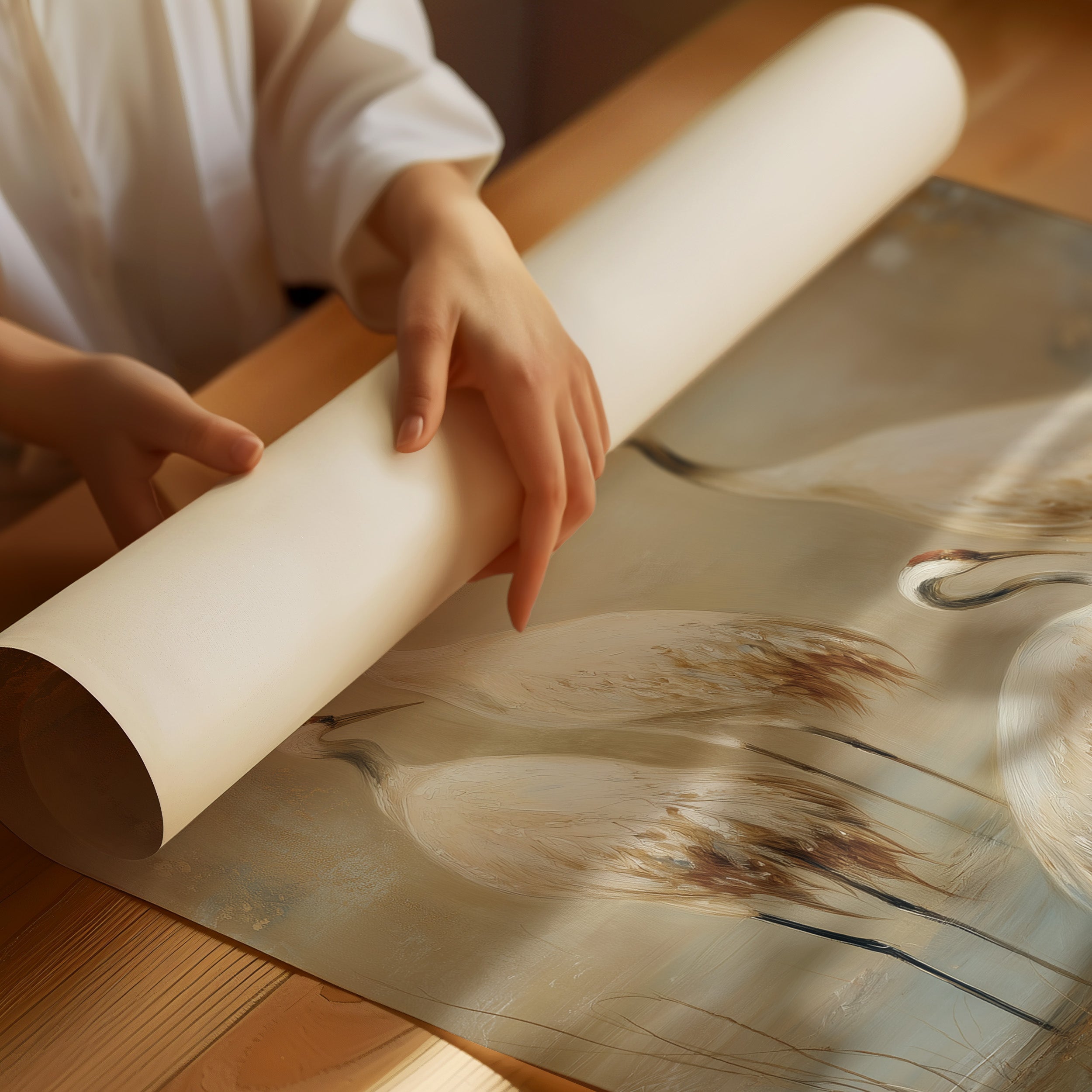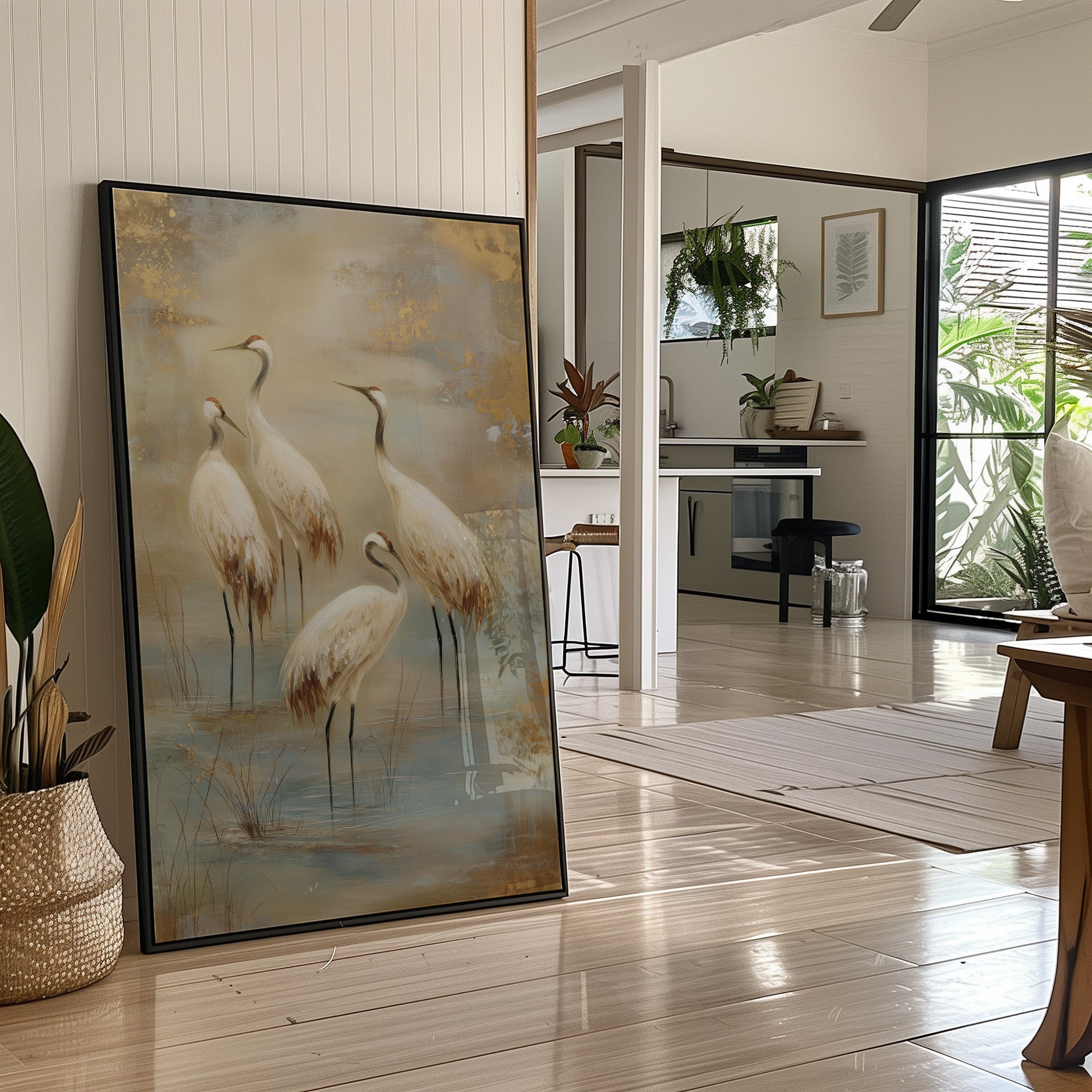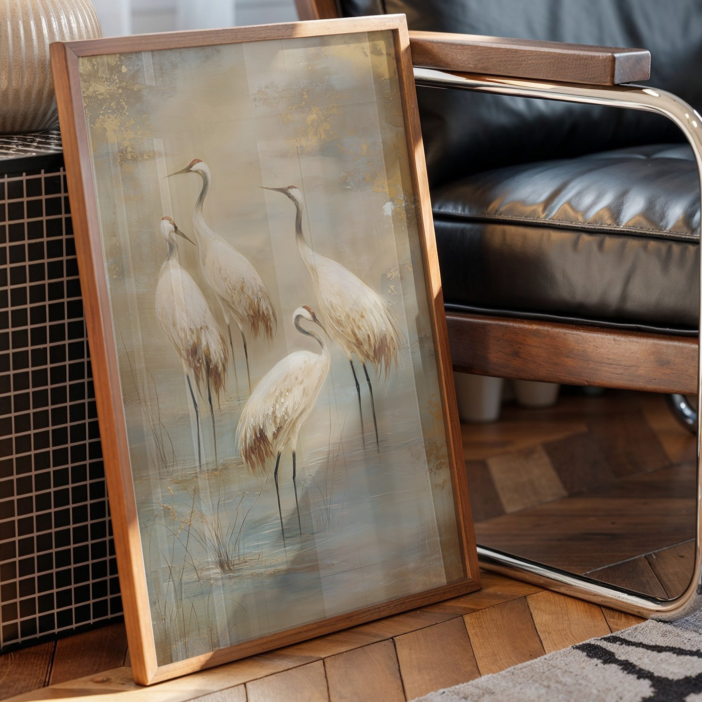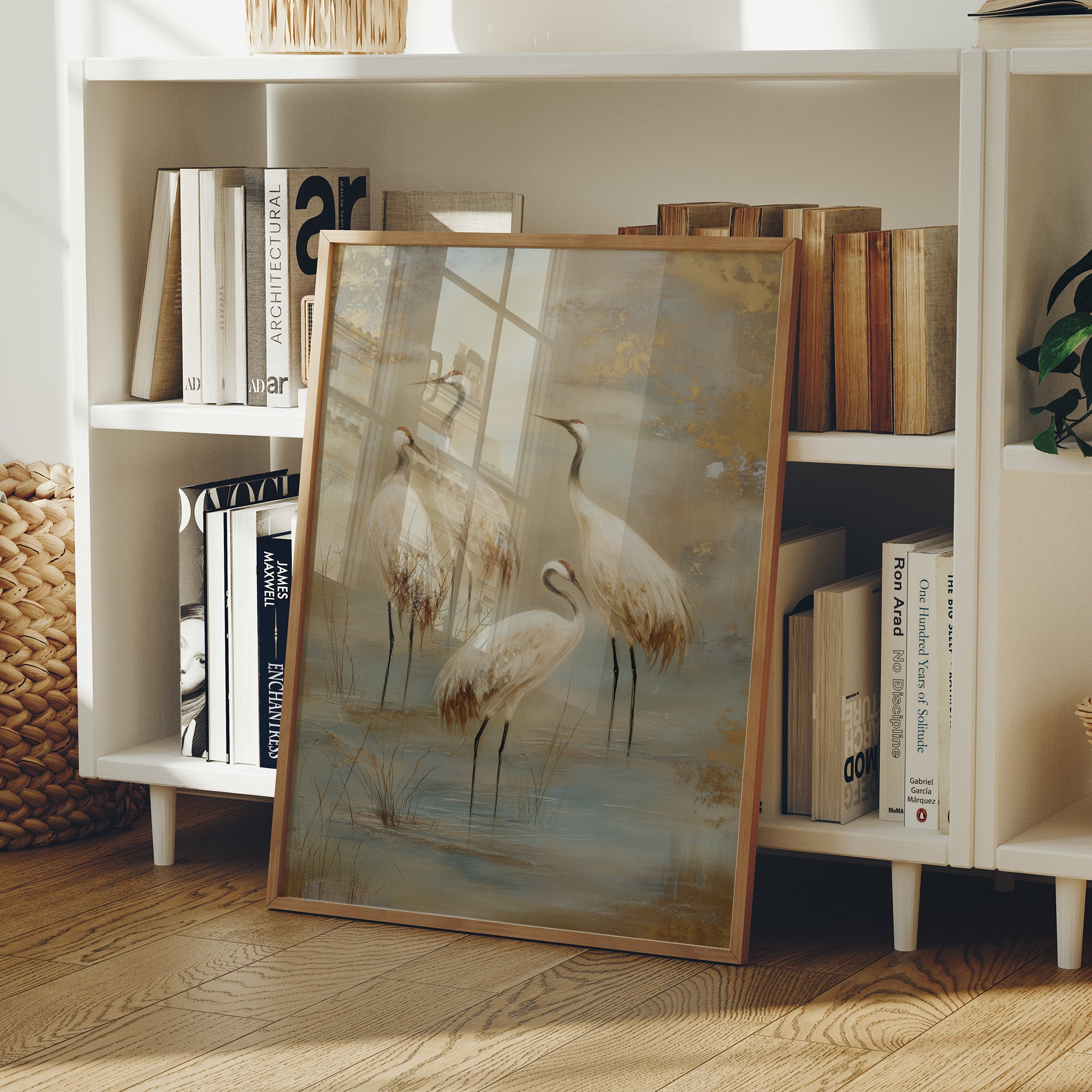 Elegant white cranes stand poised in shallow waters, their graceful forms catching the soft morning light. The scene unfolds in gentle earth tones, with misty blues and golden browns creating an atmosphere of tranquil contemplation. The birds' delicate features and long necks are rendered with careful attention, while the surrounding marsh grasses and reflective water suggest a peaceful wetland sanctuary. This serene piece brings natural elegance to any space, perfectly suited for a reading nook or meditation room where its calming presence can be fully appreciated.