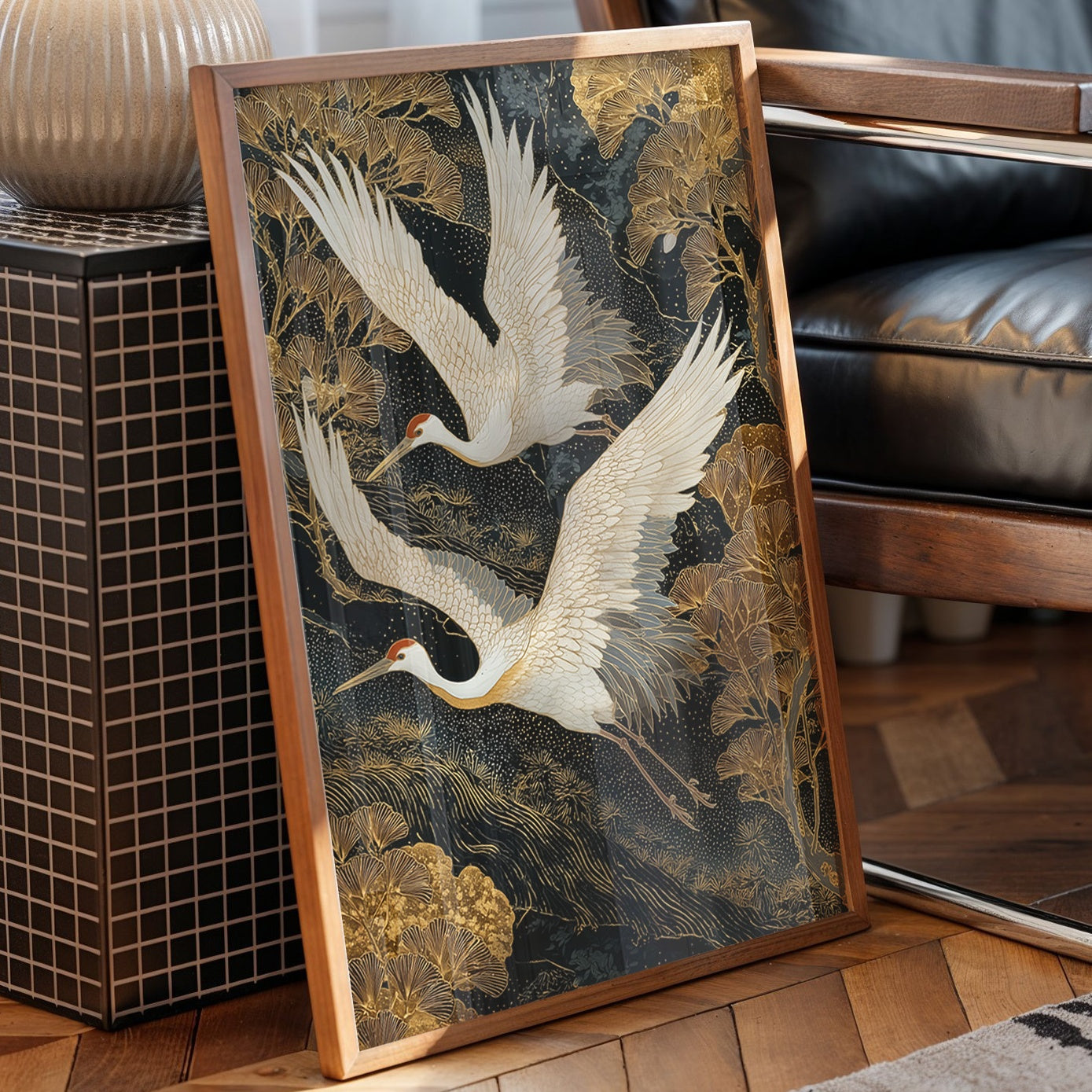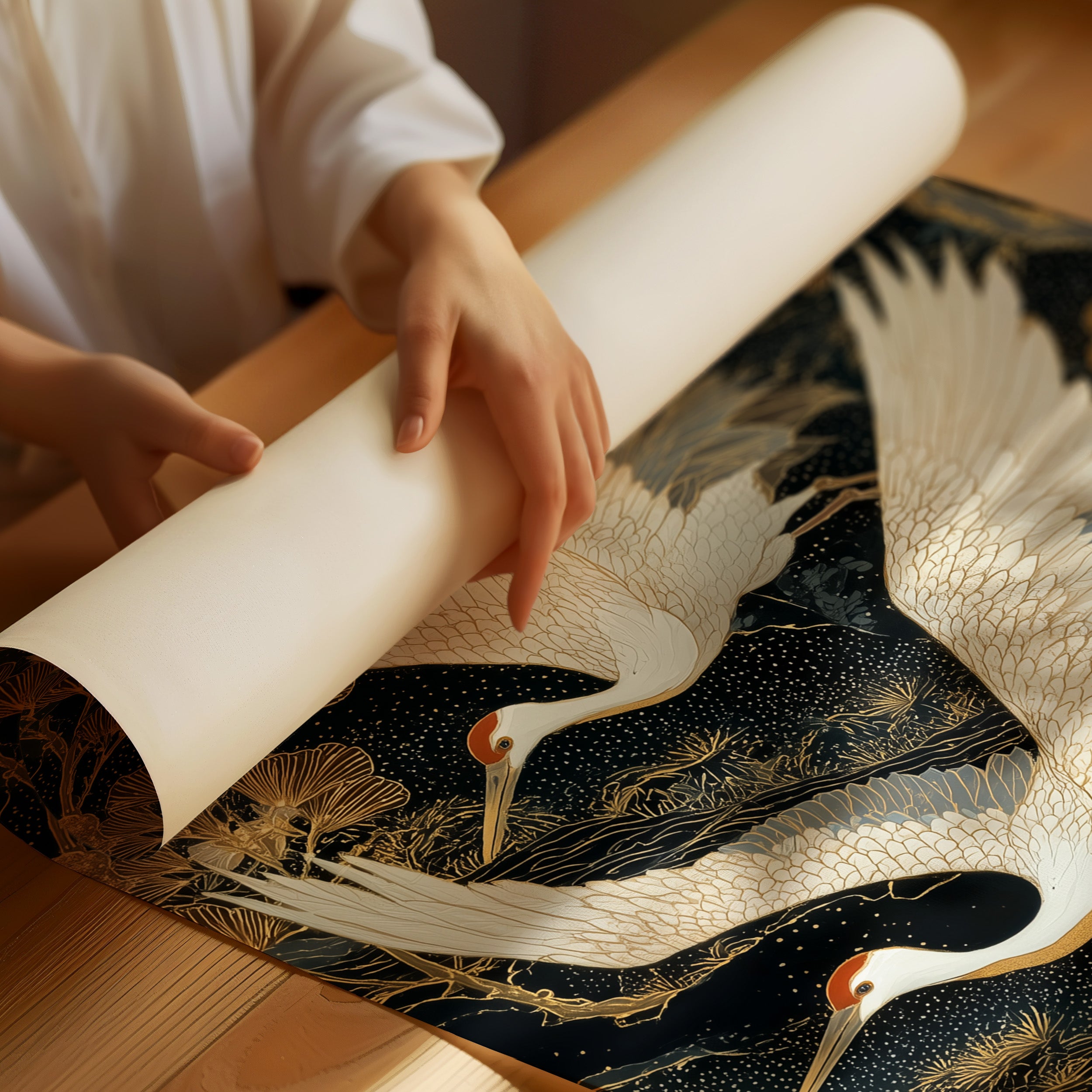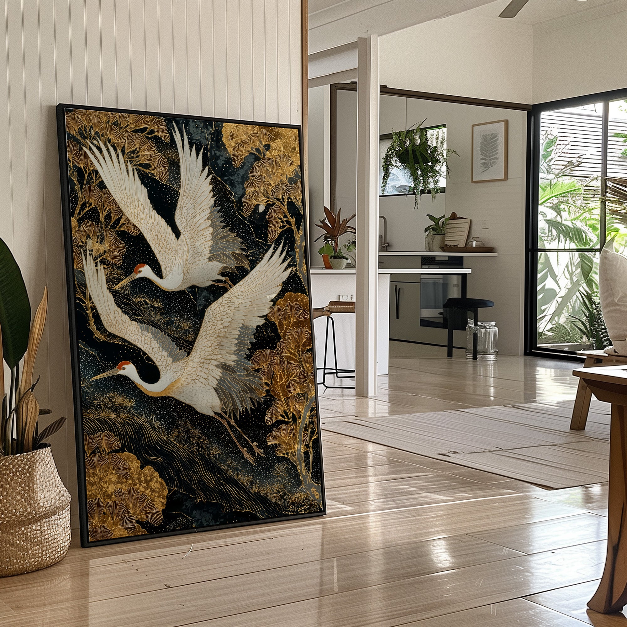 Against midnight silk, two elegant cranes take flight in a moment of perfect harmony. Their pristine white wings stretch across a canvas rich with golden ginkgo leaves, creating a stunning contrast between light and dark, movement and stillness. The intricate details of each feather and the metallic sheen of the foliage speak to both traditional Asian artistry and contemporary sophistication. This statement piece brings dramatic elegance to a modern living space, perfectly balancing organic forms with refined artistic execution.
