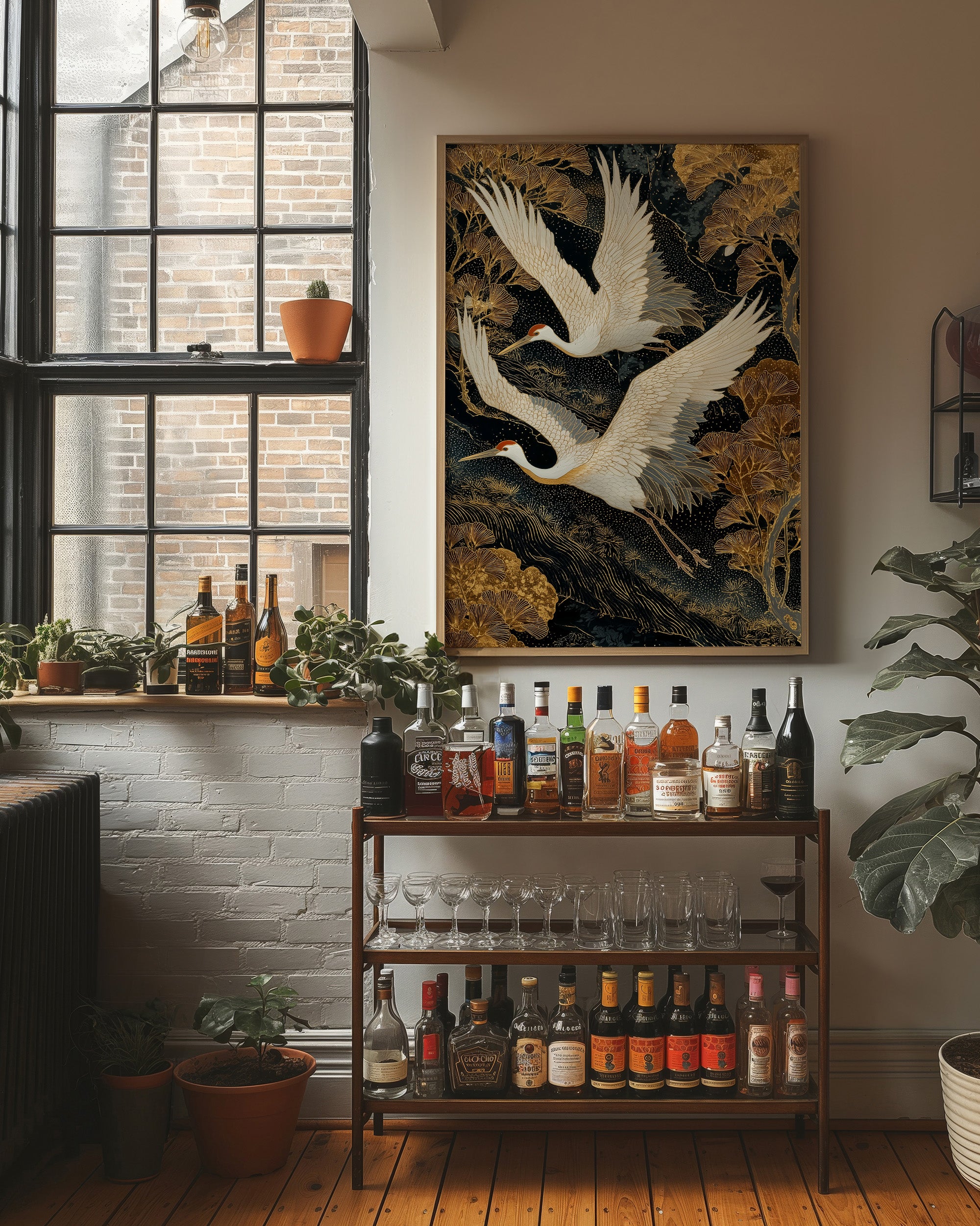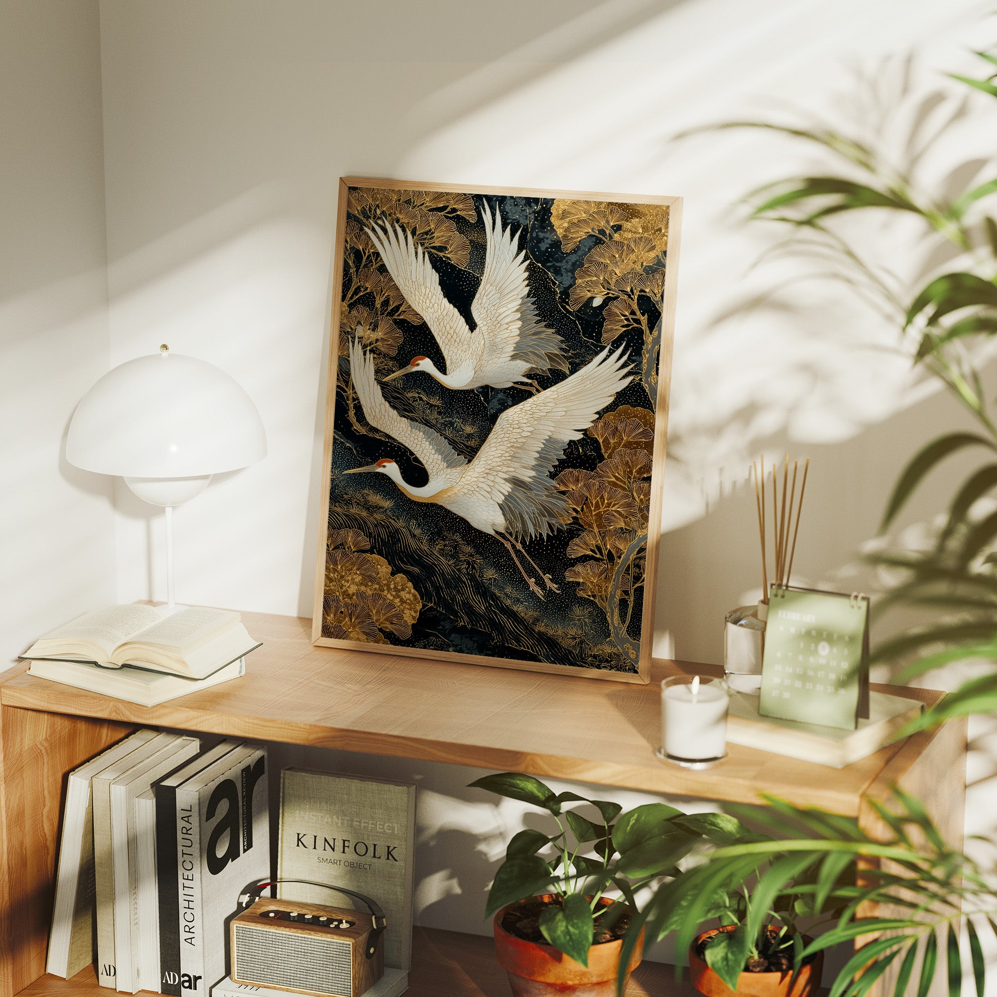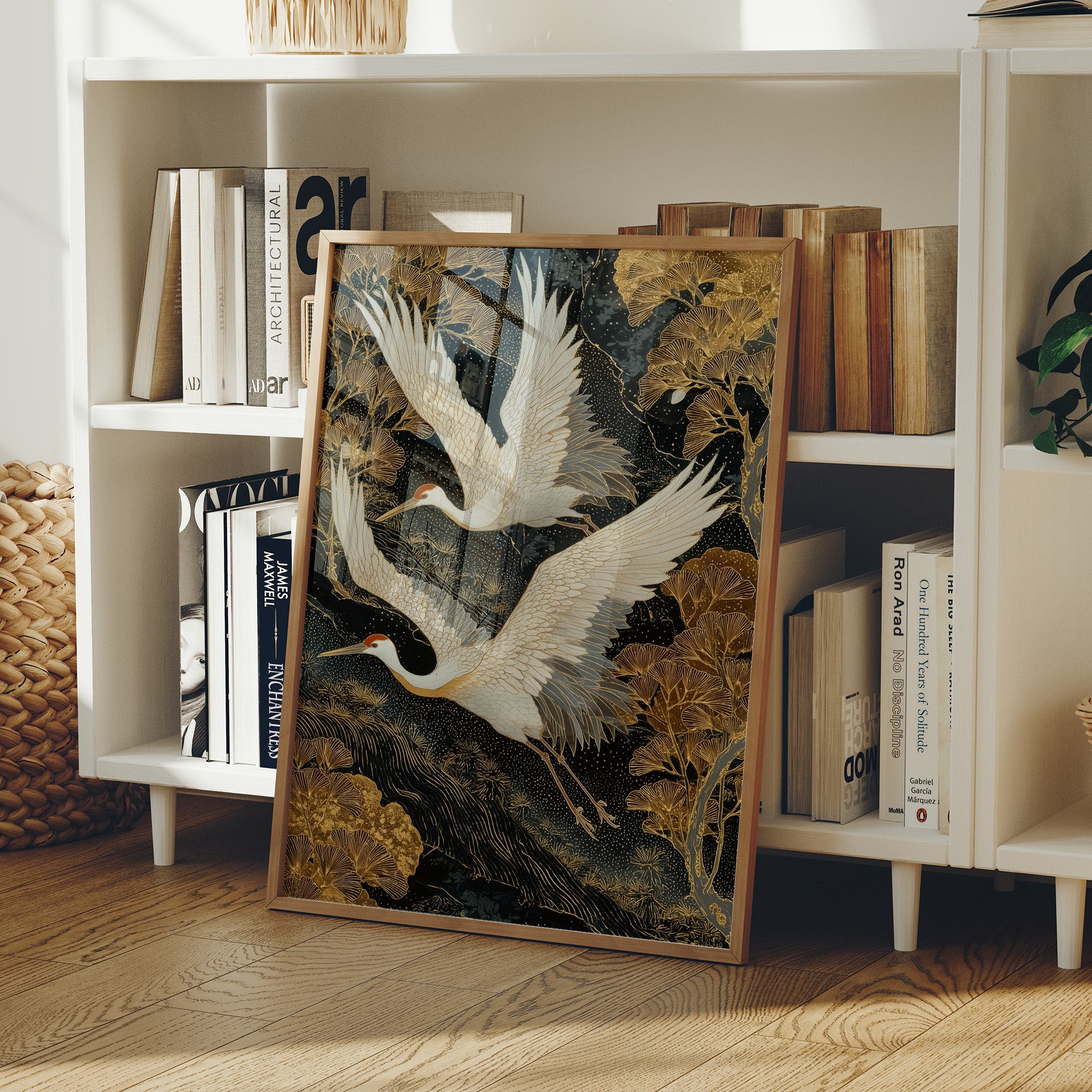 Against midnight silk, two elegant cranes take flight in a moment of perfect harmony. Their pristine white wings stretch across a canvas rich with golden ginkgo leaves, creating a stunning contrast between light and dark, movement and stillness. The intricate details of each feather and the metallic sheen of the foliage speak to both traditional Asian artistry and contemporary sophistication. This statement piece brings dramatic elegance to a modern living space, perfectly balancing organic forms with refined artistic execution.