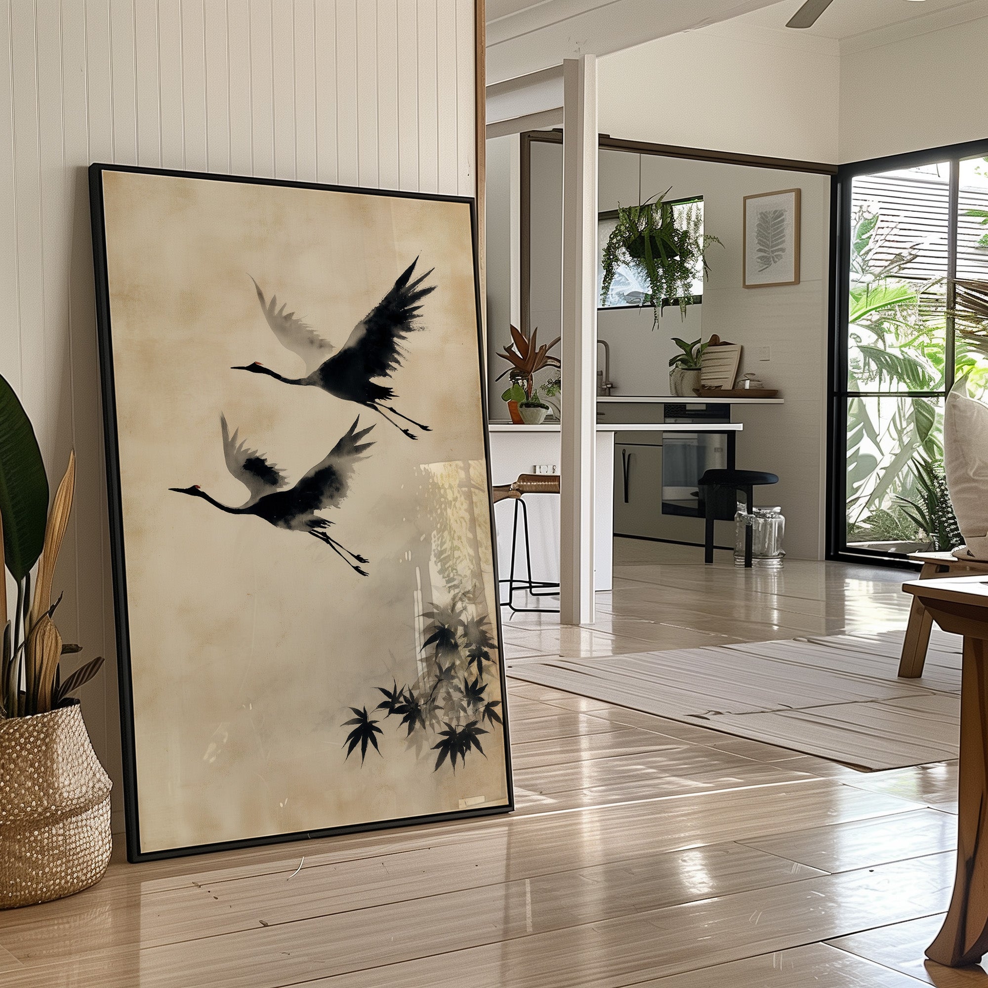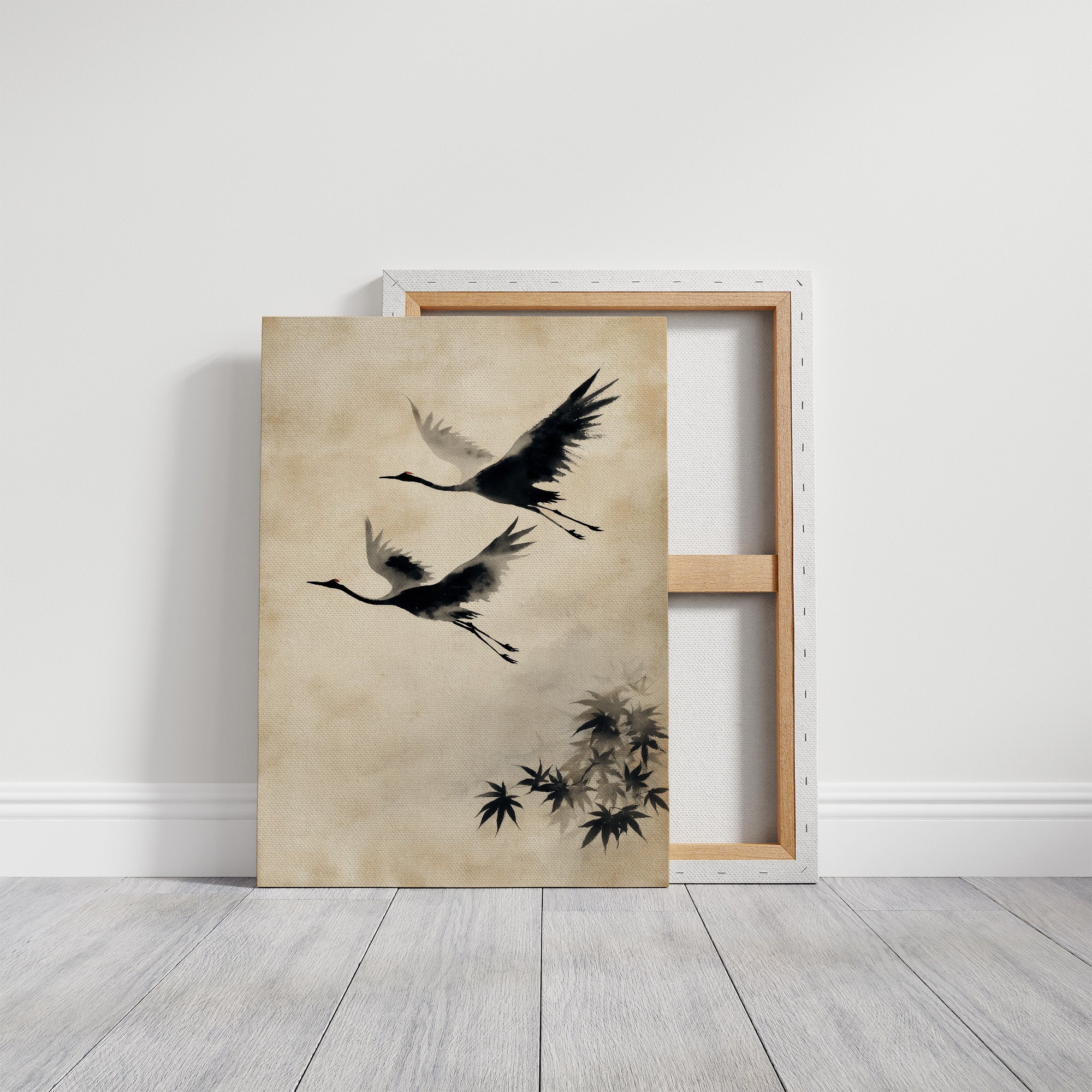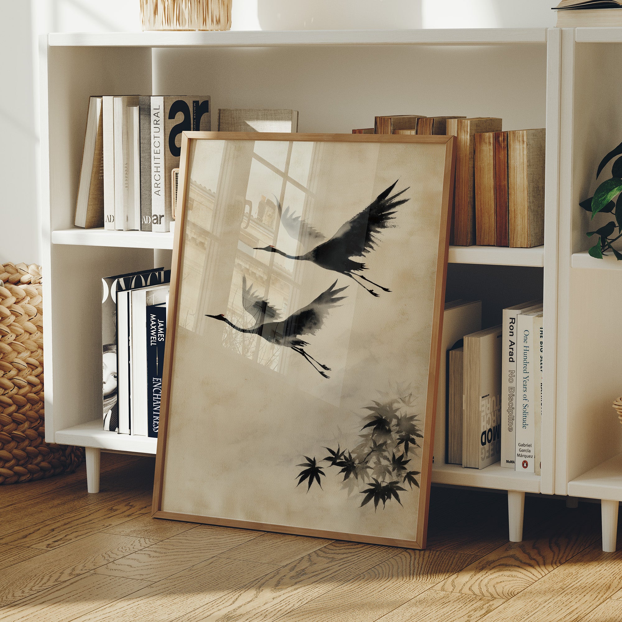 Ink-brushed wings stretch across aged parchment, capturing the graceful ascent of two cranes in perfect harmony. The minimalist strokes tell a story of partnership and freedom, while delicate maple leaves anchor the composition in Eastern artistic tradition. This contemporary interpretation of classical sumi-e style brings timeless serenity to modern spaces. Perfect for creating a contemplative atmosphere in a reading nook or bringing zen elegance to a minimal dining room.