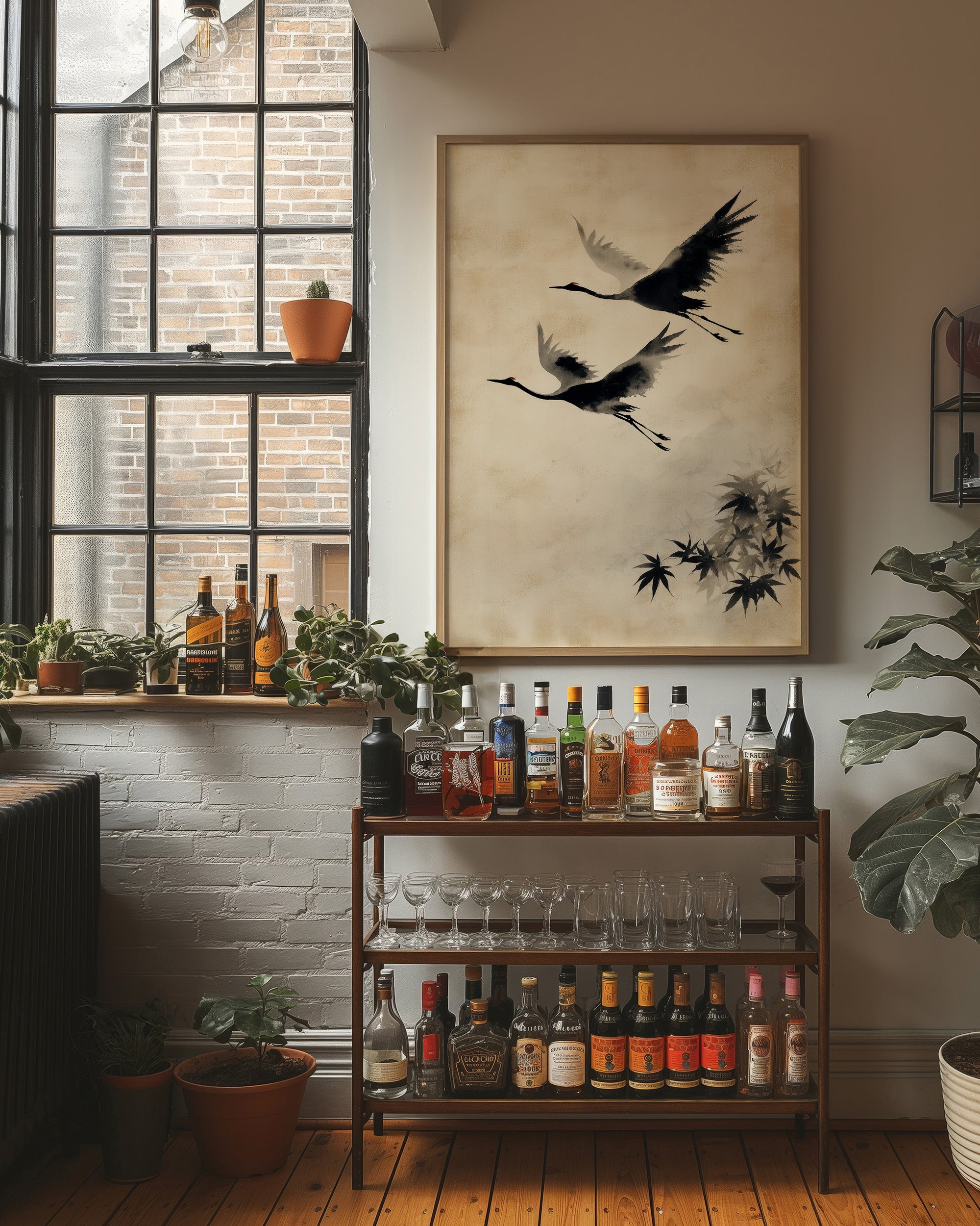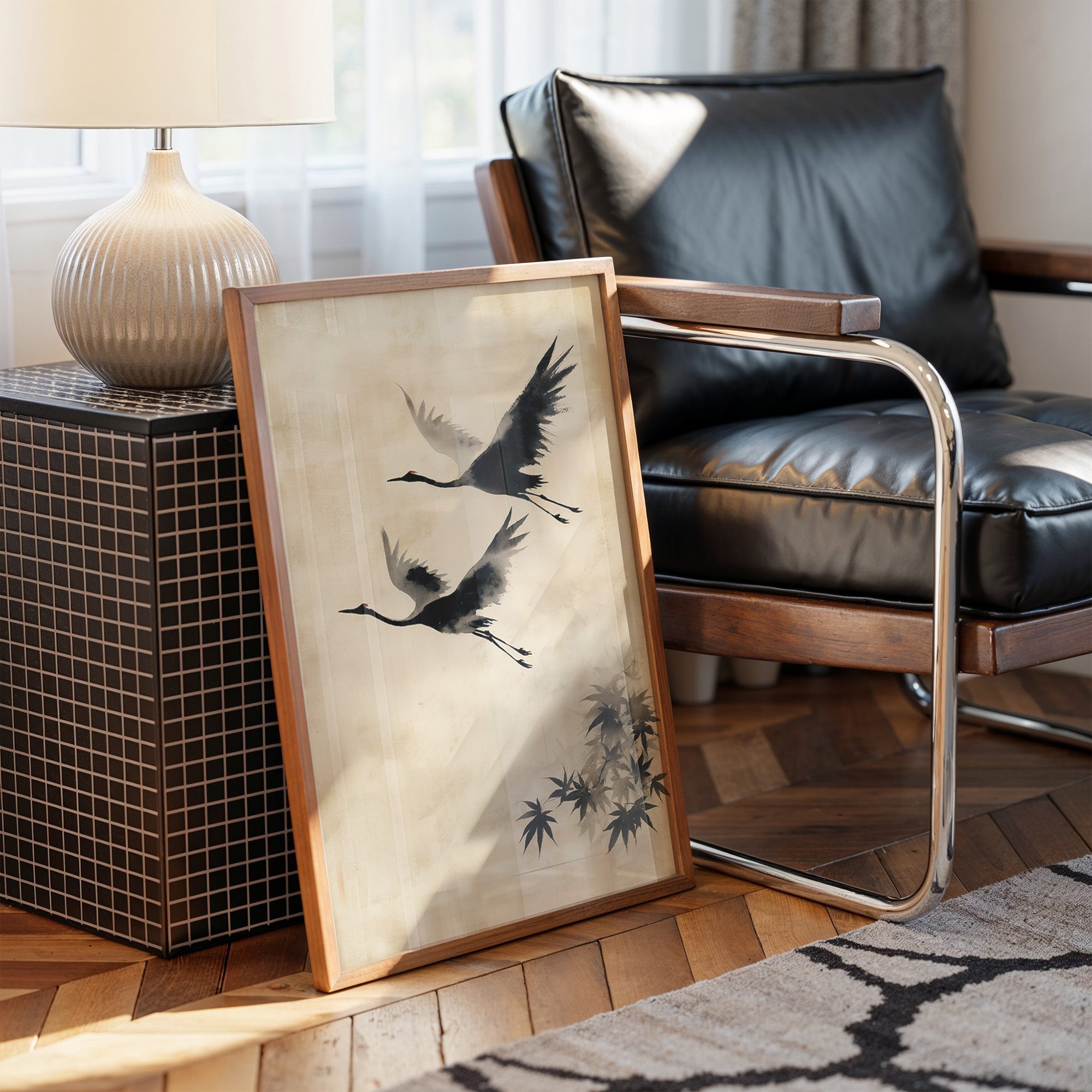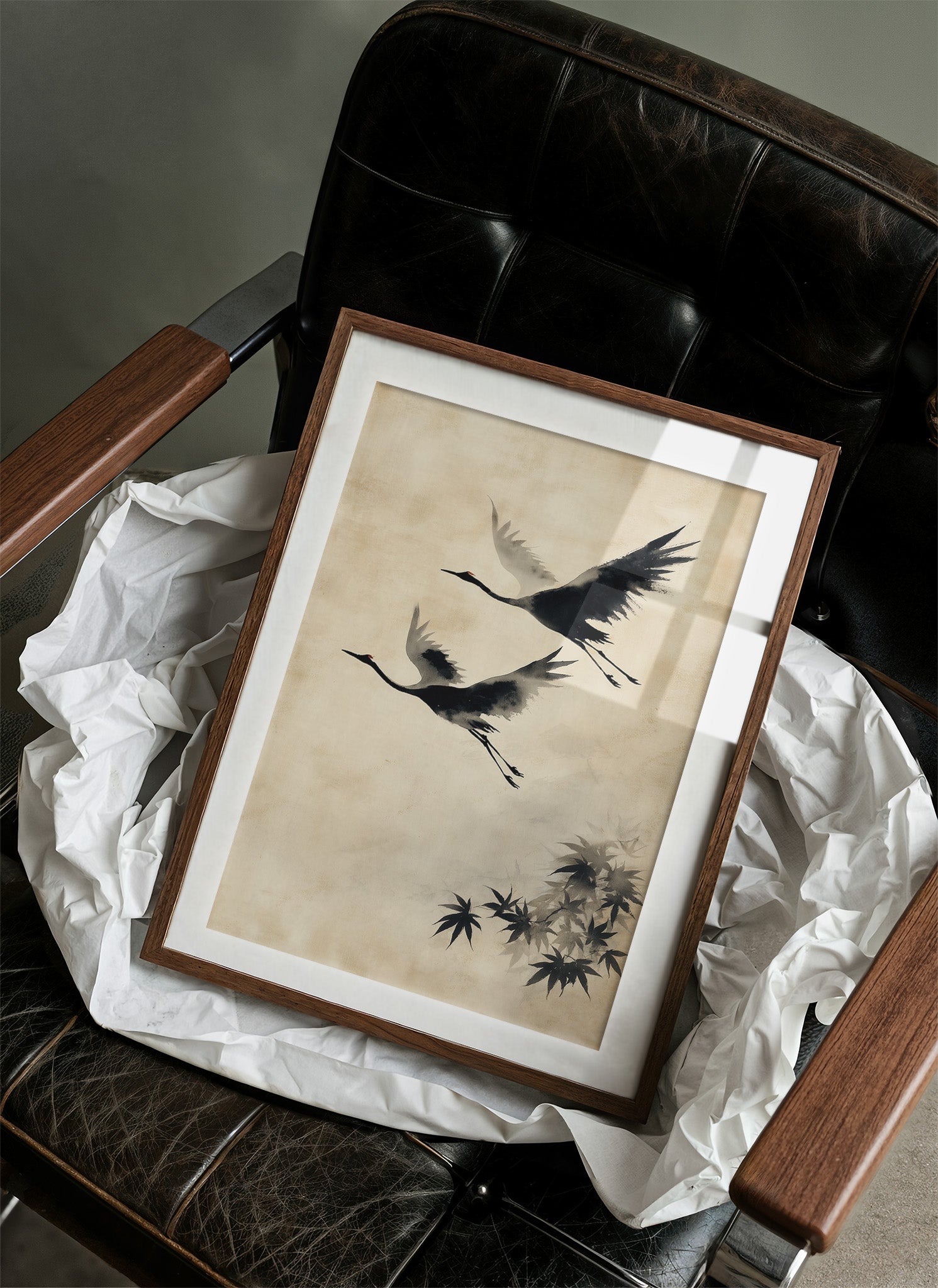 Ink-brushed wings stretch across aged parchment, capturing the graceful ascent of two cranes in perfect harmony. The minimalist strokes tell a story of partnership and freedom, while delicate maple leaves anchor the composition in Eastern artistic tradition. This contemporary interpretation of classical sumi-e style brings timeless serenity to modern spaces. Perfect for creating a contemplative atmosphere in a reading nook or bringing zen elegance to a minimal dining room.
