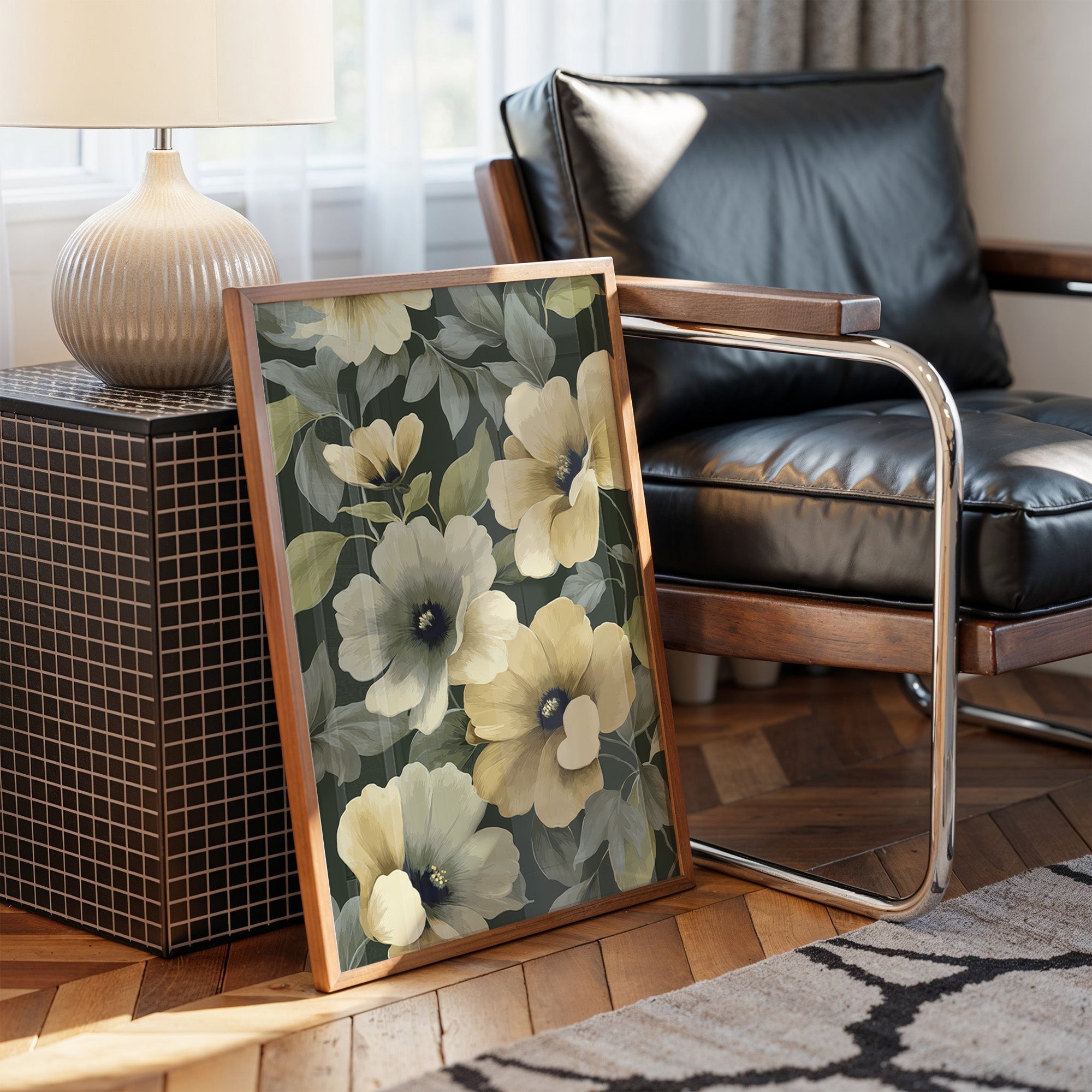 Delicate cream flowers unfold against deep emerald leaves, their petals catching afternoon light in a gentle dance. The vintage-inspired botanical illustration rests thoughtfully against a minimalist bookshelf, where design volumes and well-worn classics create a sophisticated backdrop. This piece brings together the timeless appeal of floral artistry with contemporary styling, creating a bridge between natural beauty and curated spaces. Perfect for bringing subtle drama to a reading nook, home office, or any space where quiet sophistication meets creative inspiration.