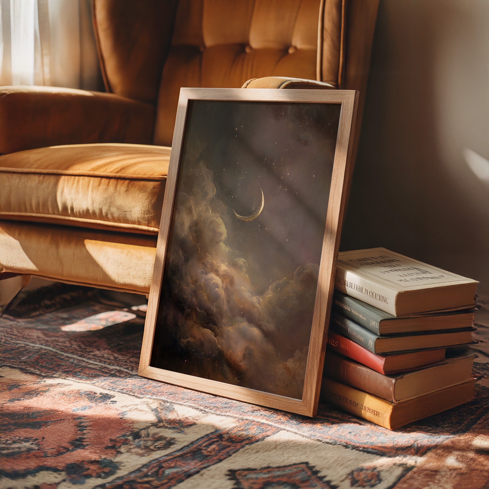 The slender moon hangs suspended in a sea of luminous amber clouds, bathed in a gentle celestial glow. Billowing formations drift across the canvas in warm honey tones, creating a dreamlike atmosphere where reality and fantasy merge. The delicate balance between light and shadow gives depth to the celestial scene, inviting viewers to lose themselves in its ethereal beauty. Perfect for a sophisticated bedroom or meditation space where its calming presence can inspire peaceful contemplation.