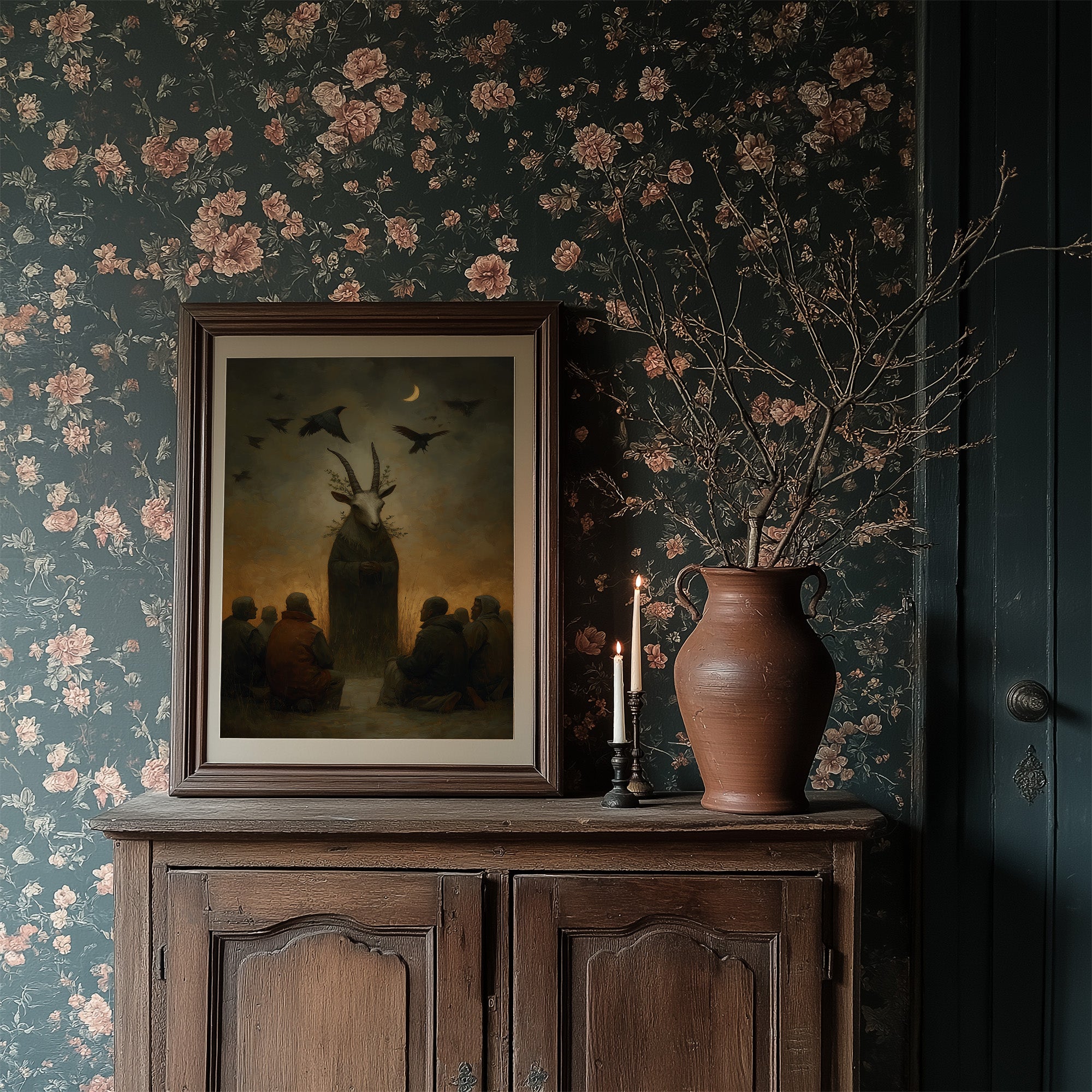 A mystical gathering unfolds beneath a waning crescent moon, where shadowy figures convene before a horned sentinel. The ethereal artwork blends earthy amber tones with misty grays, creating a dreamlike tableau where ravens circle overhead and foliage sprouts from the antlered figure's crown. This surrealist narrative captures the thin veil between worlds, inviting viewers into a primordial ceremony frozen in time.