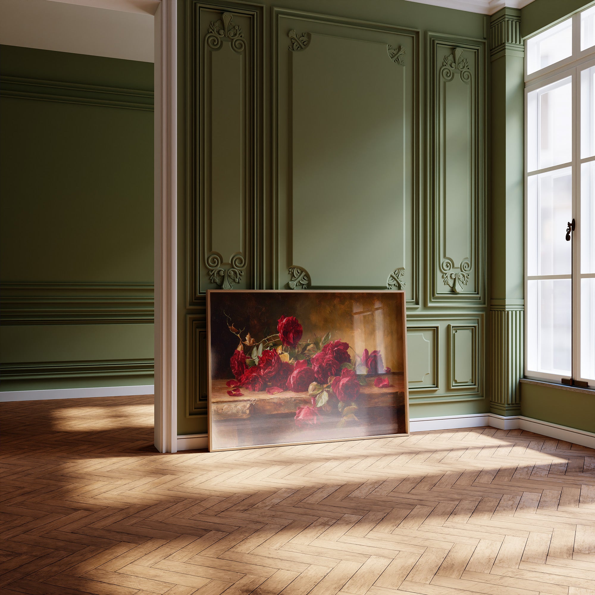 Rich velvet roses sprawl across weathered wood, their deep crimson petals catching light against the warm amber background. The classical still life painting rests elegantly against floor-to-ceiling bookshelves filled with leather-bound volumes and contemporary titles, creating a perfect dialogue between visual and literary arts. This sophisticated pairing breathes new life into traditional floral artistry, offering a moment of contemplative beauty amid collected knowledge.