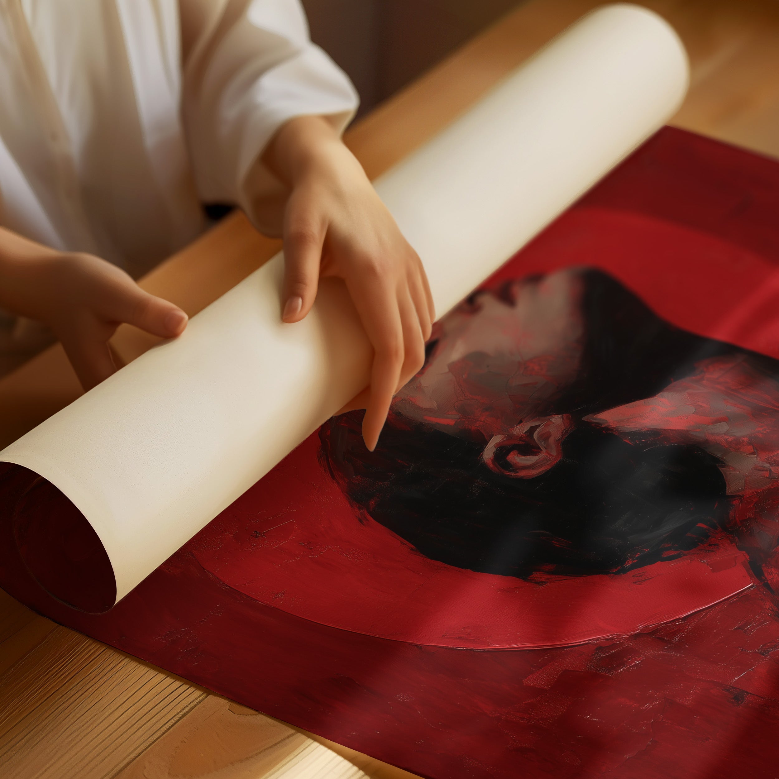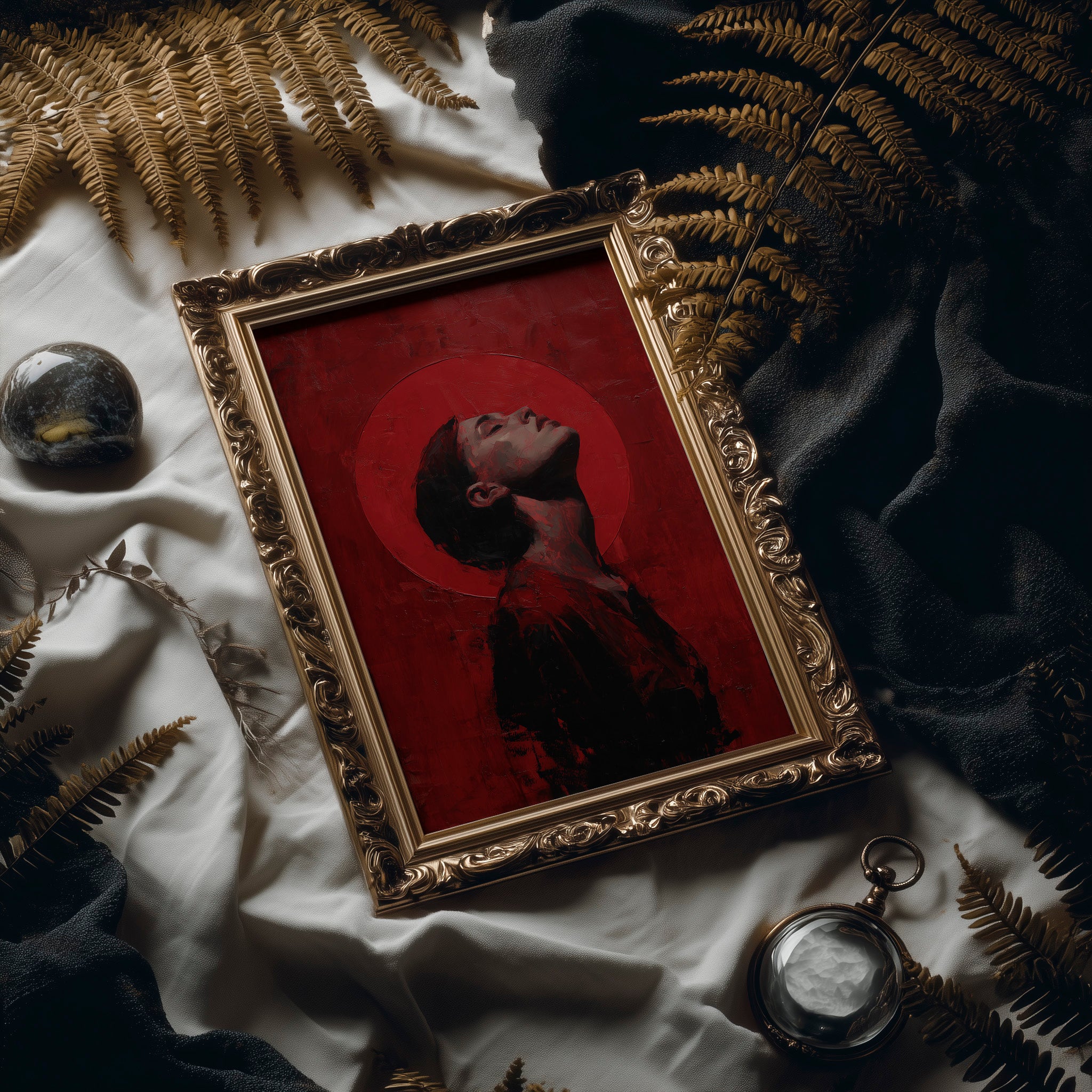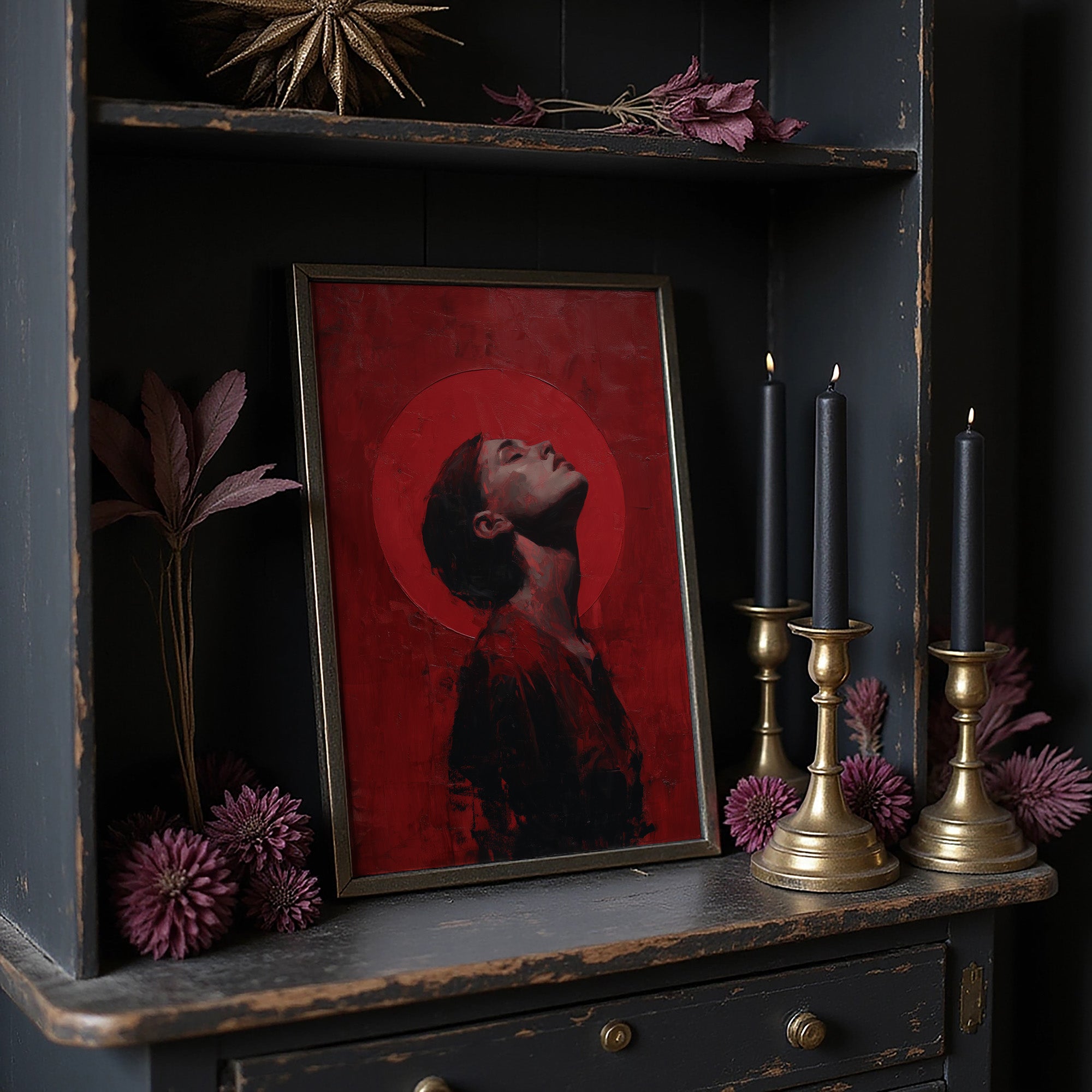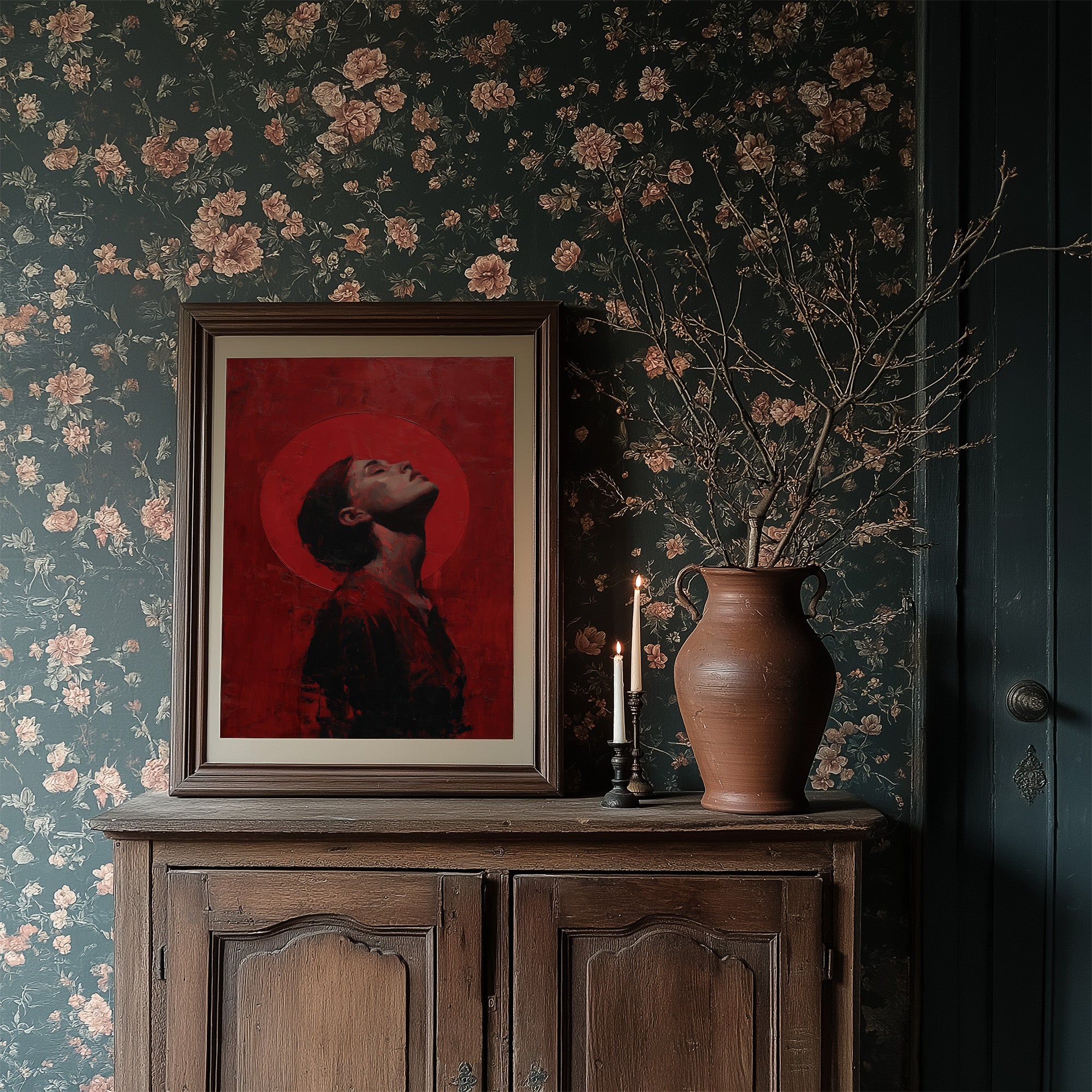 A moment suspended between surrender and strength, captured in deep crimson tones that pulse with raw emotion. The figure tilts upward in contemplative reverence, haloed by a perfect circle that burns like a silent sun against the textured scarlet background. The stark contrast between the dramatic portrait and the elegant black paneled wall creates a powerful dialogue between classical architecture and contemporary expression. This striking piece commands attention in a minimalist living space, bringing passionate energy to spaces that balance the modern and the timeless.