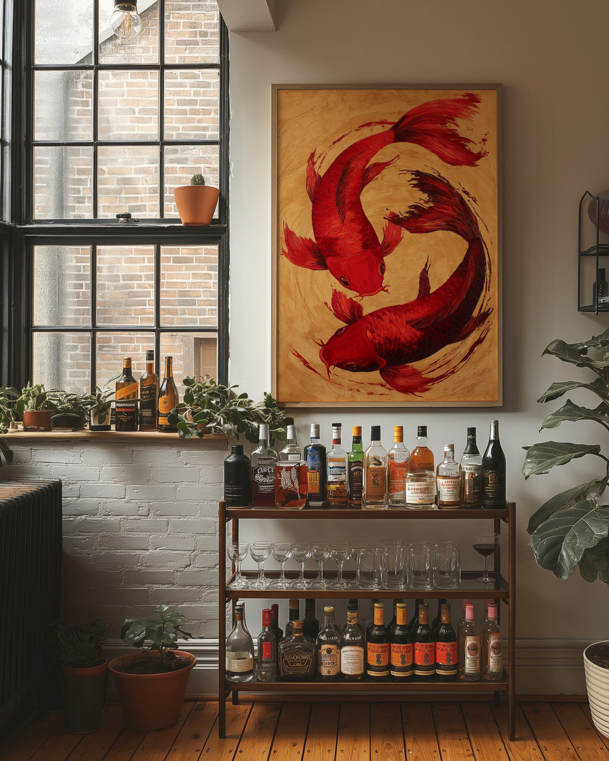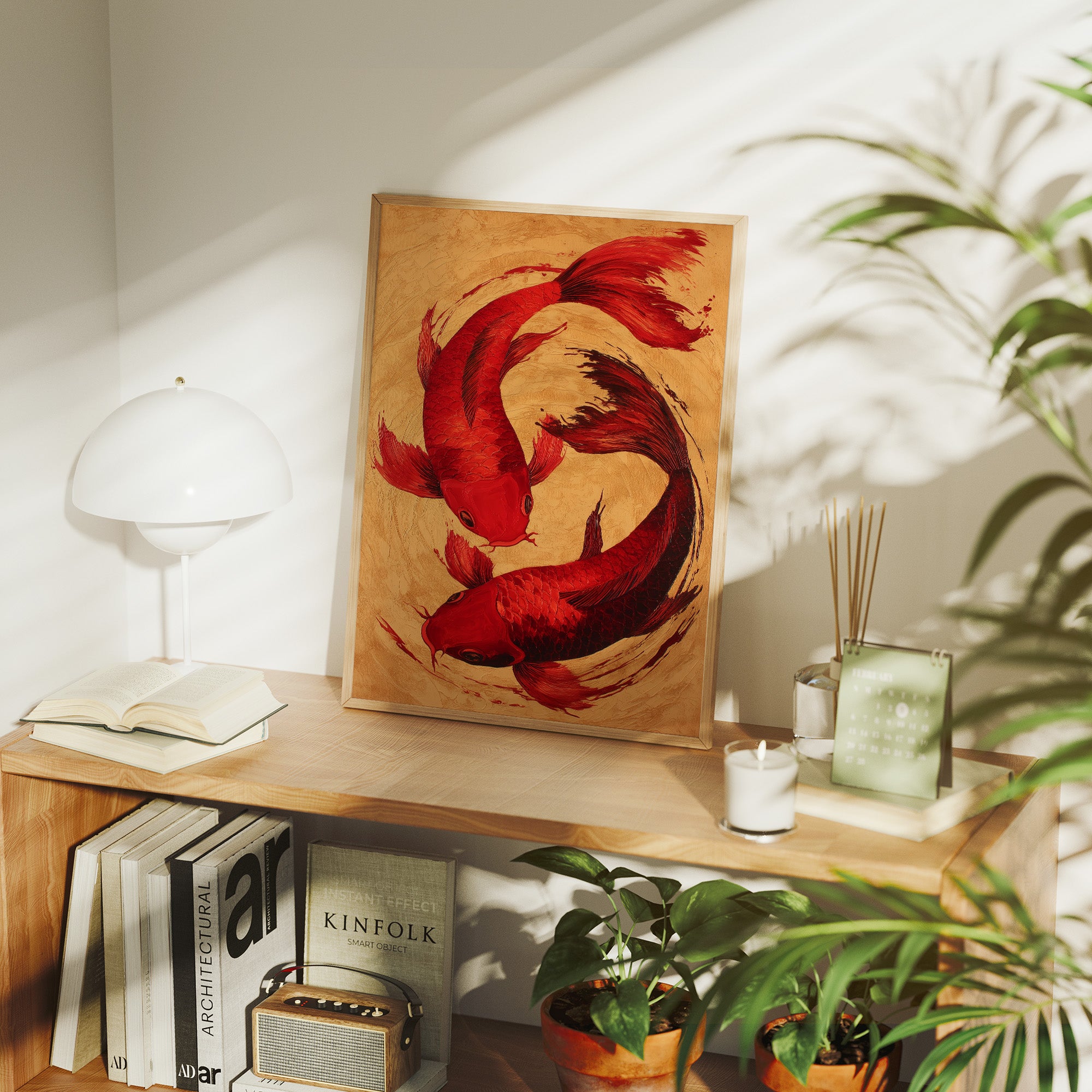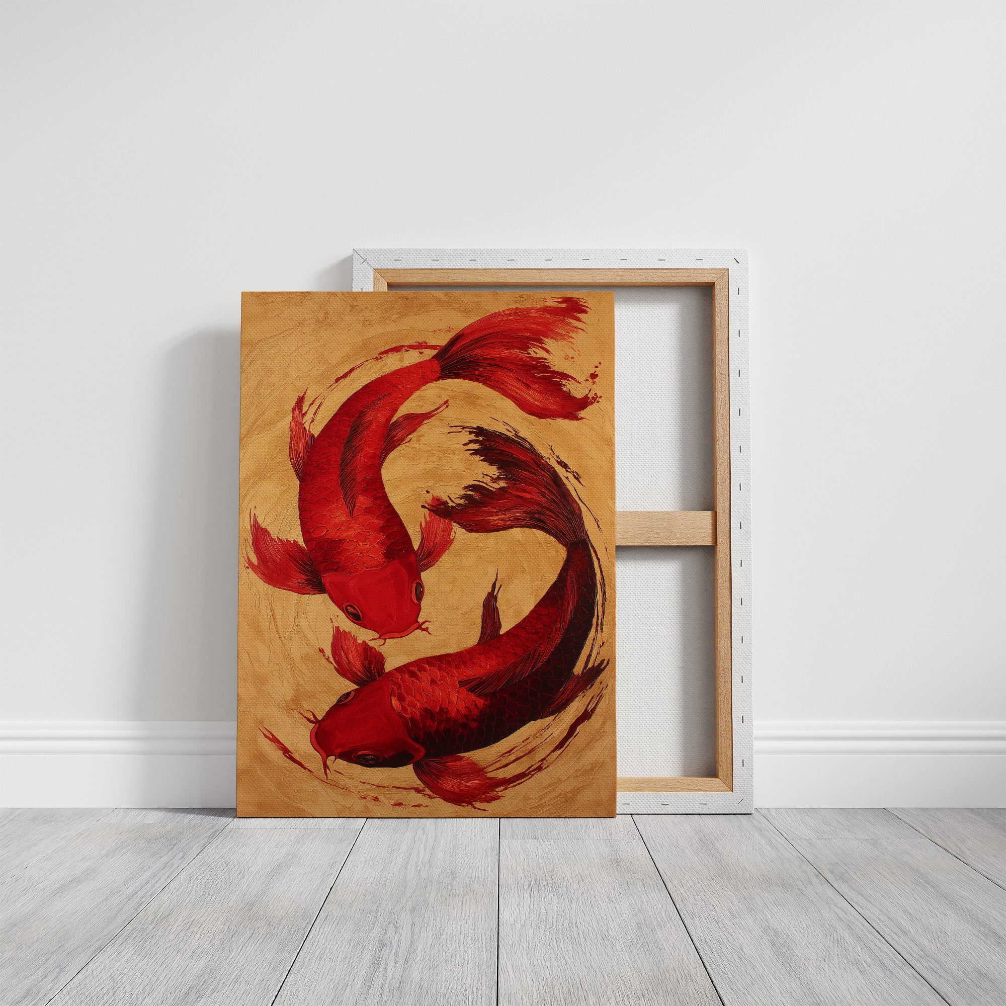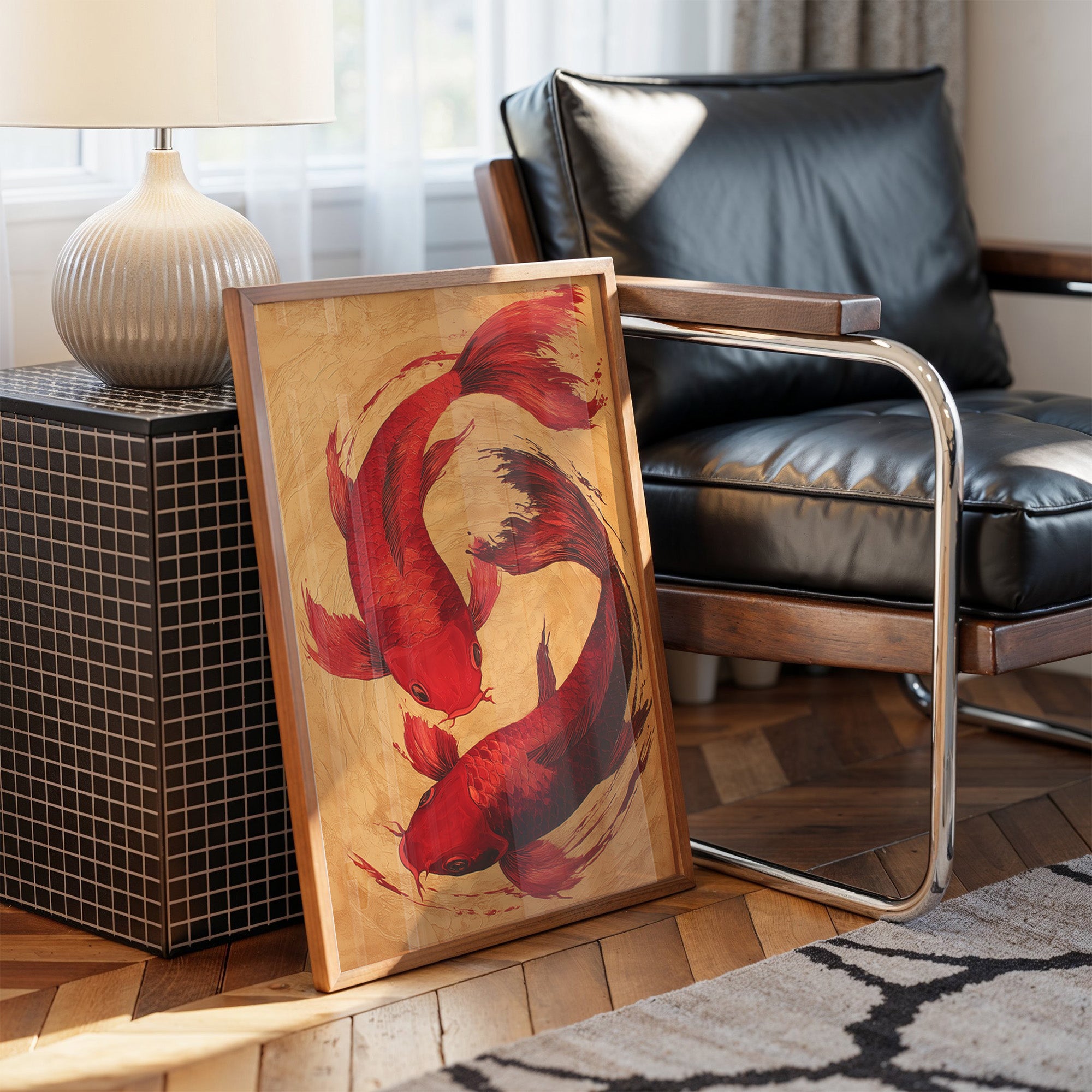 Vibrant red koi fish swirl through golden waters, their scales catching imaginary light in bold, passionate brushstrokes. The dynamic movement captures the eternal dance of these mythical creatures, their bodies forming a perfect circle of perpetual motion and grace. Against the warm amber background, the artwork pulses with energy while maintaining a sense of Asian artistic tradition and contemporary expression. This piece would create a stunning focal point in a modern living room or bring serene energy to a minimalist home office space.