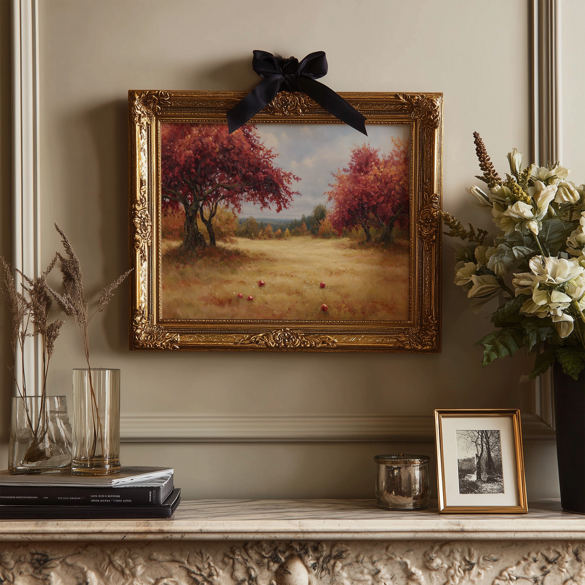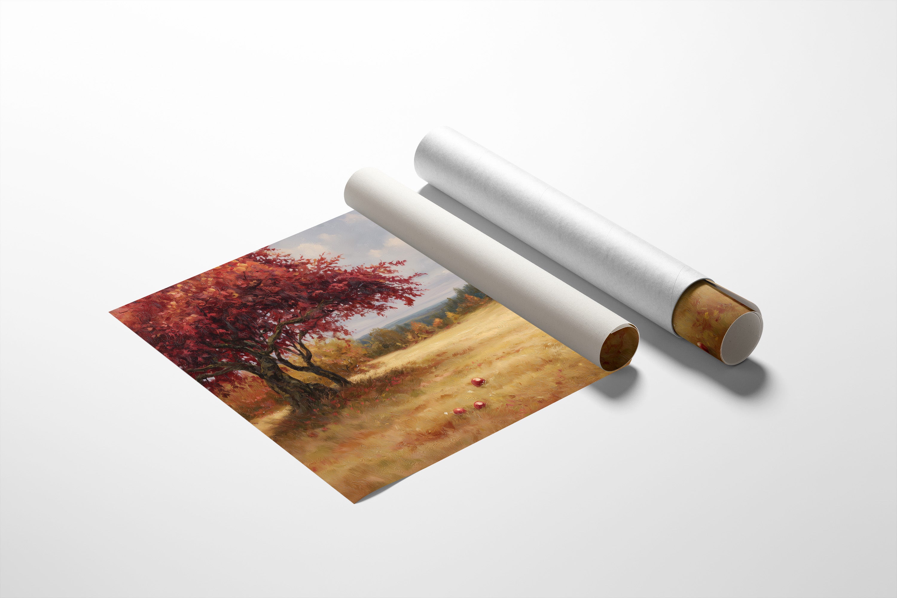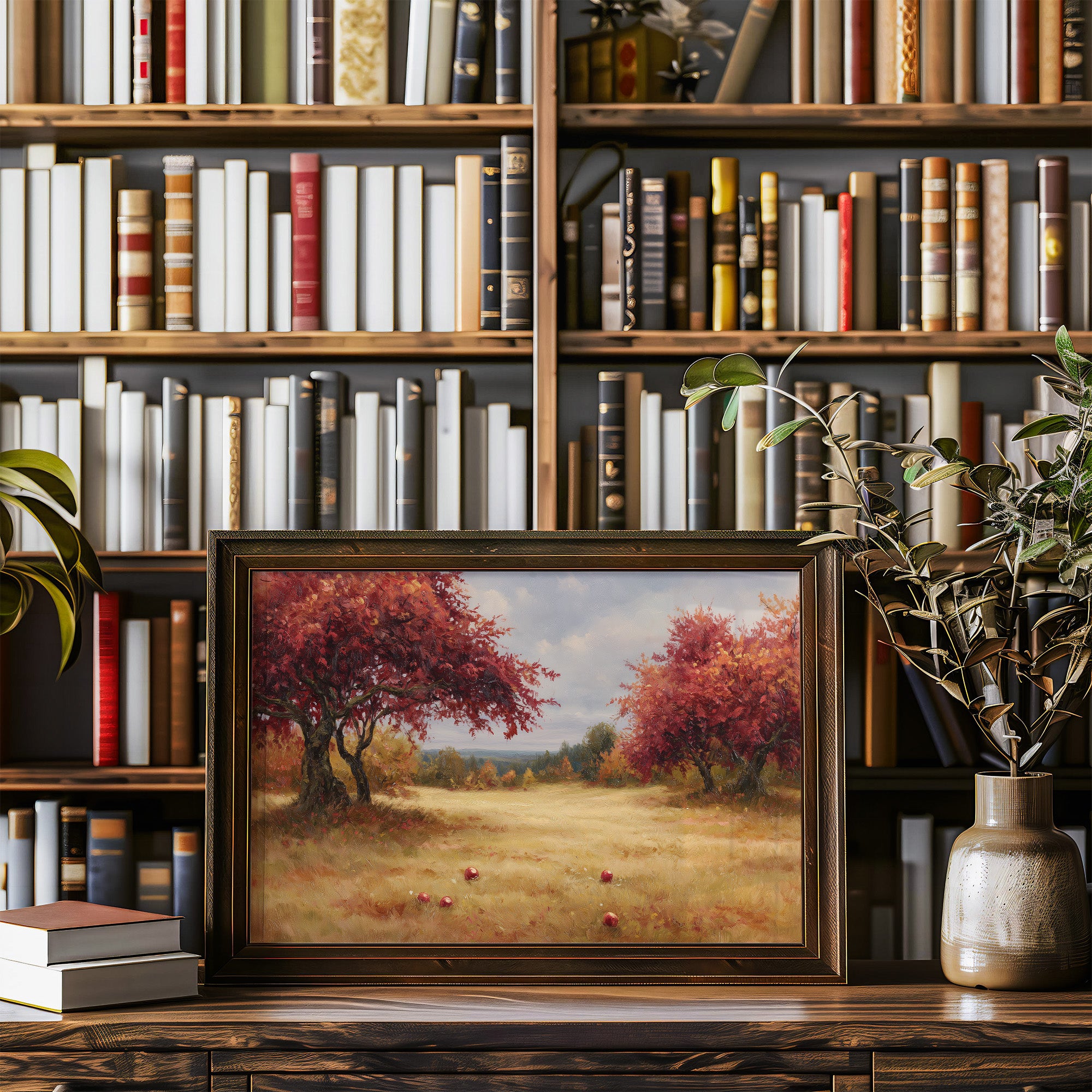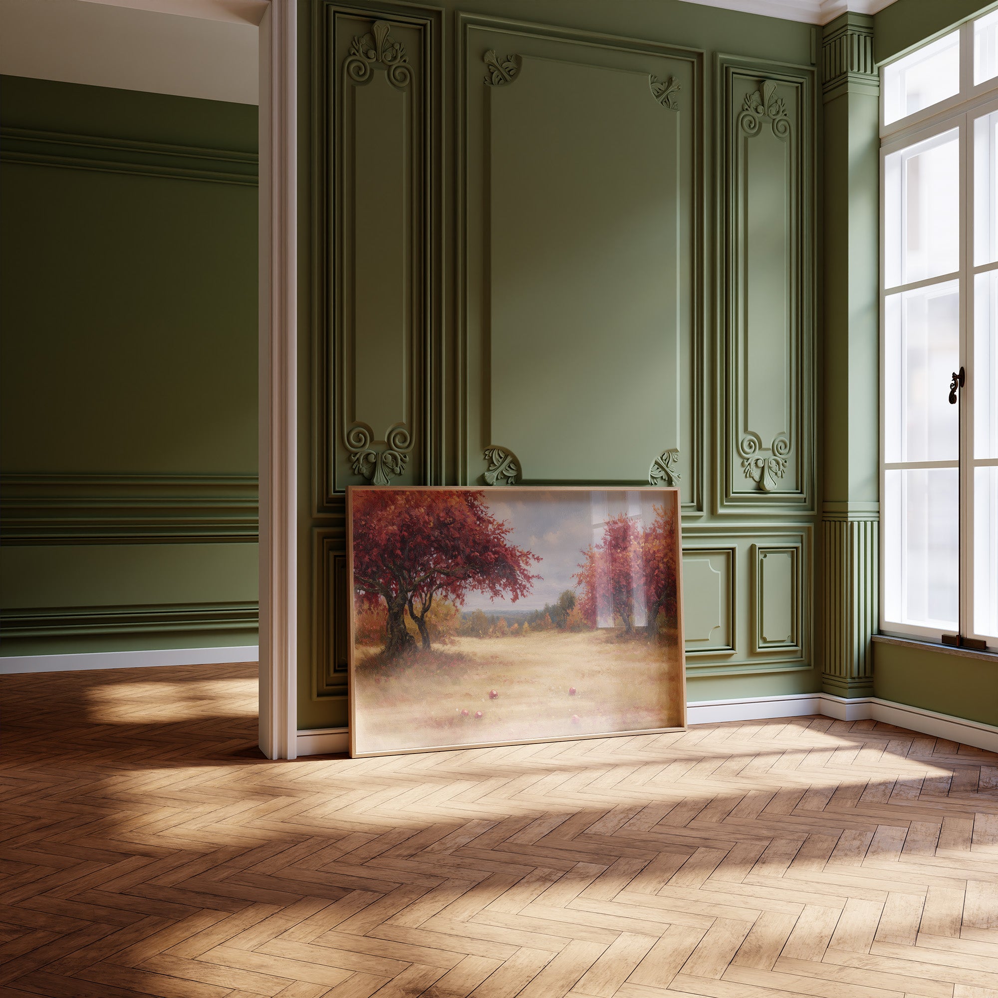 A moment captured in warm autumn light, where crimson-leaved trees stand like sentinels across a golden meadow. The painting breathes with nostalgic tranquility, its rich burgundy foliage contrasting against a soft blue sky while scattered red wildflowers dot the amber field below. This contemplative landscape creates a perfect focal point for a study, living room, or reading nook where one might pause to remember simpler days.