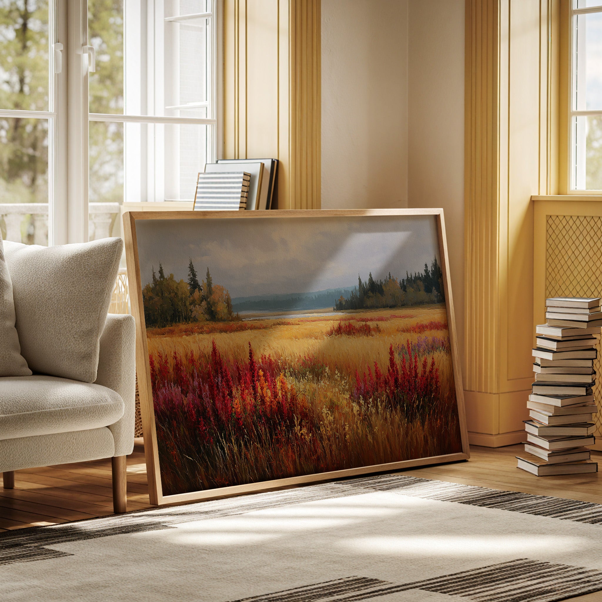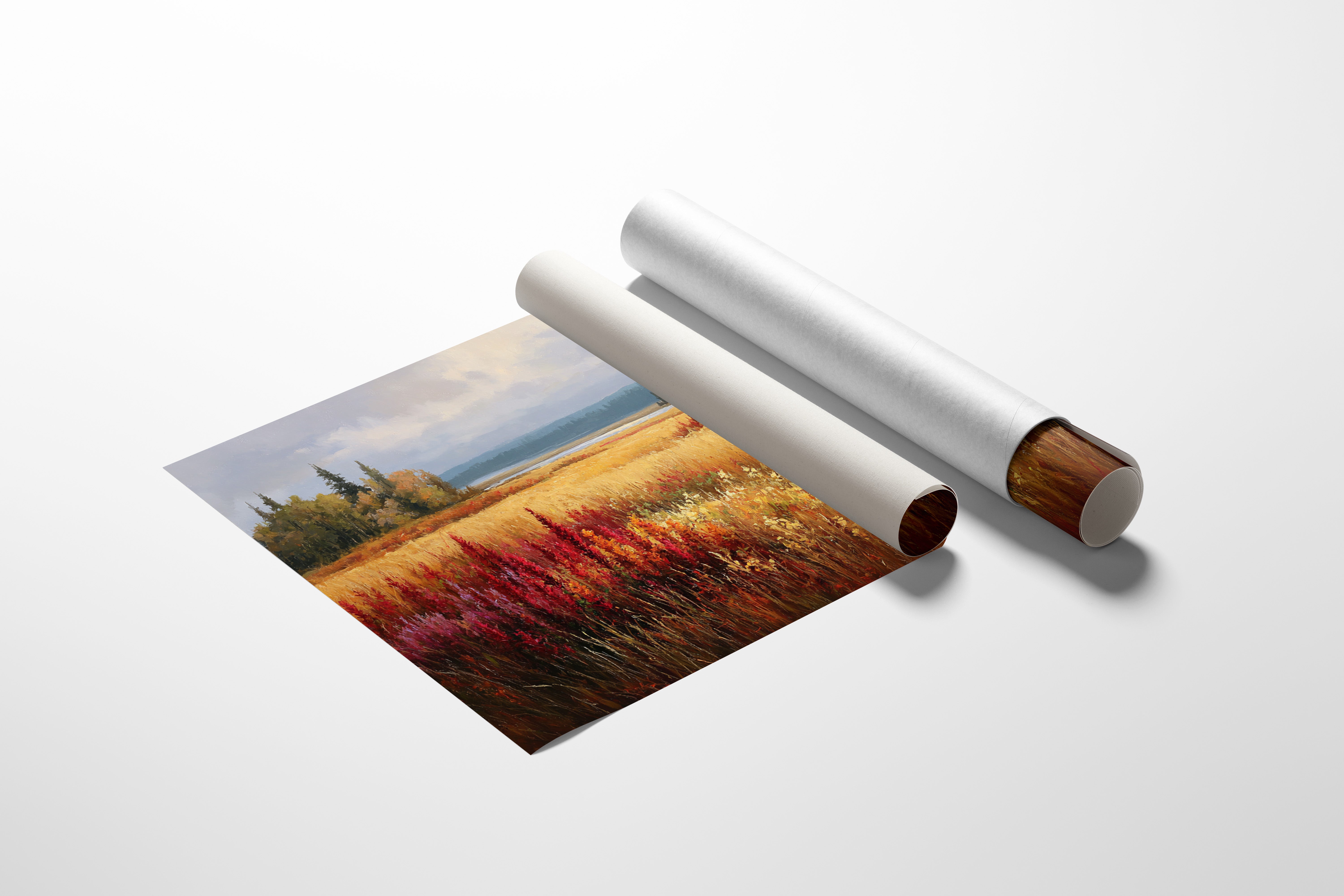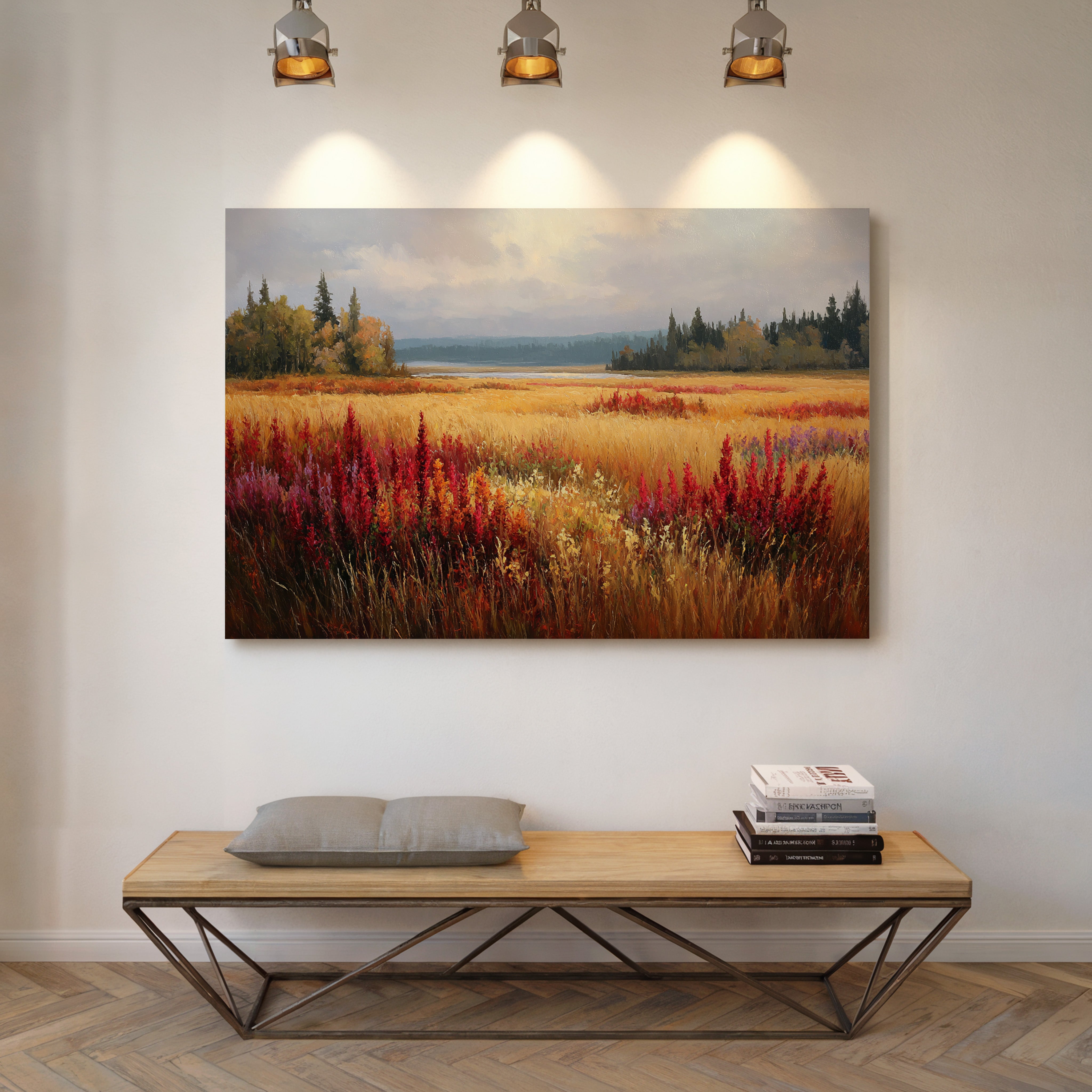 Vibrant red wildflowers dance through golden prairie grass, their bold stems reaching skyward like nature's brushstrokes. The landscape unfolds in layers of amber and crimson, telling stories of autumn's passionate embrace. Beyond the flowering meadow, evergreen sentinels stand guard along the shoreline, while distant mountains fade into misty blues beneath cloud-kissed skies. This contemporary landscape captures the fleeting magic of fall's final performance, where each color plays its part in nature's symphony.