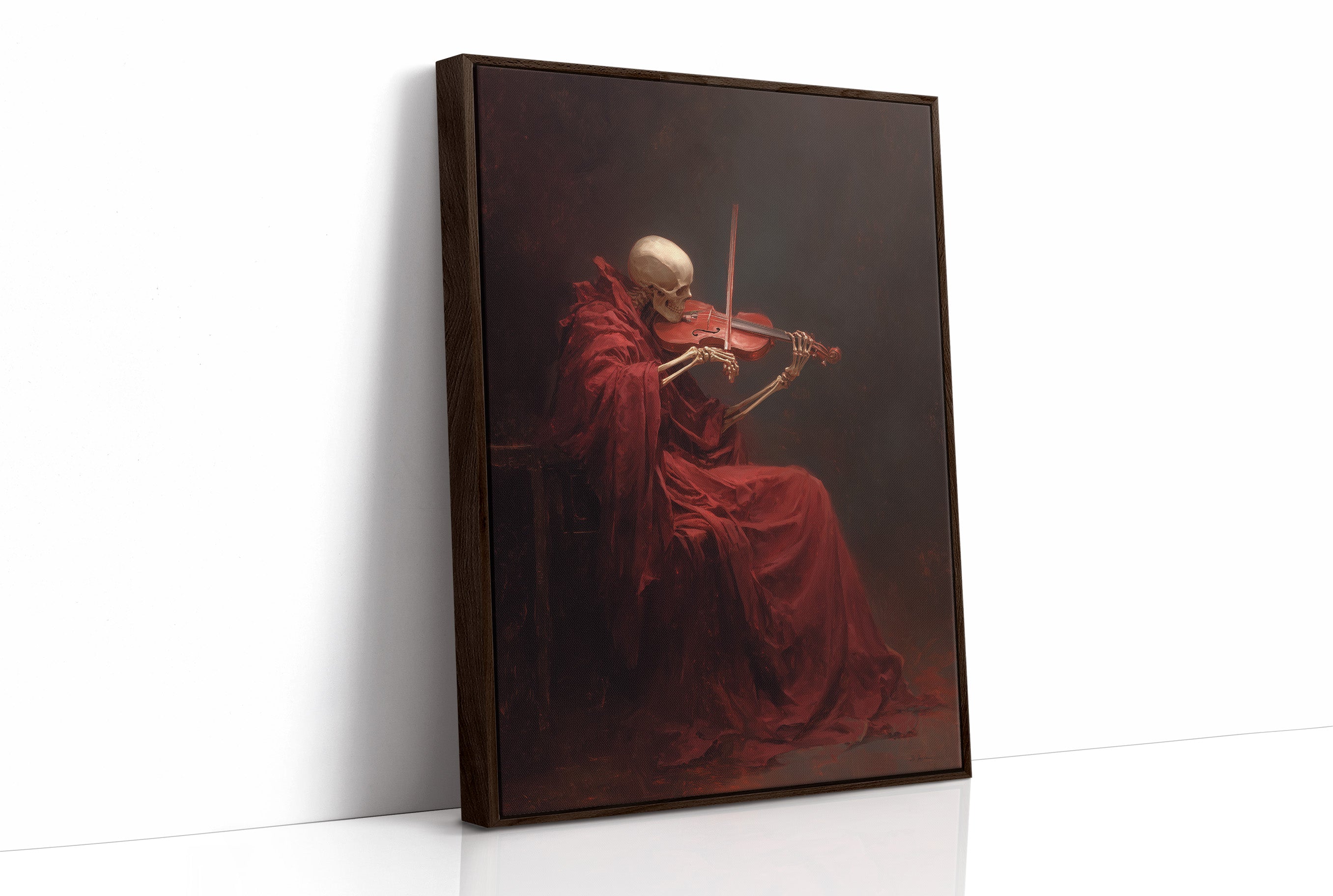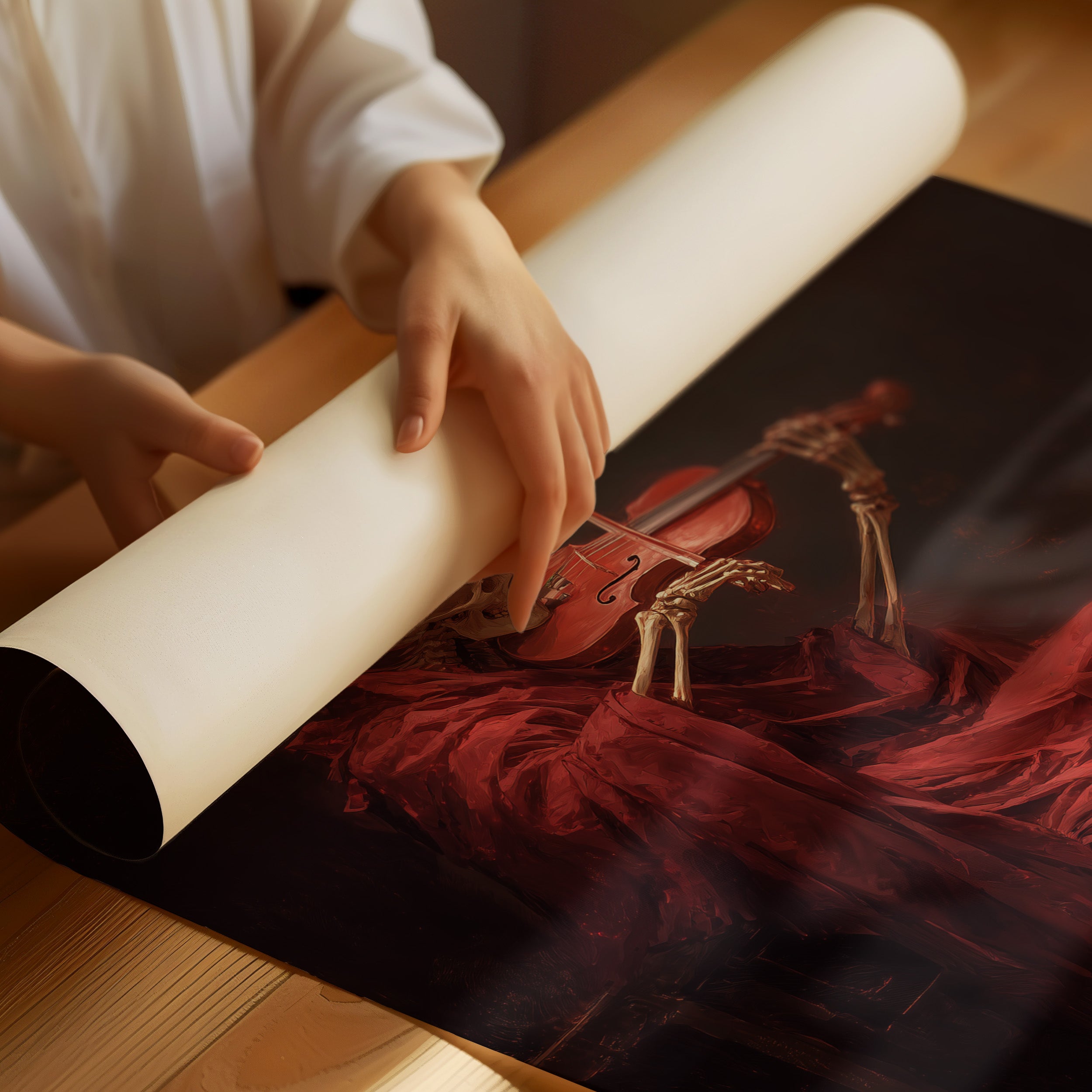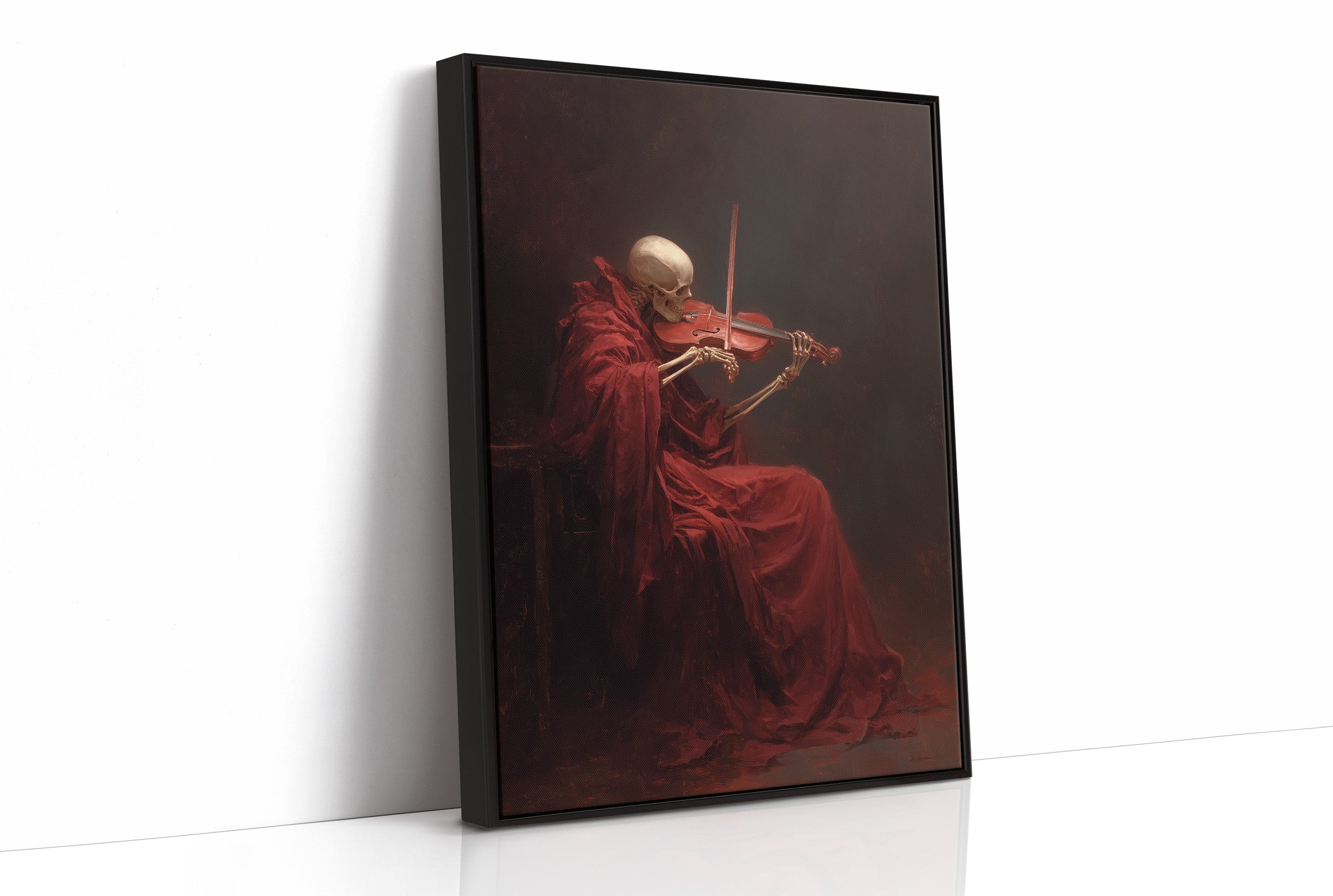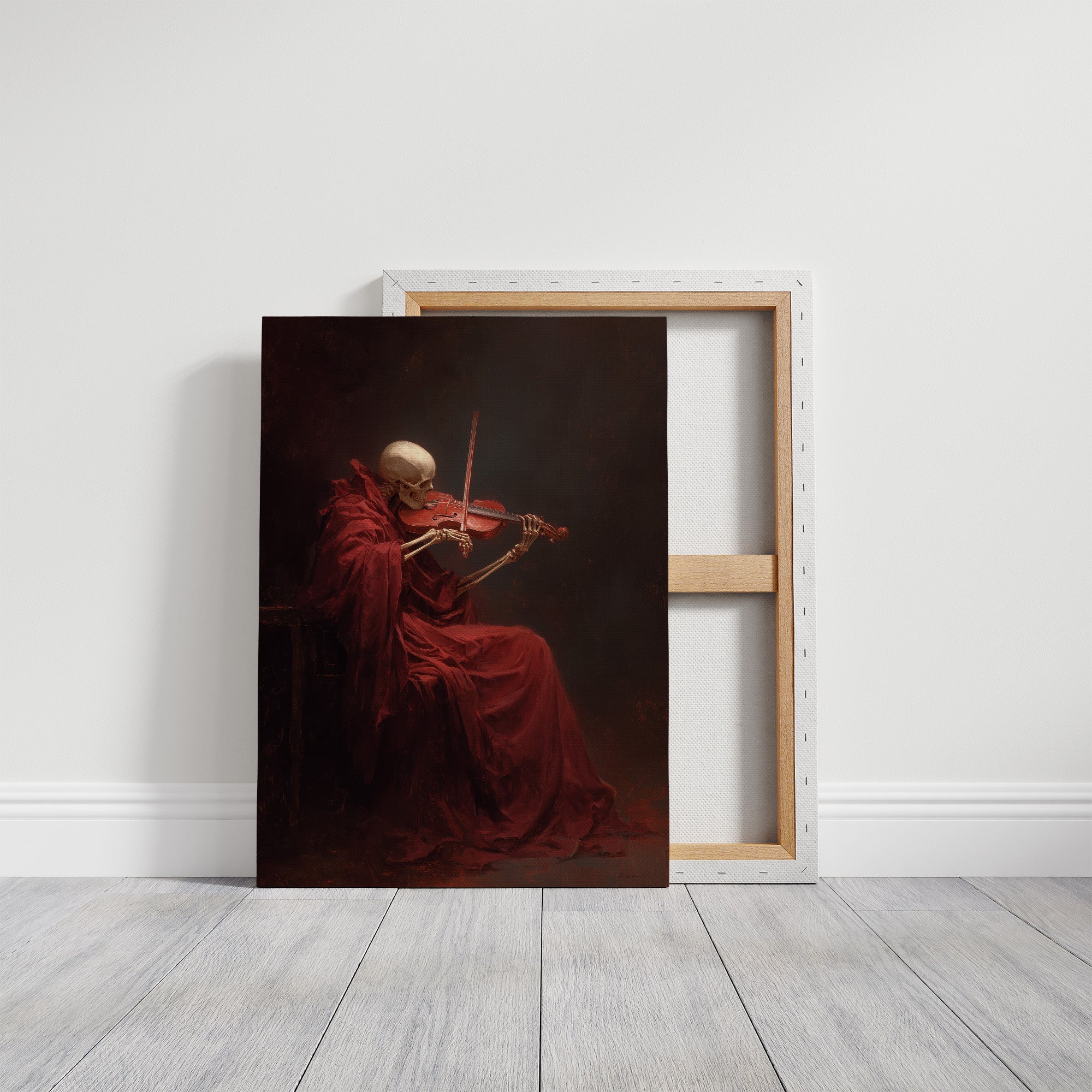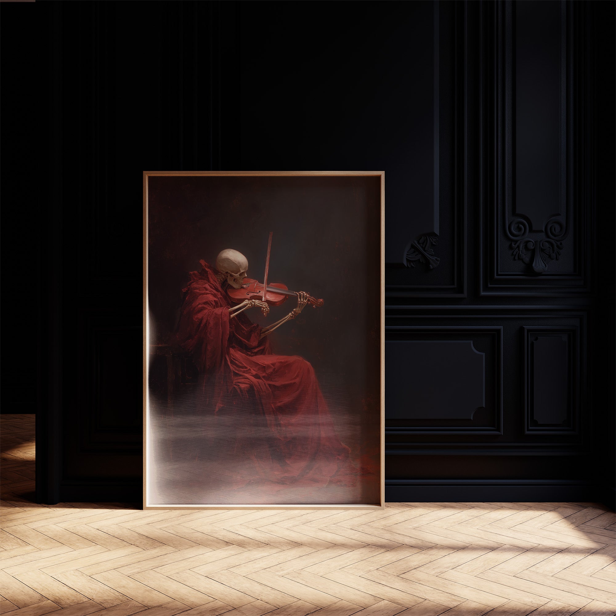 A haunting stillness fills the air as skeletal hands draw a mournful tune from a violin draped in deep crimson. The figure sits cloaked in flowing red robes against a dark backdrop, creating a striking contrast between life, death, and the eternal language of music. Each brushstroke captures the paradoxical beauty of mortality engaged in a timeless creative act, the skeleton's posture suggesting both concentration and reverence for the art it performs. This statement piece commands attention in modern spaces with dark accents, bringing dramatic depth to minimalist living rooms or creating a thought-provoking focal point in creative studios.