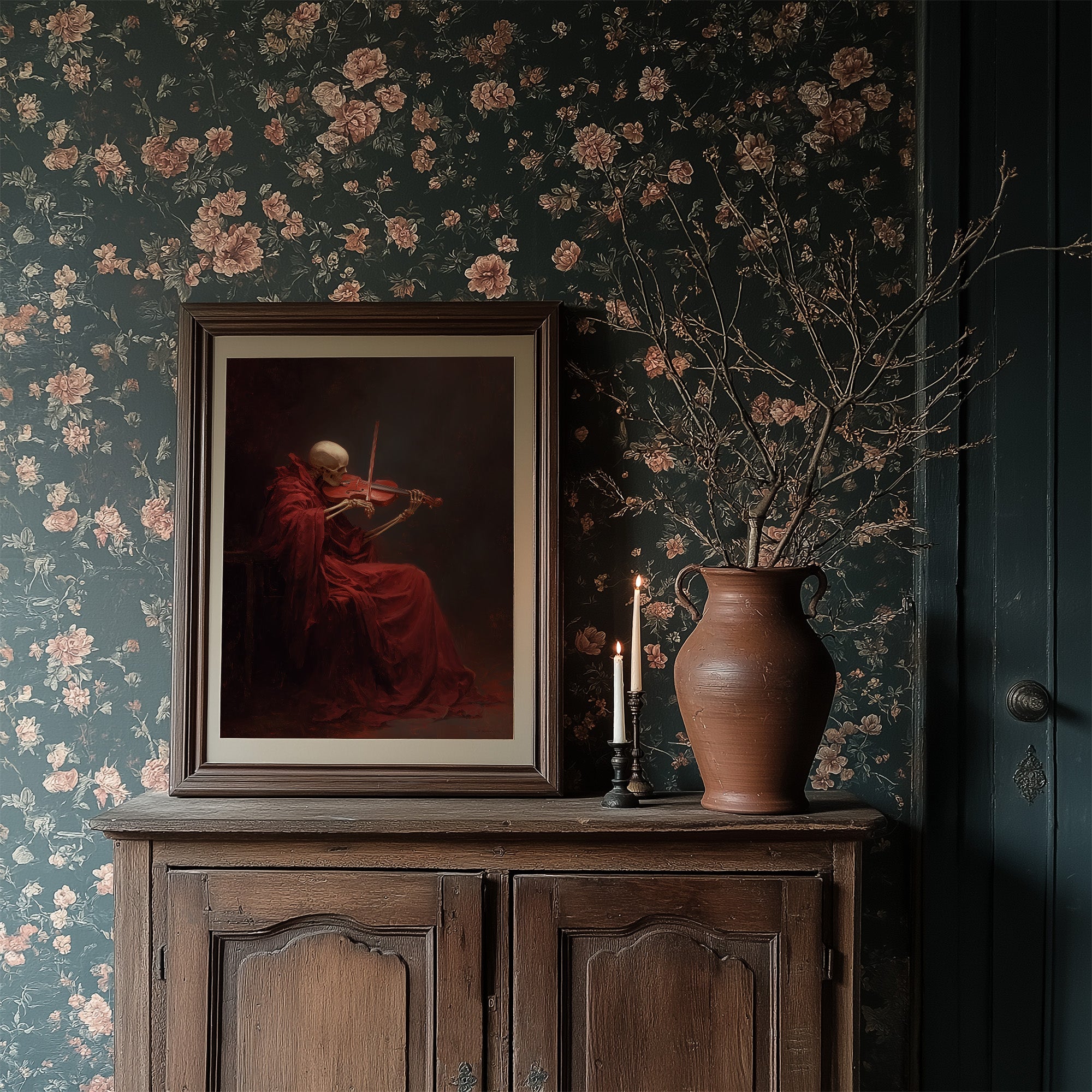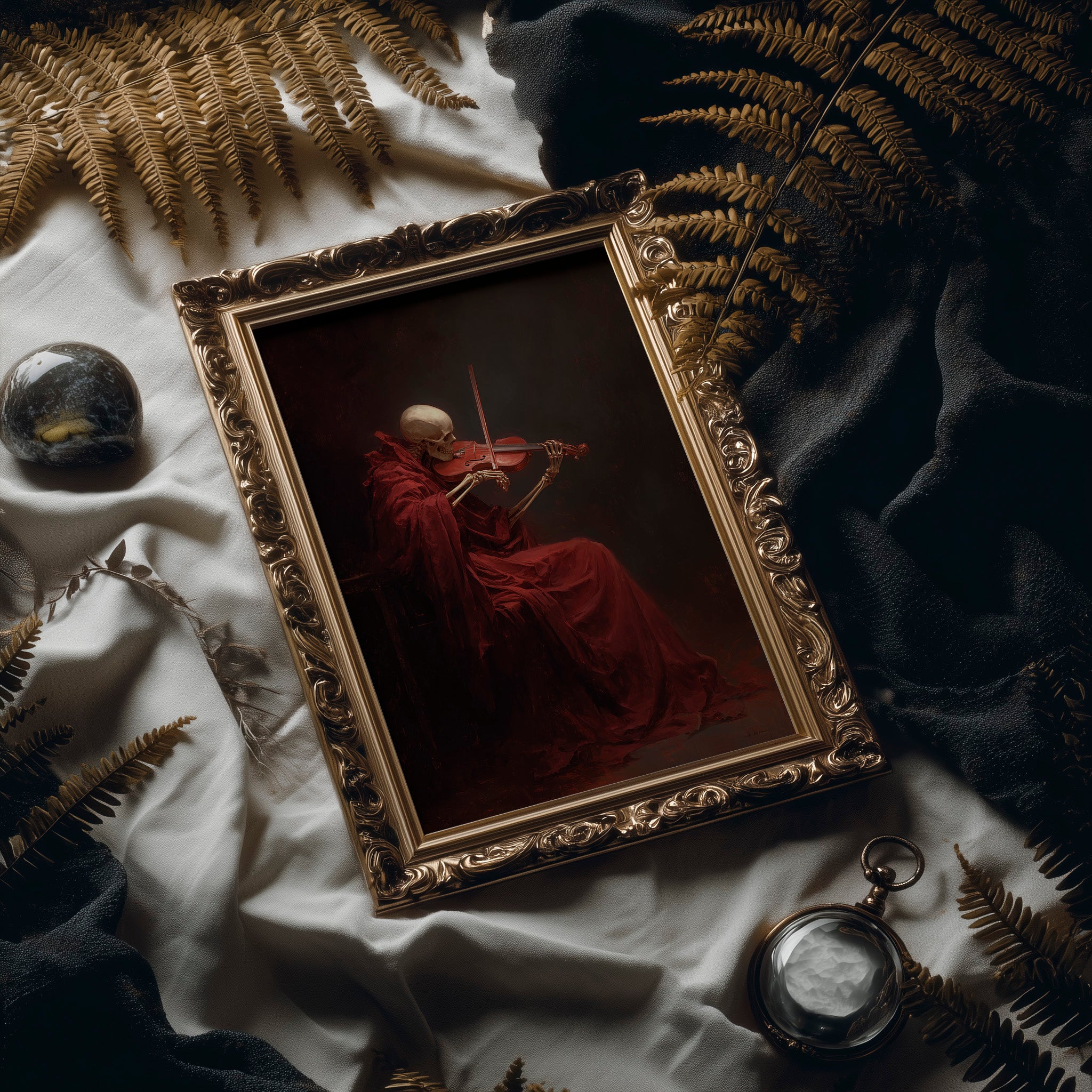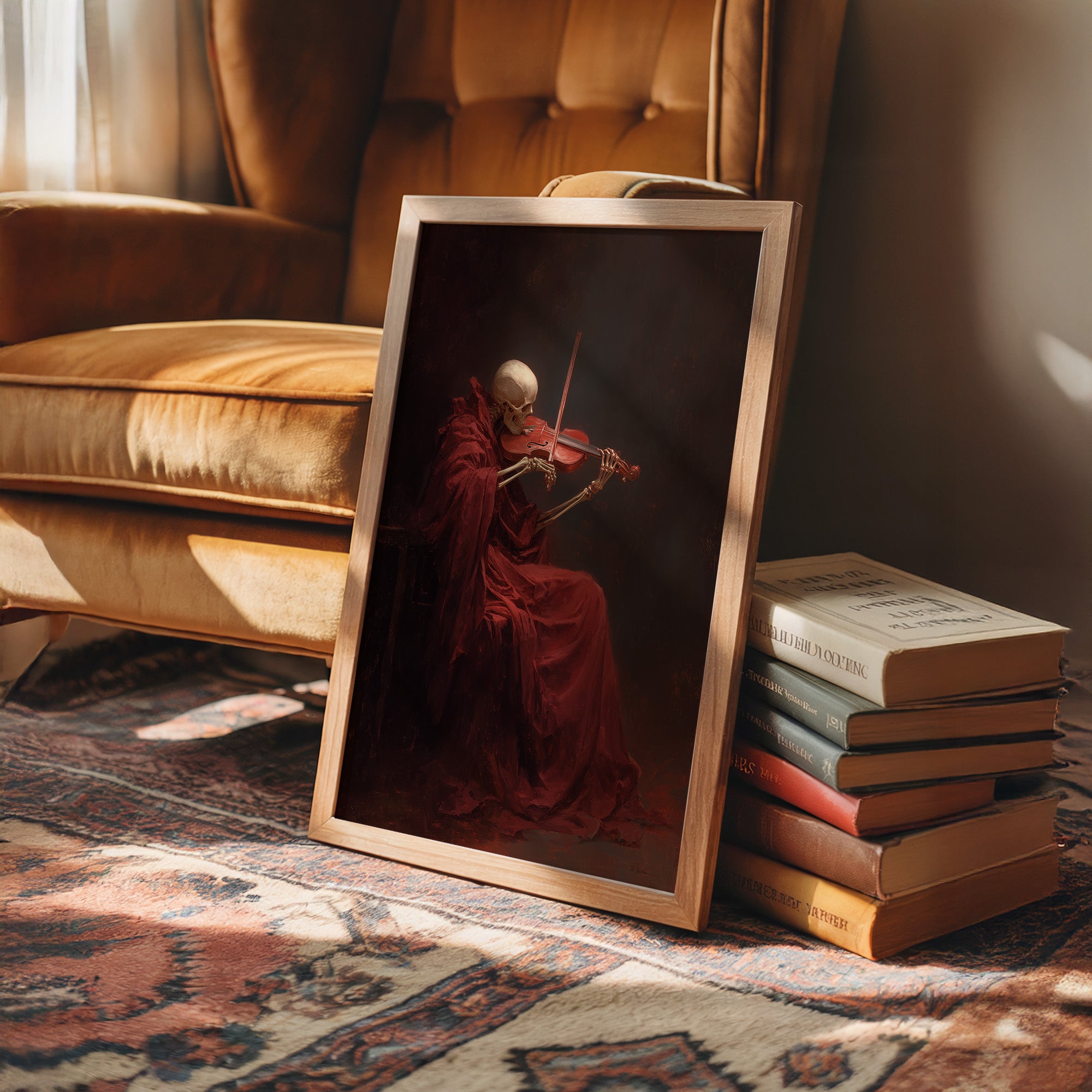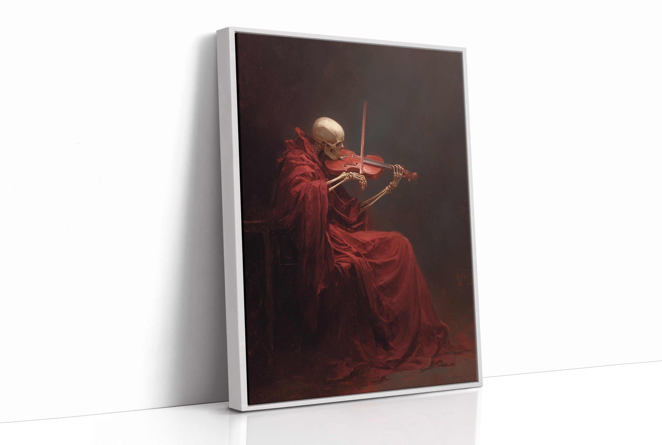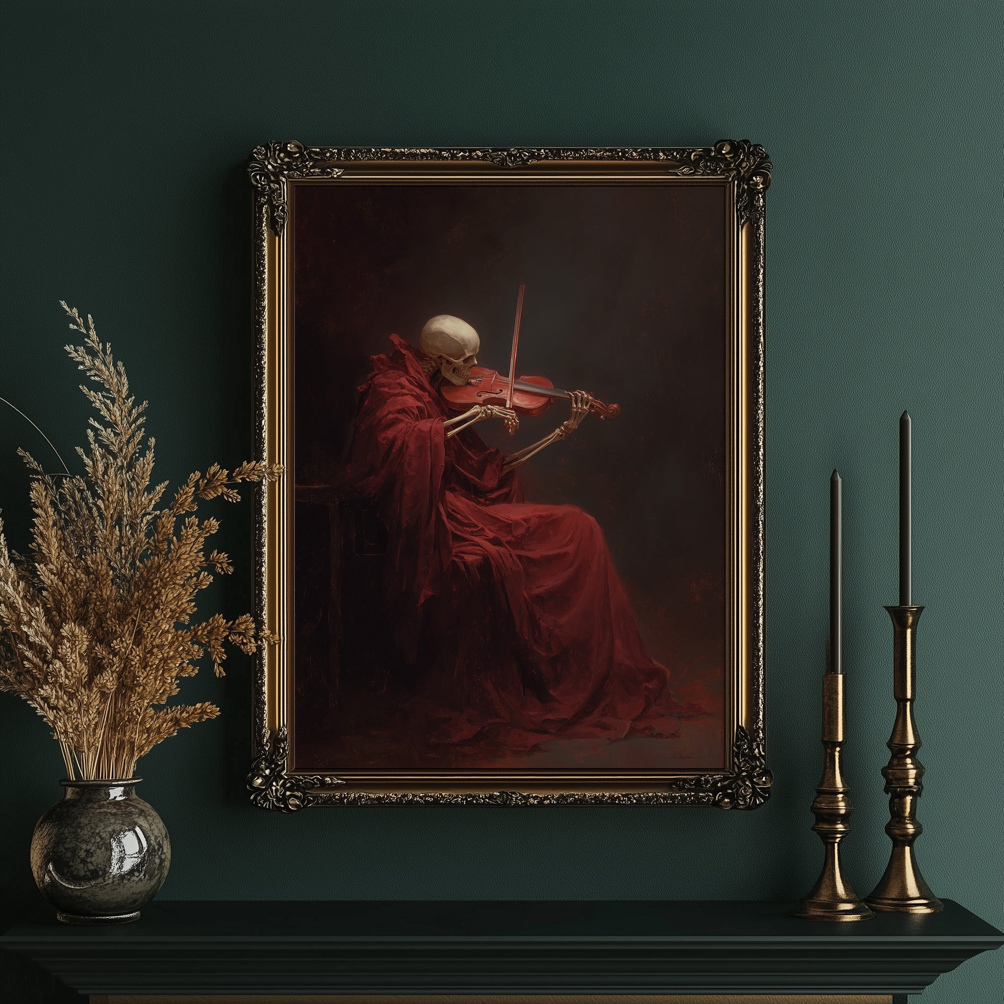A haunting stillness fills the air as skeletal hands draw a mournful tune from a violin draped in deep crimson. The figure sits cloaked in flowing red robes against a dark backdrop, creating a striking contrast between life, death, and the eternal language of music. Each brushstroke captures the paradoxical beauty of mortality engaged in a timeless creative act, the skeleton's posture suggesting both concentration and reverence for the art it performs. This statement piece commands attention in modern spaces with dark accents, bringing dramatic depth to minimalist living rooms or creating a thought-provoking focal point in creative studios.