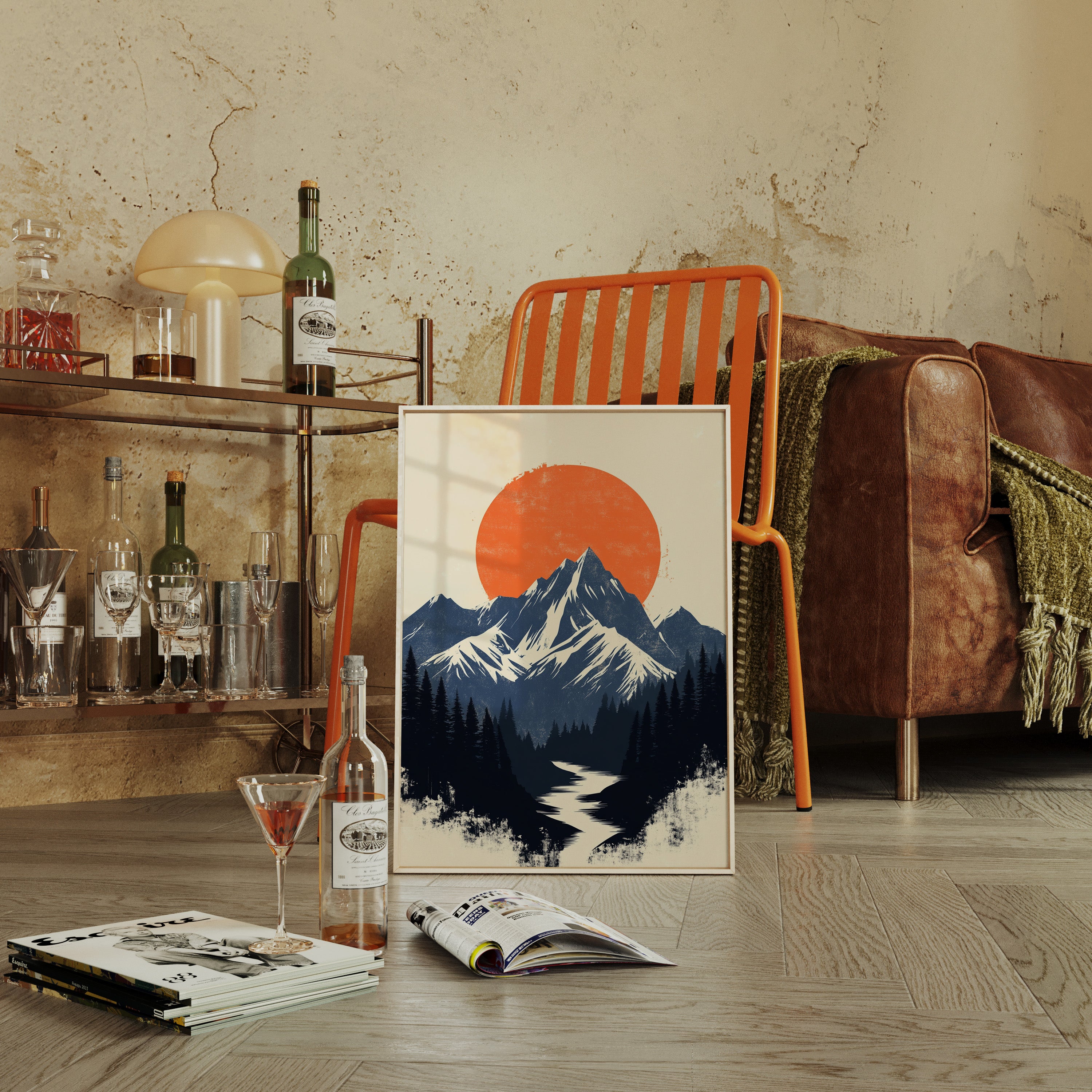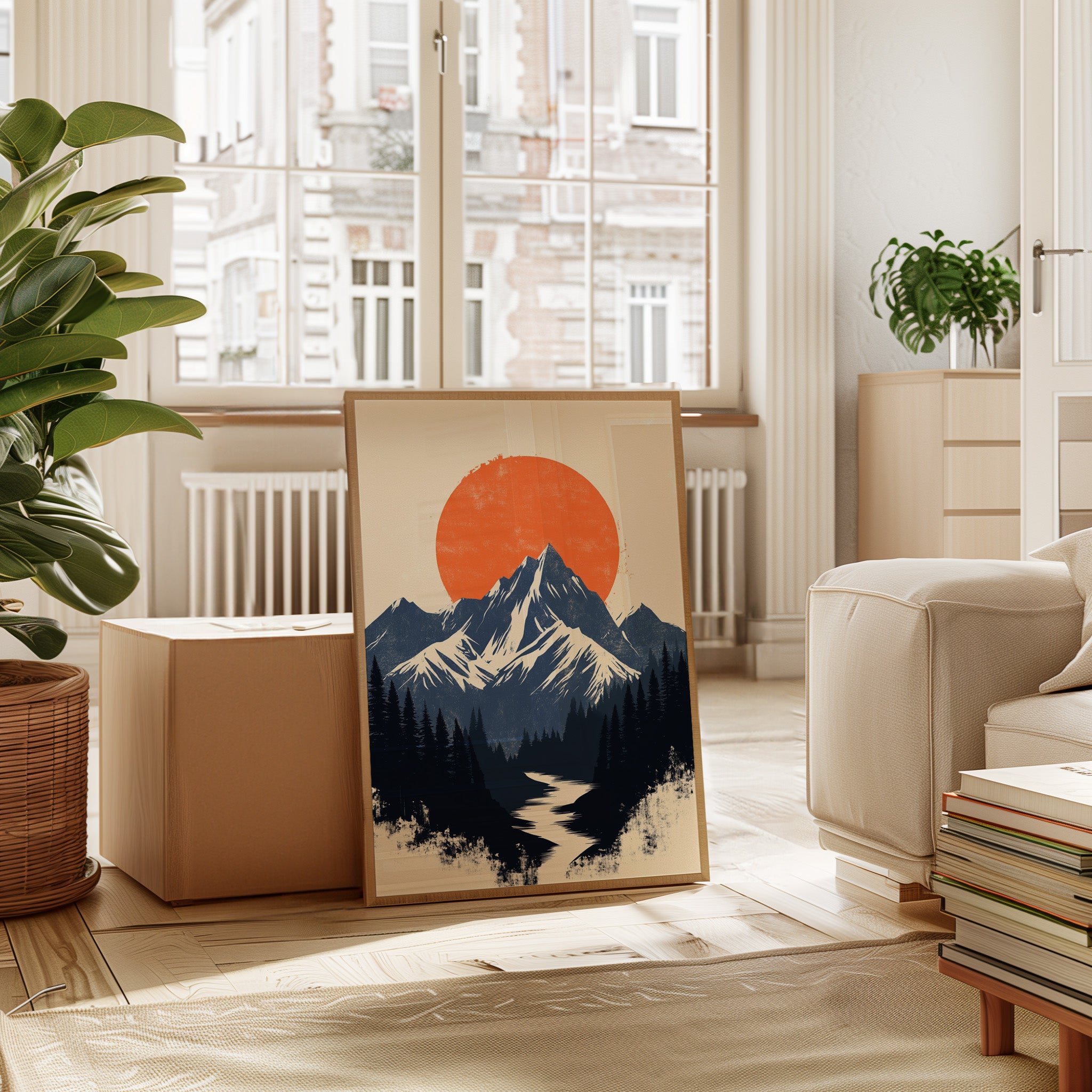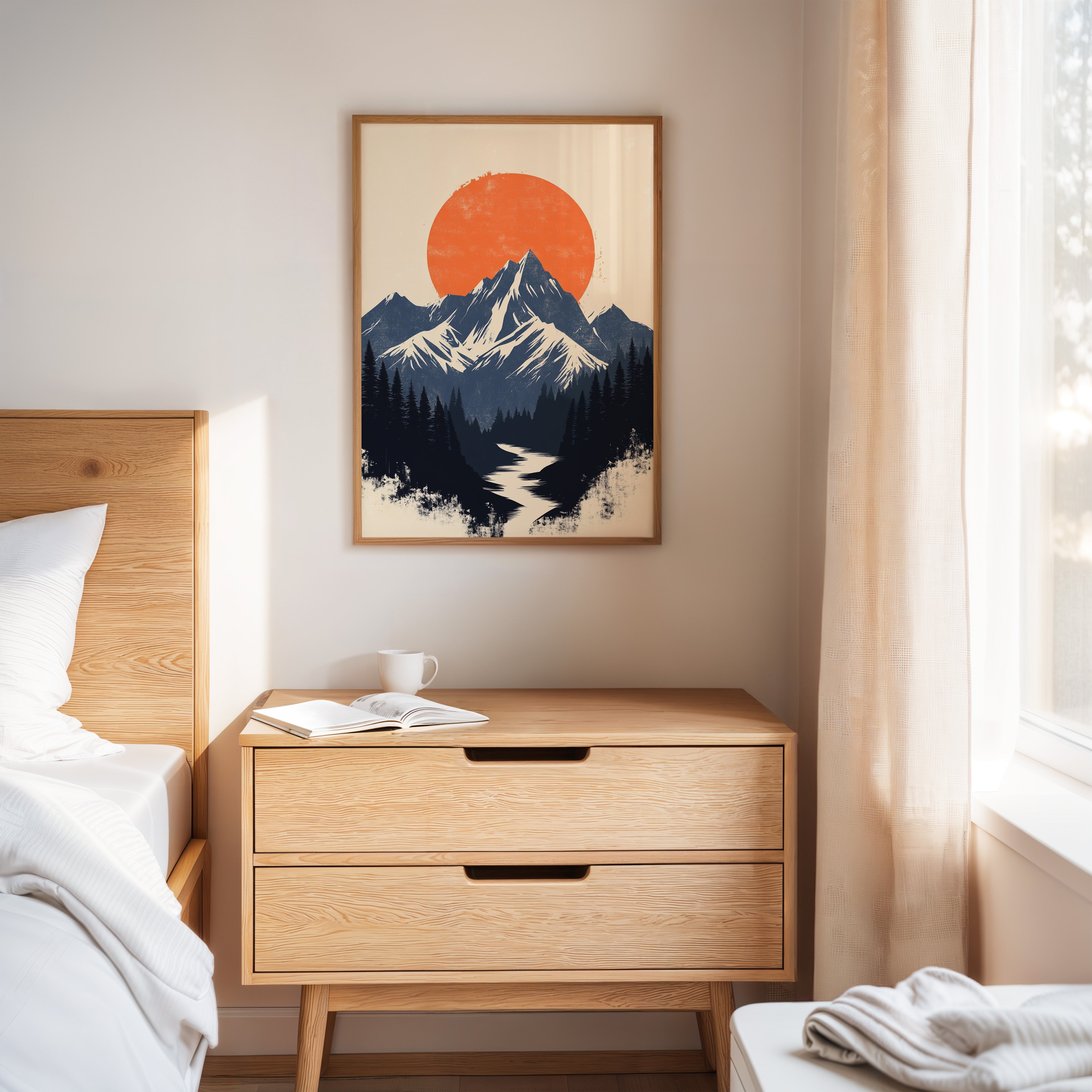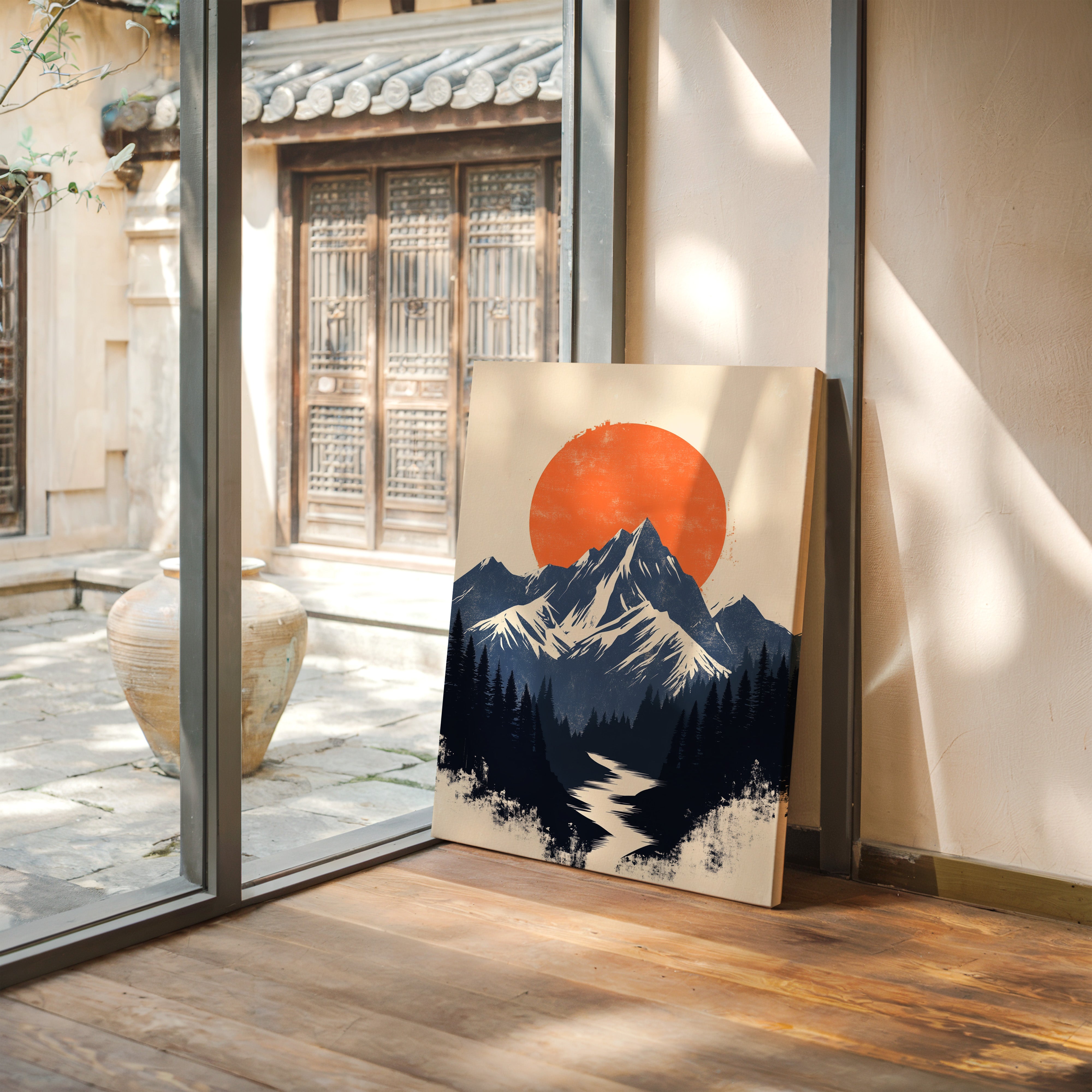 Immerse yourself in the serene beauty of 'Crimson Peaks Reverie,' where nature's grandeur meets minimalist elegance. This captivating artwork features a striking red sun setting behind majestic mountains, casting a warm glow upon the tranquil forest landscape. Perfect for those who appreciate the fusion of contemporary design and natural tranquility, this piece will transform your space into a sanctuary of calm and inspiration. Ideal for modern interiors, this artwork embodies the essence of Japandi style, harmonizing simplicity and sophistication in every brushstroke.