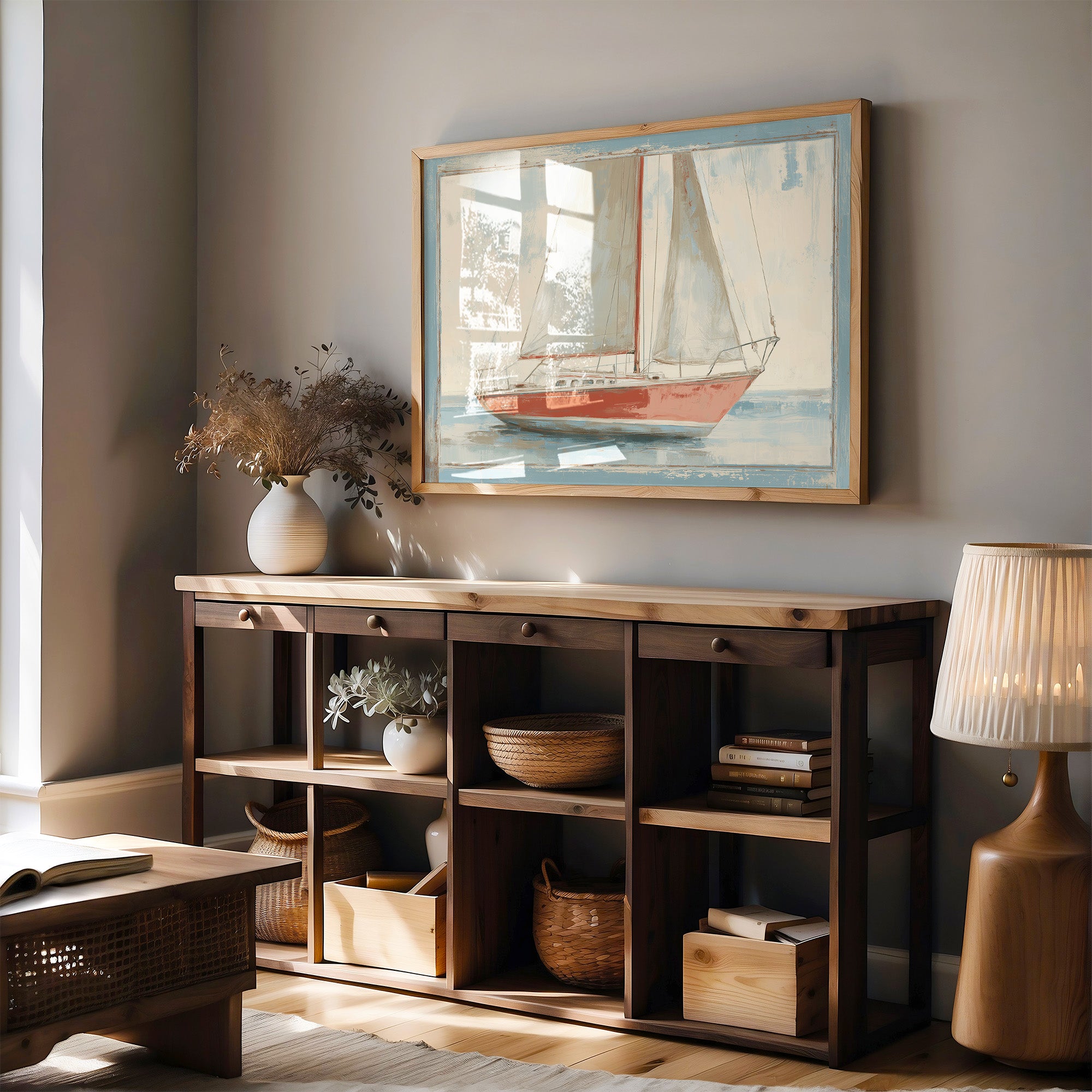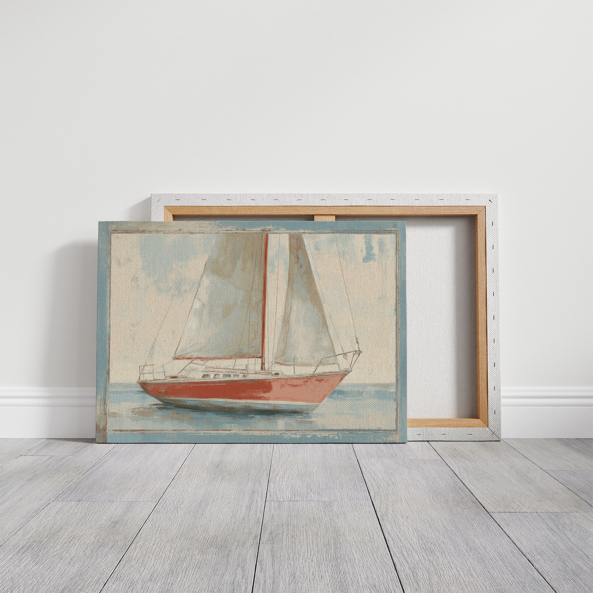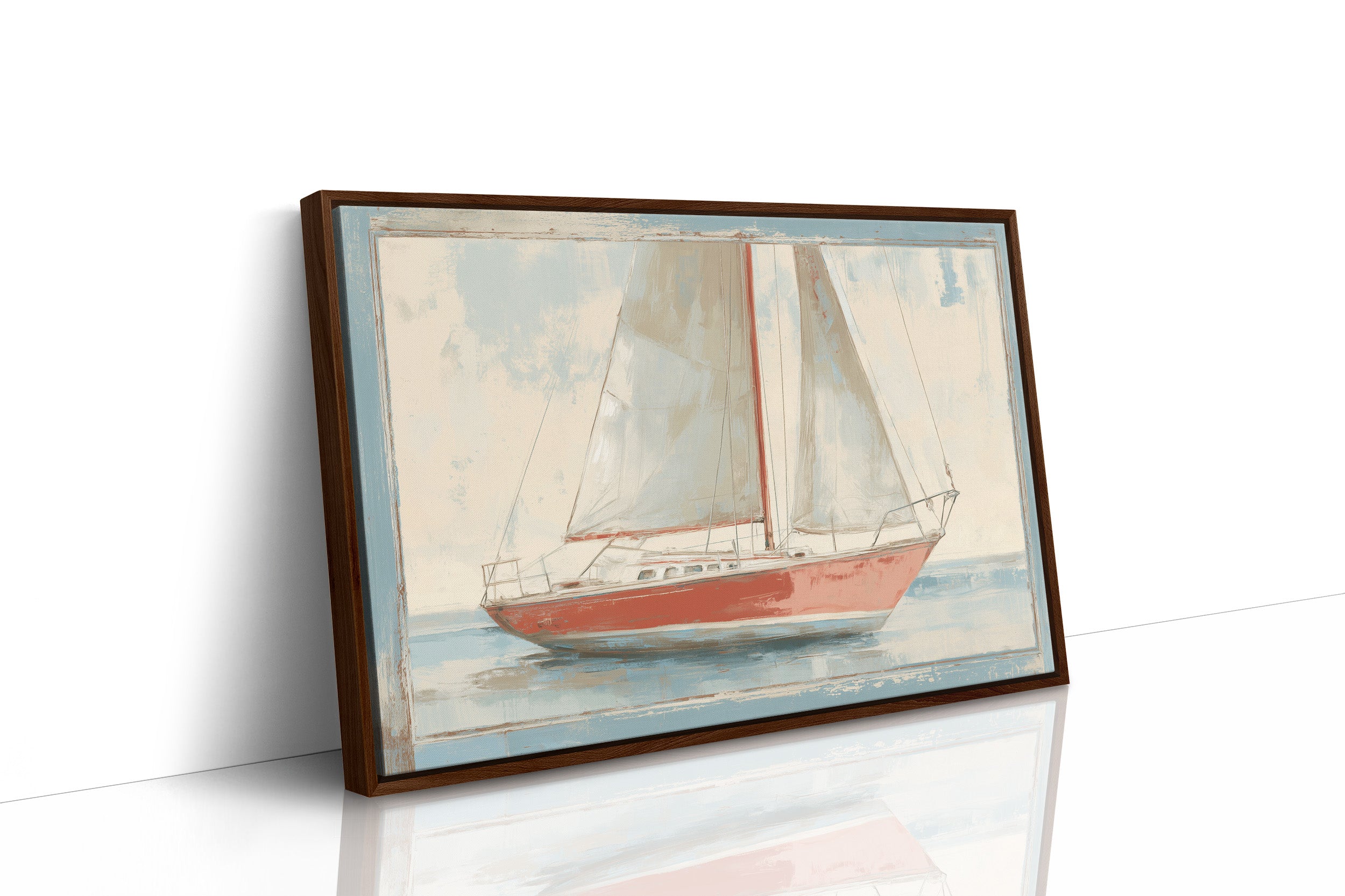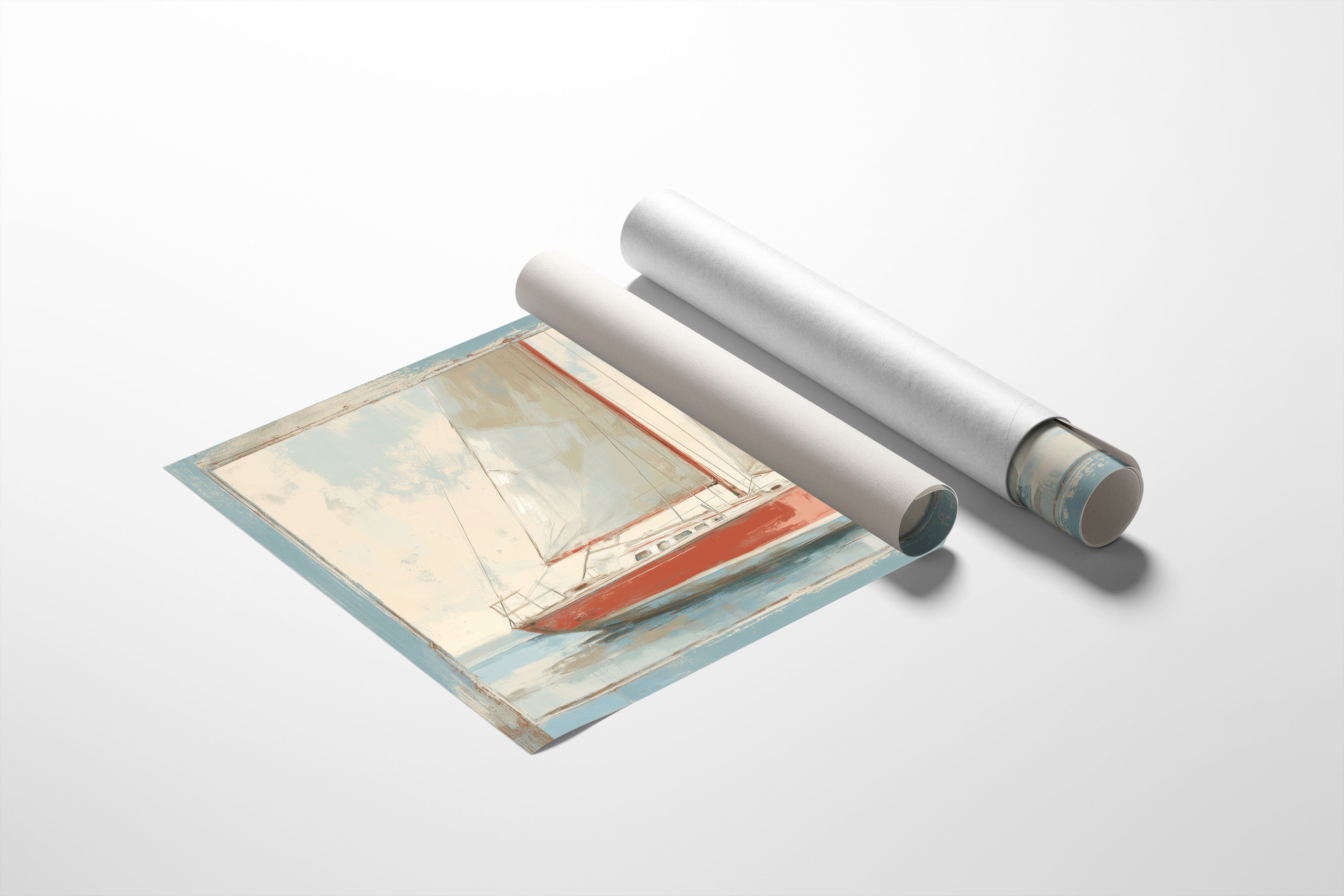 The soft haze of morning light bathes a crimson-hulled sailboat in gentle luminescence, its white sails catching an invisible breeze. Rendered in muted watercolors and thoughtful brushstrokes, the vessel seems suspended between reality and memorya dreamy nautical moment captured in soft blues, creams, and that striking red hull against a serene horizon. This coastal meditation brings a sense of peaceful adventure to any space, inviting quiet contemplation of journeys taken and those yet to come.