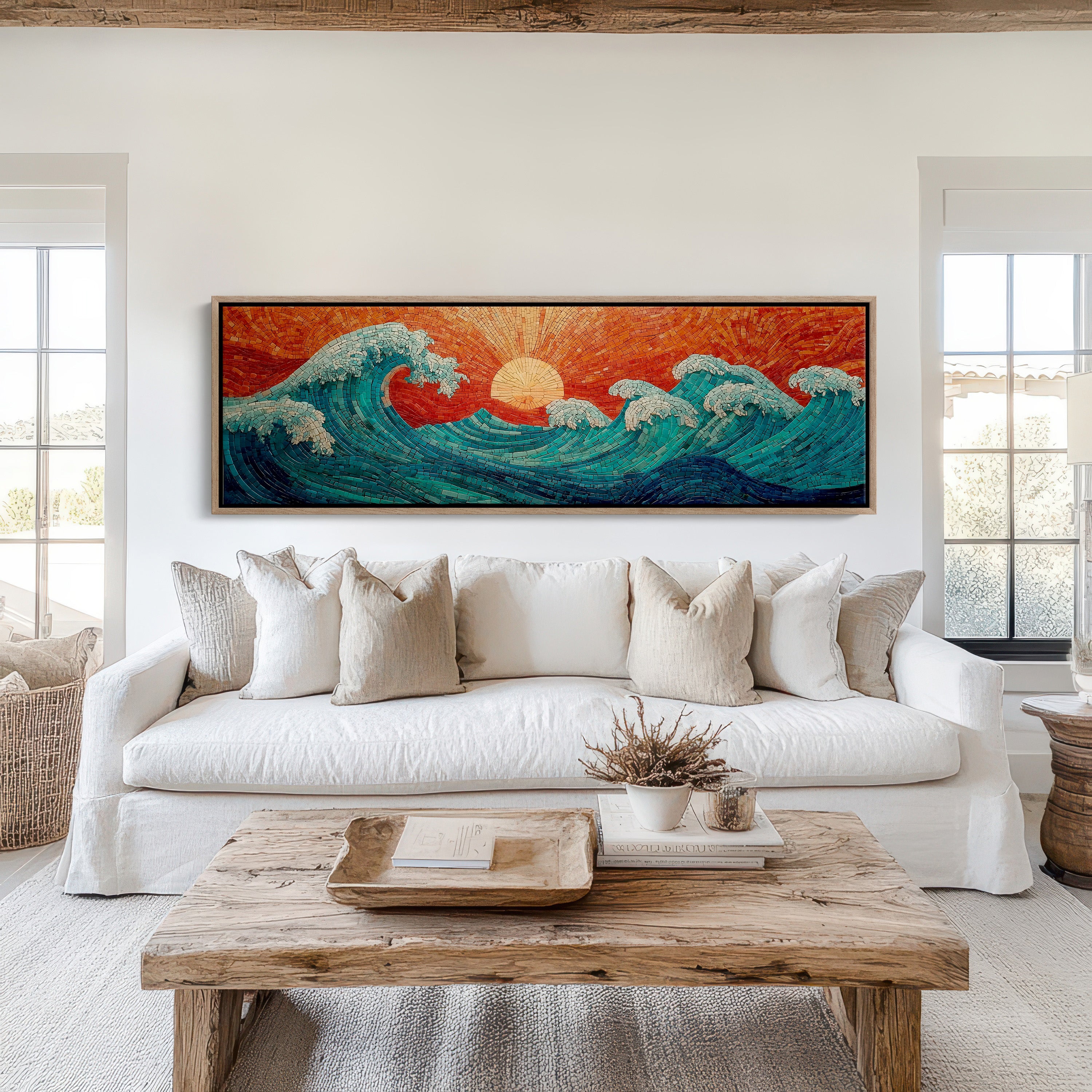 Curving mosaic waves rise in rich teal and deep turquoise beneath a radiant crimson sky, where a glowing sun anchors the horizon in warm golden light. Intricate tile textures create movement and depth, blending coastal energy with bold, artistic craftsmanship. Perfect for beach homes, eclectic living rooms, or statement walls craving color, this artwork brings vibrant ocean rhythm and Mediterranean charm into your space.