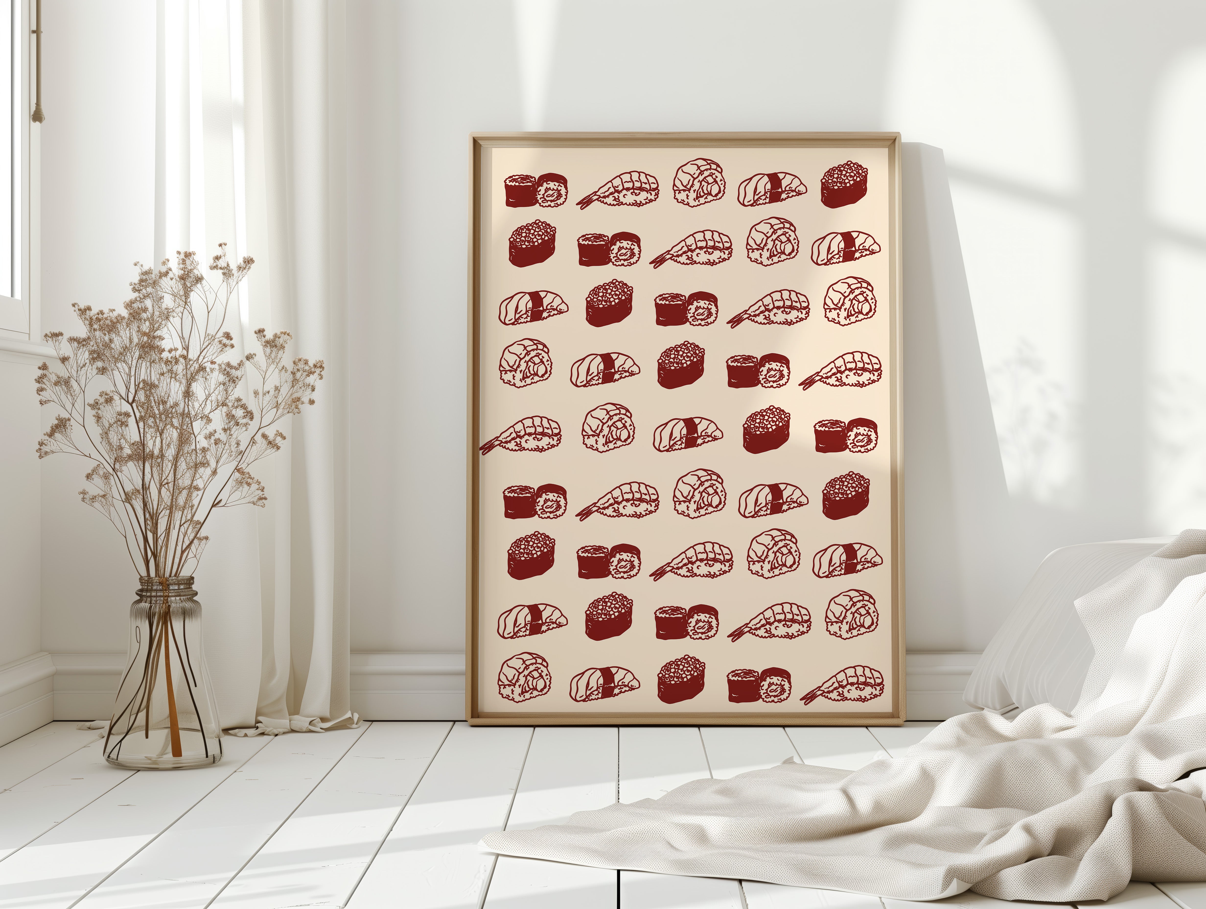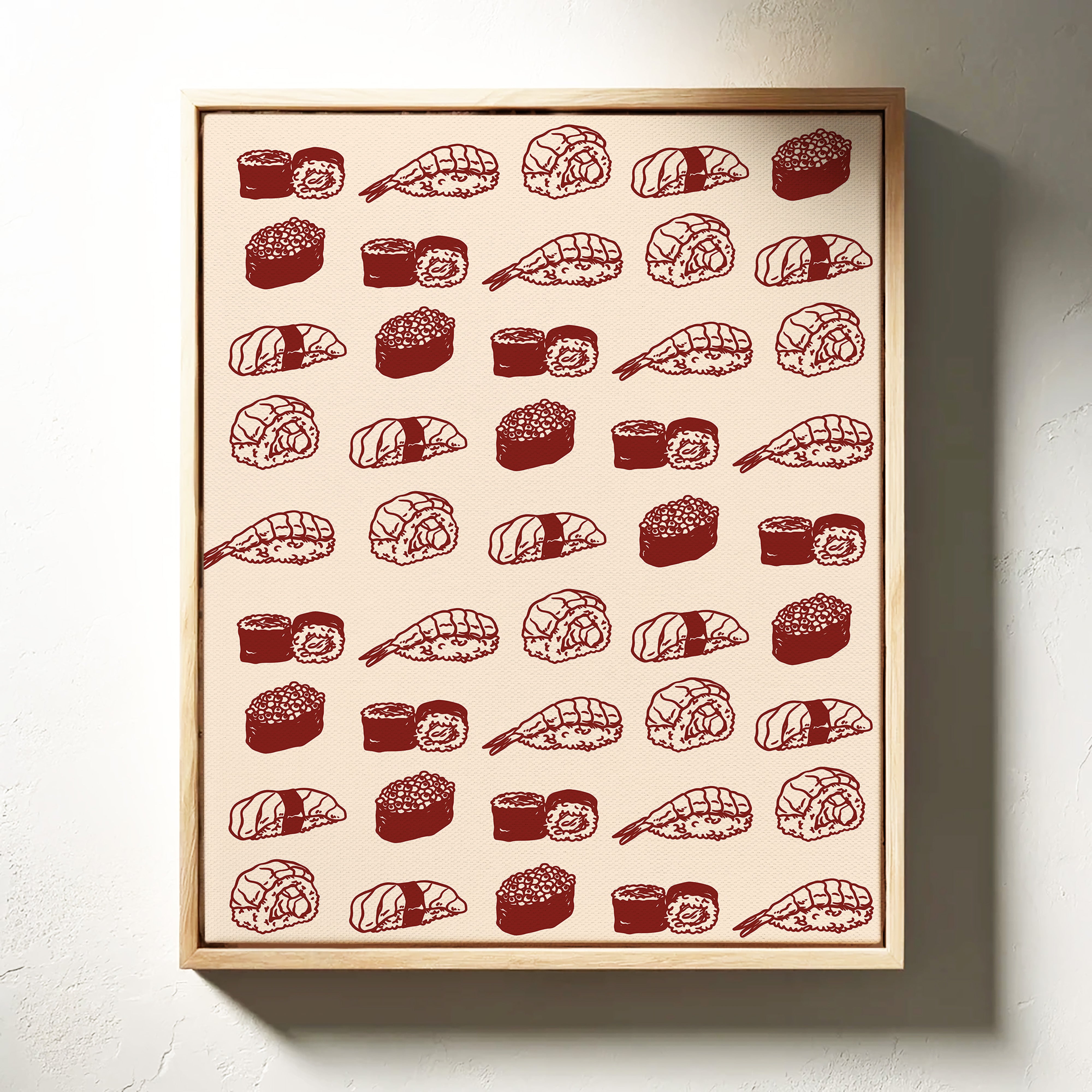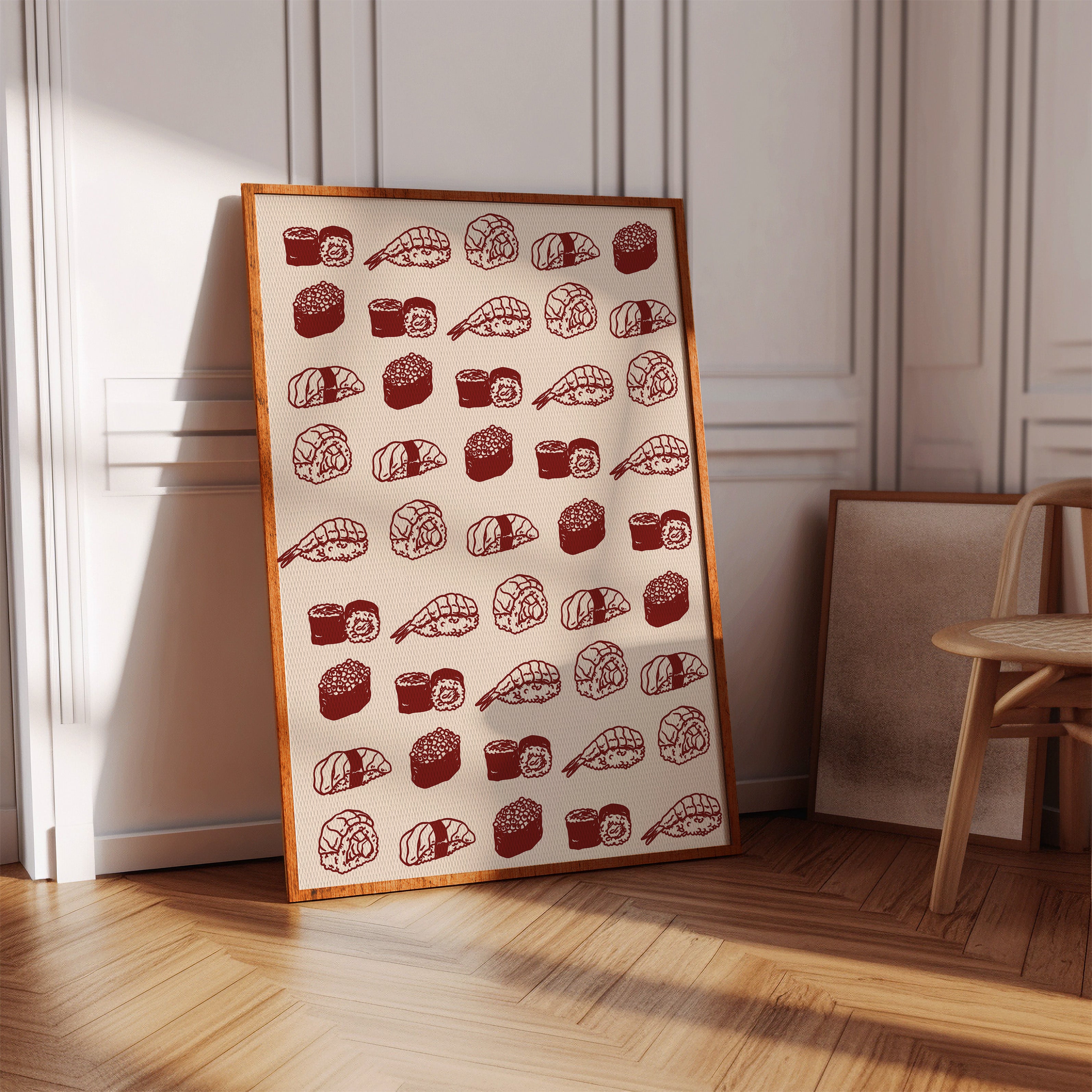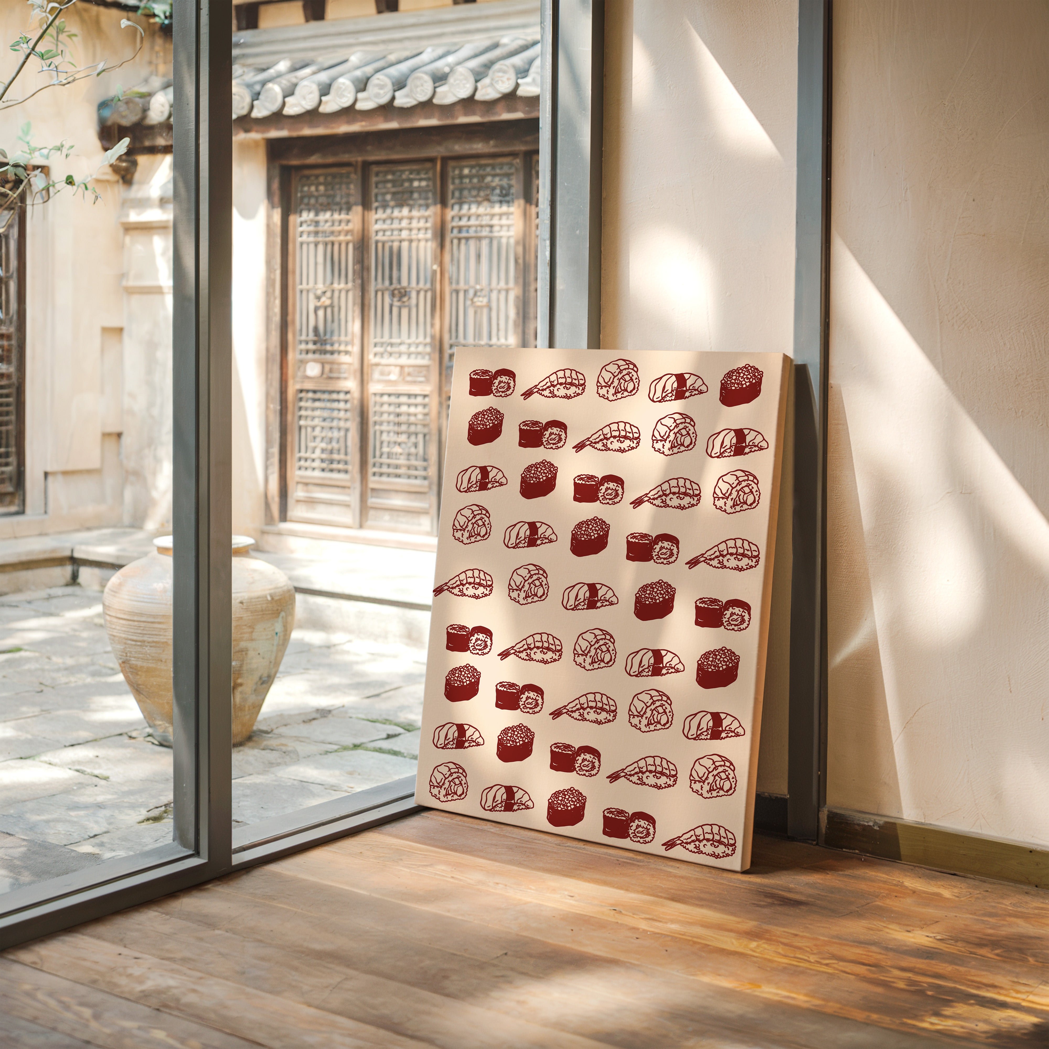 Delicate brushstrokes capture the artful rhythm of sushi pieces, arranged in a mesmerizing pattern against a soft cream backdrop. This contemporary culinary illustration brings Japanese minimalism to modern spaces. Each piece tells its own story - from plump nigiri to perfectly rolled maki - creating a sophisticated dance of burgundy shapes that celebrates the artistry of Japanese cuisine. Perfect for adding a refined touch to dining rooms, modern kitchens, or restaurant spaces where food meets art. The piece invites quiet contemplation while making a bold statement about the beauty found in everyday culinary traditions.