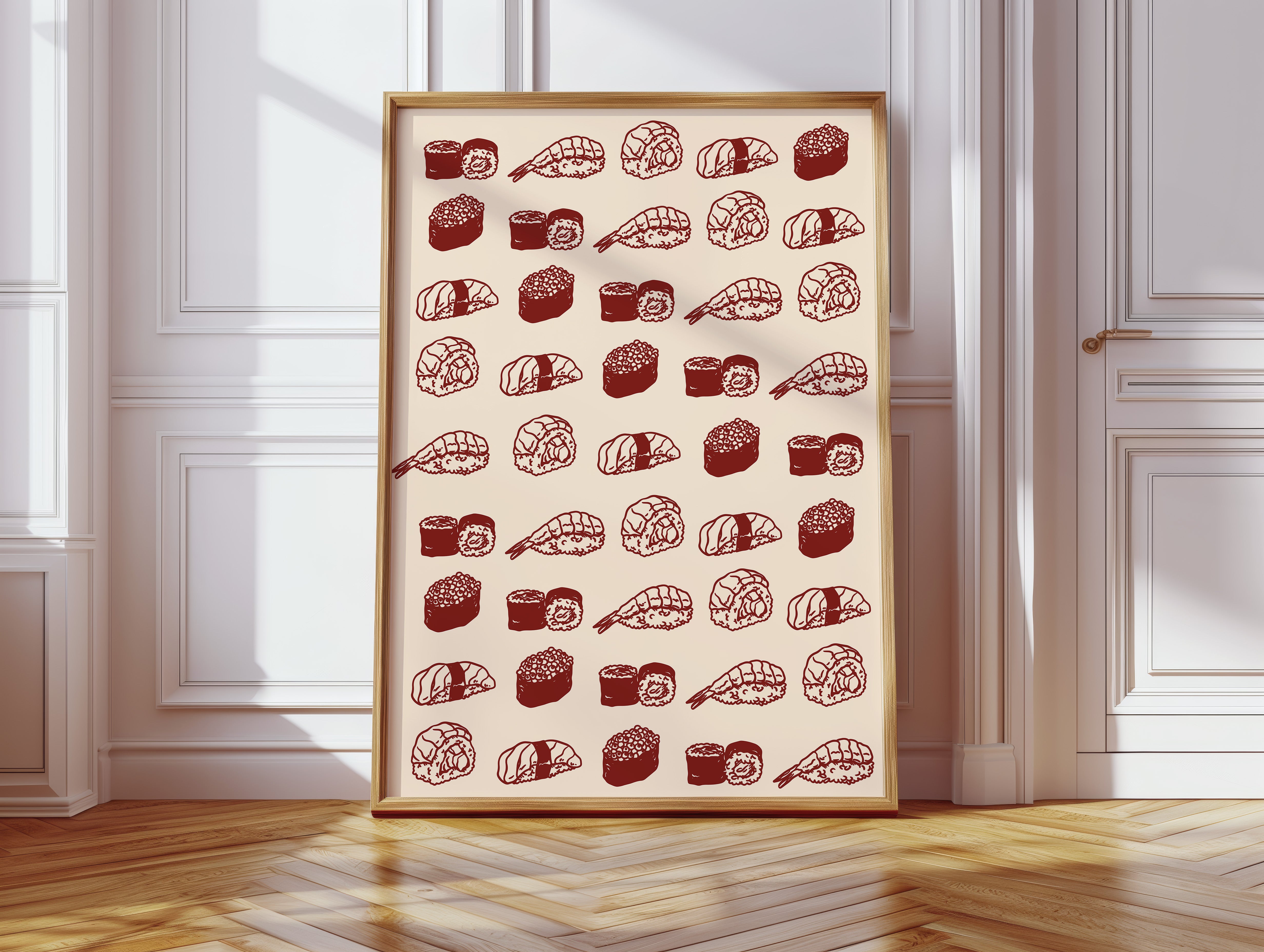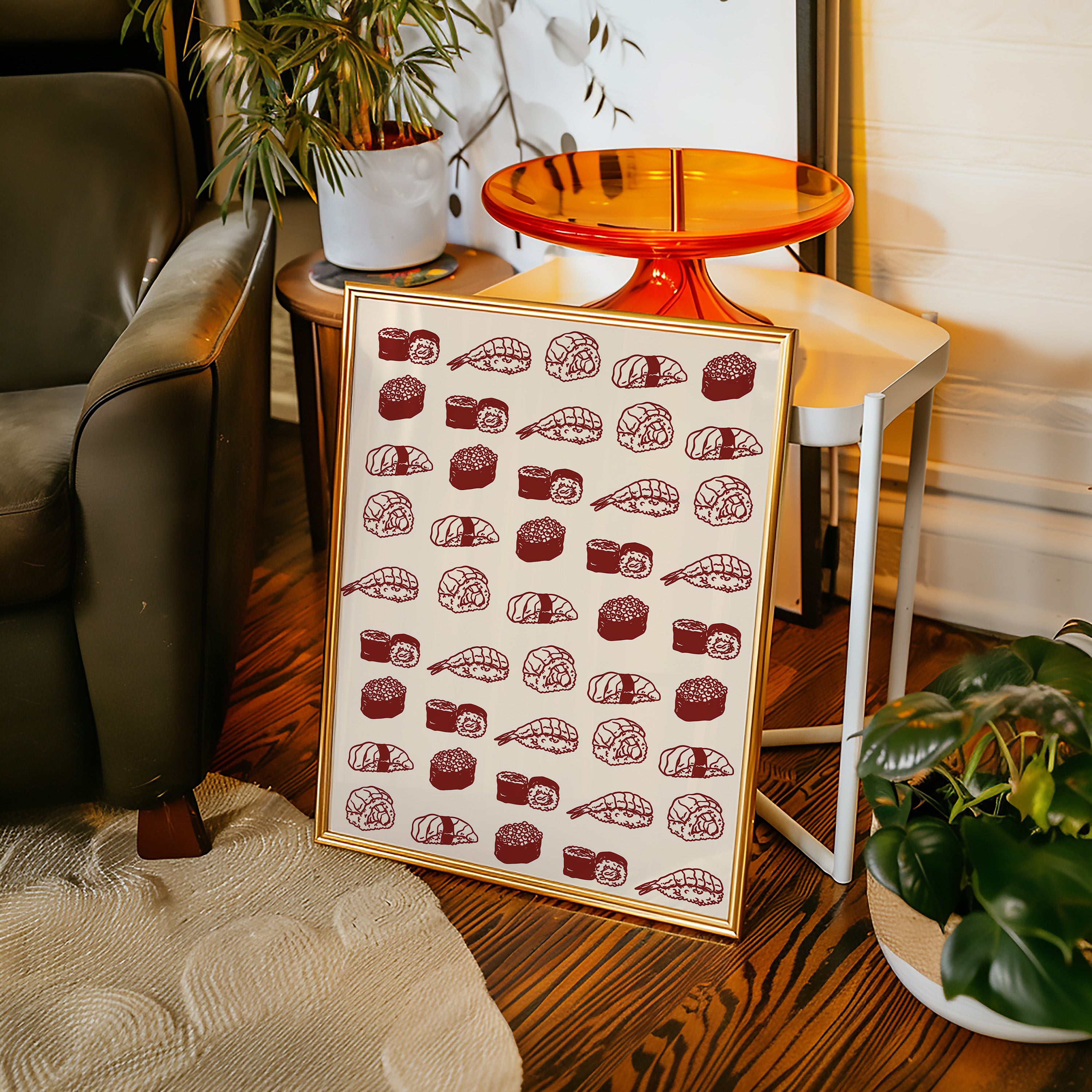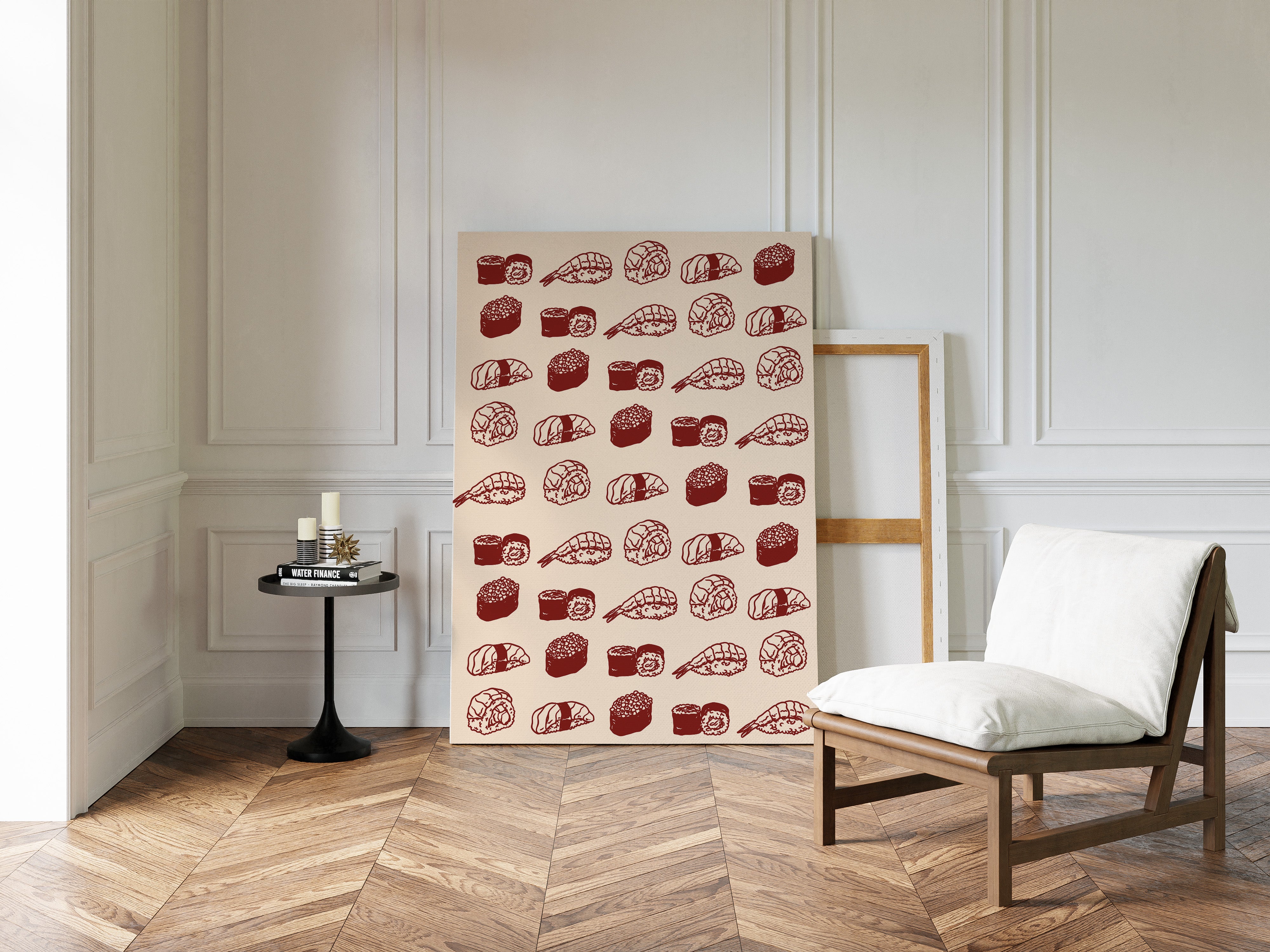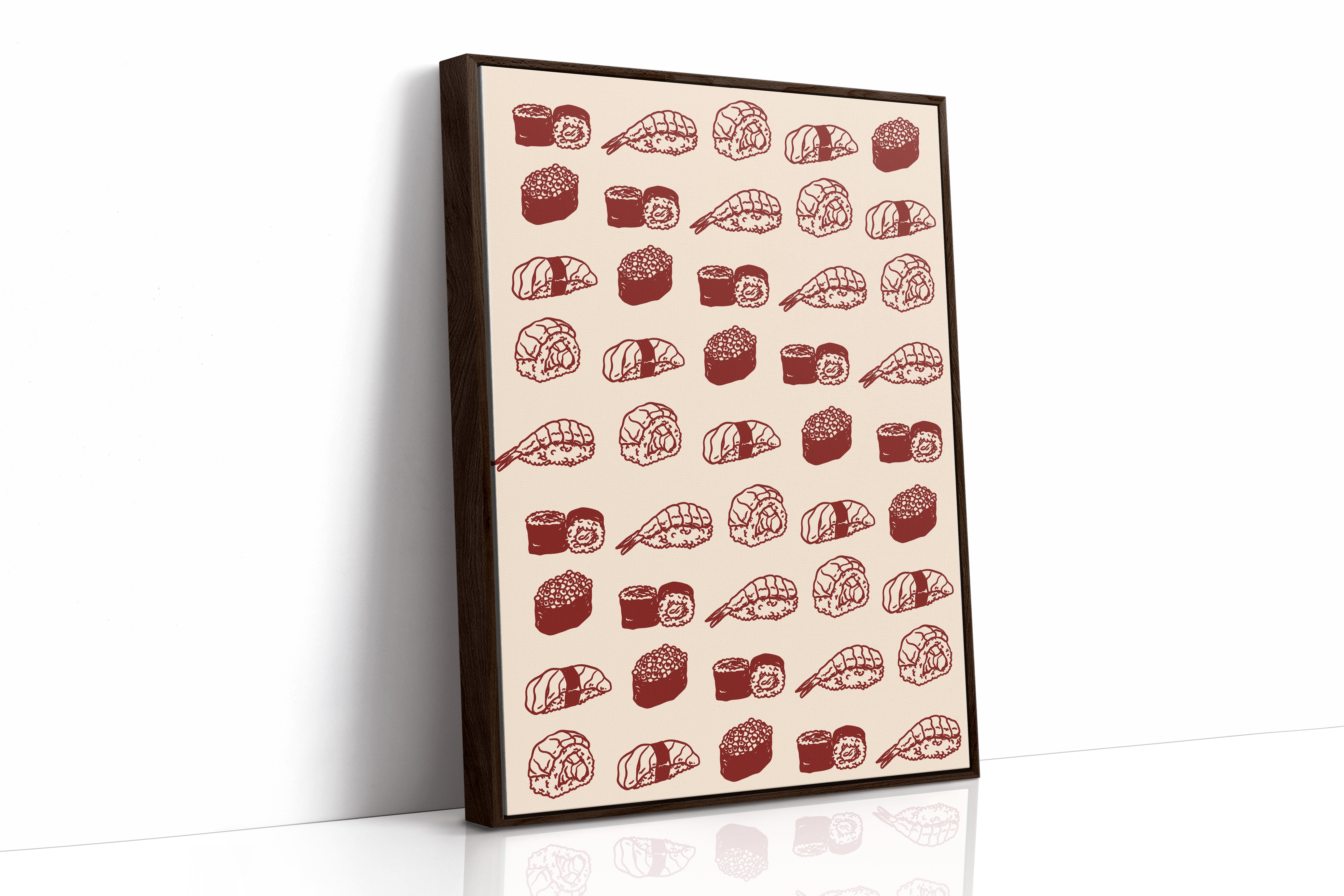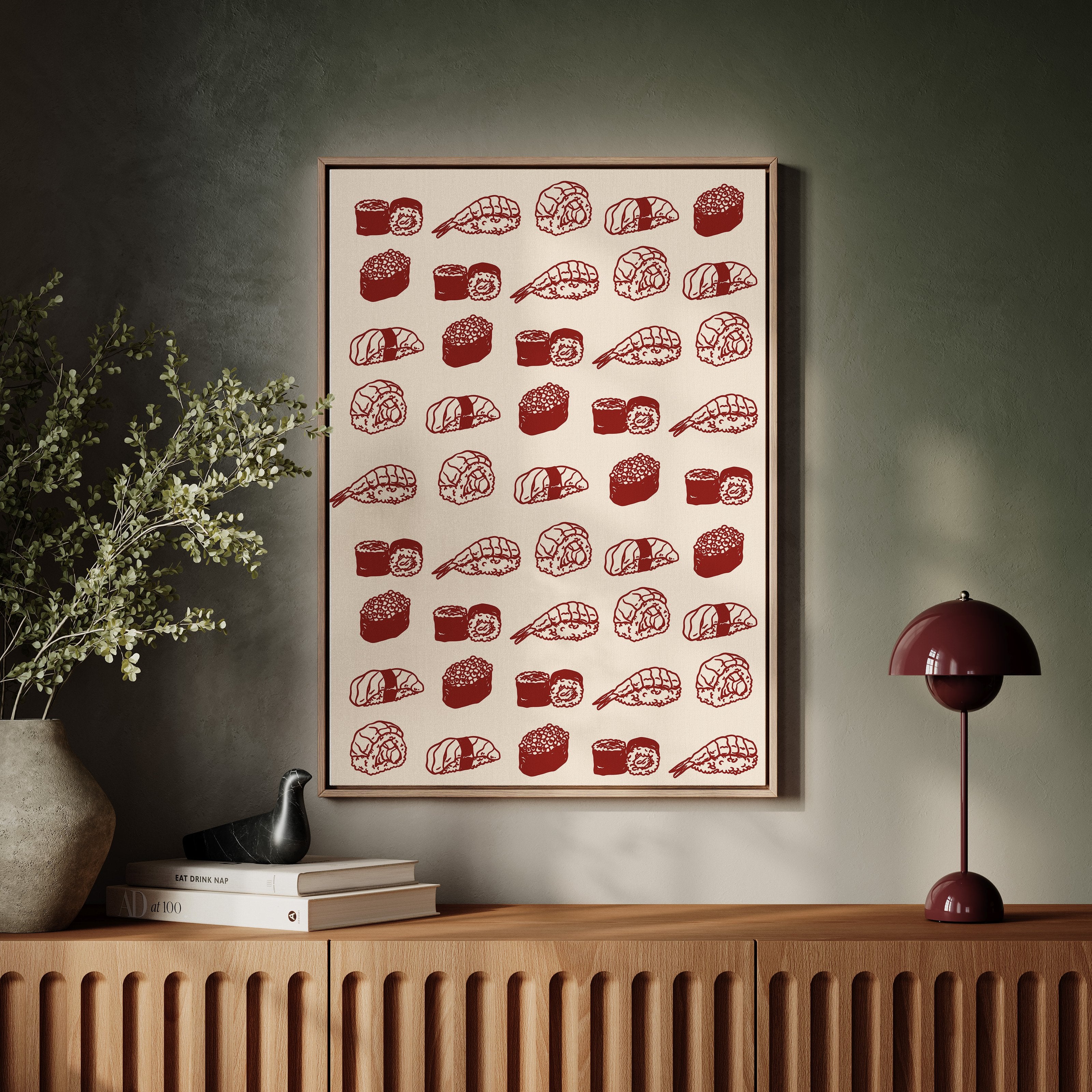 Delicate brushstrokes capture the artful rhythm of sushi pieces, arranged in a mesmerizing pattern against a soft cream backdrop. This contemporary culinary illustration brings Japanese minimalism to modern spaces. Each piece tells its own story - from plump nigiri to perfectly rolled maki - creating a sophisticated dance of burgundy shapes that celebrates the artistry of Japanese cuisine. Perfect for adding a refined touch to dining rooms, modern kitchens, or restaurant spaces where food meets art. The piece invites quiet contemplation while making a bold statement about the beauty found in everyday culinary traditions.