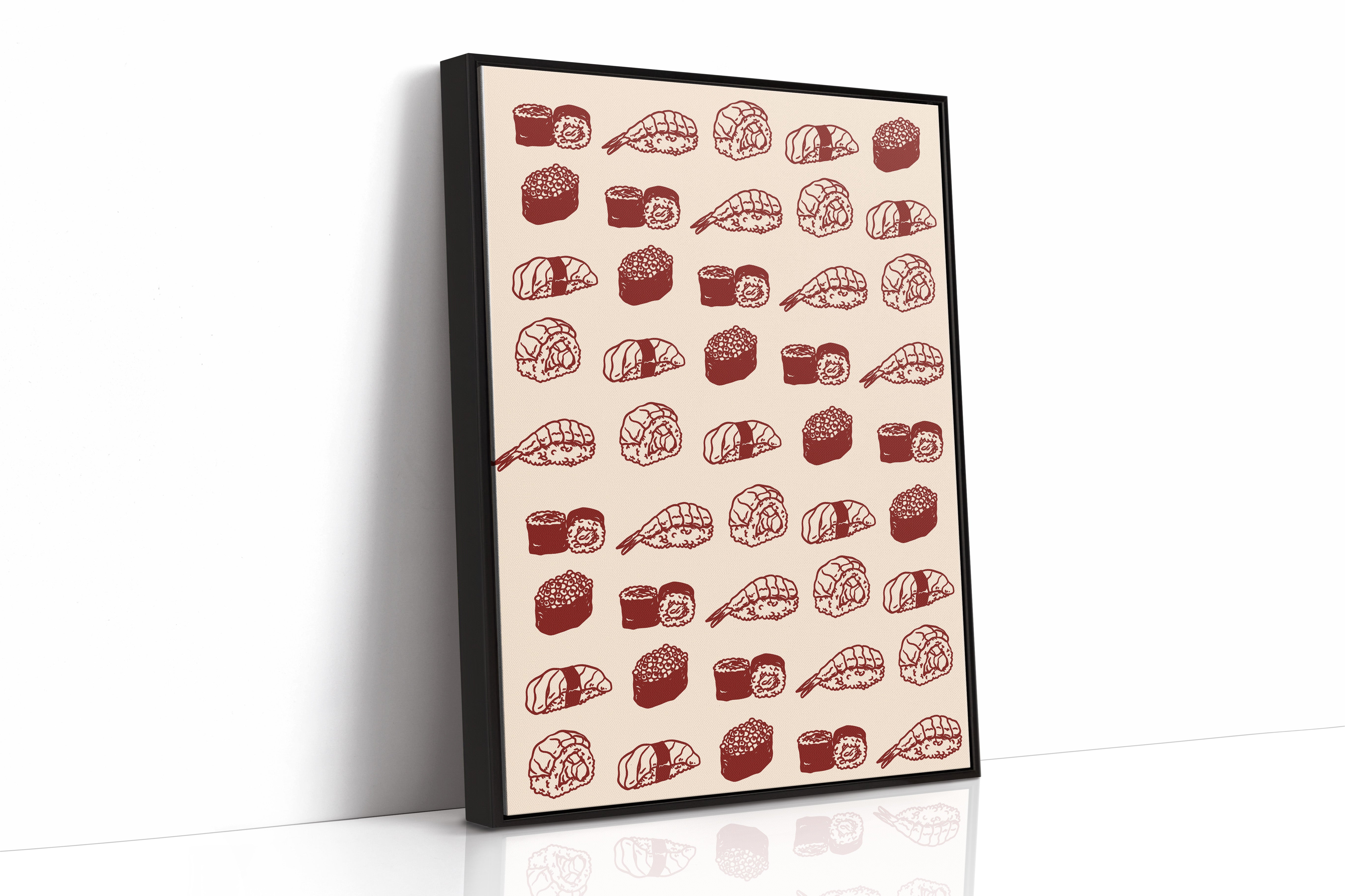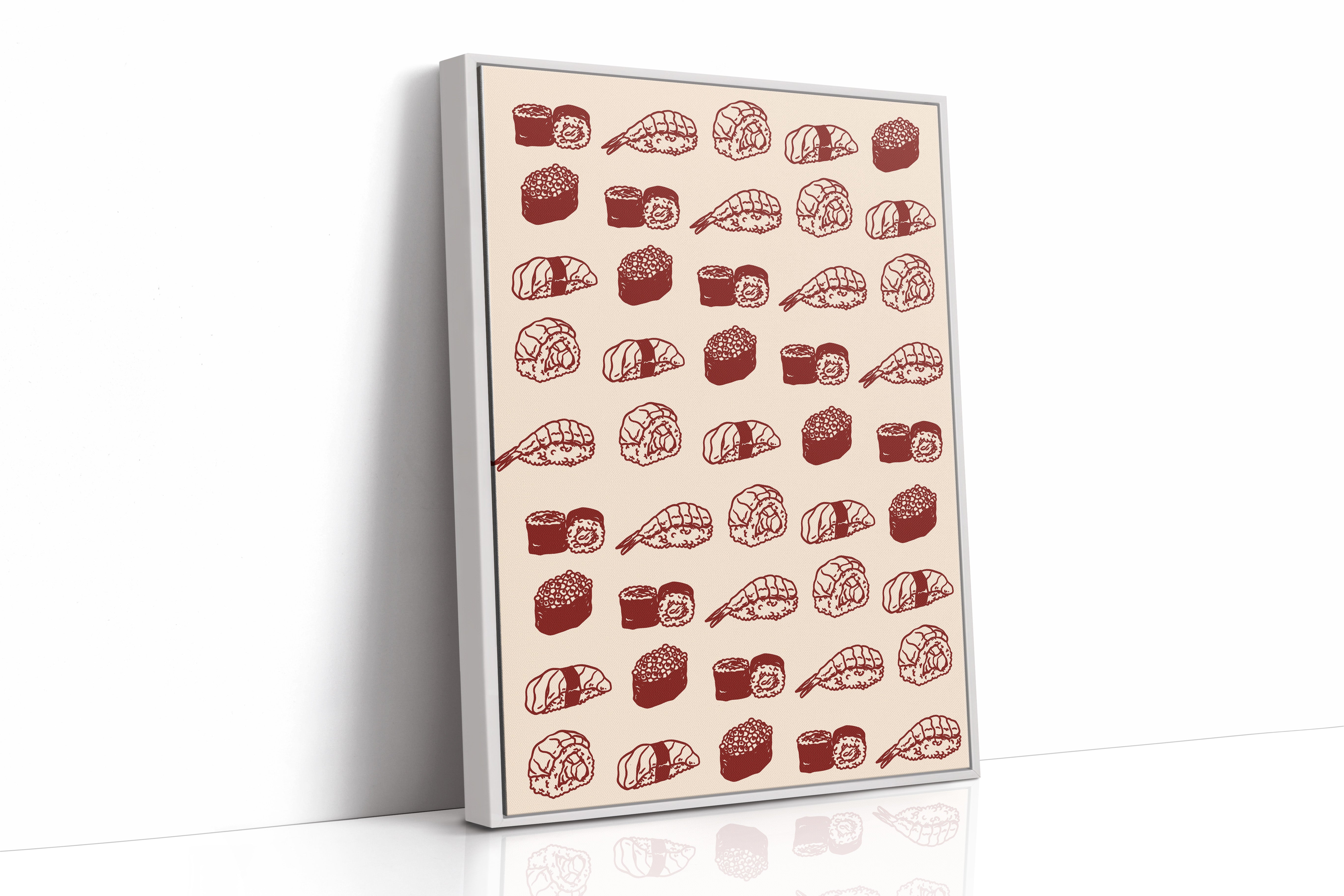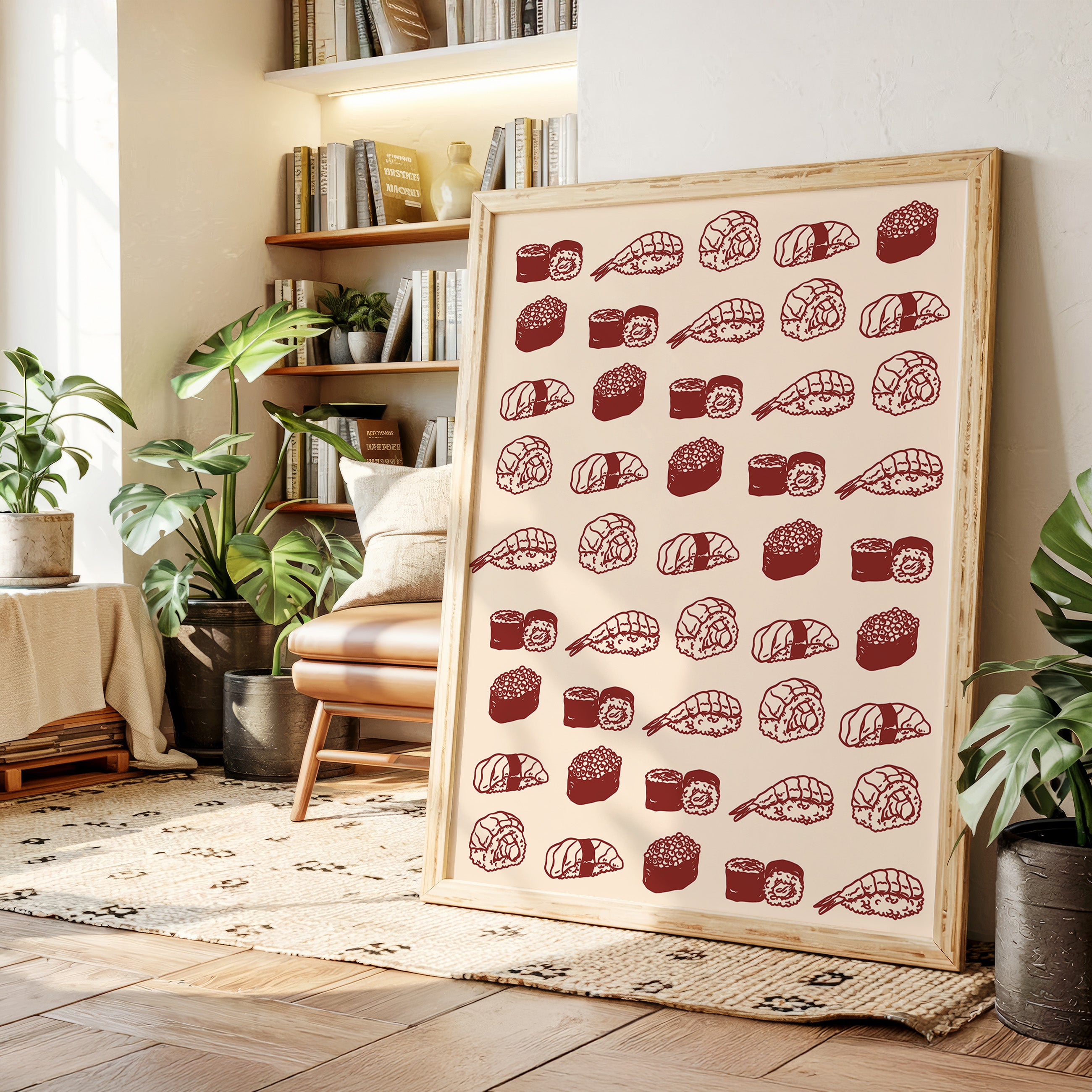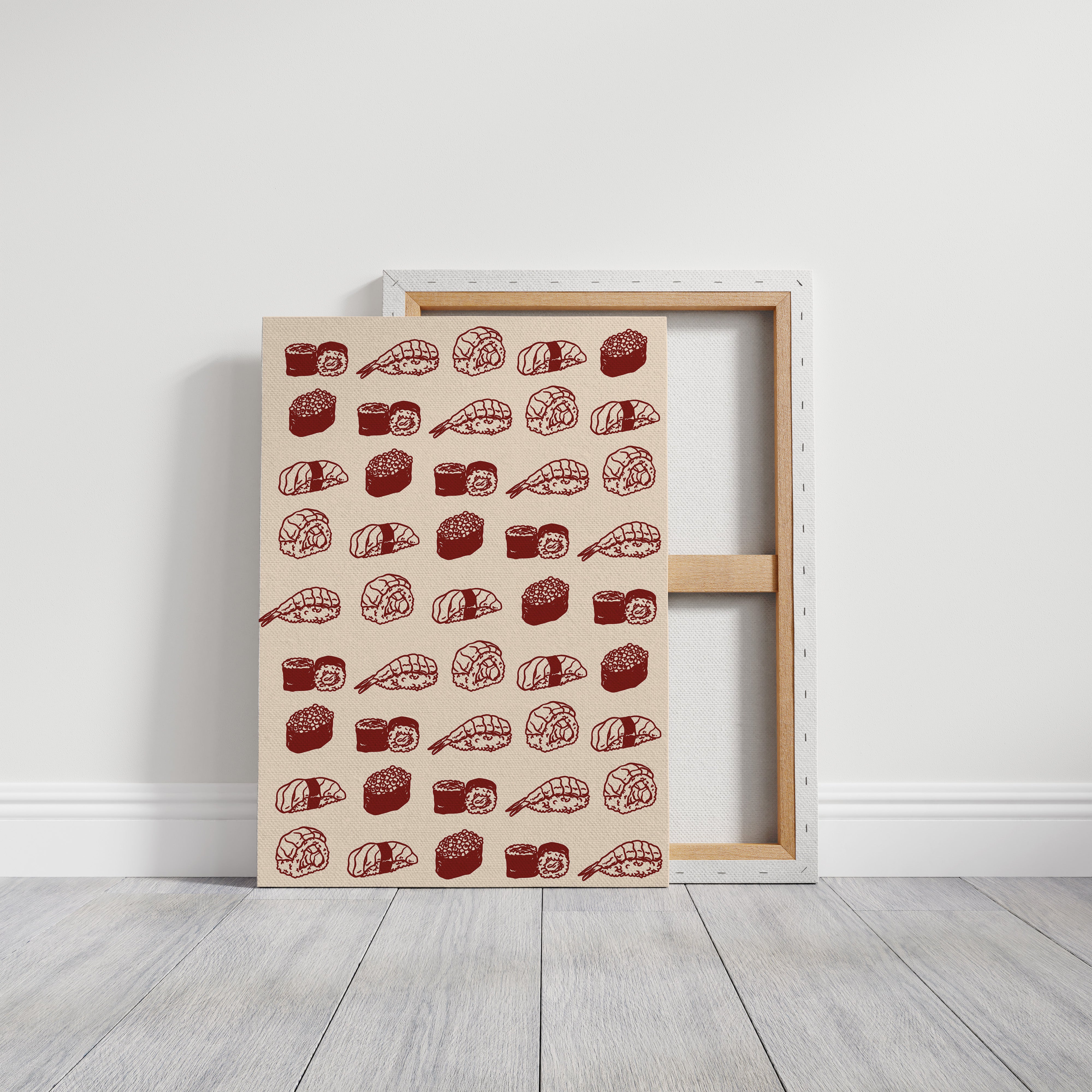 Delicate brushstrokes capture the artful rhythm of sushi pieces, arranged in a mesmerizing pattern against a soft cream backdrop. This contemporary culinary illustration brings Japanese minimalism to modern spaces. Each piece tells its own story - from plump nigiri to perfectly rolled maki - creating a sophisticated dance of burgundy shapes that celebrates the artistry of Japanese cuisine. Perfect for adding a refined touch to dining rooms, modern kitchens, or restaurant spaces where food meets art. The piece invites quiet contemplation while making a bold statement about the beauty found in everyday culinary traditions.