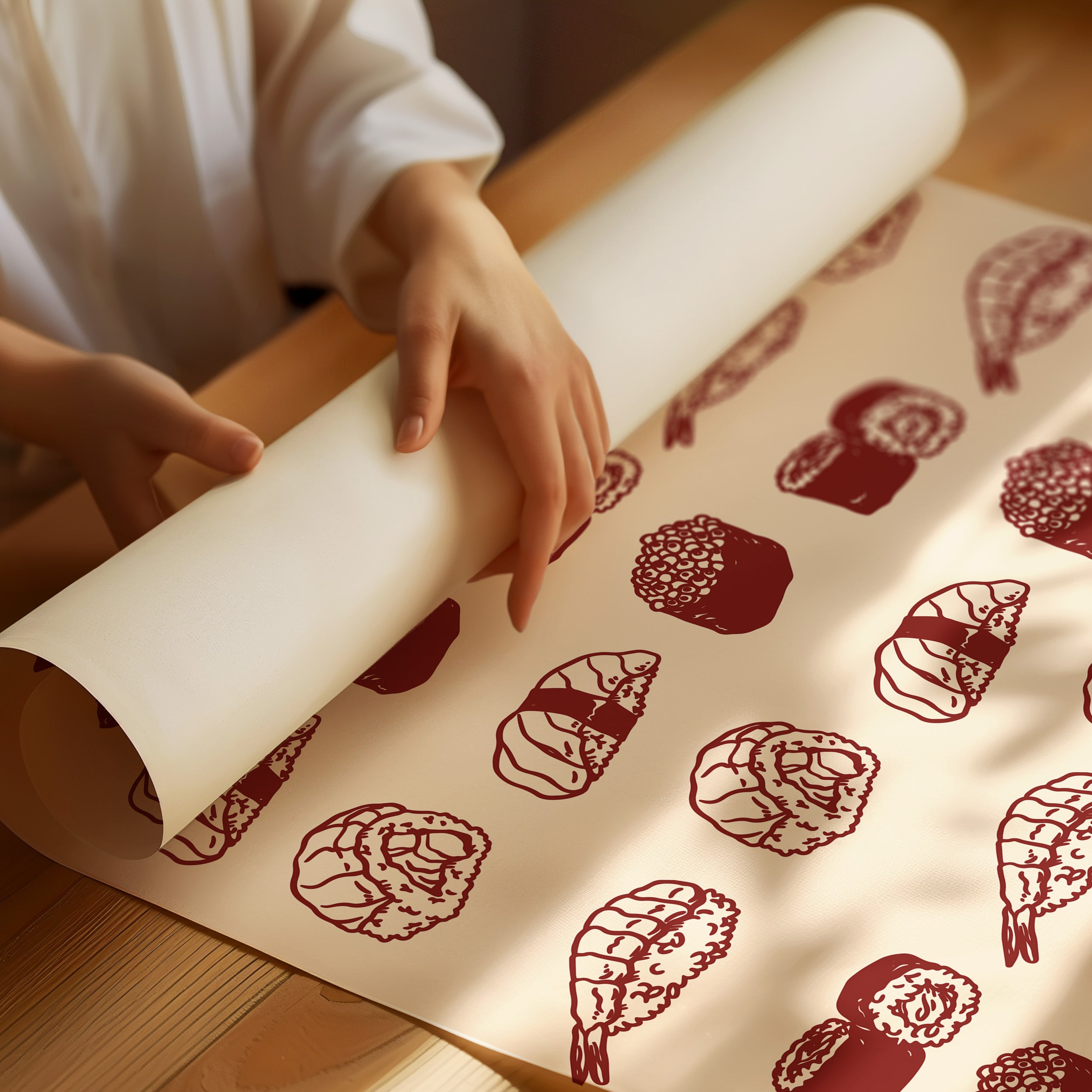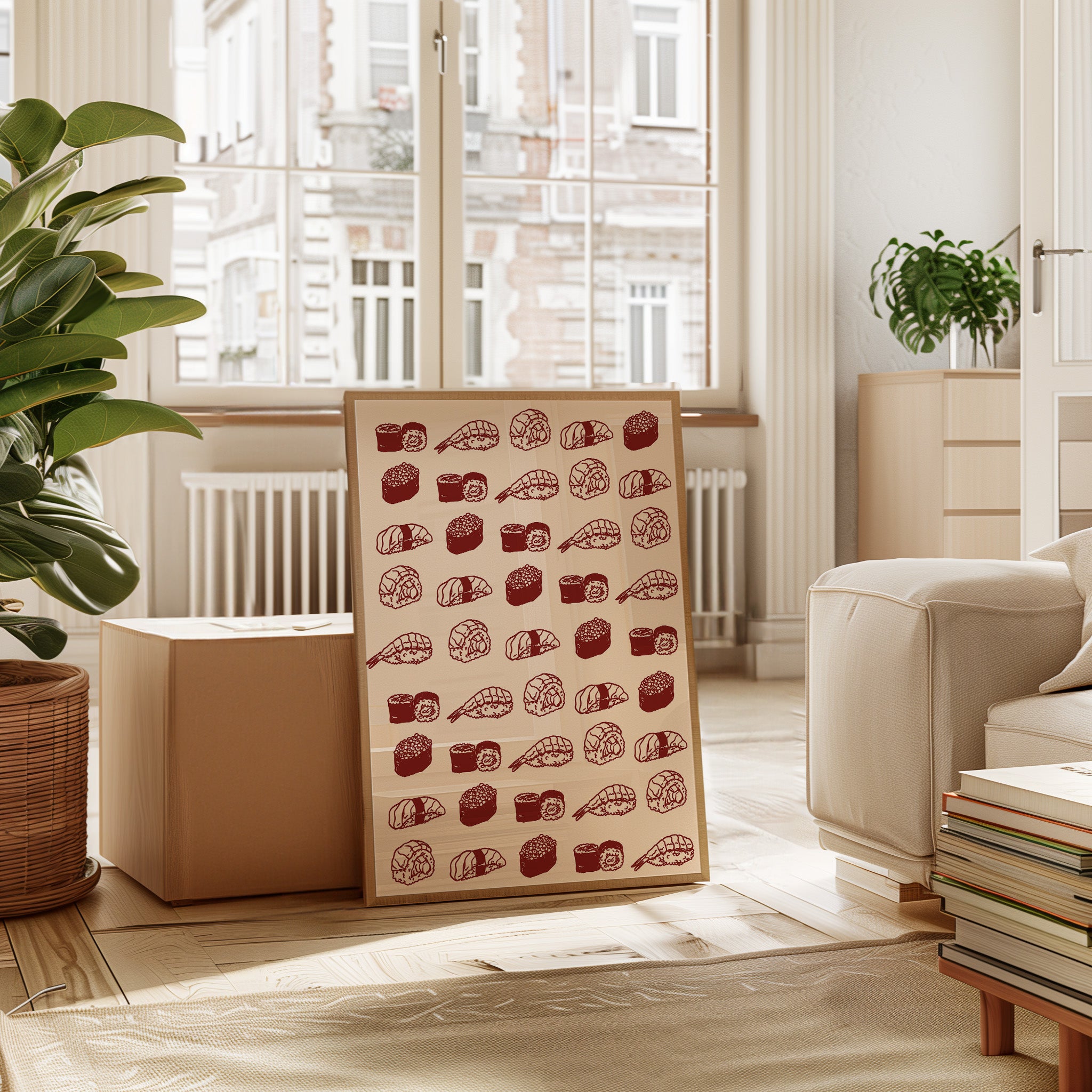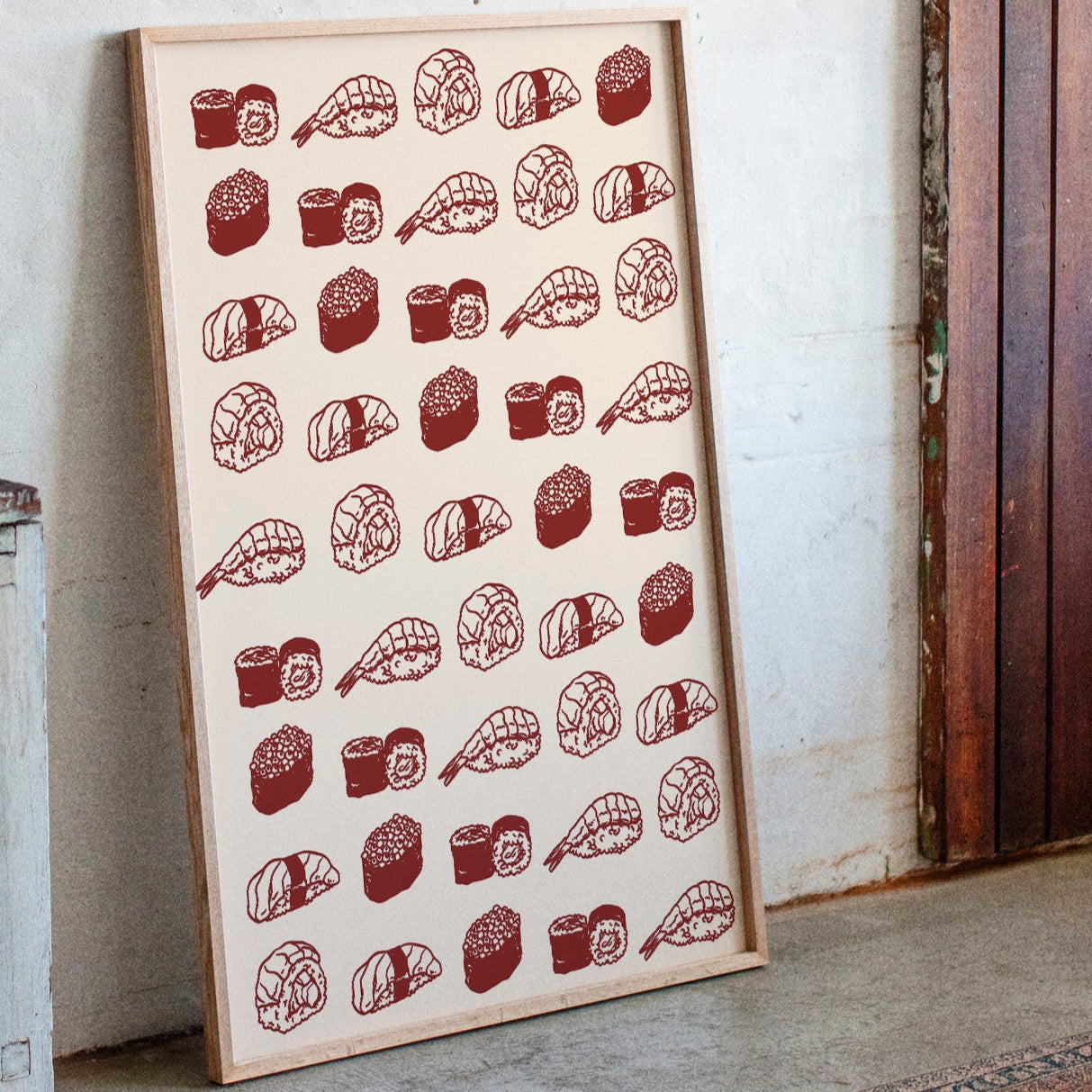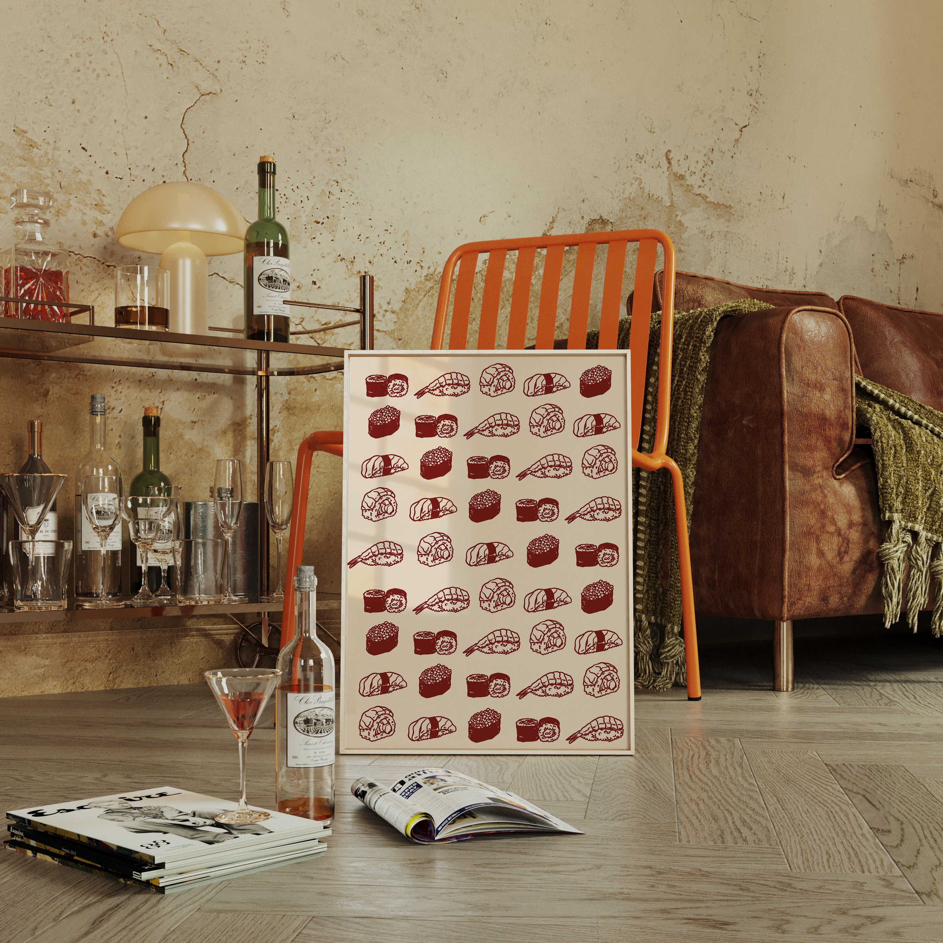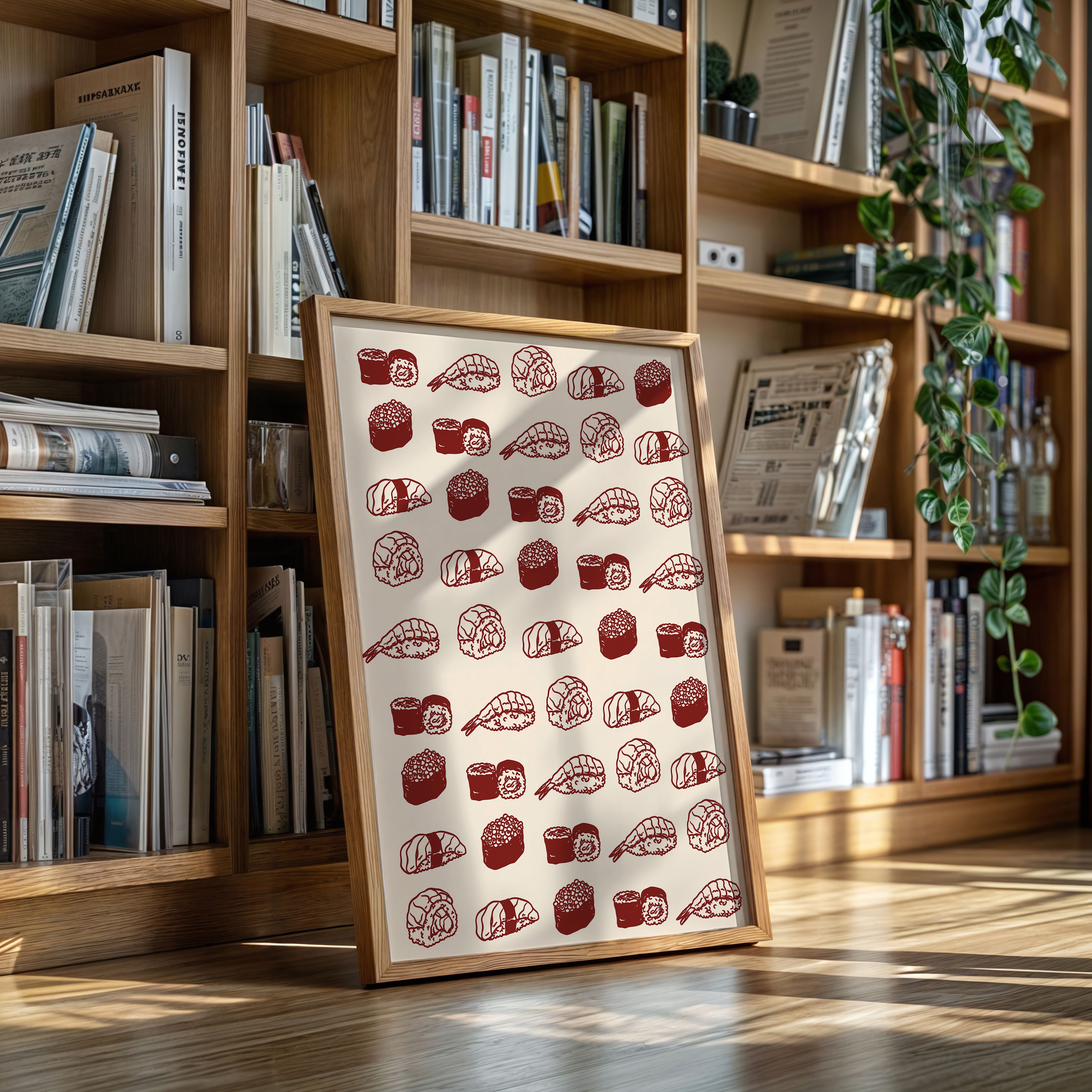 Delicate brushstrokes capture the artful rhythm of sushi pieces, arranged in a mesmerizing pattern against a soft cream backdrop. This contemporary culinary illustration brings Japanese minimalism to modern spaces. Each piece tells its own story - from plump nigiri to perfectly rolled maki - creating a sophisticated dance of burgundy shapes that celebrates the artistry of Japanese cuisine. Perfect for adding a refined touch to dining rooms, modern kitchens, or restaurant spaces where food meets art. The piece invites quiet contemplation while making a bold statement about the beauty found in everyday culinary traditions.