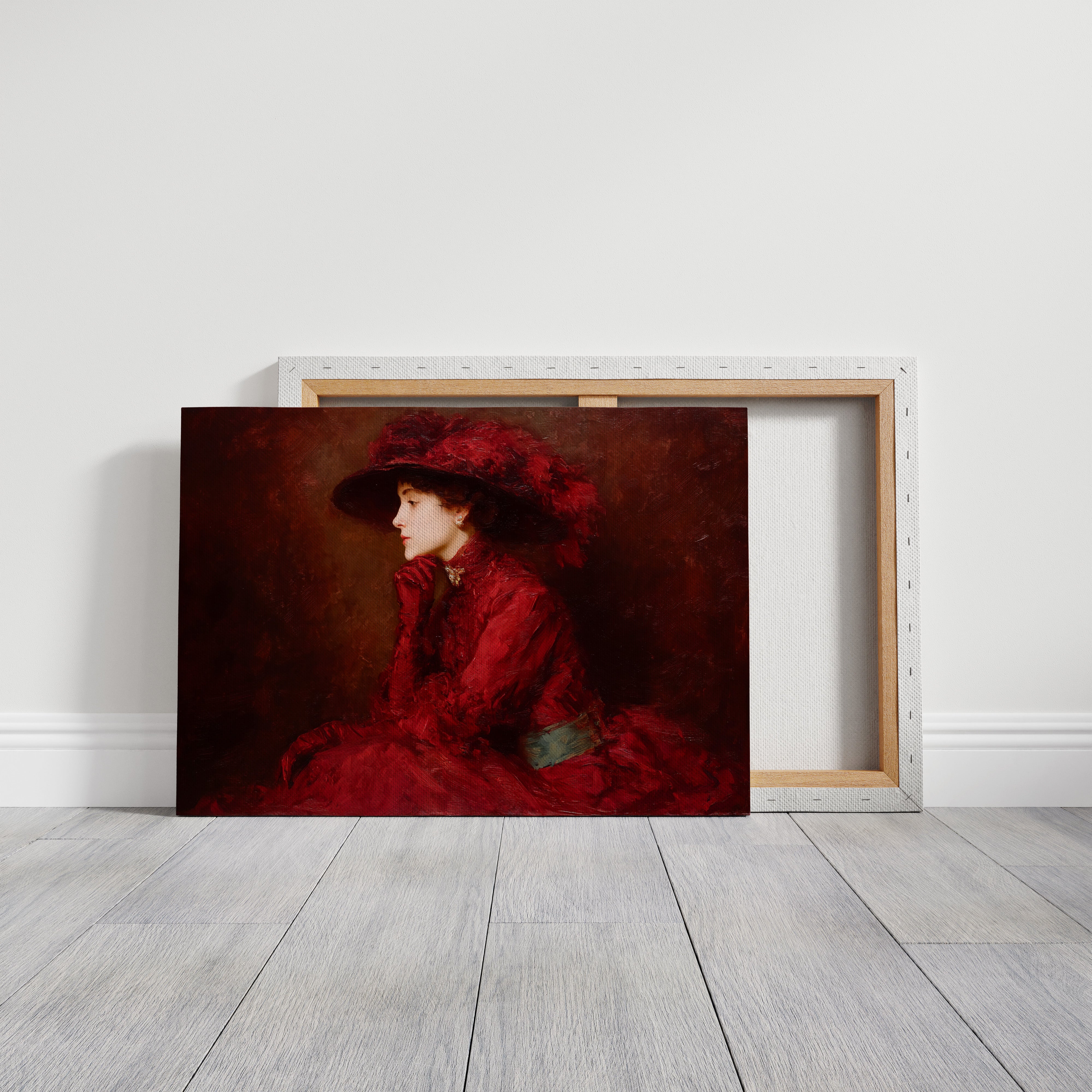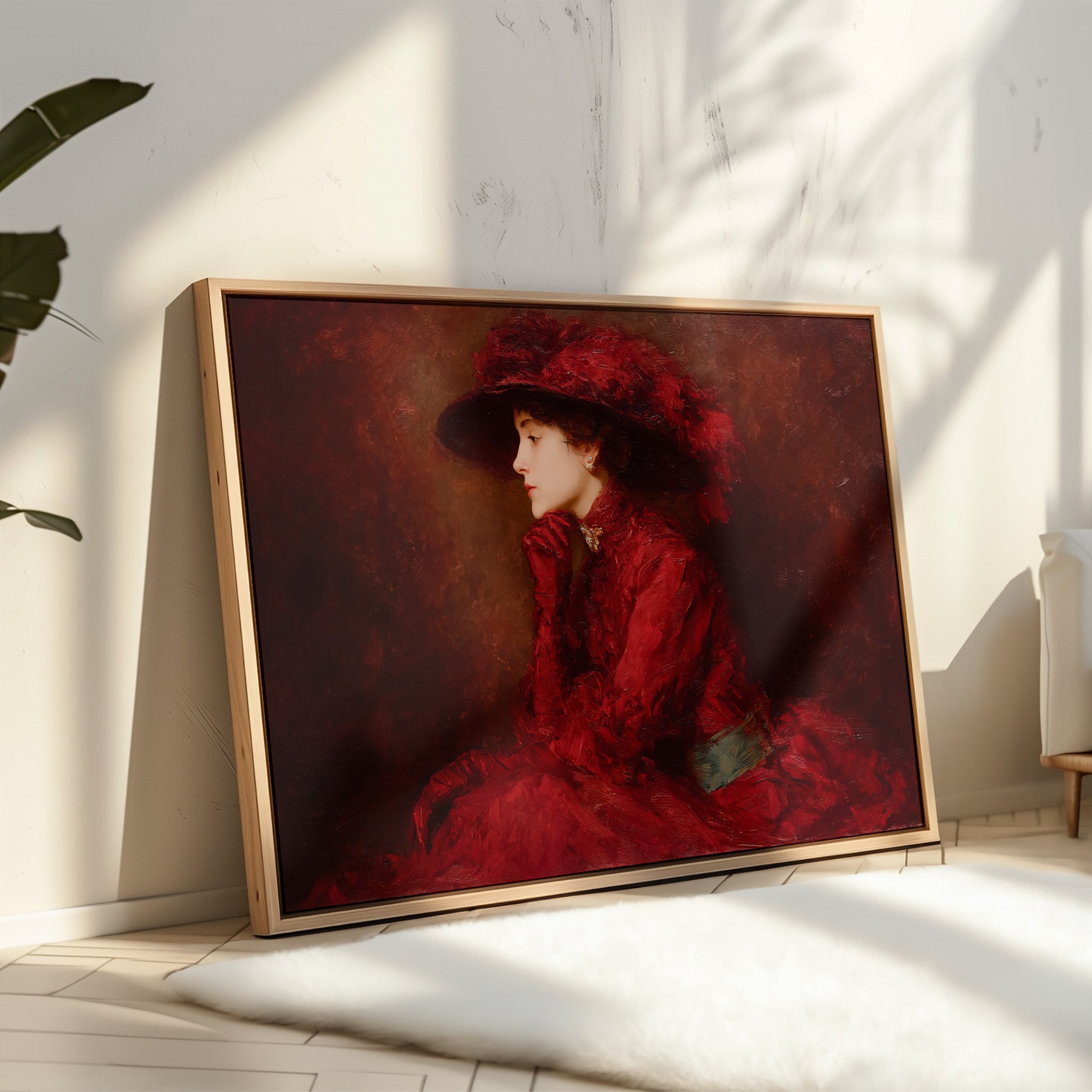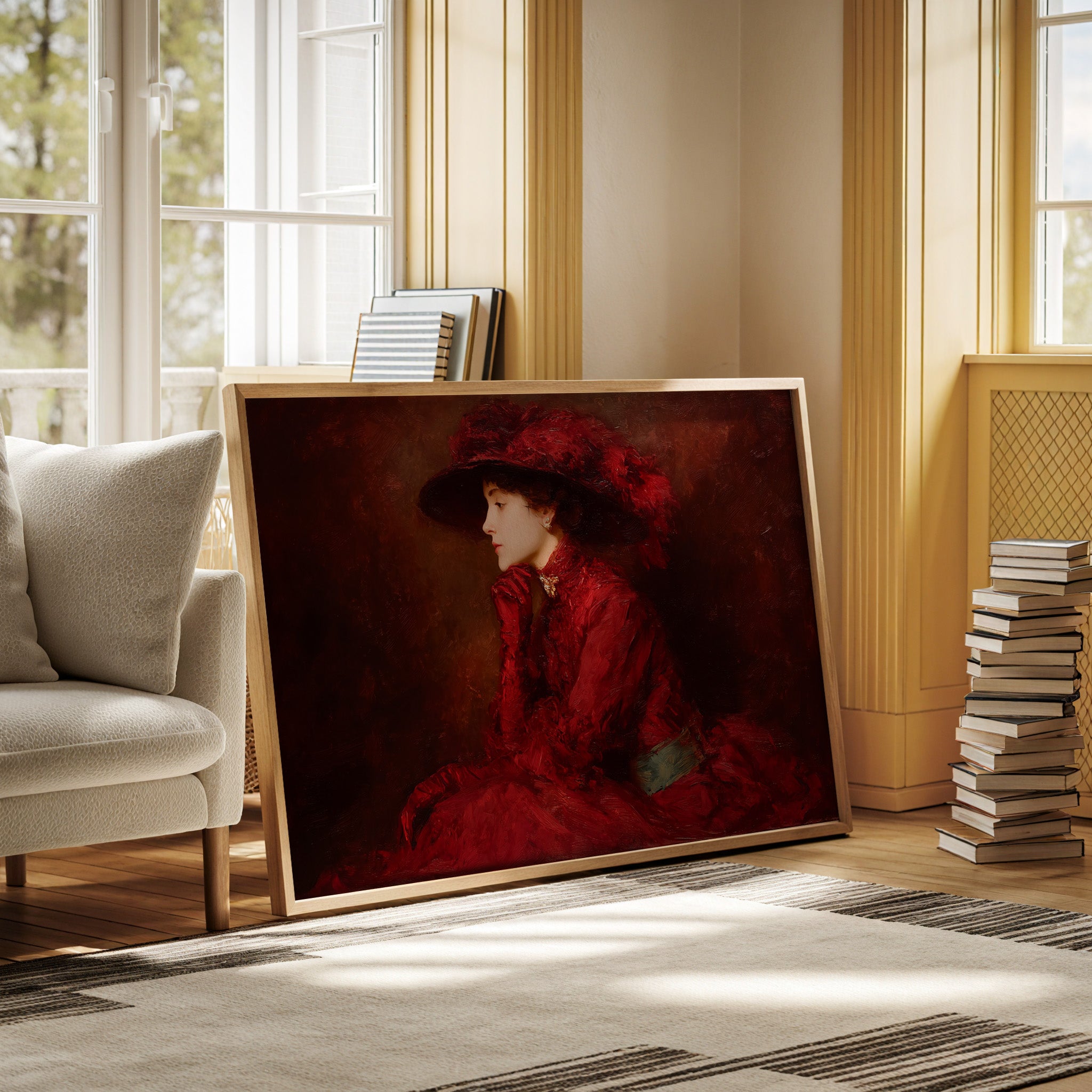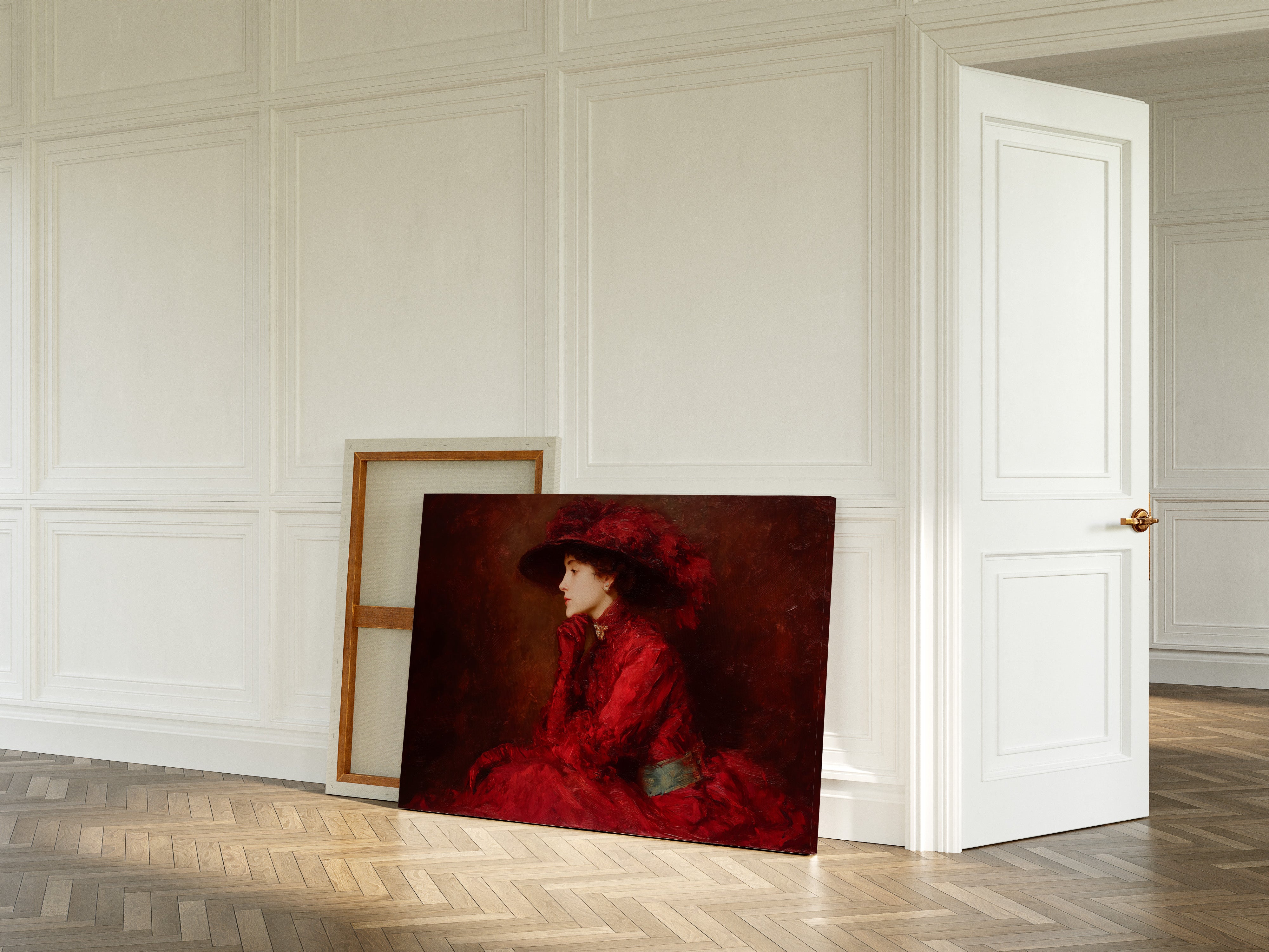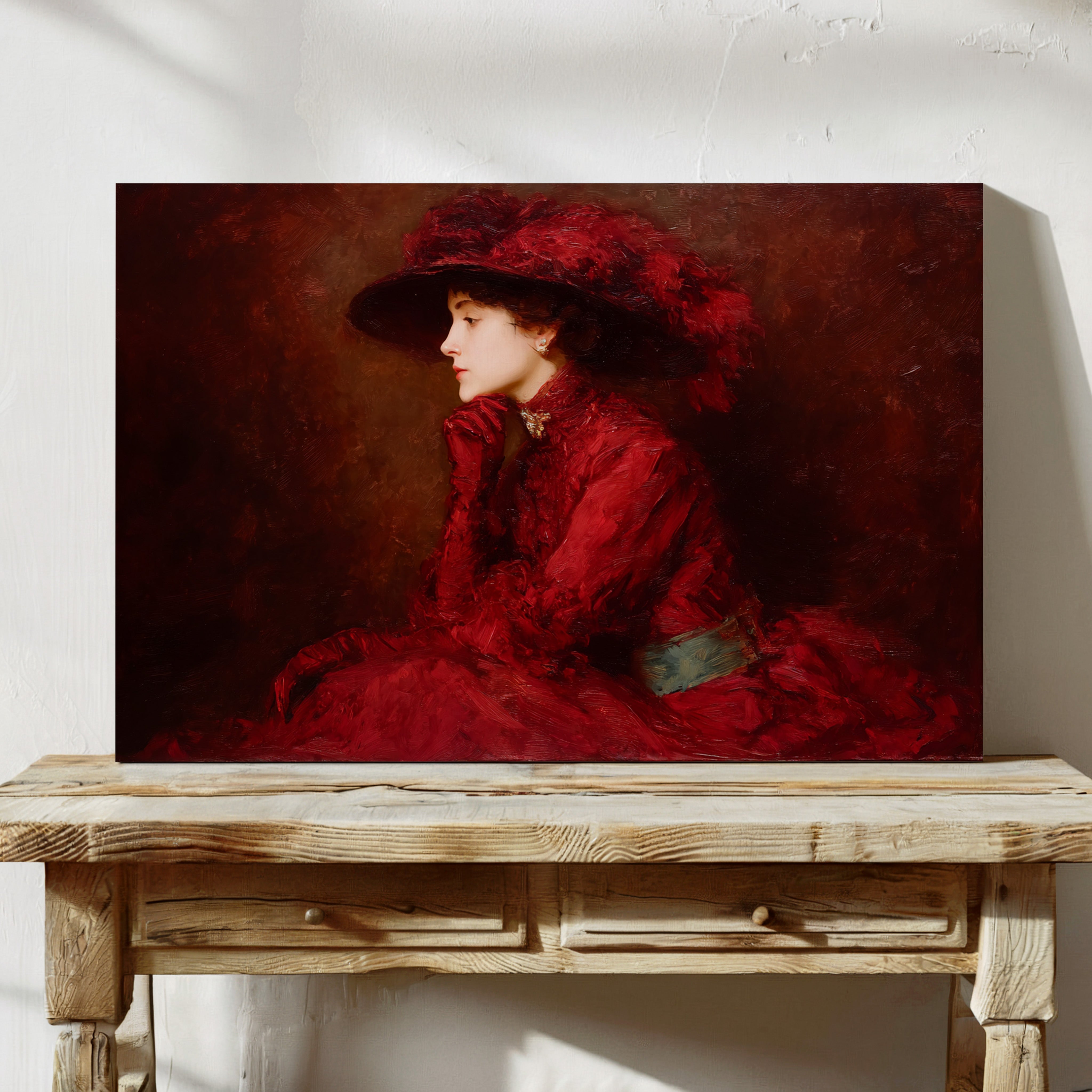 Deep scarlet folds cascade like liquid rubies, creating a portrait of timeless elegance against rich mahogany shadows. The dramatic play of light and texture brings forth a narrative of refined sophistication, where every brushstroke tells a story of Victorian grandeur and artistic mastery. The composition's bold chromatic statement merges with delicate details - a glimpse of an ornate brooch, the subtle curve of a feathered hat, the soft glow of pale skin against intense red.