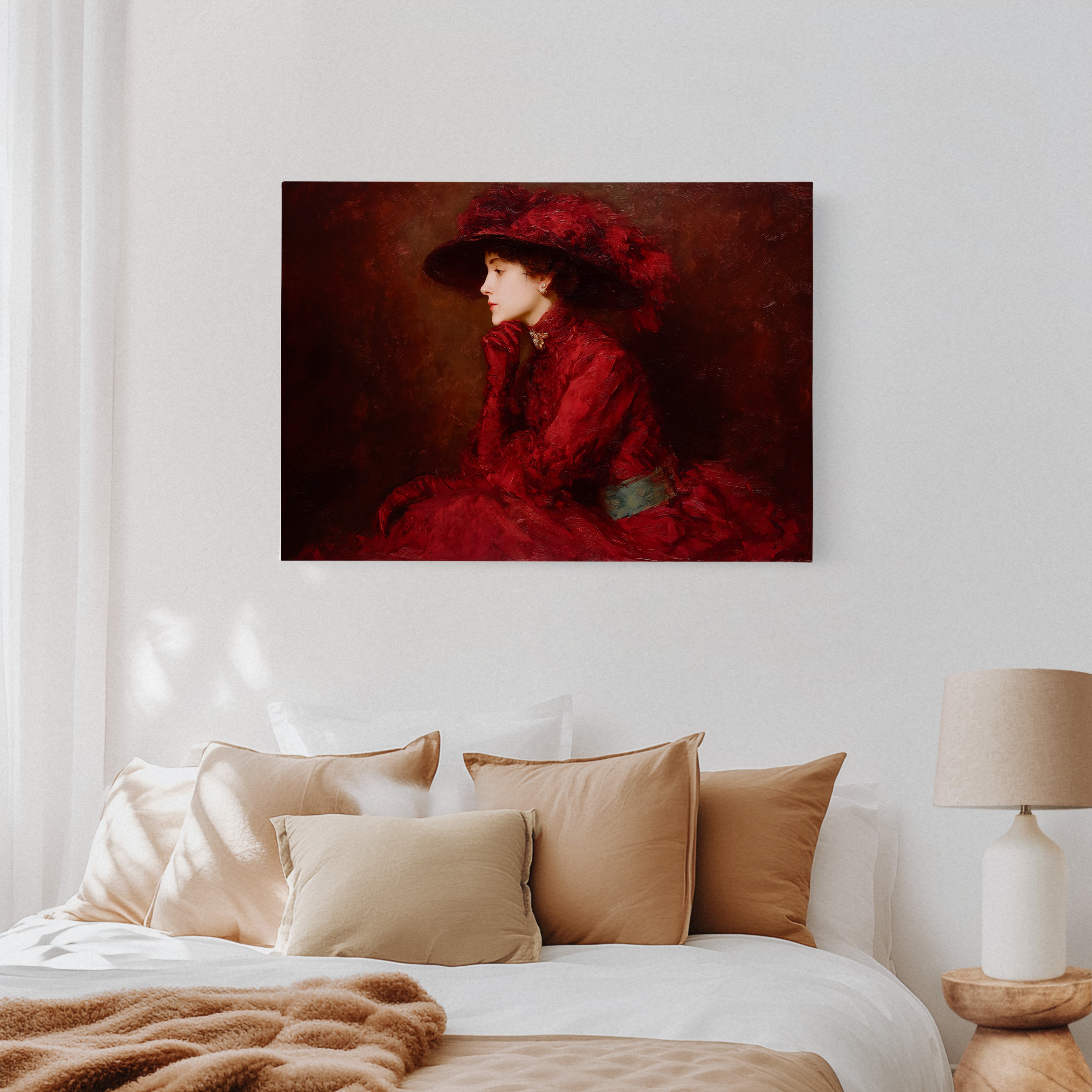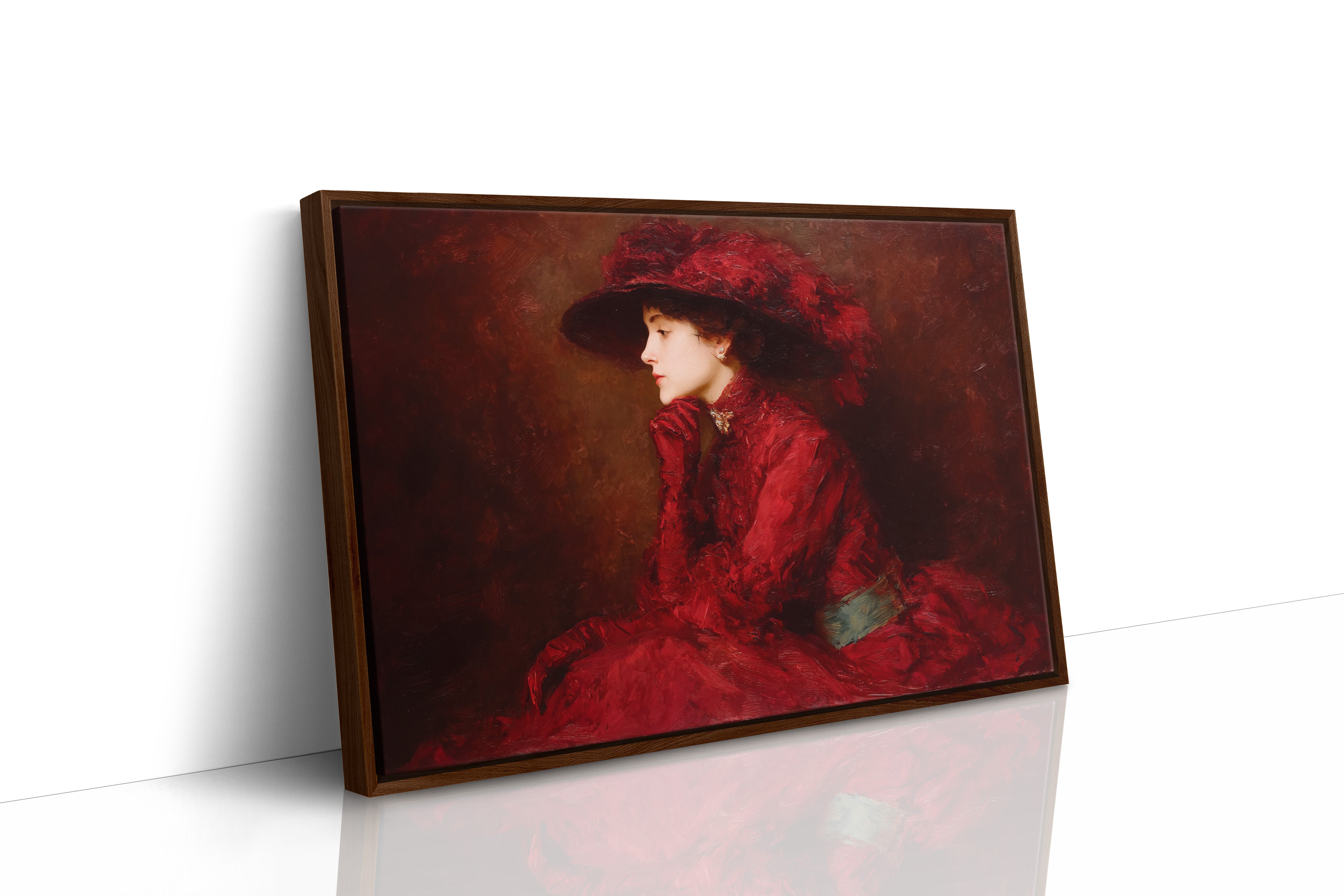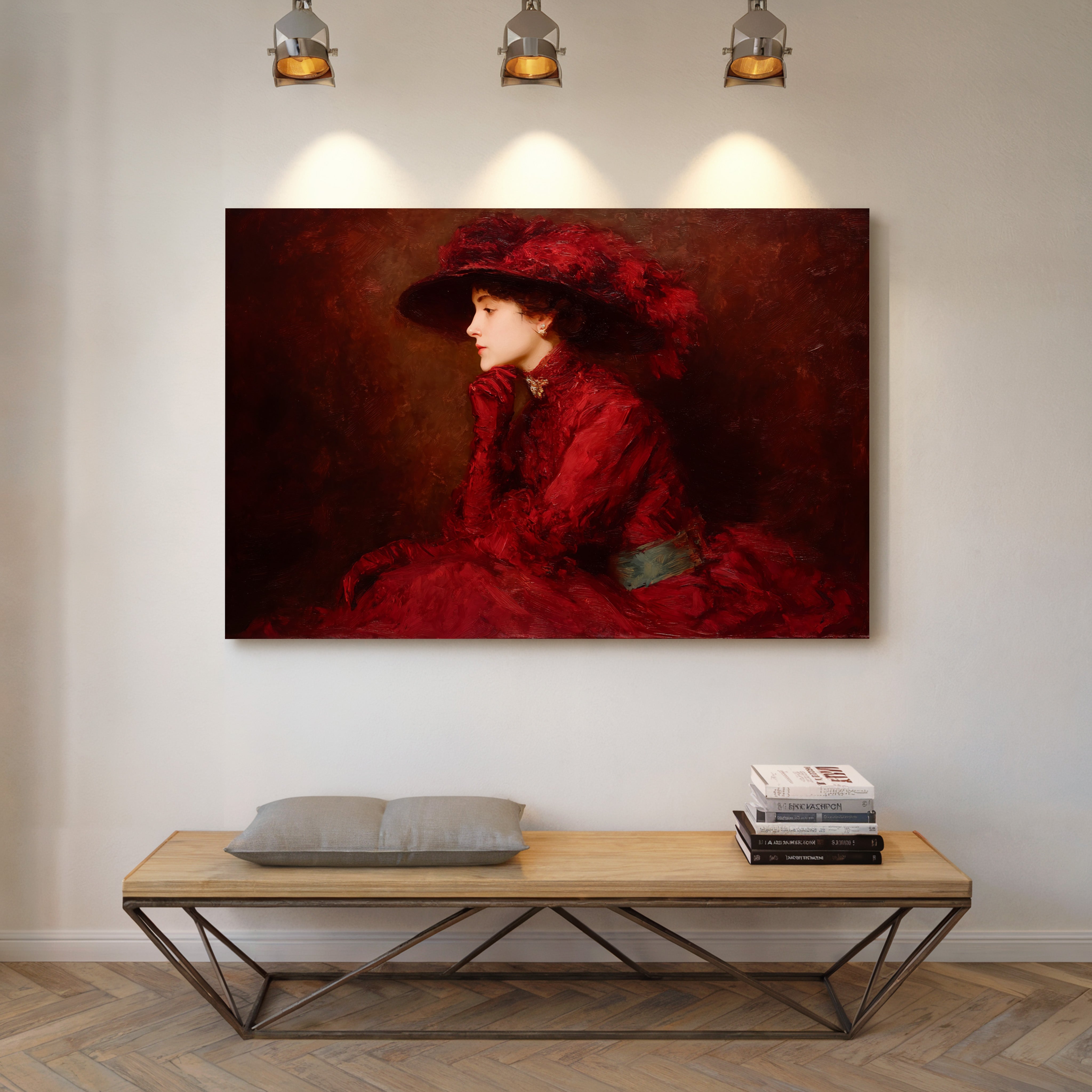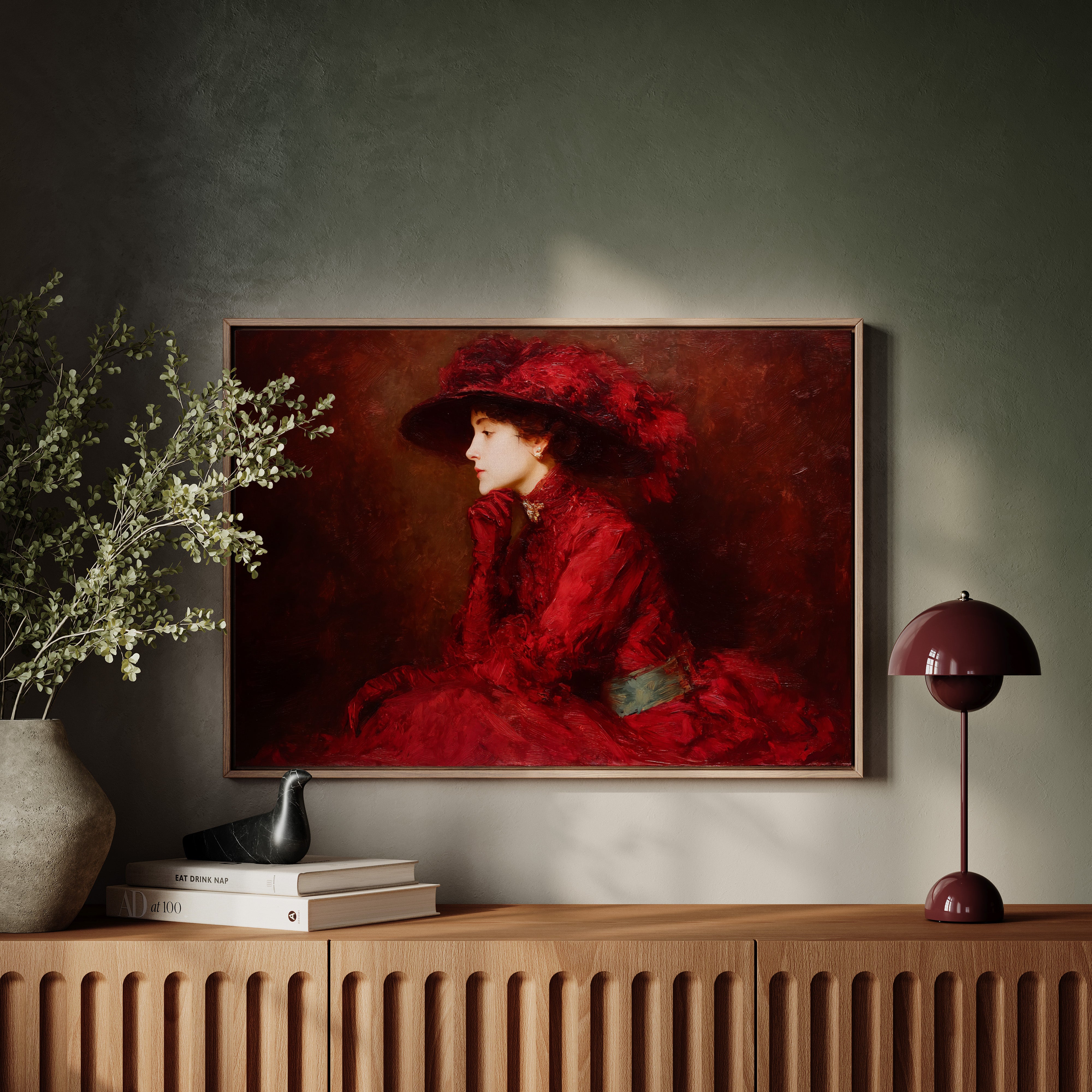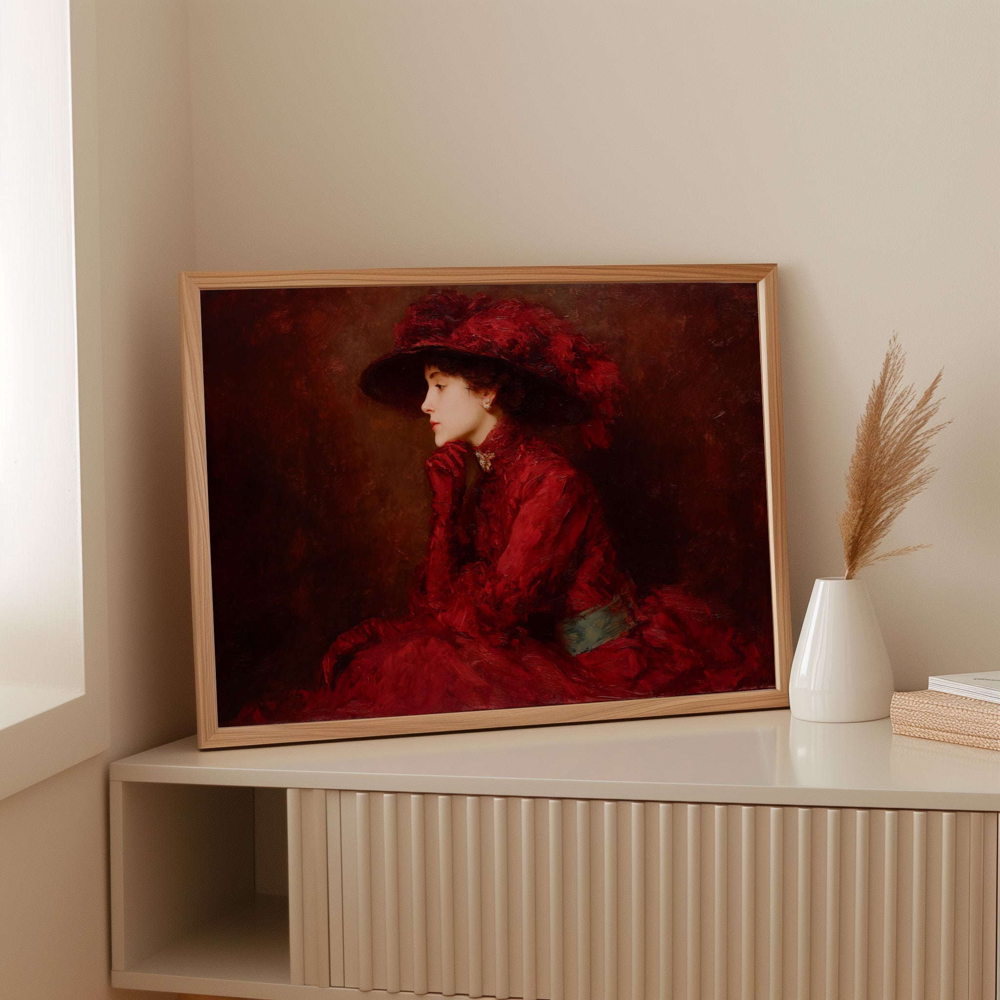 Deep scarlet folds cascade like liquid rubies, creating a portrait of timeless elegance against rich mahogany shadows. The dramatic play of light and texture brings forth a narrative of refined sophistication, where every brushstroke tells a story of Victorian grandeur and artistic mastery. The composition's bold chromatic statement merges with delicate details - a glimpse of an ornate brooch, the subtle curve of a feathered hat, the soft glow of pale skin against intense red.