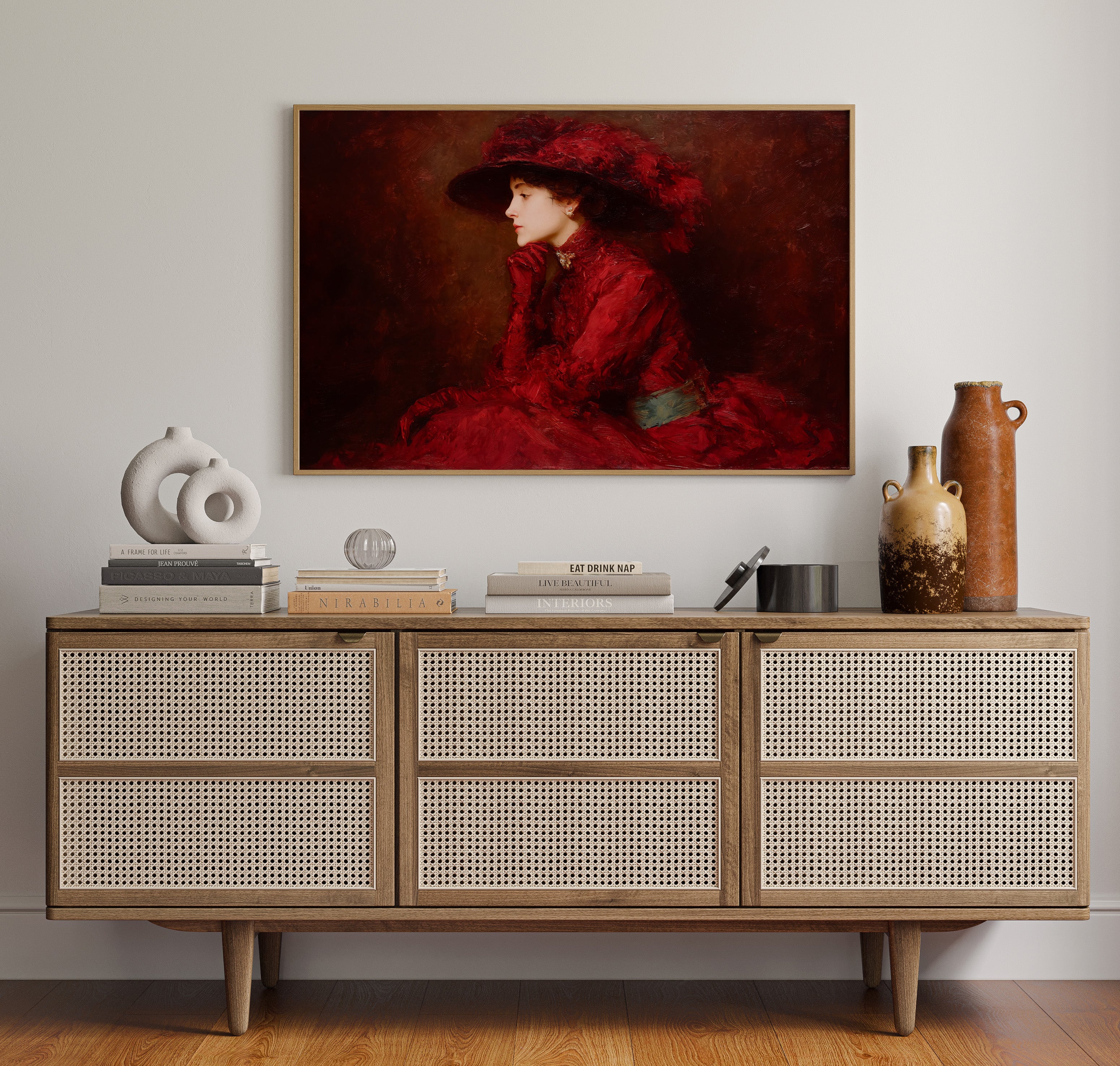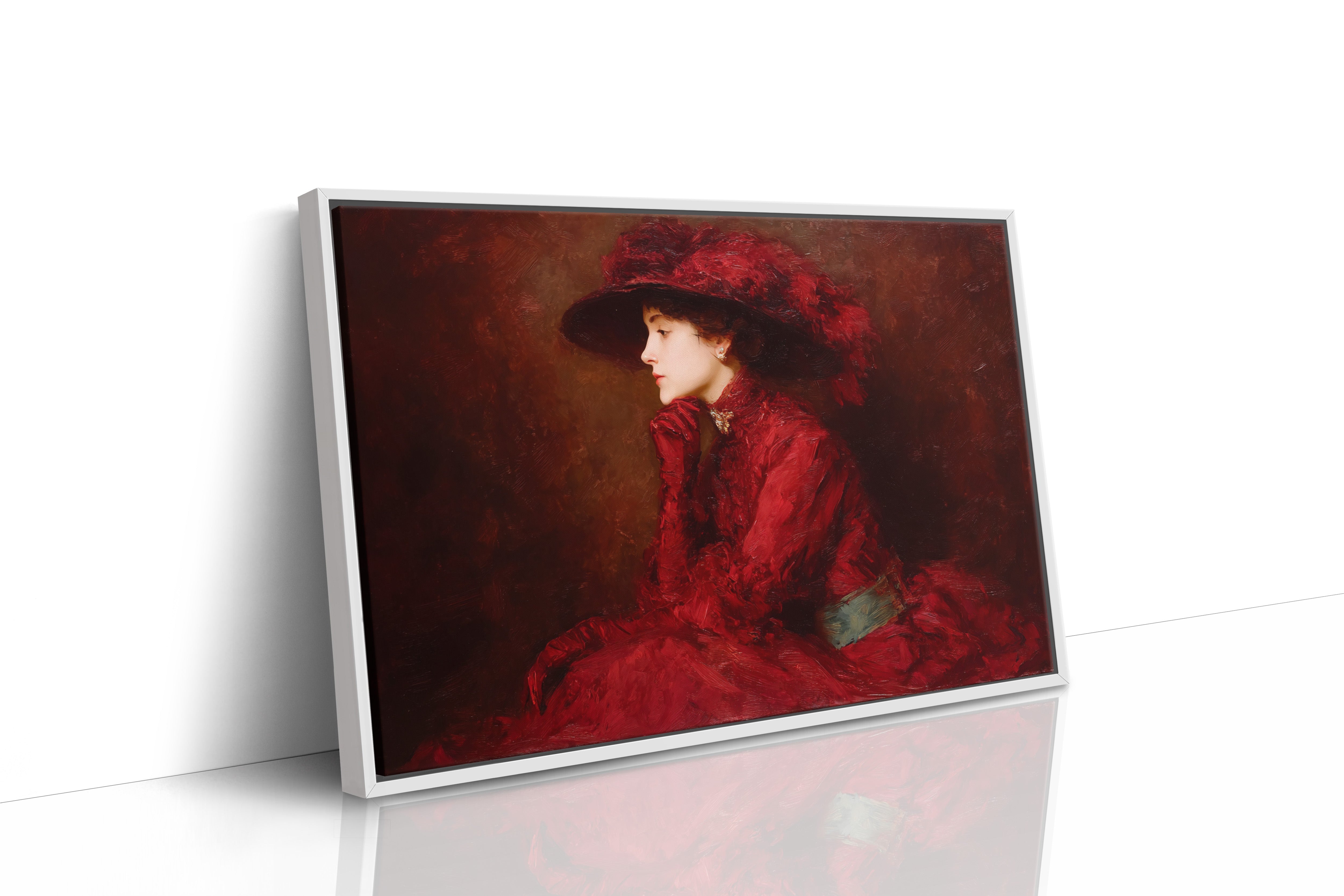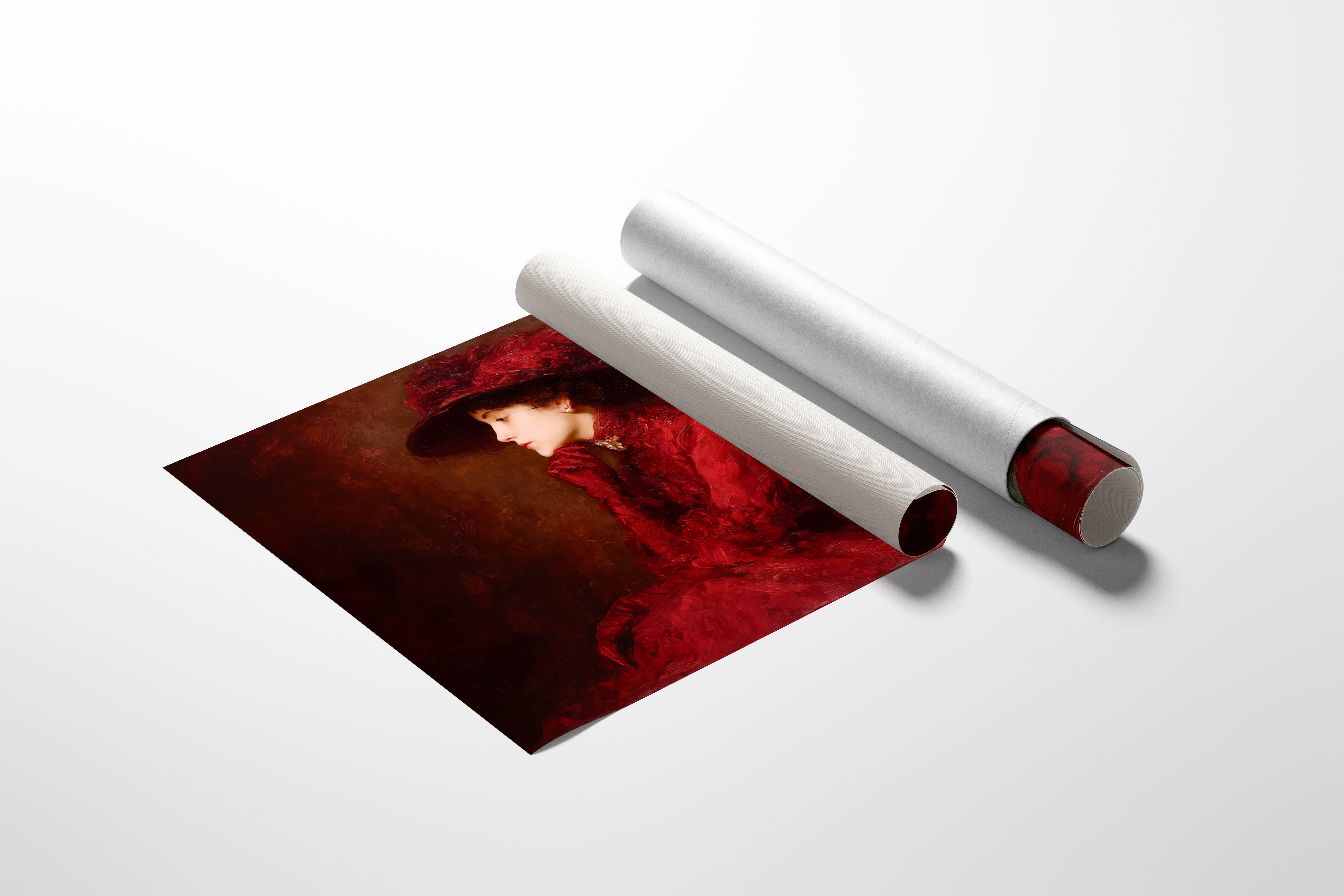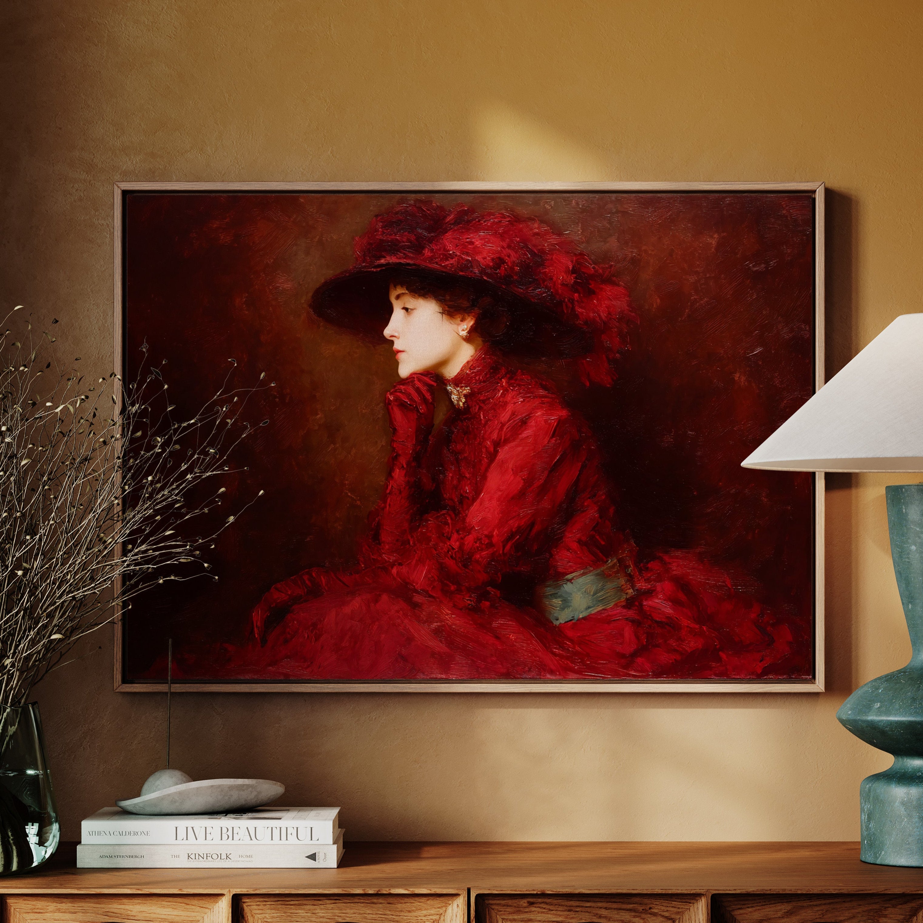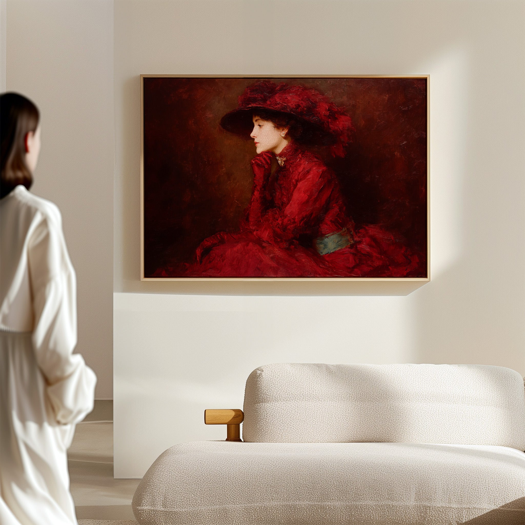 Deep scarlet folds cascade like liquid rubies, creating a portrait of timeless elegance against rich mahogany shadows. The dramatic play of light and texture brings forth a narrative of refined sophistication, where every brushstroke tells a story of Victorian grandeur and artistic mastery. The composition's bold chromatic statement merges with delicate details - a glimpse of an ornate brooch, the subtle curve of a feathered hat, the soft glow of pale skin against intense red.
