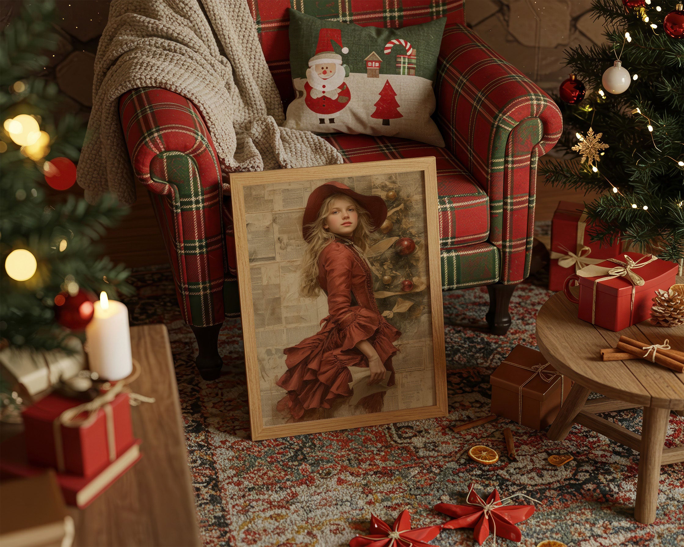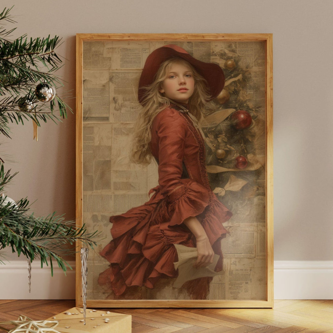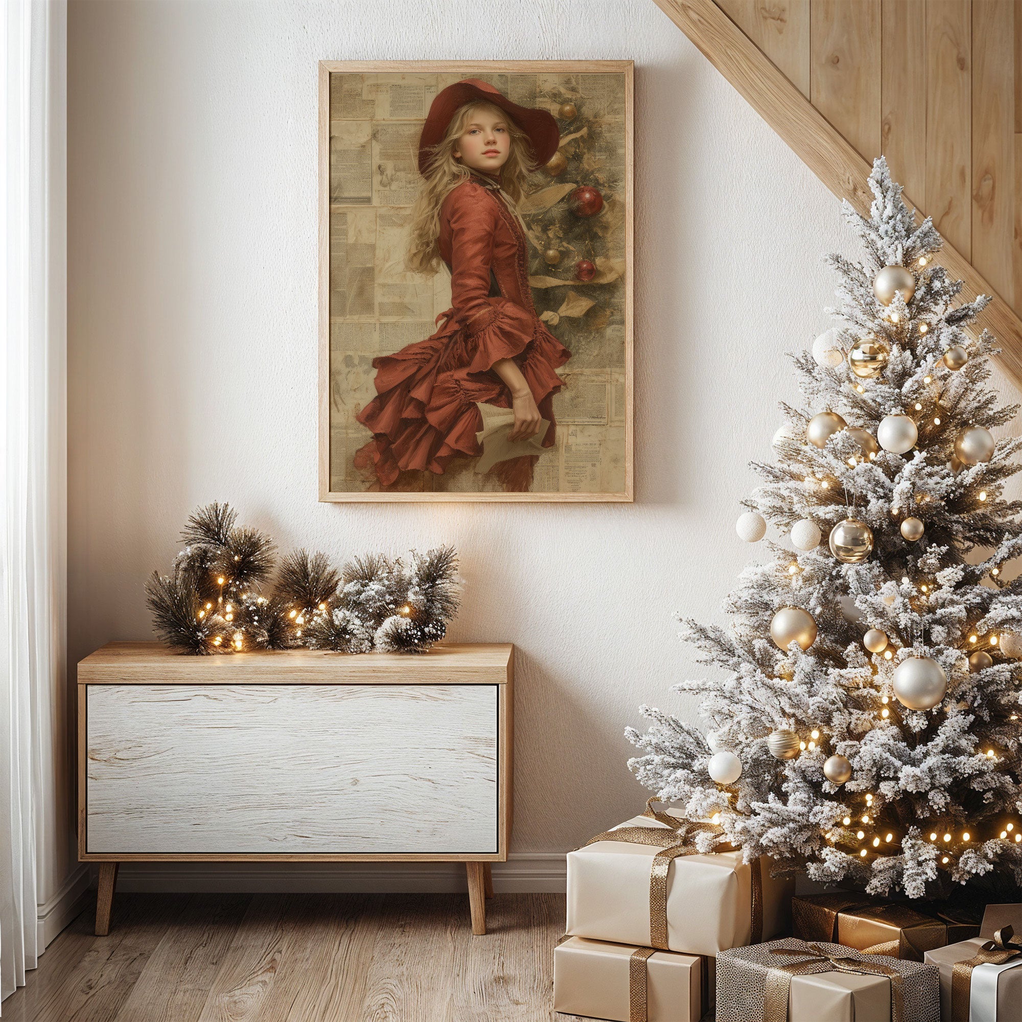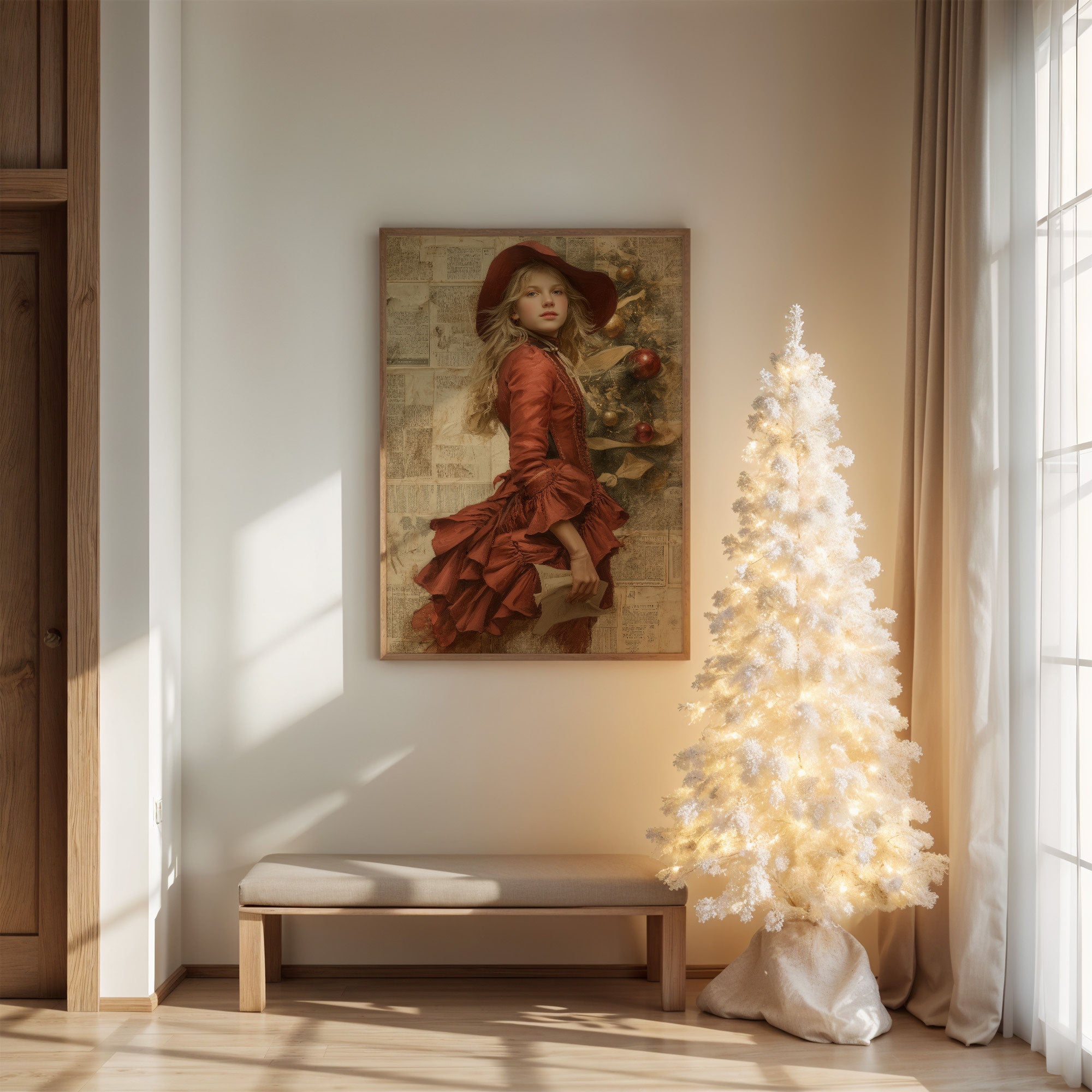 A warm ray of winter sunlight streams across a serene corner, where vintage elegance meets modern minimalism. A striking portrait in rich crimson tones commands attention against cream walls, while a luminous white Christmas tree sparkles with gentle radiance. The scene creates an artful dialogue between classical and contemporary, with natural light casting geometric shadows across light wooden floors and a simple bench. This thoughtful arrangement speaks to the timeless grace of seasonal decorating with an artistic soul. Perfect for an entryway, living room, or any space where quiet luxury and holiday spirit converge.
