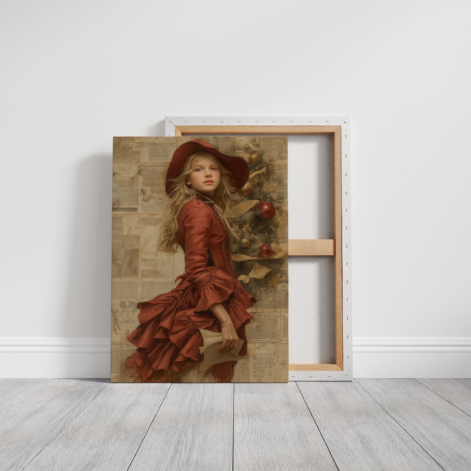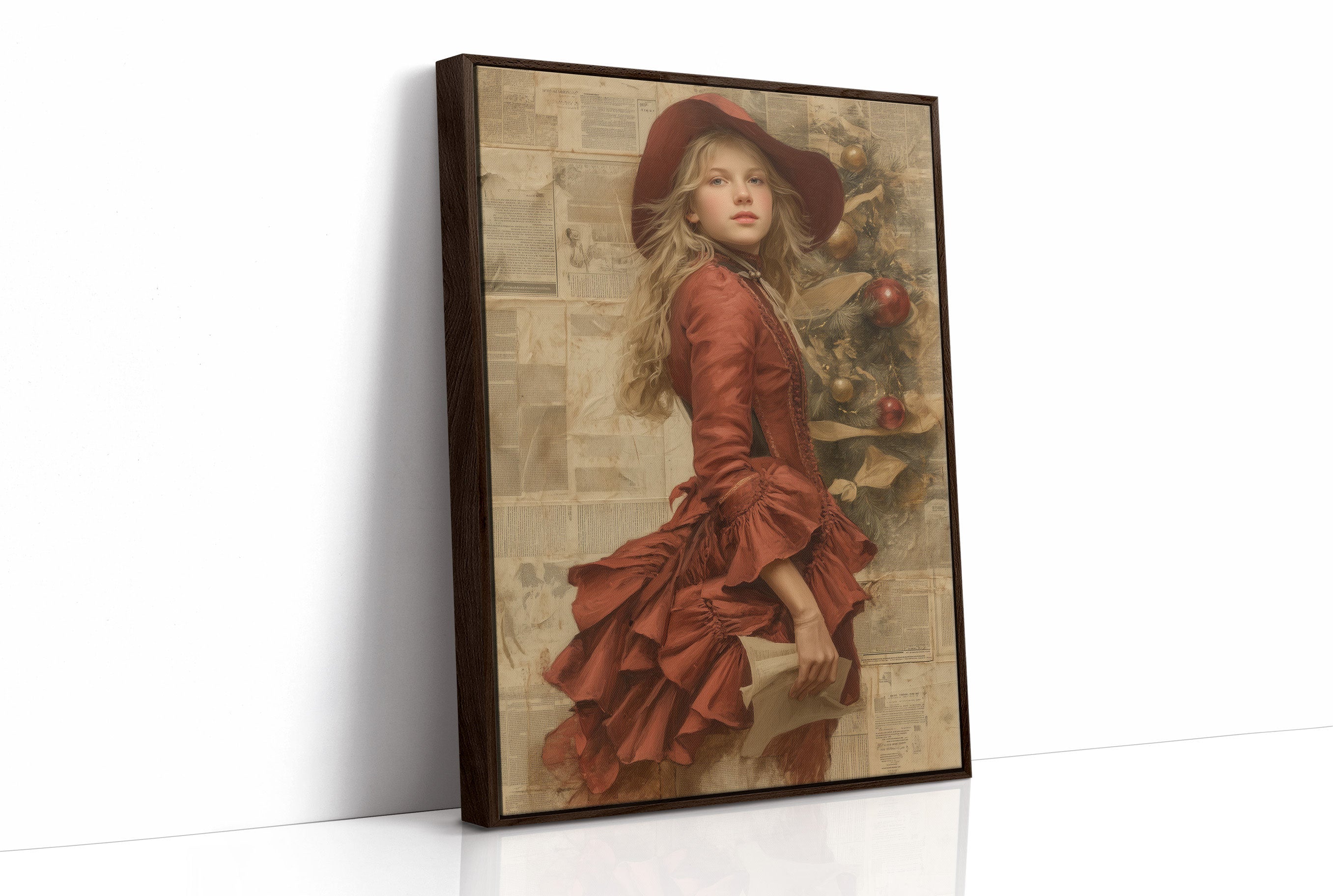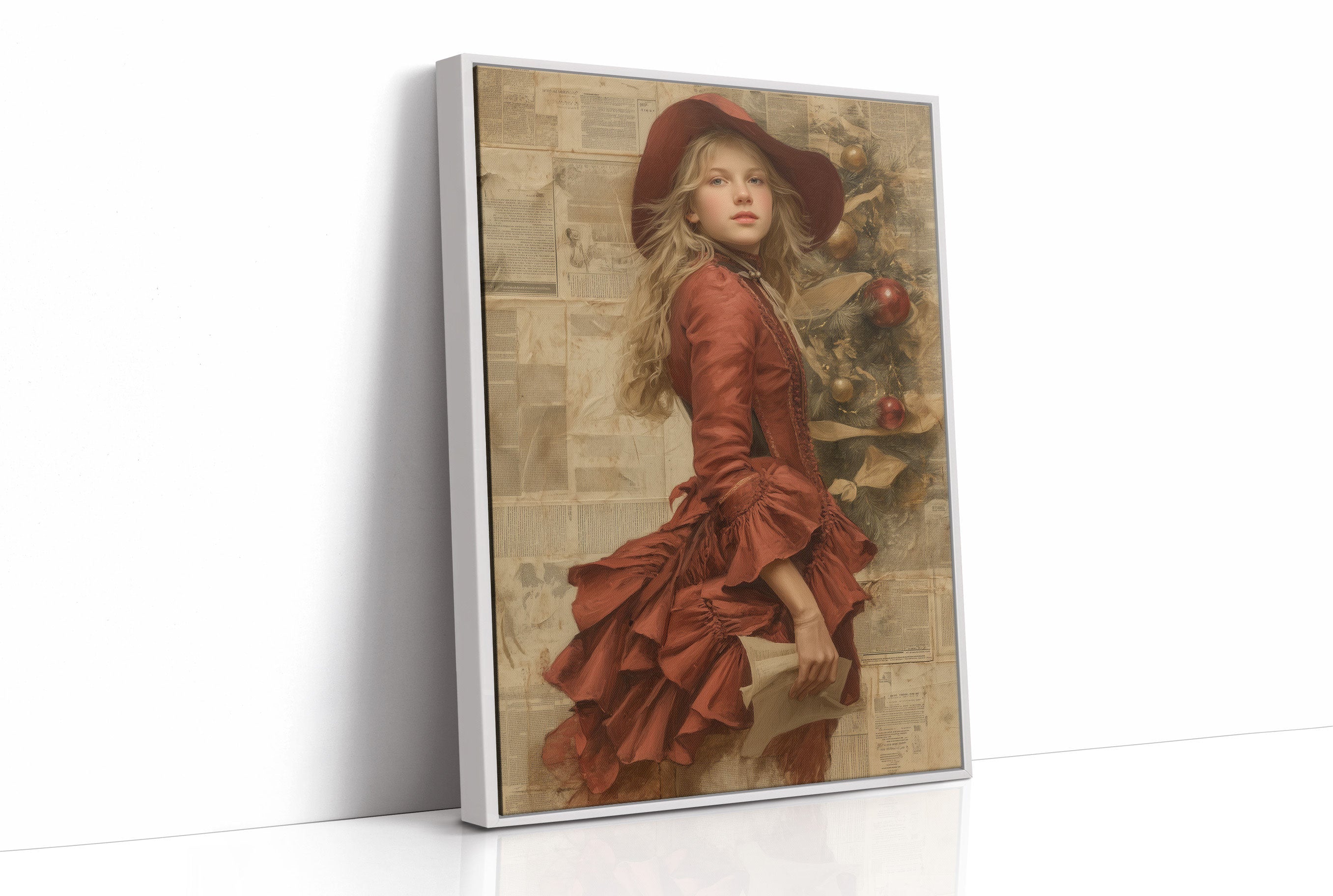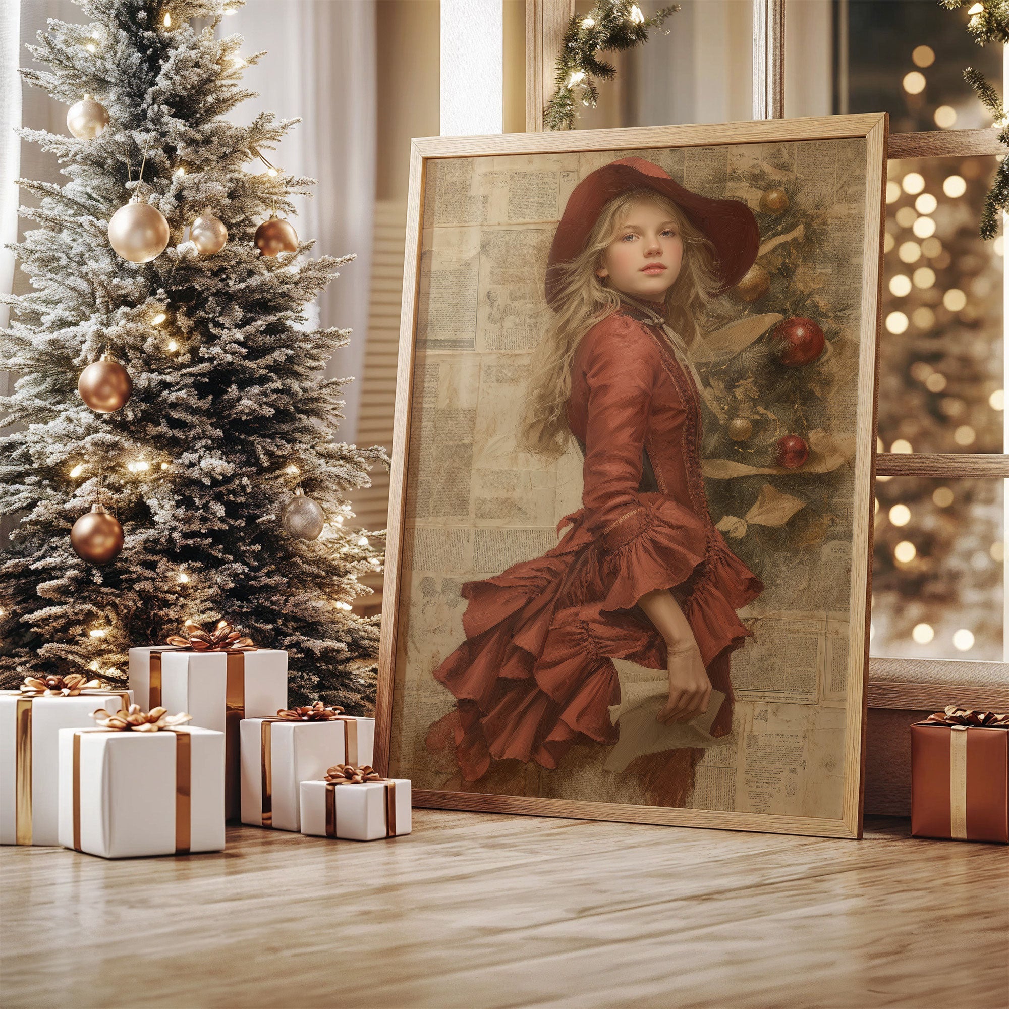 A warm ray of winter sunlight streams across a serene corner, where vintage elegance meets modern minimalism. A striking portrait in rich crimson tones commands attention against cream walls, while a luminous white Christmas tree sparkles with gentle radiance. The scene creates an artful dialogue between classical and contemporary, with natural light casting geometric shadows across light wooden floors and a simple bench. This thoughtful arrangement speaks to the timeless grace of seasonal decorating with an artistic soul. Perfect for an entryway, living room, or any space where quiet luxury and holiday spirit converge.