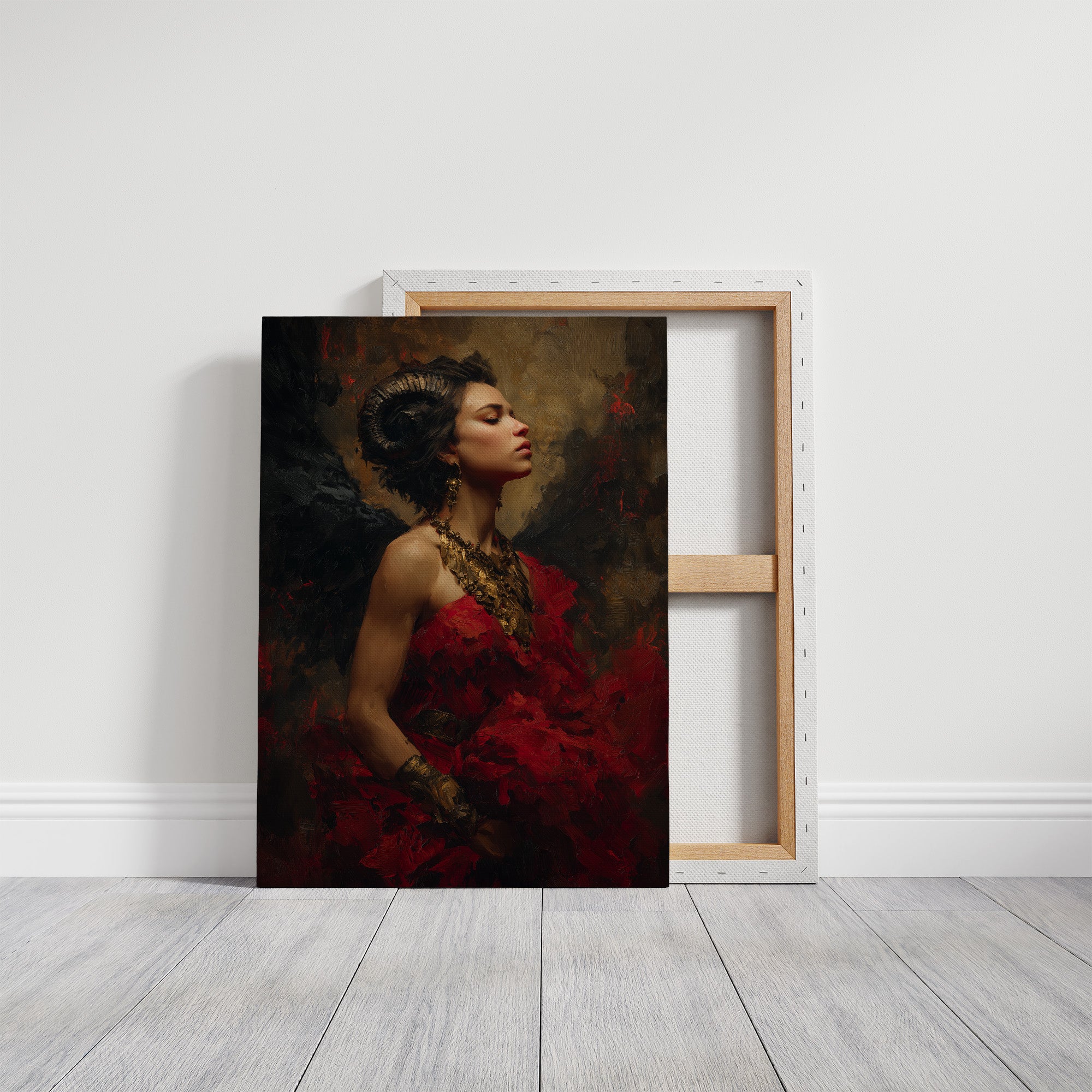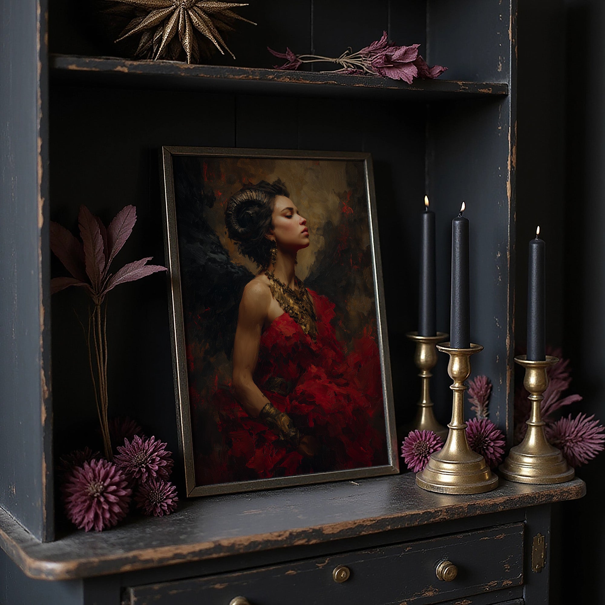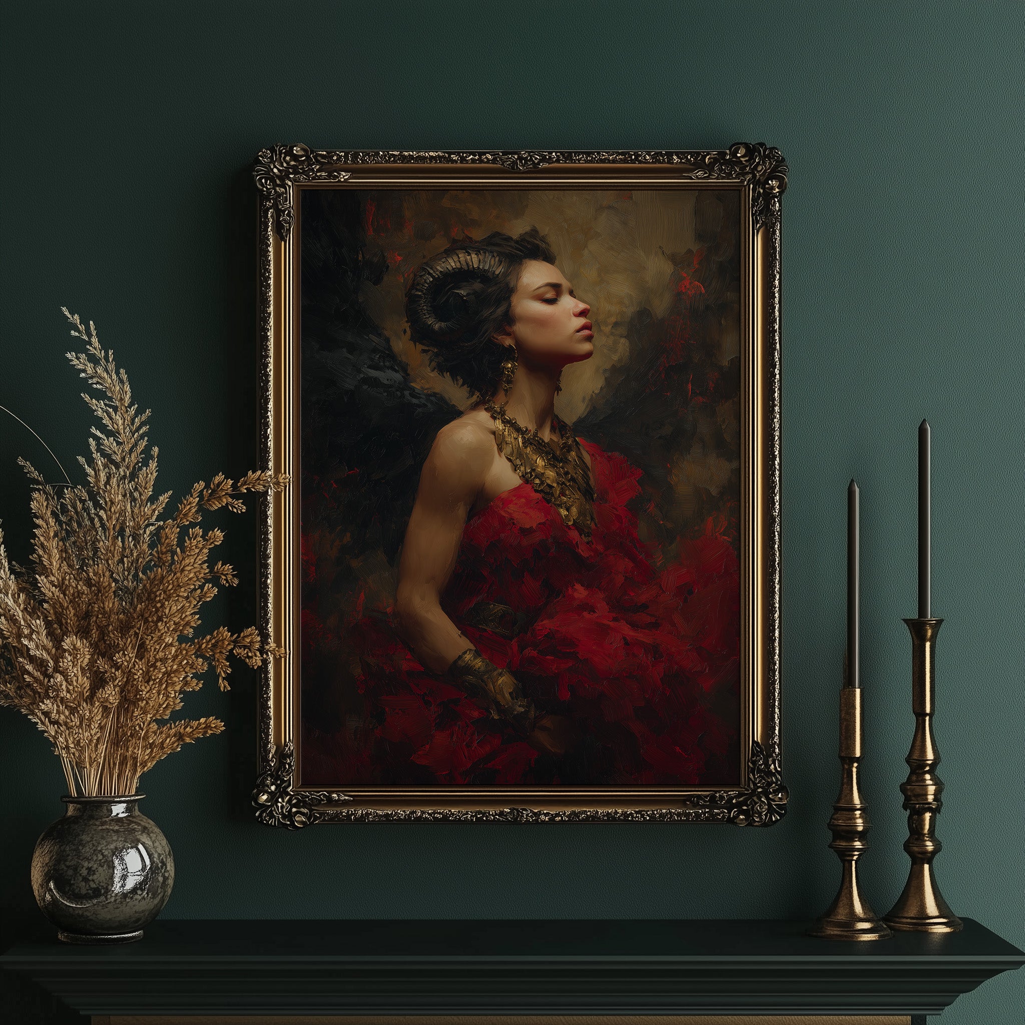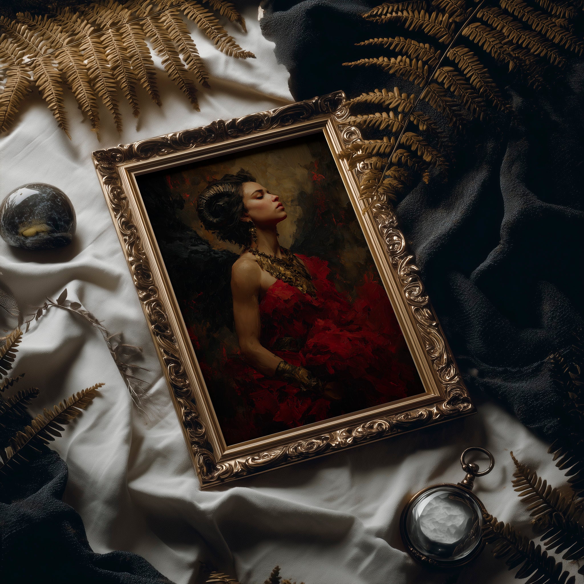 Regal defiance captured in a moment of divine contemplation. The striking contrast of crimson against darkness creates a powerful narrative of strength and grace, while ornate gold adornments and dramatic horned headdress speak to a timeless mythology. The portrait's ethereal quality blends classical painting techniques with contemporary boldness, the subject emerging from smoky shadows like a forgotten deity reclaiming her story. This statement piece commands attention in a minimalist dining room or as the focal point of a sophisticated home office.
