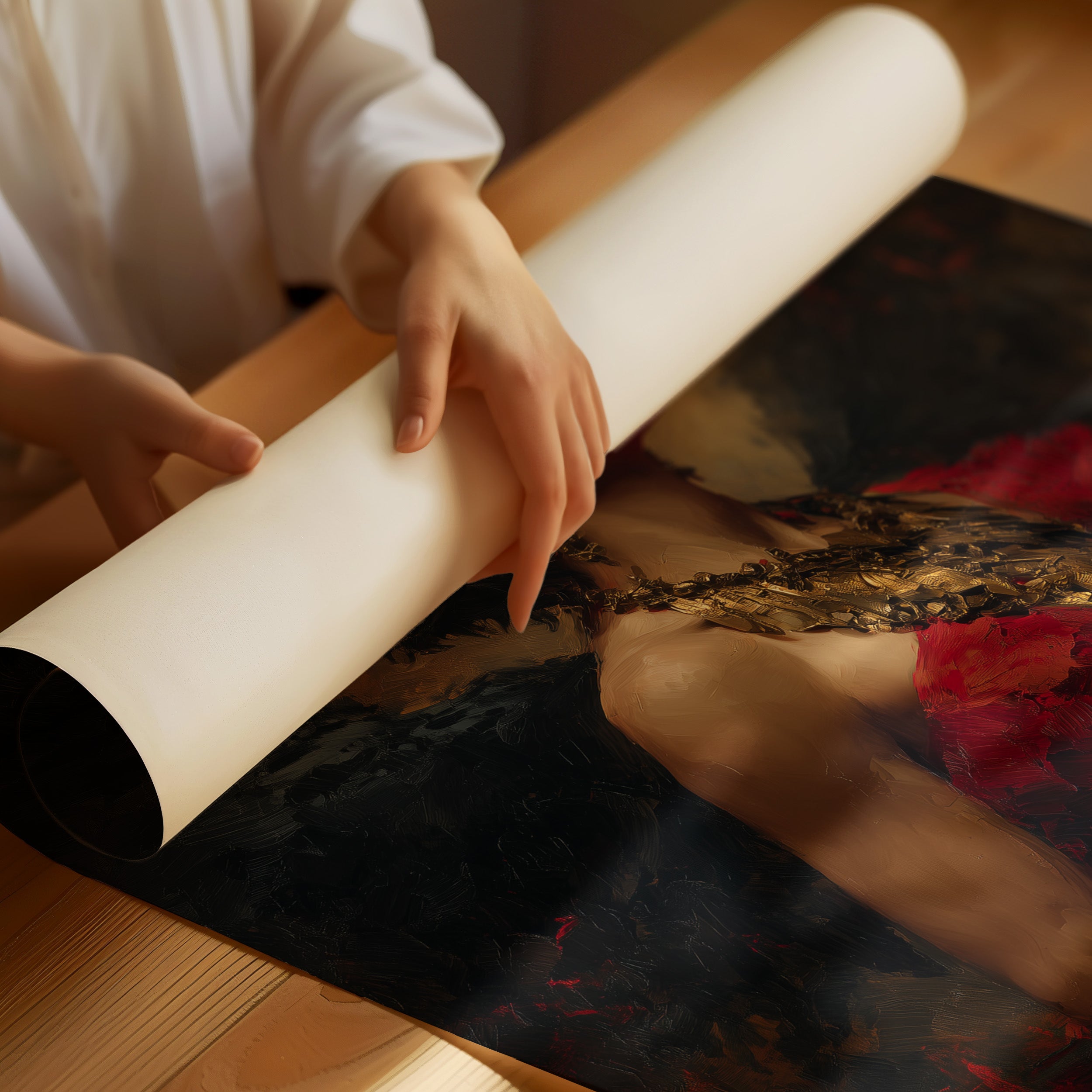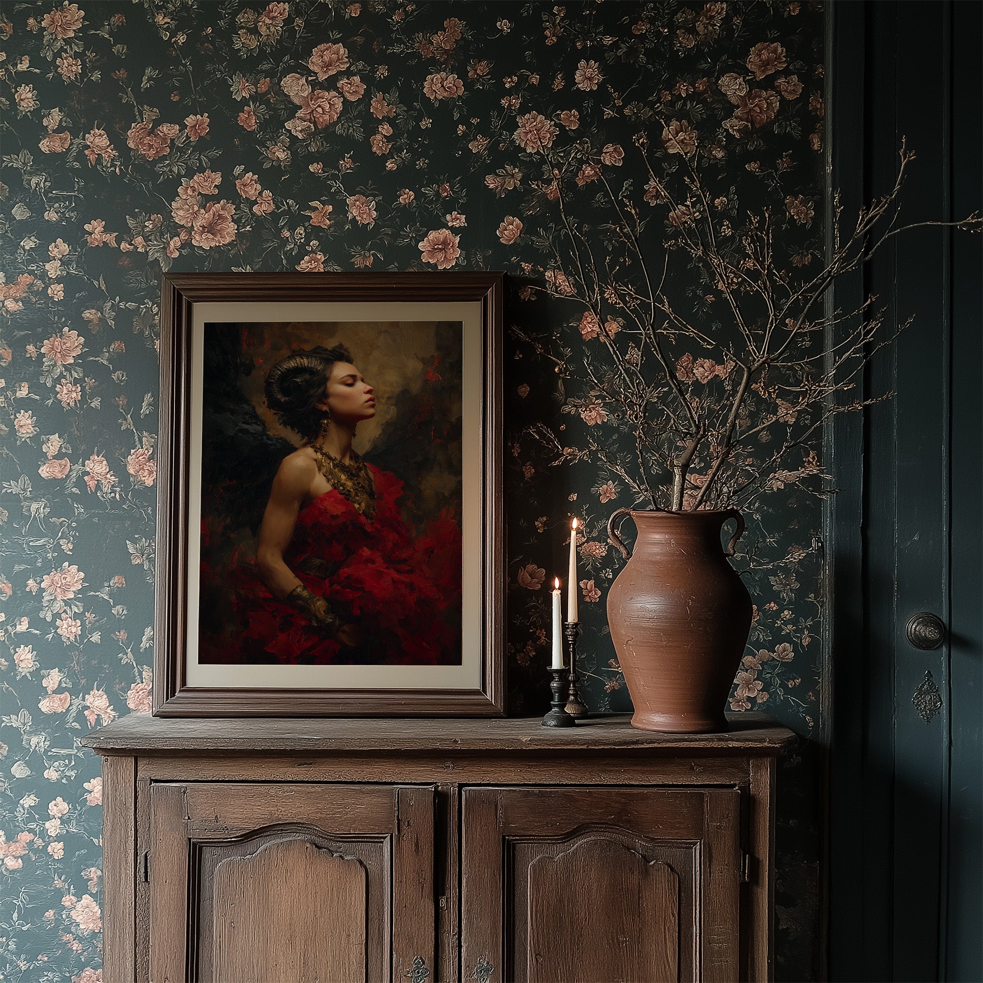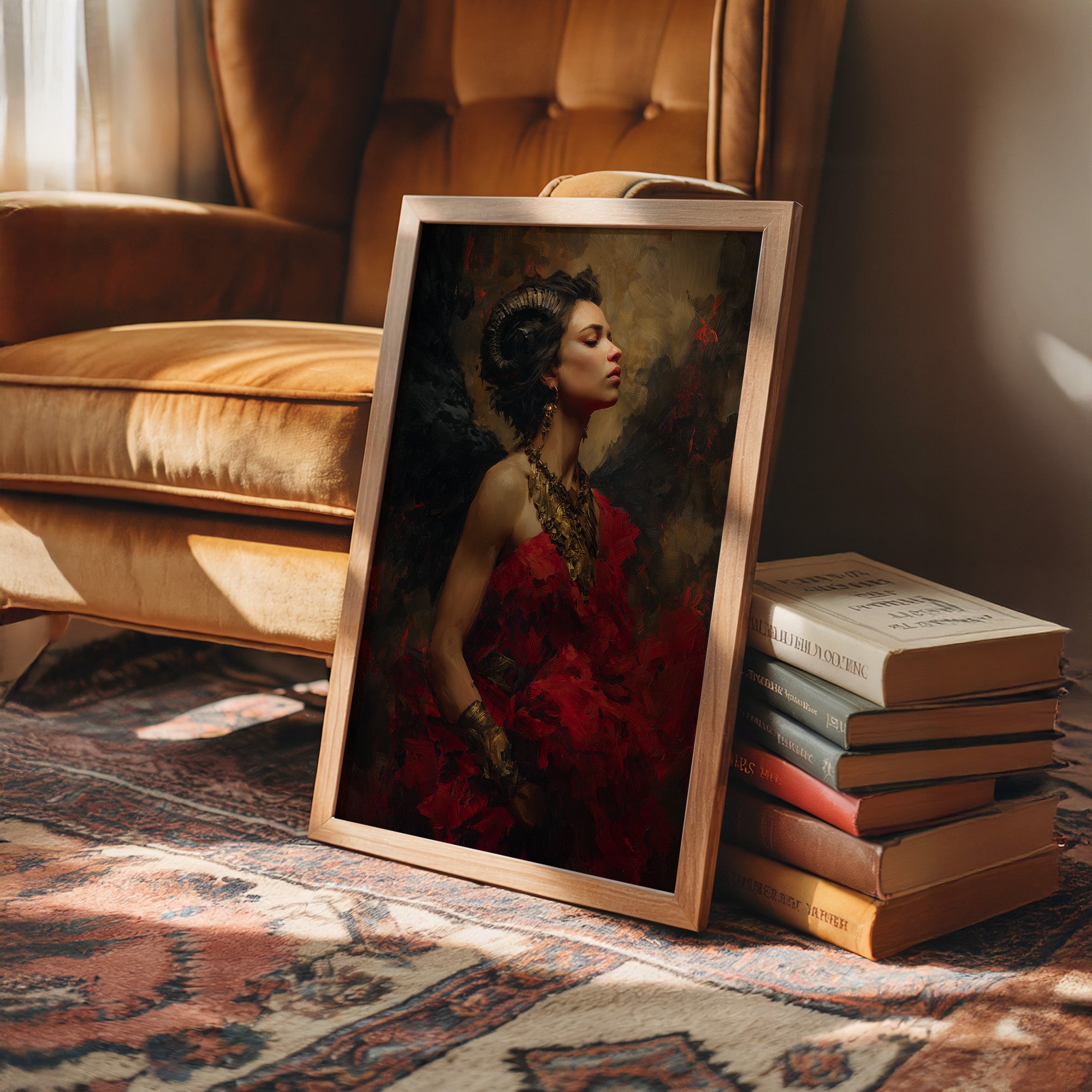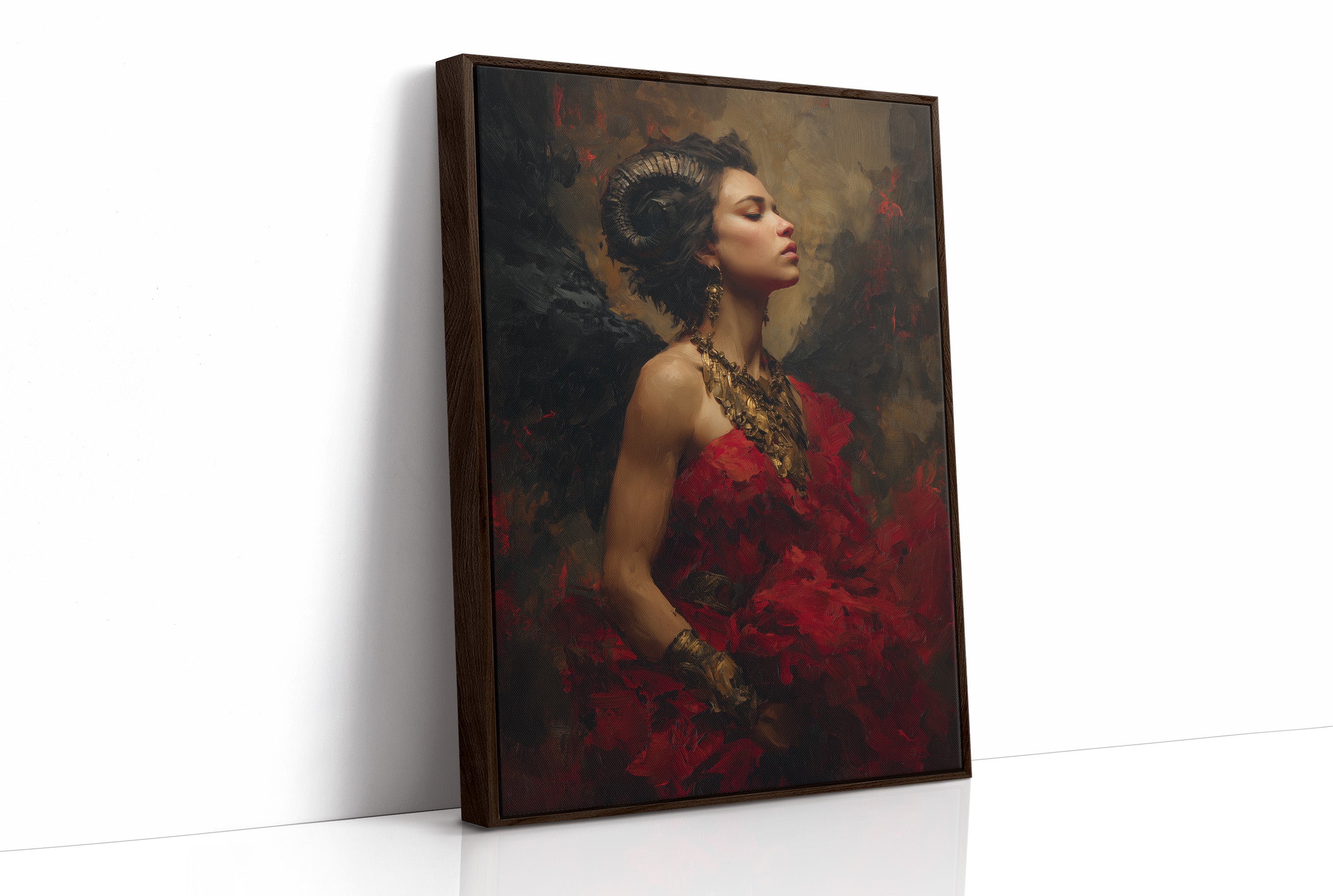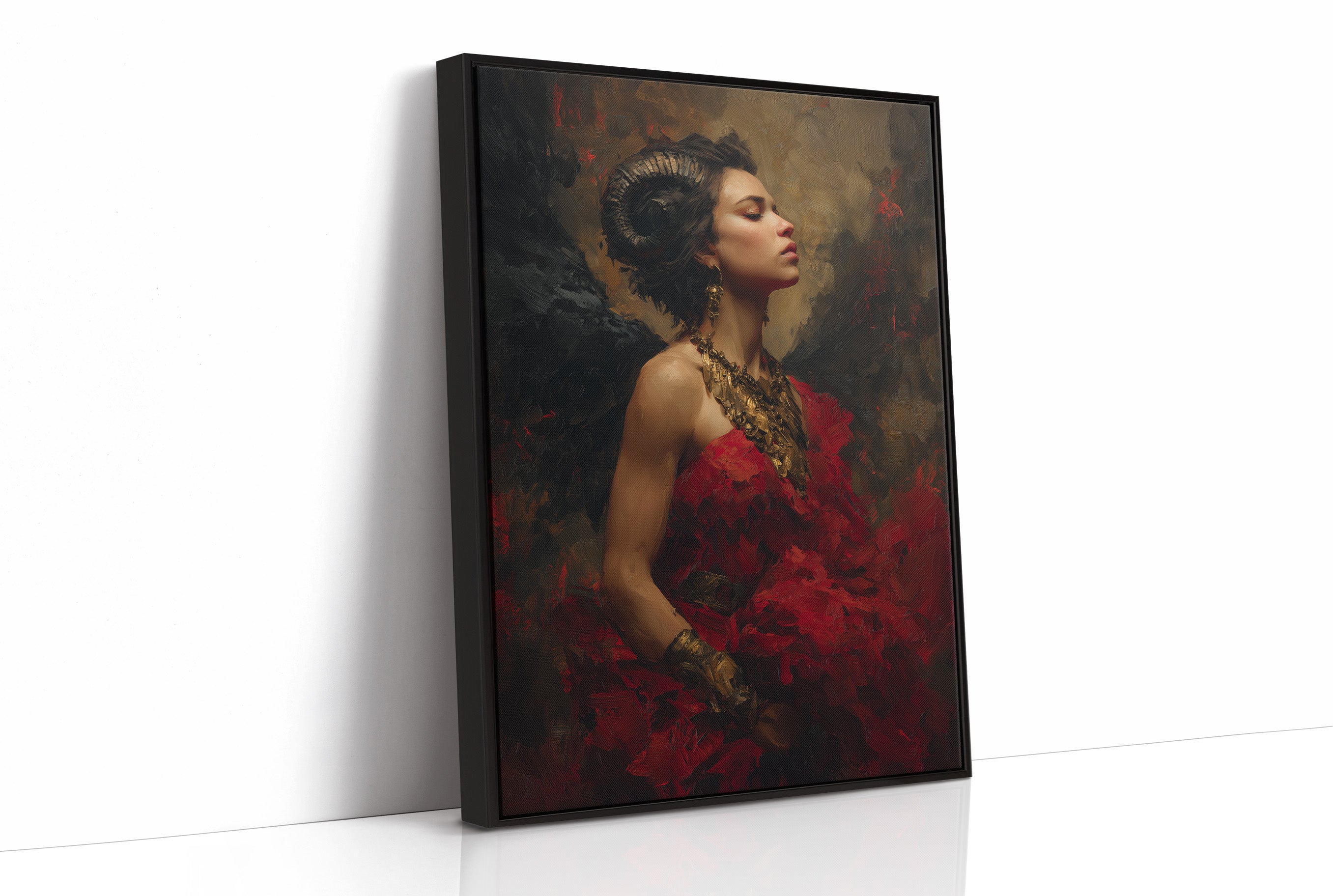 Regal defiance captured in a moment of divine contemplation. The striking contrast of crimson against darkness creates a powerful narrative of strength and grace, while ornate gold adornments and dramatic horned headdress speak to a timeless mythology. The portrait's ethereal quality blends classical painting techniques with contemporary boldness, the subject emerging from smoky shadows like a forgotten deity reclaiming her story. This statement piece commands attention in a minimalist dining room or as the focal point of a sophisticated home office.