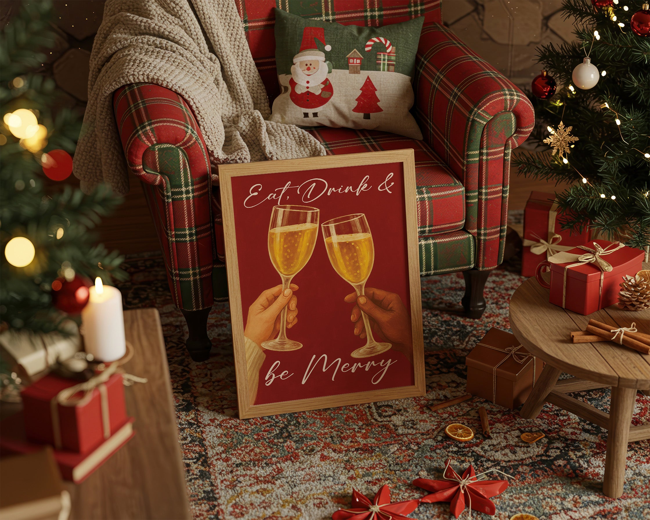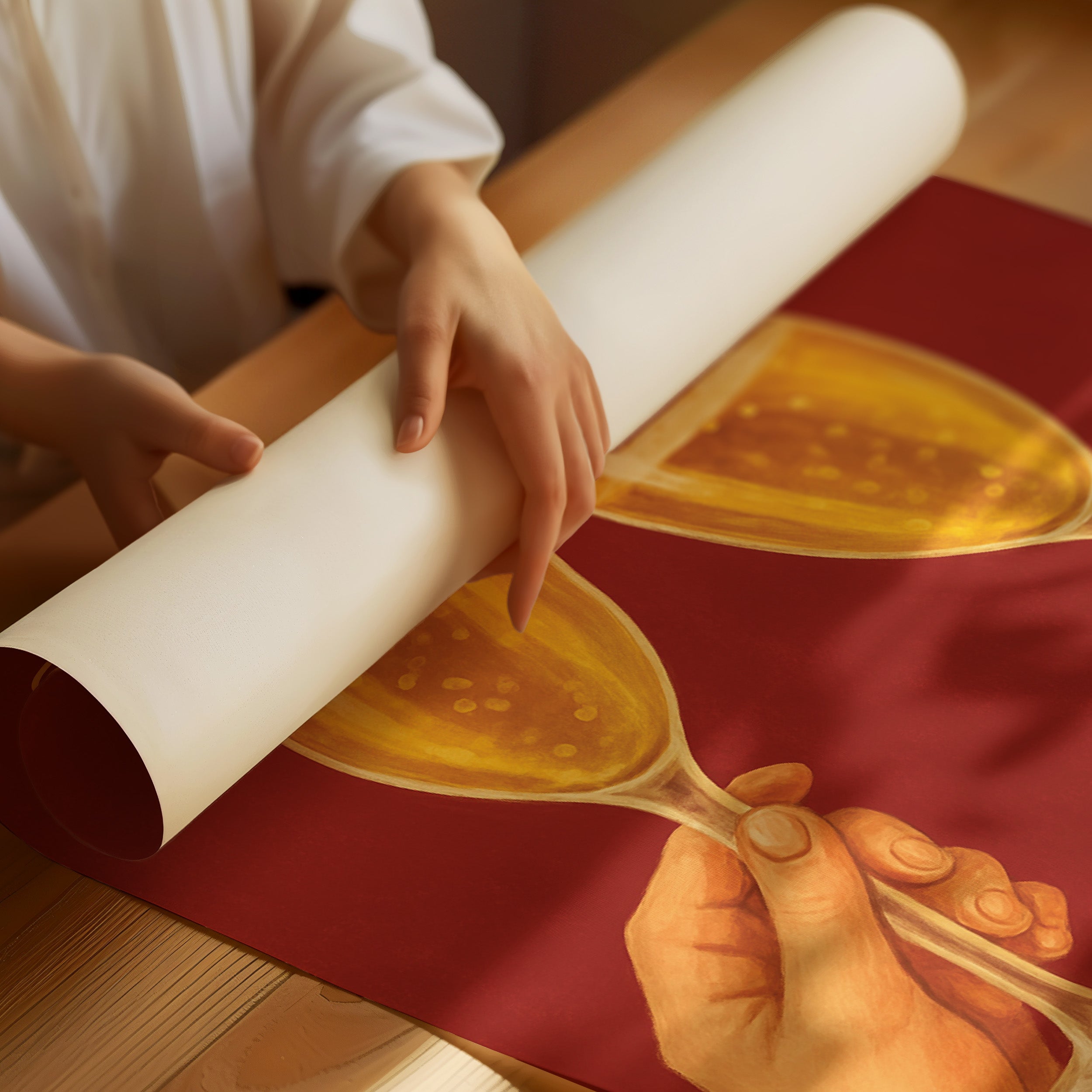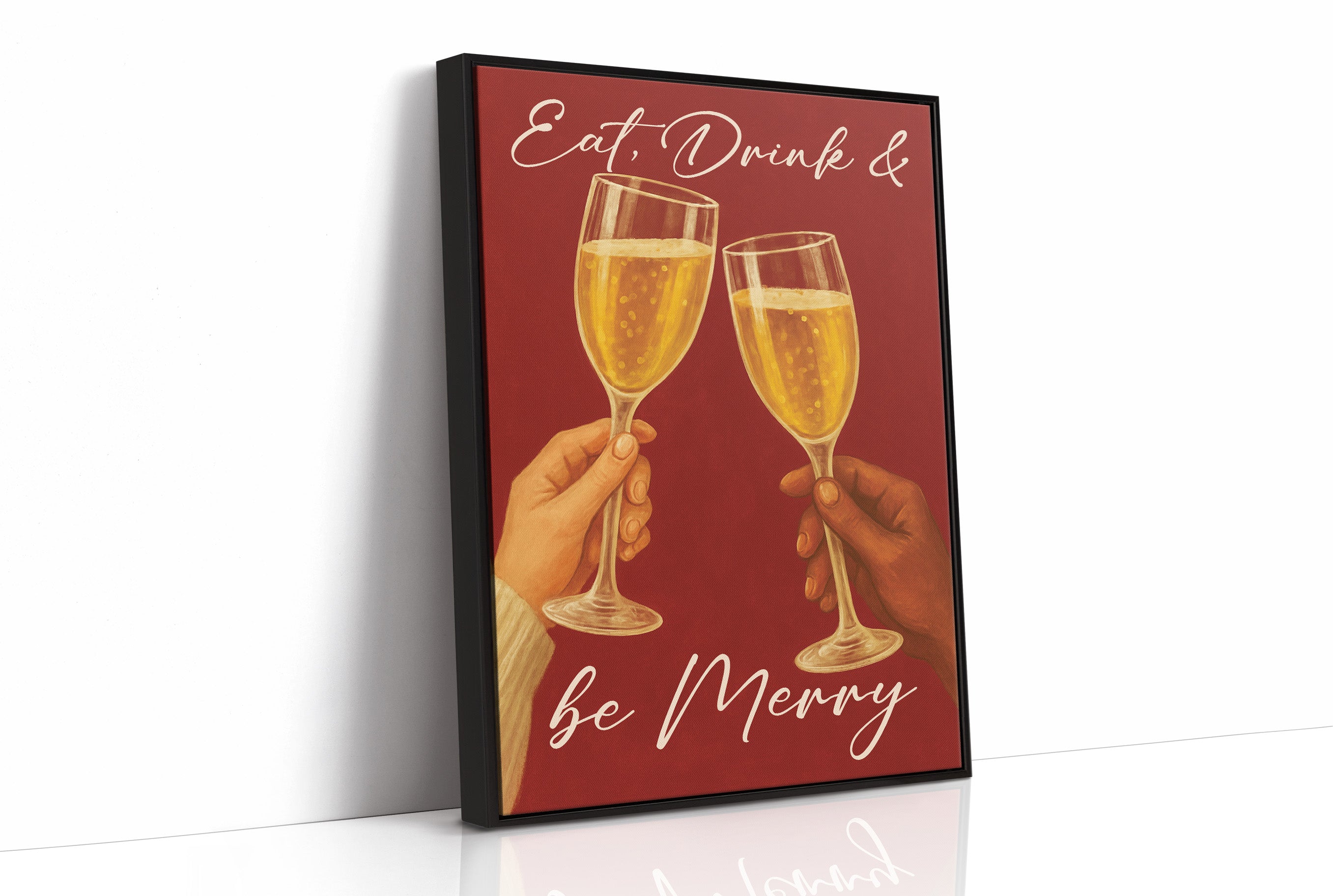 Golden bubbles dance in raised flutes against a backdrop of rich burgundy, capturing that perfect moment before celebration begins. Two hands reach toward one another, glasses poised in that fleeting second of anticipation where possibilities shimmer like the champagne itself. The warm crimson background radiates conviviality and festive charm, inviting viewers into a world where connection matters most.