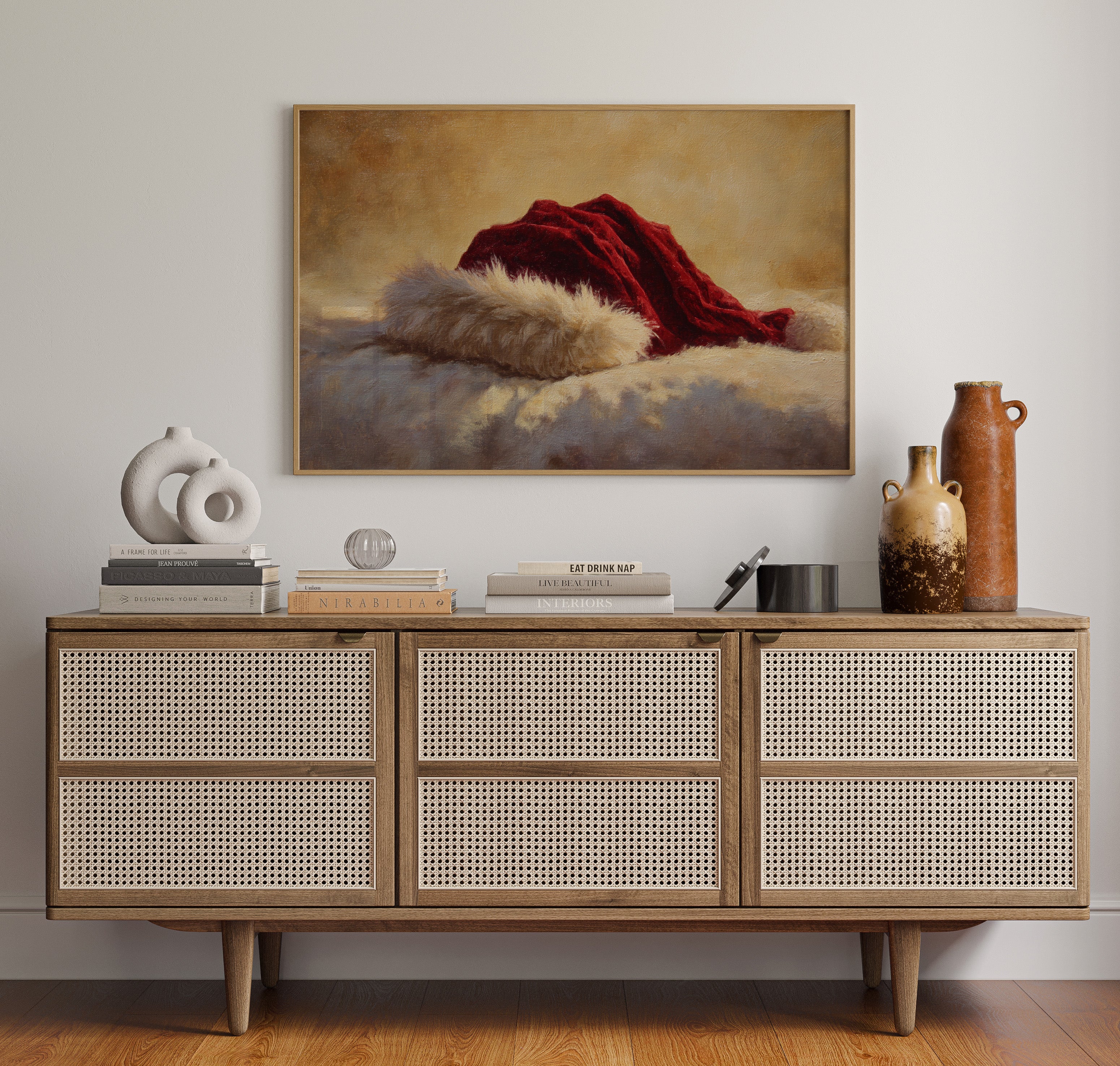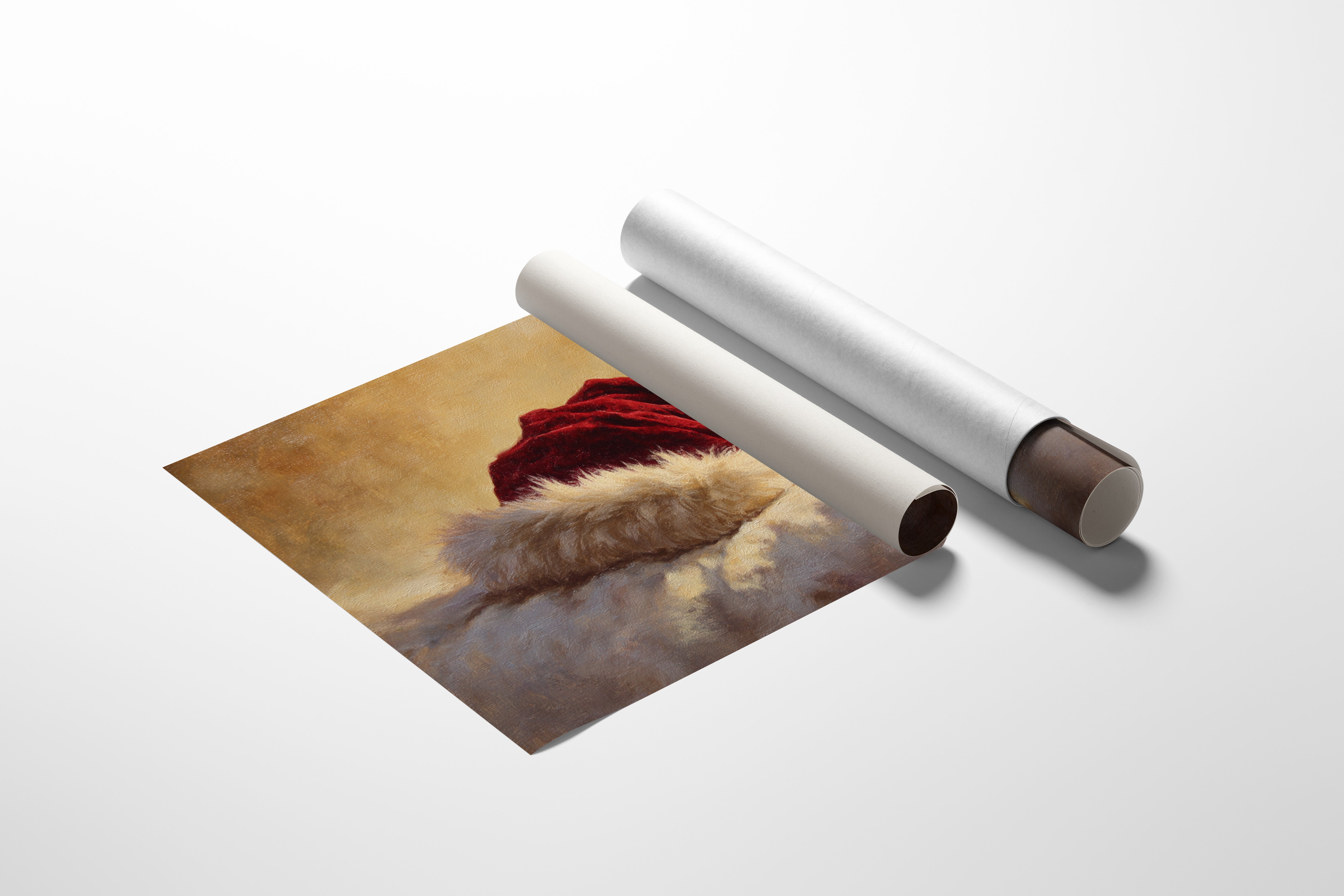 A rich crimson Santa hat lies abandoned in gentle repose, its plush velvet folds catching the warm ambient light. The luxurious fur trim glows with a soft halo effect, creating an ethereal contrast against the deep red fabric. Masterful brushstrokes capture the interplay of textures - the supple velvet against the fluffy white fur, while golden-tinged shadows dance across the composition. This nostalgic still life evokes memories of holiday magic and winter's quiet moments. Perfect for adding a touch of seasonal sophistication to a study, reading nook, or any space seeking to capture the essence of winter's warmth.
