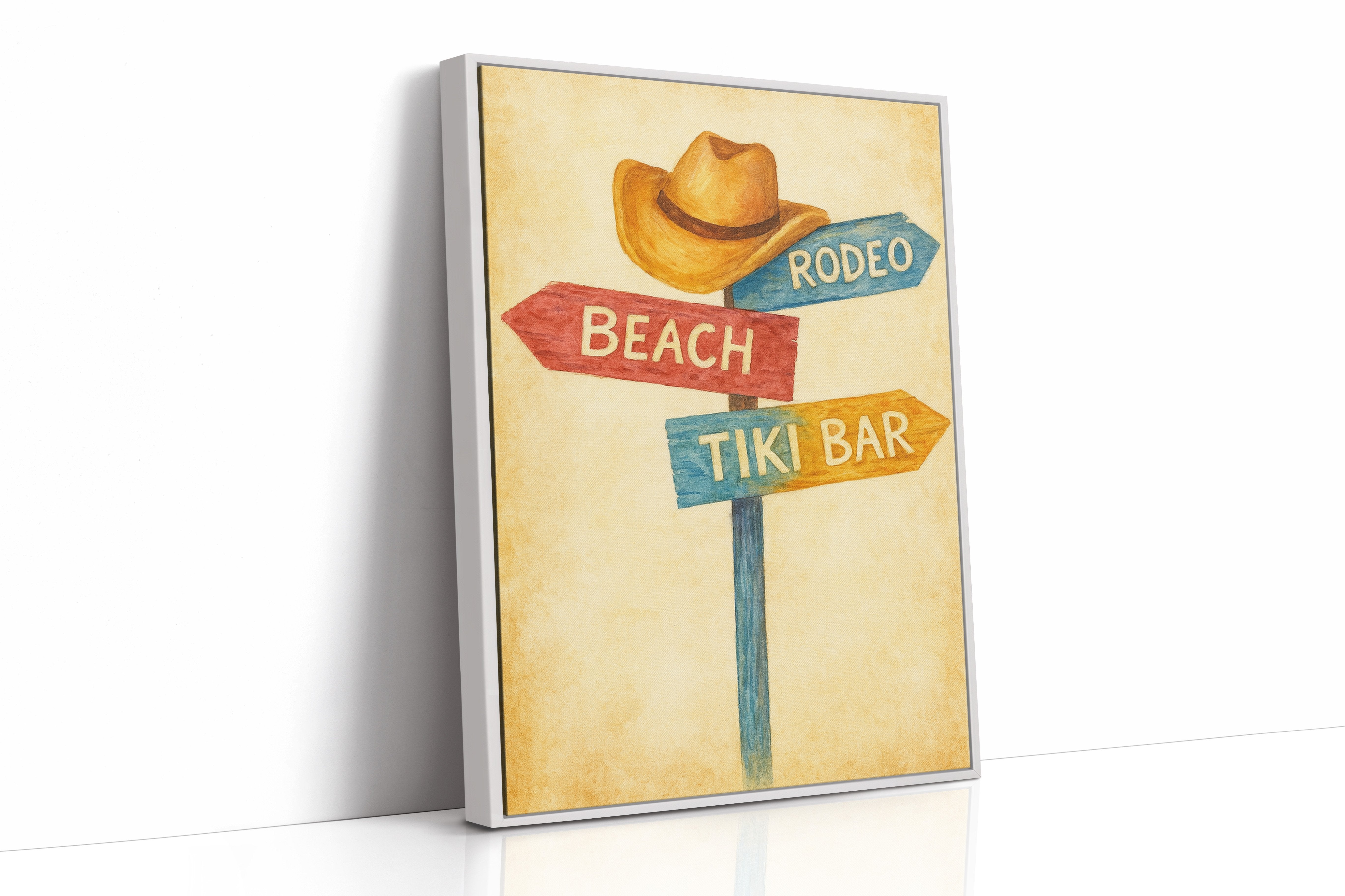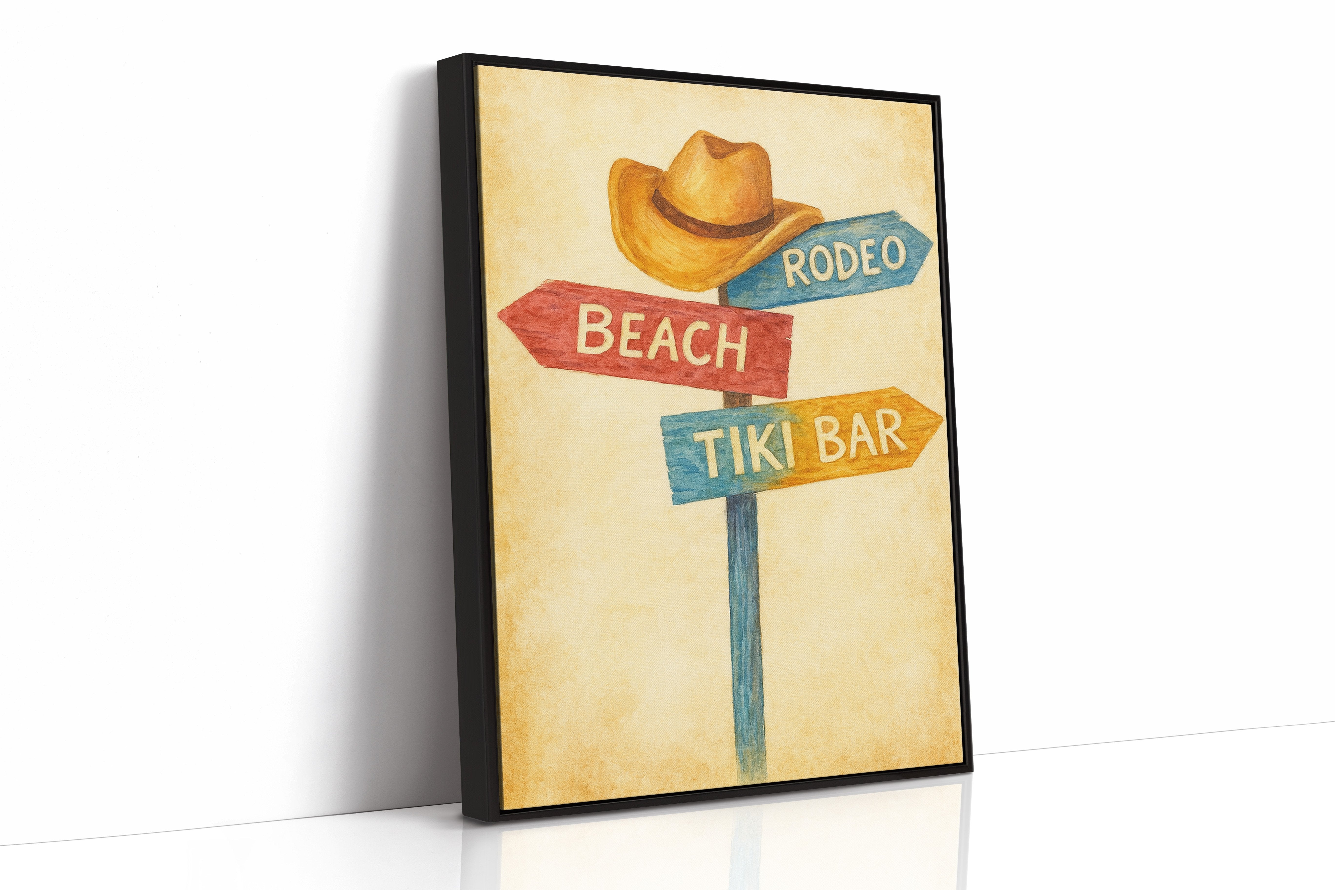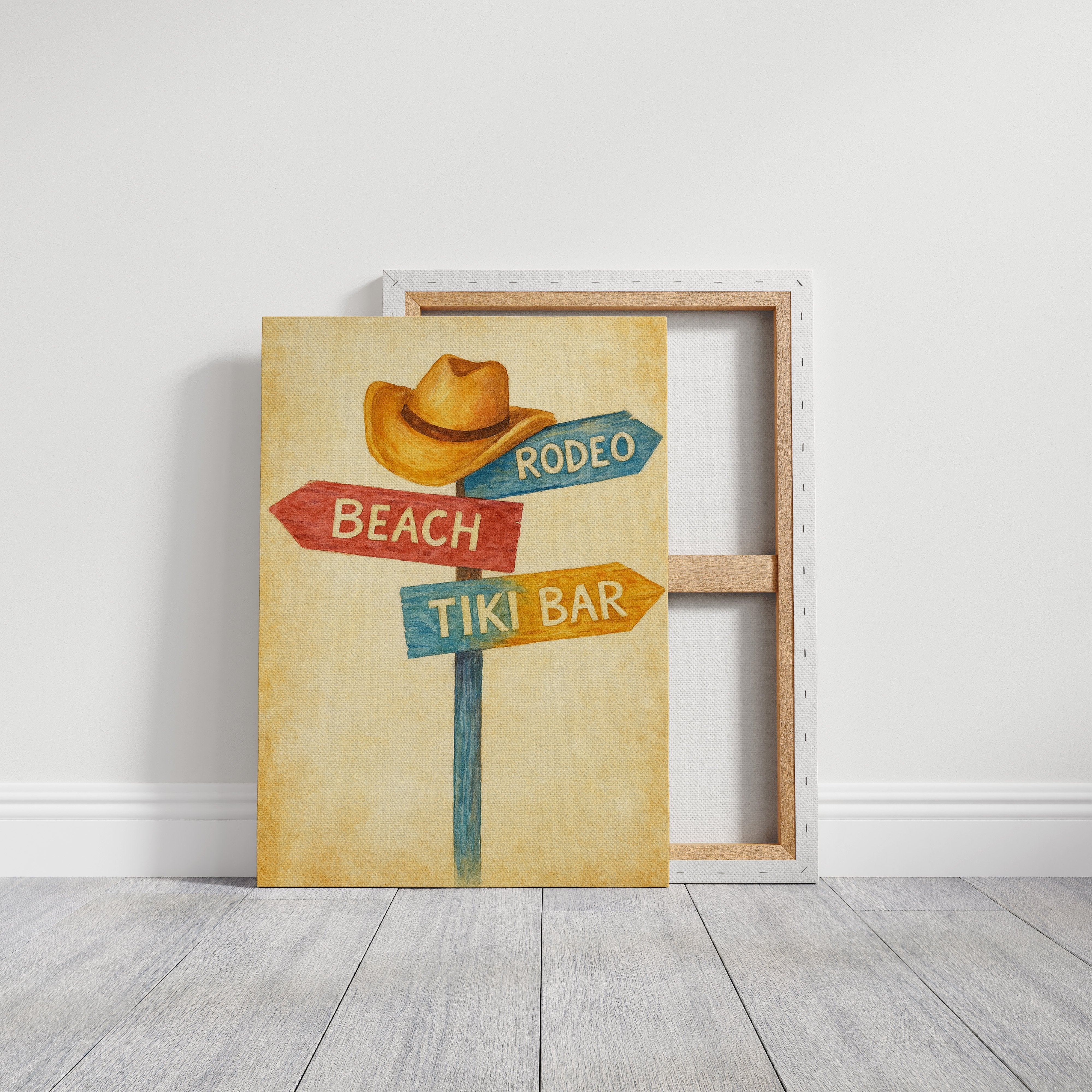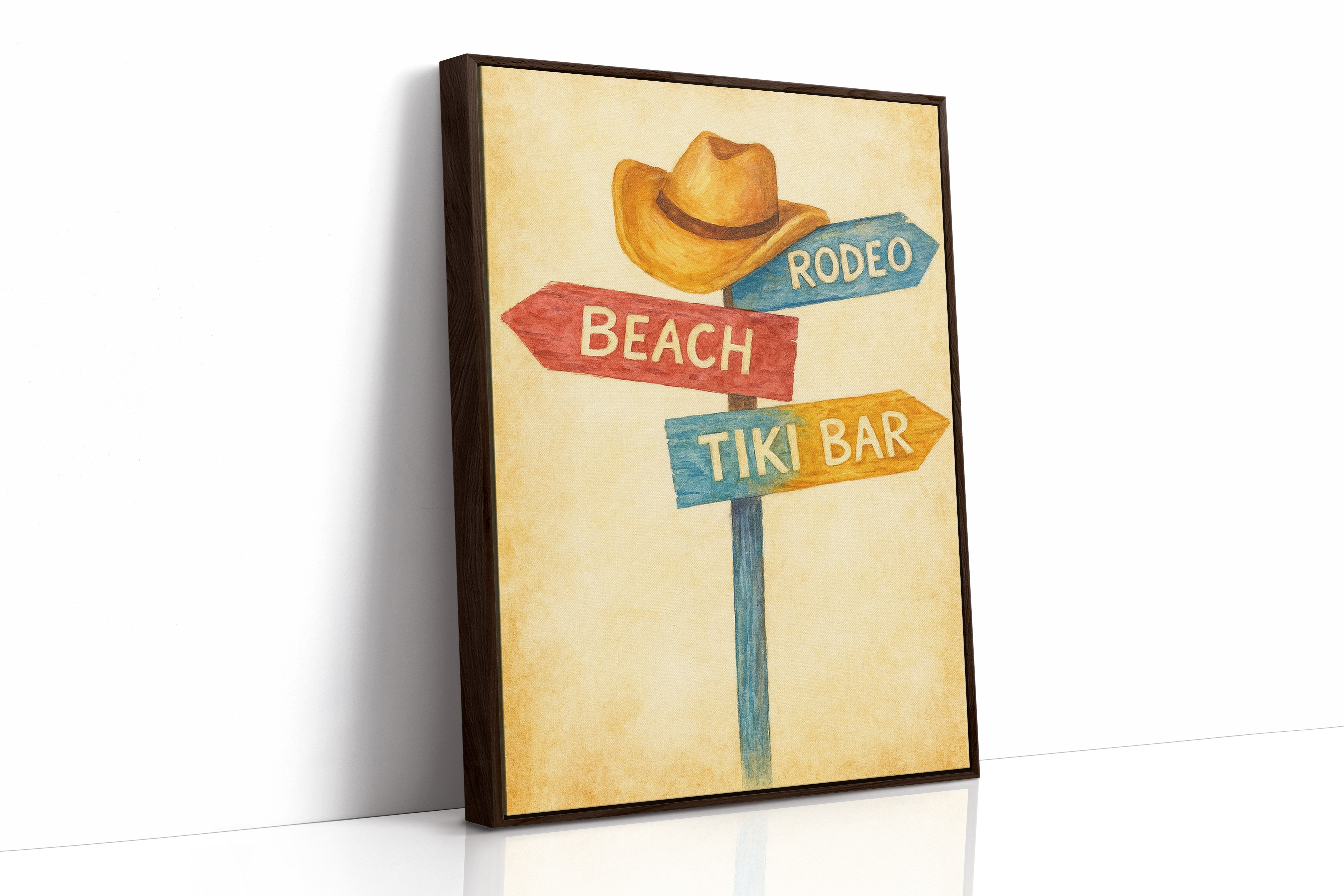 Rustic charm meets carefree wanderlust in this inviting scene where paths diverge toward distant pleasures. The weathered signpost pointing to ""Beach,"" ""Rodeo,"" and ""Tiki Bar"" captures that delicious moment of possibility, rendered in warm, nostalgic hues against a sun-faded background. The surrounding space complements the artwork perfectly weathered wood planking, warm leather, and desert touches create a harmonious blend of Western comfort and coastal ease. This piece brings playful direction to a home office, vacation rental, or any space where you dream of your next escape.