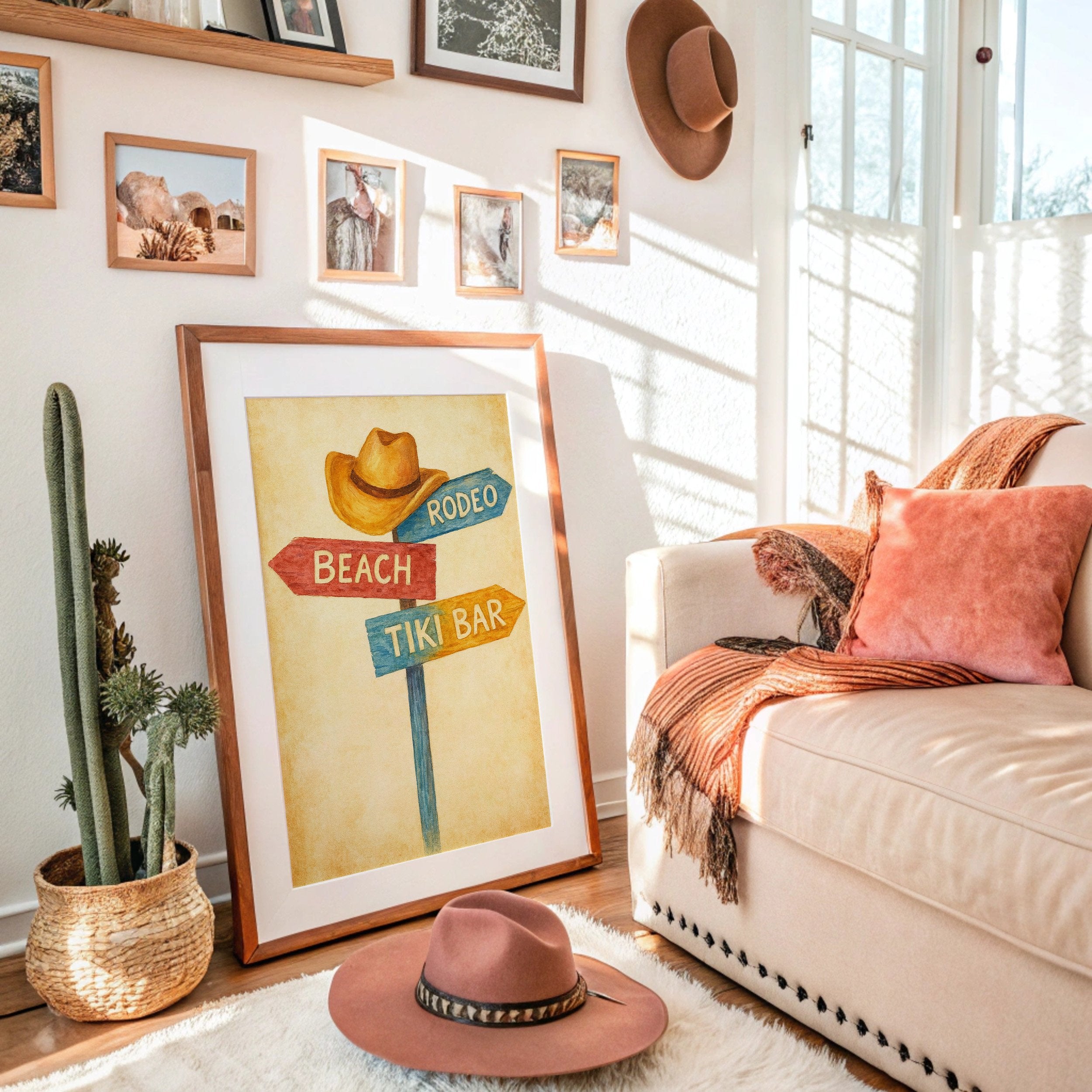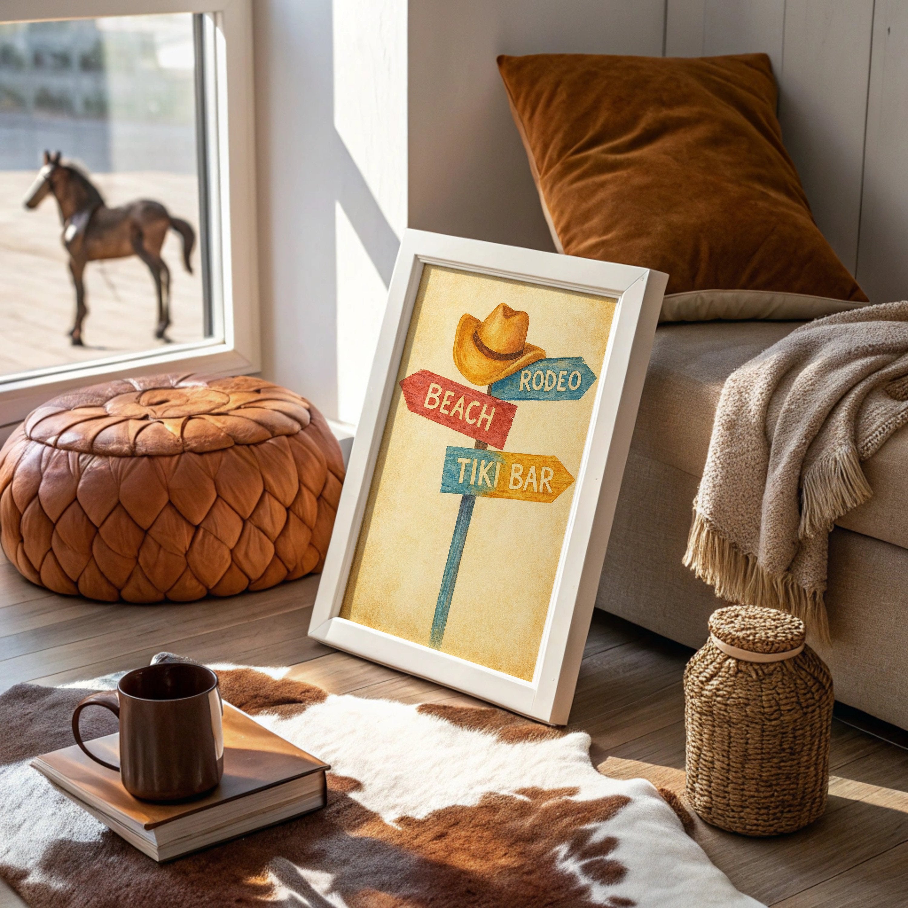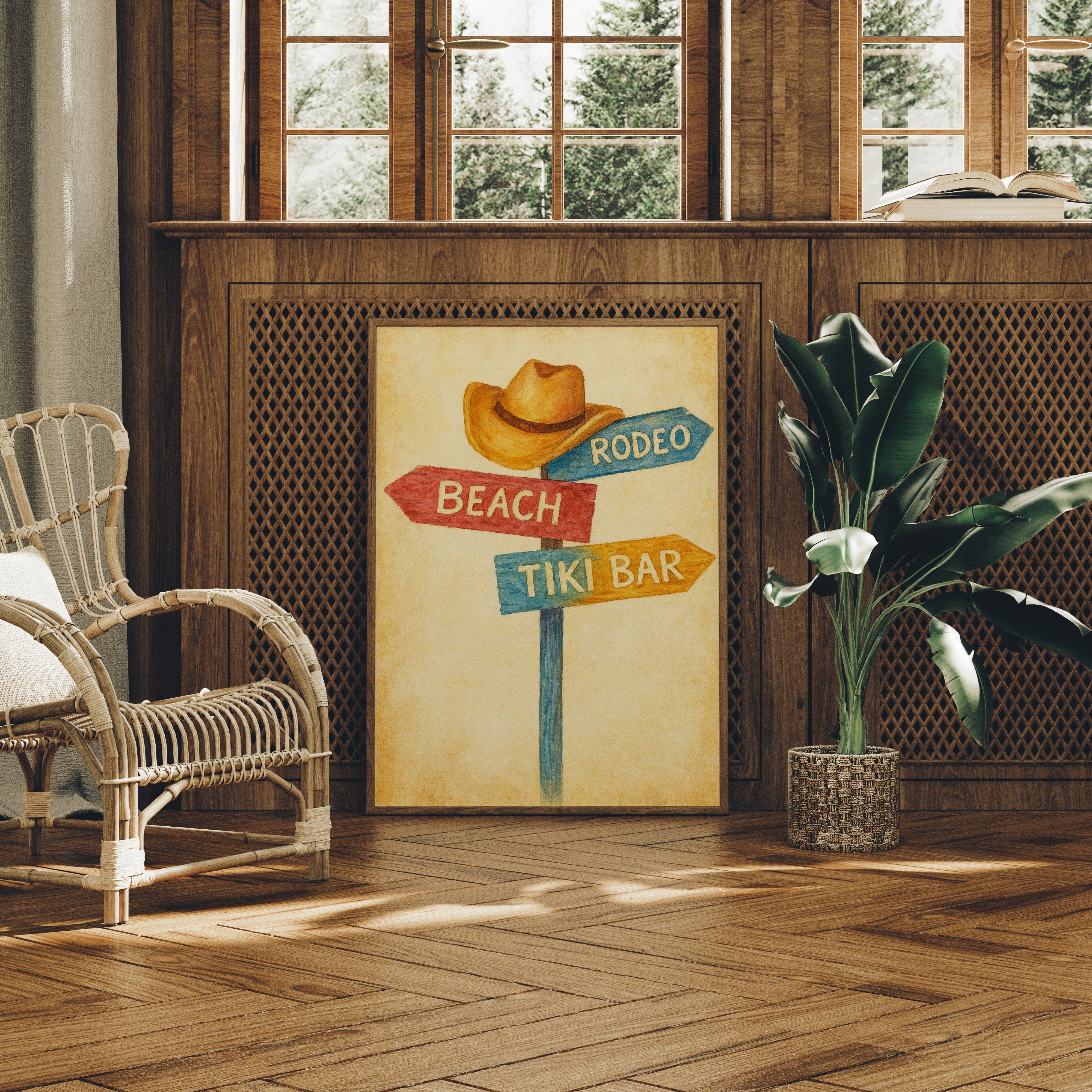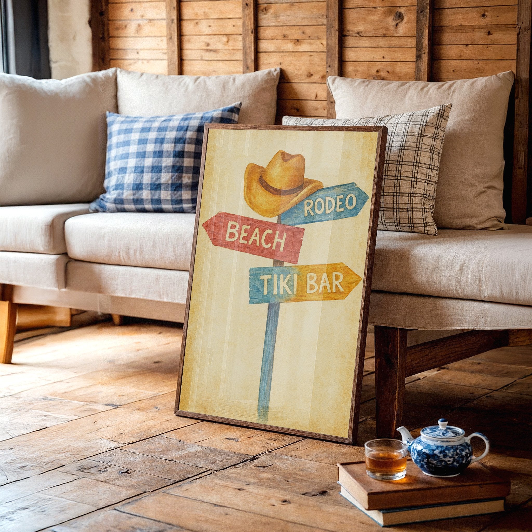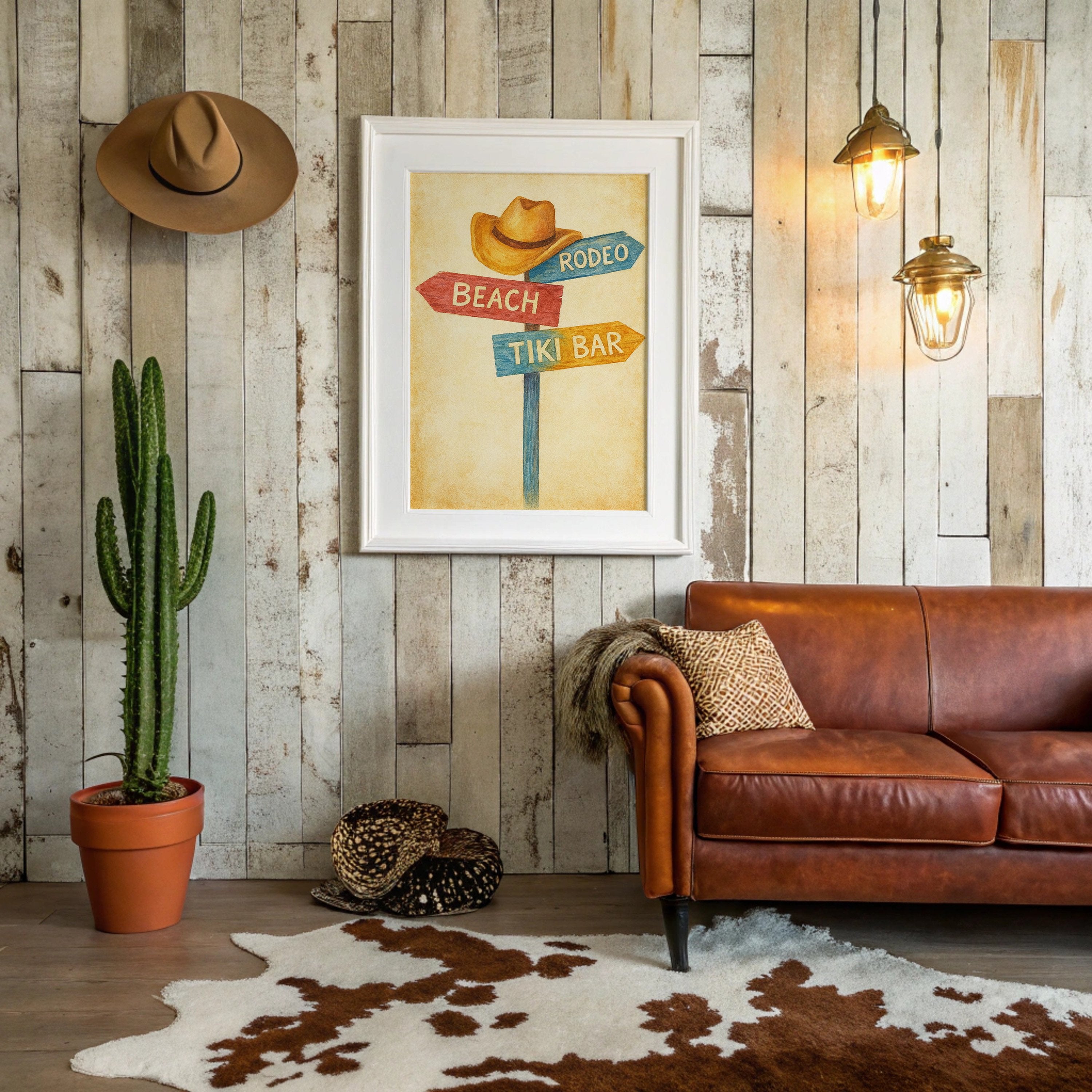 Rustic charm meets carefree wanderlust in this inviting scene where paths diverge toward distant pleasures. The weathered signpost pointing to ""Beach,"" ""Rodeo,"" and ""Tiki Bar"" captures that delicious moment of possibility, rendered in warm, nostalgic hues against a sun-faded background. The surrounding space complements the artwork perfectly weathered wood planking, warm leather, and desert touches create a harmonious blend of Western comfort and coastal ease. This piece brings playful direction to a home office, vacation rental, or any space where you dream of your next escape.
